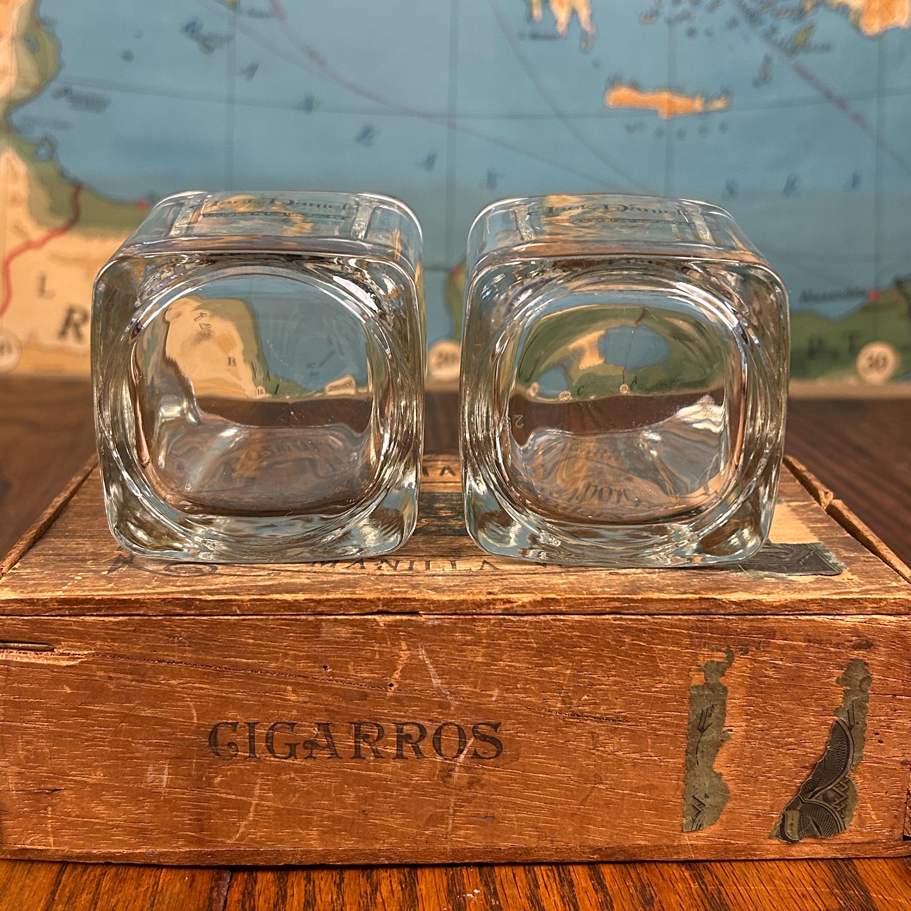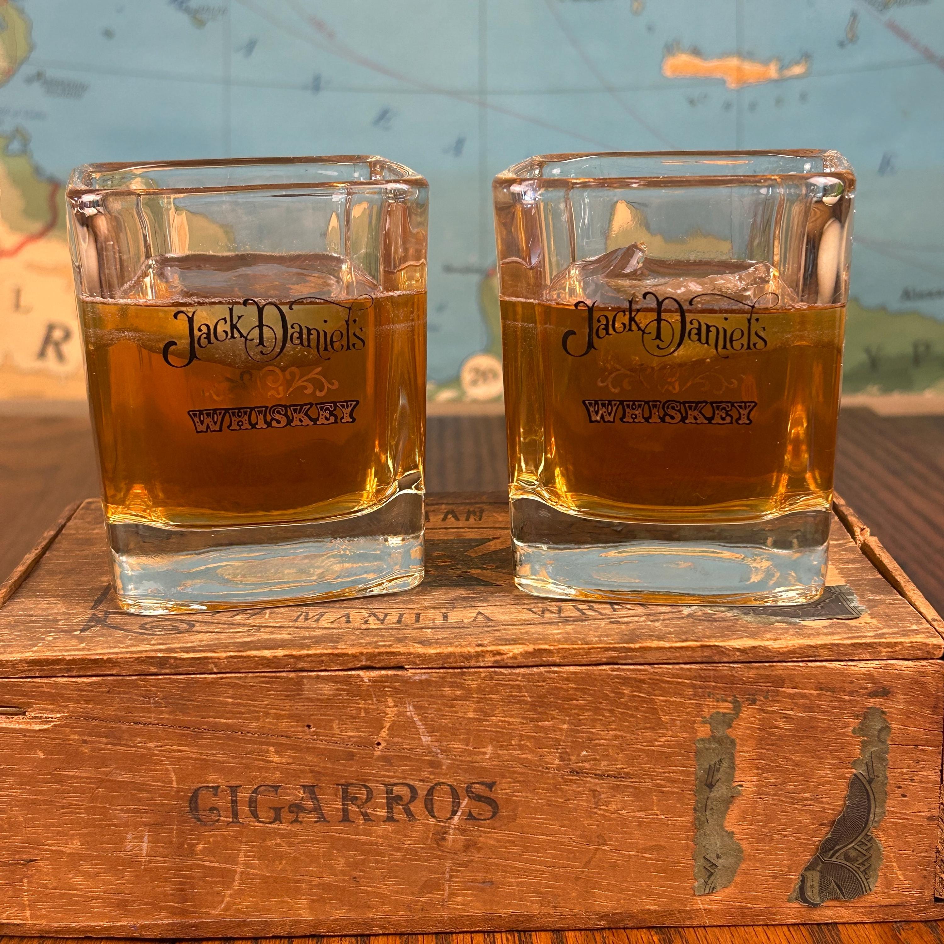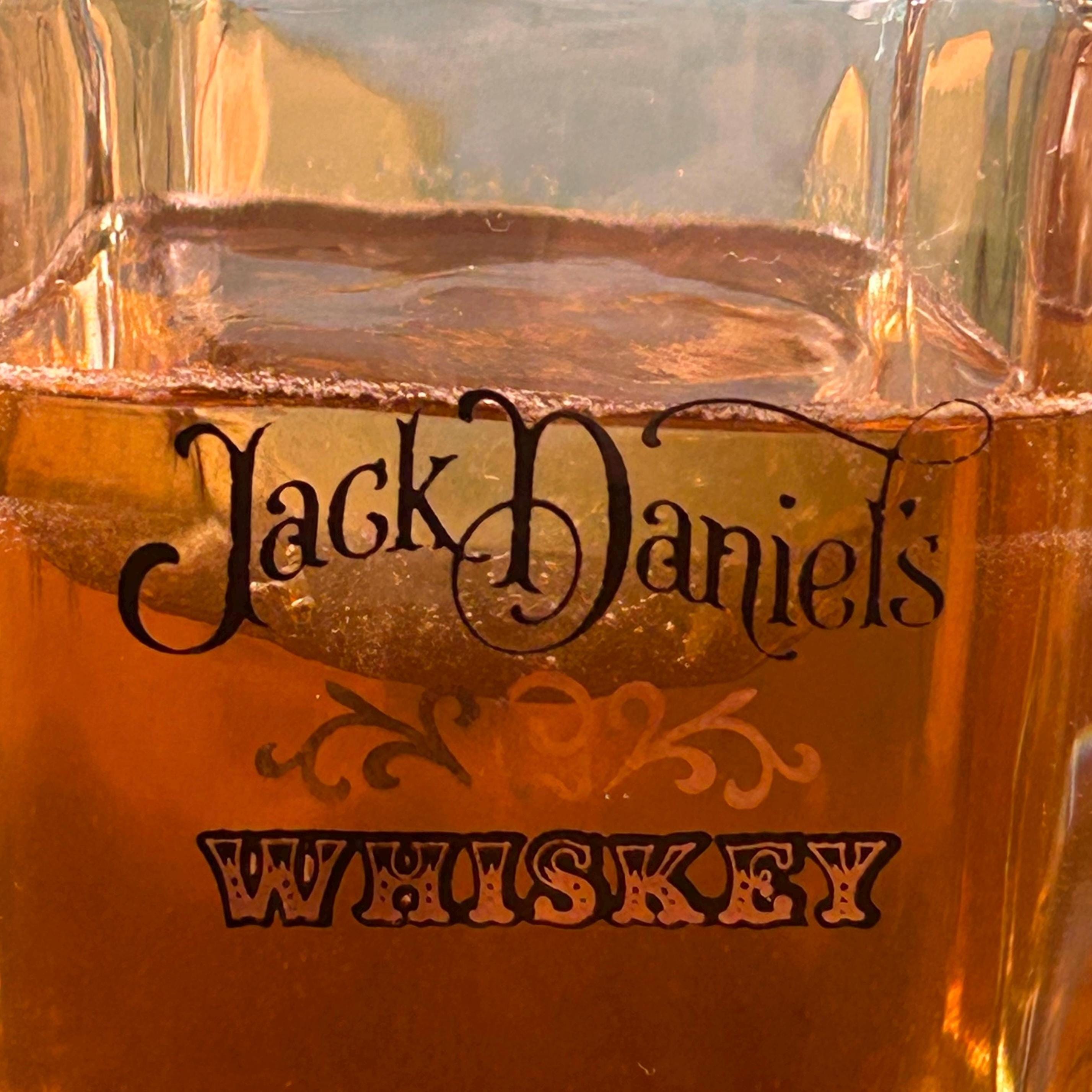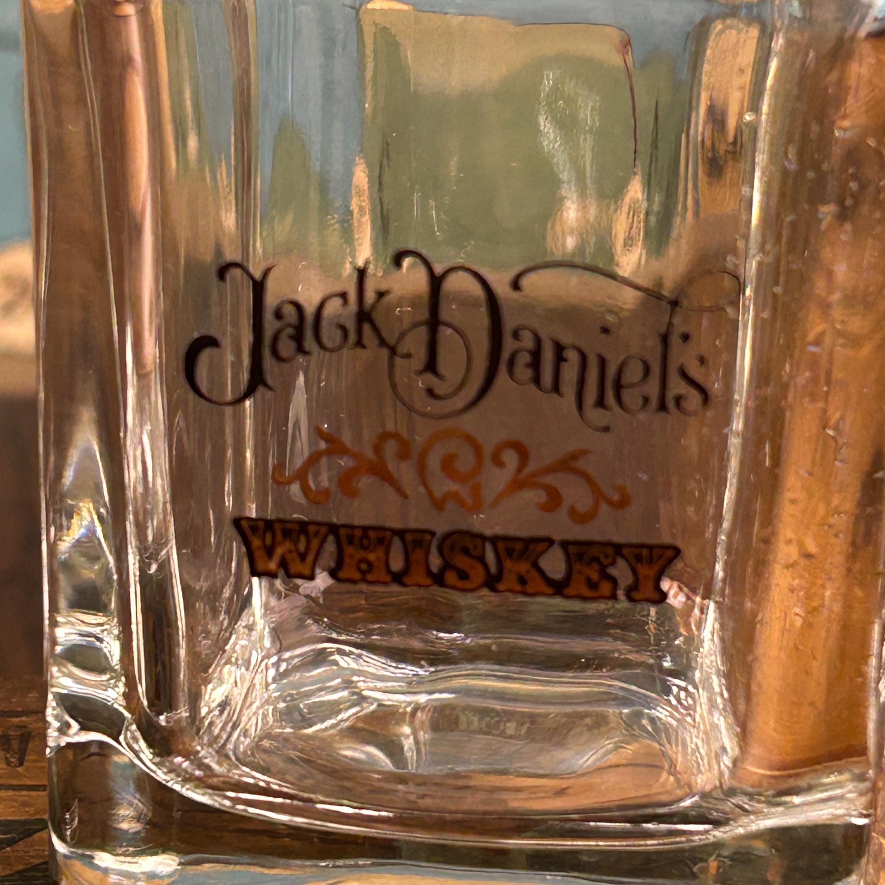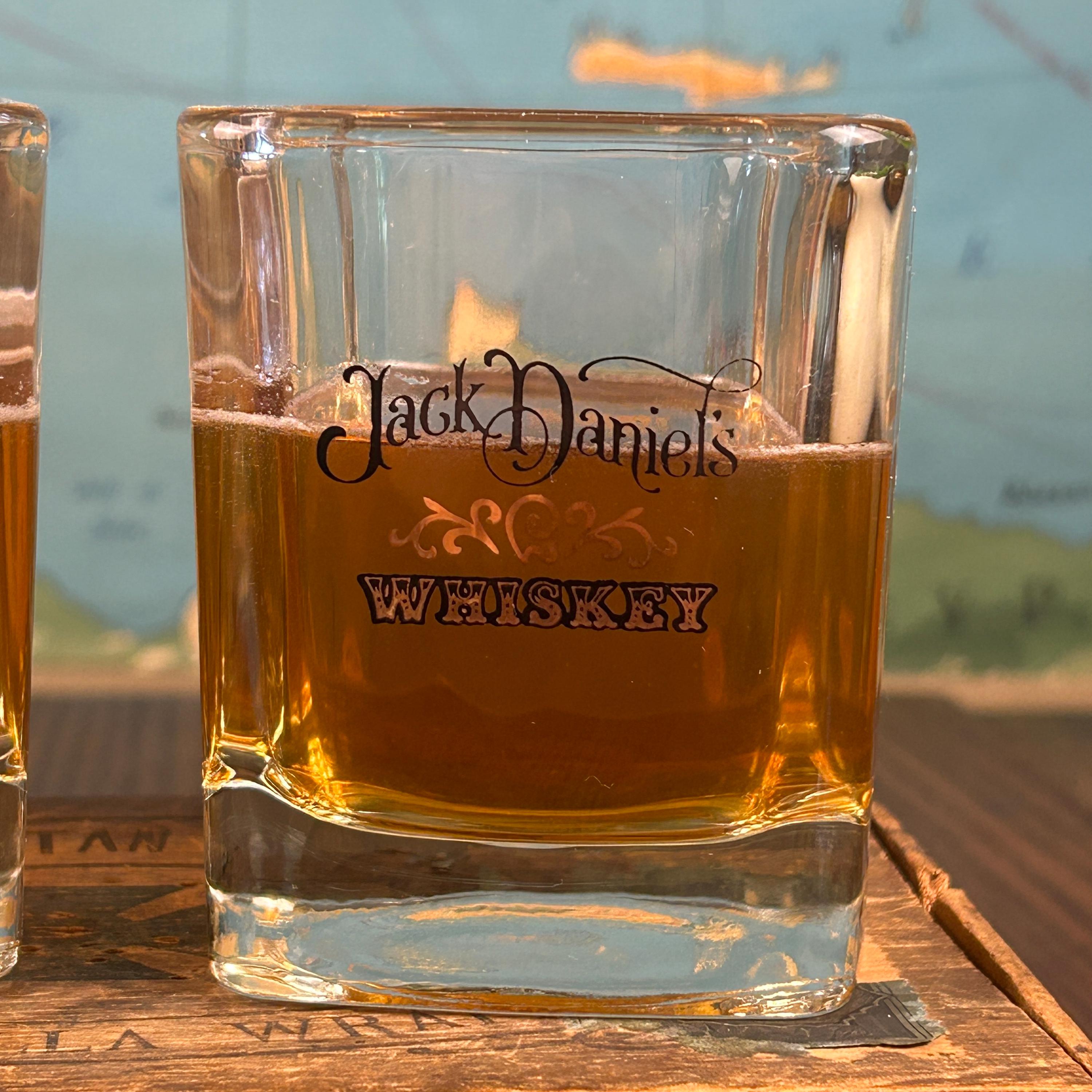 Black script "Jack Daniels" and black/gold scroll detail for whiskey. The word 'WHISKEY' below in black and gold. 8oz capacity. Beautiful rocks glasses.