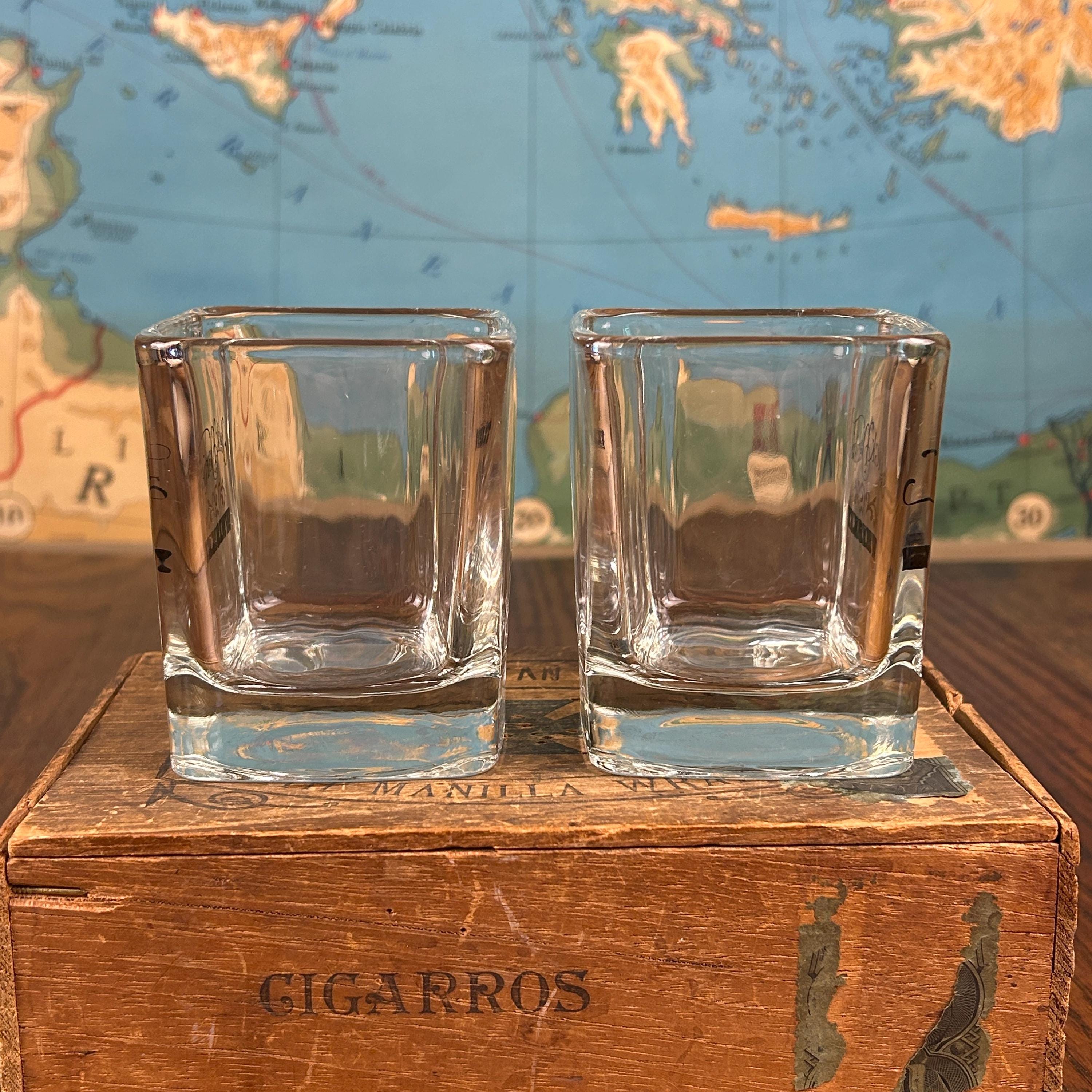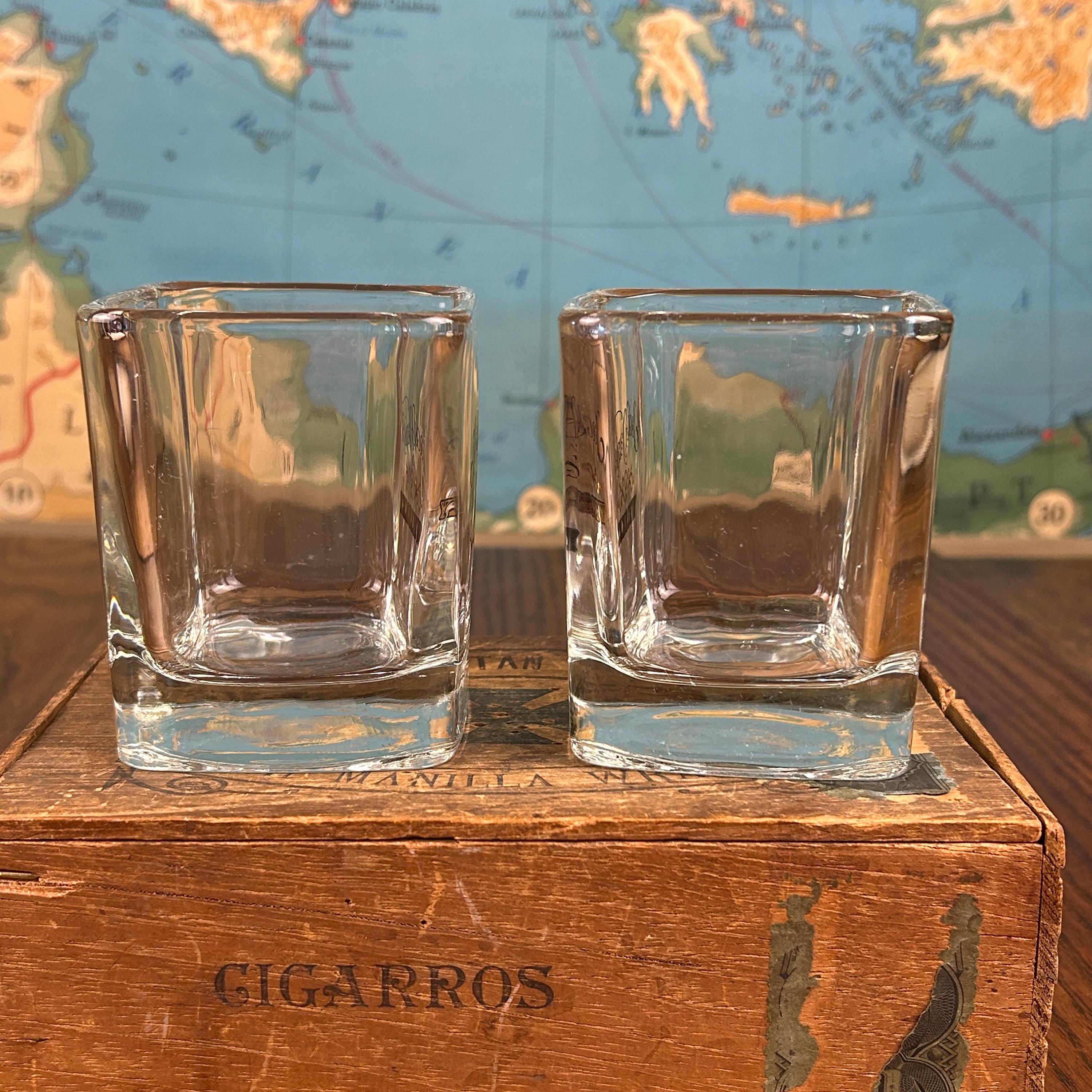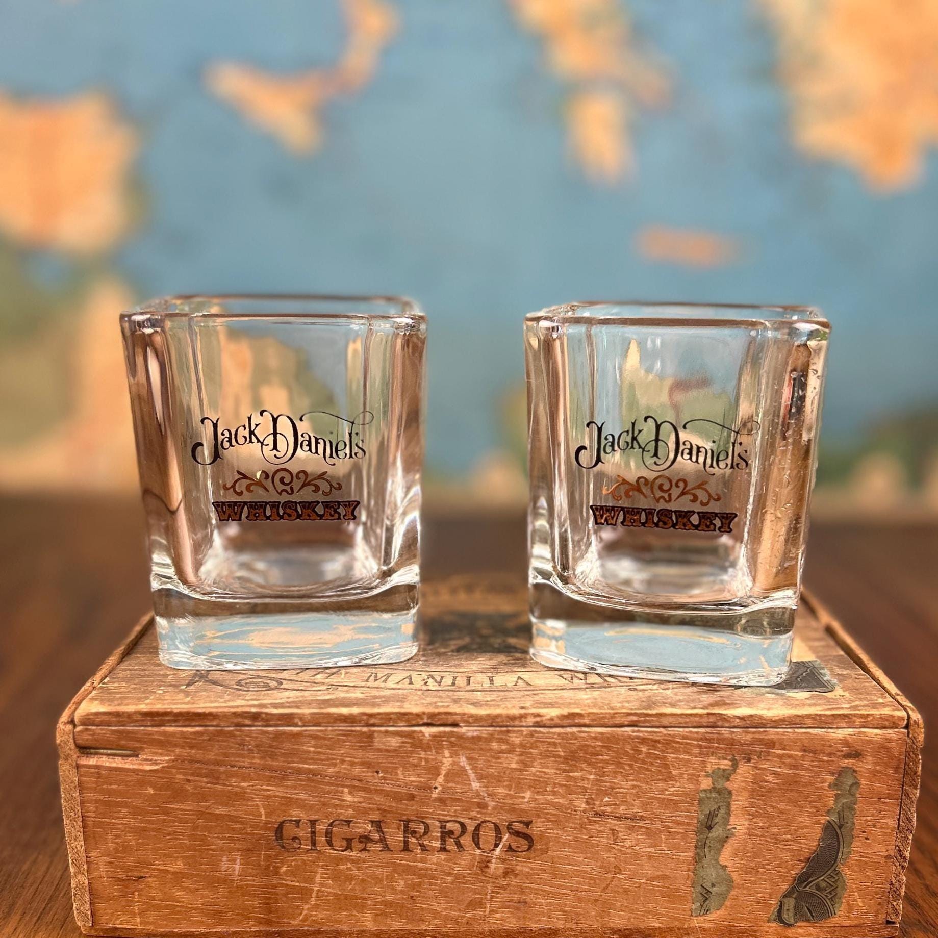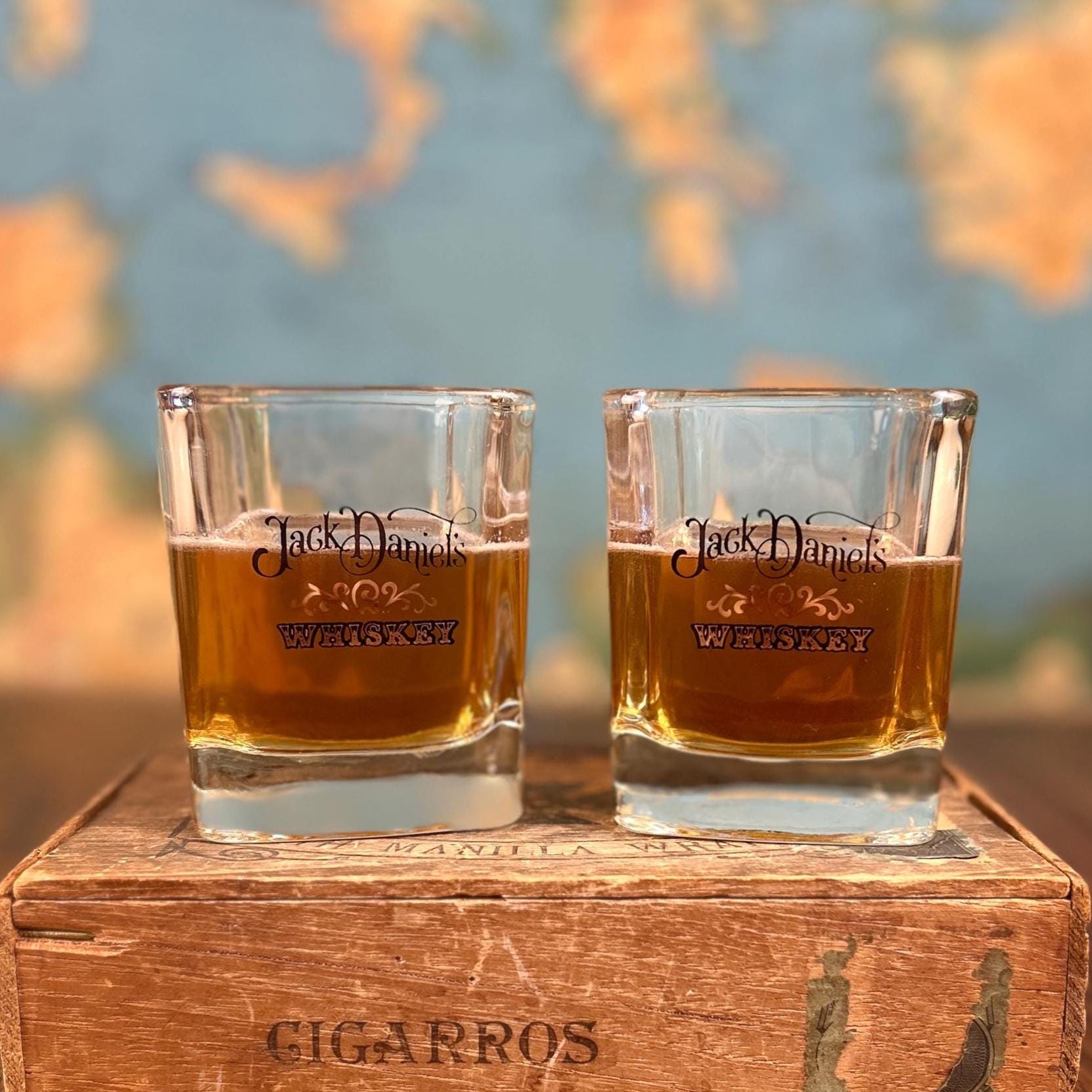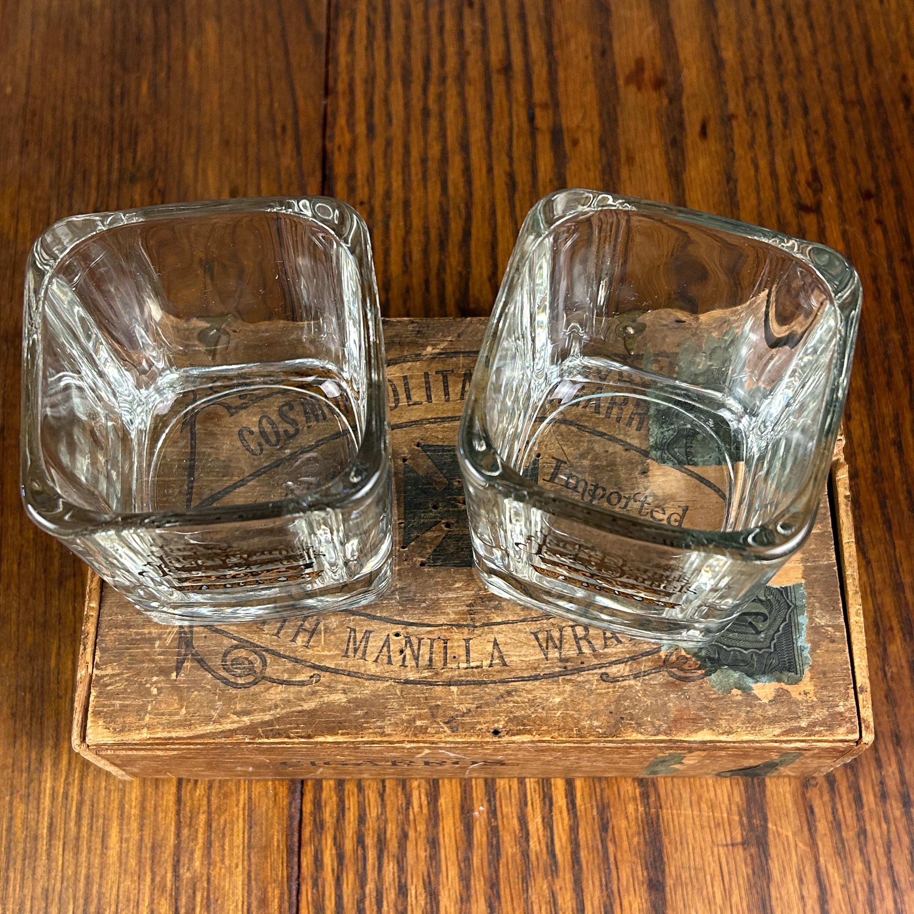 Black script "Jack Daniels" and black/gold scroll detail for whiskey. The word 'WHISKEY' below in black and gold. 8oz capacity. Beautiful rocks glasses.