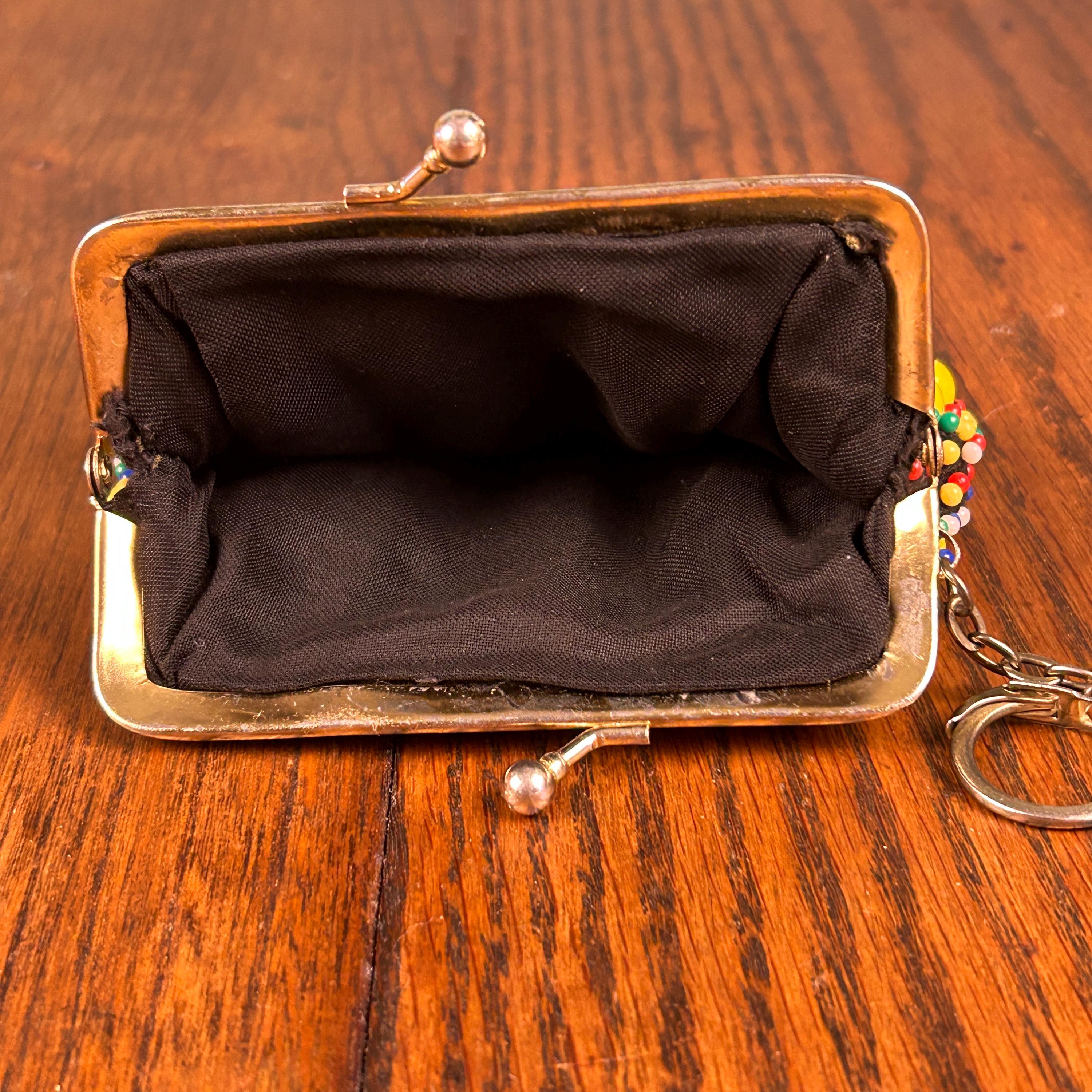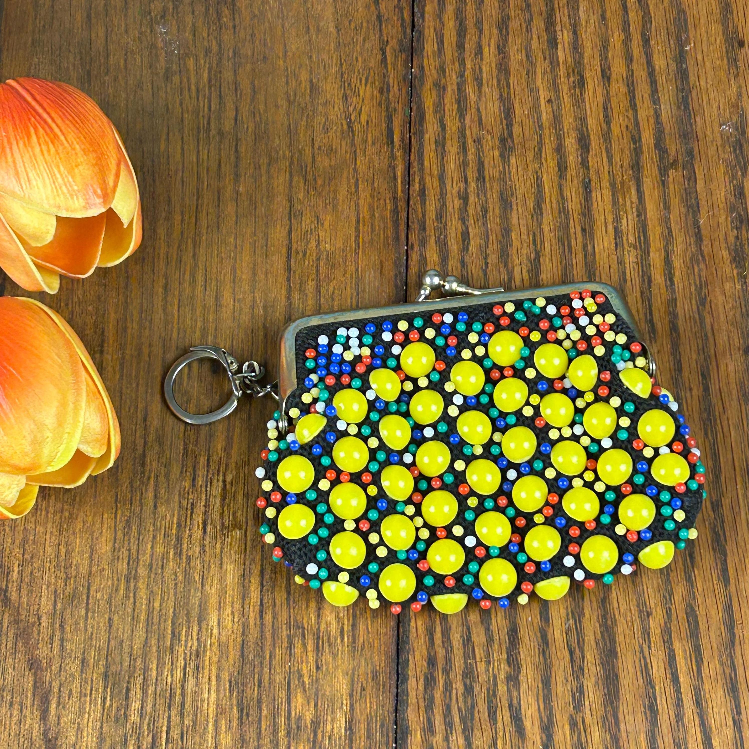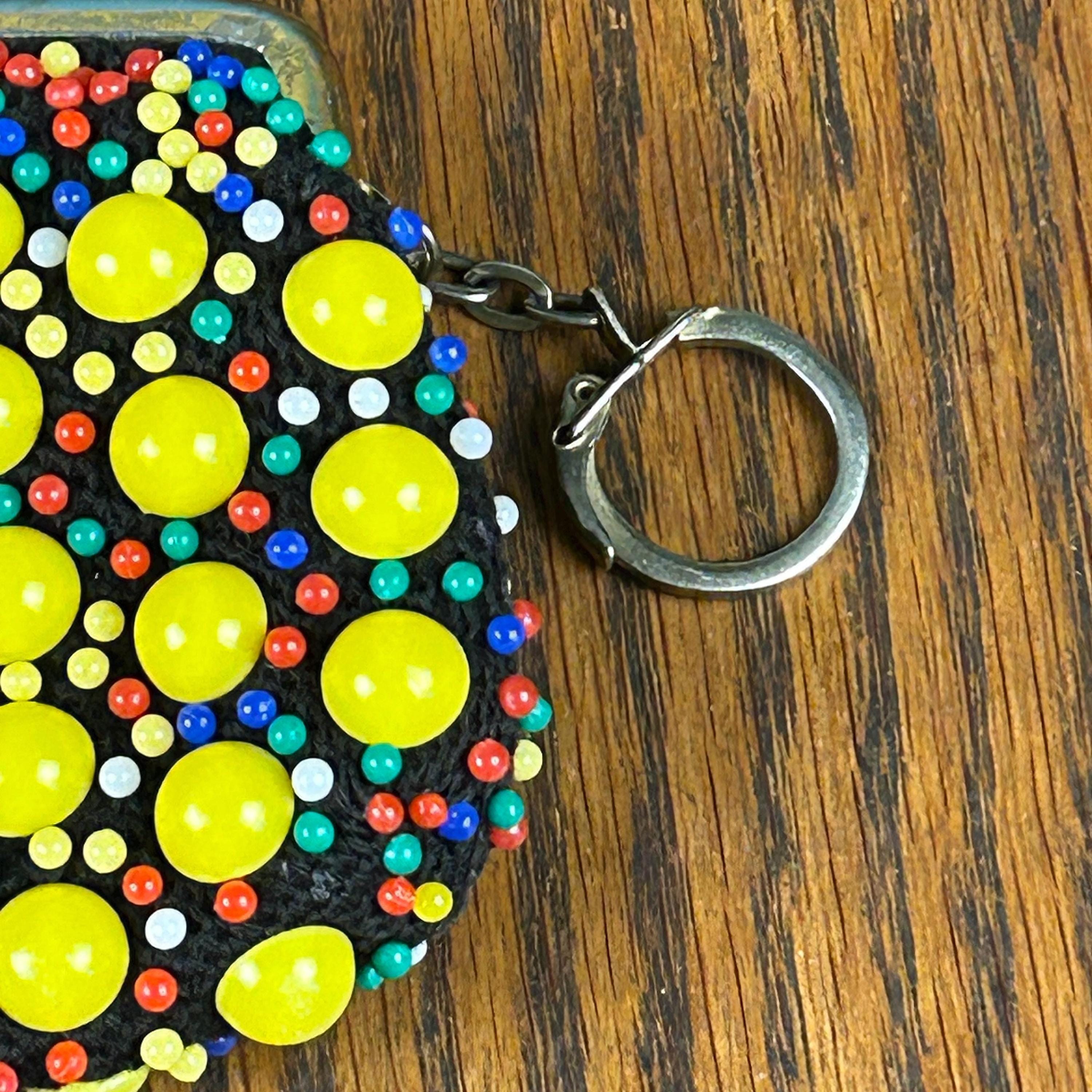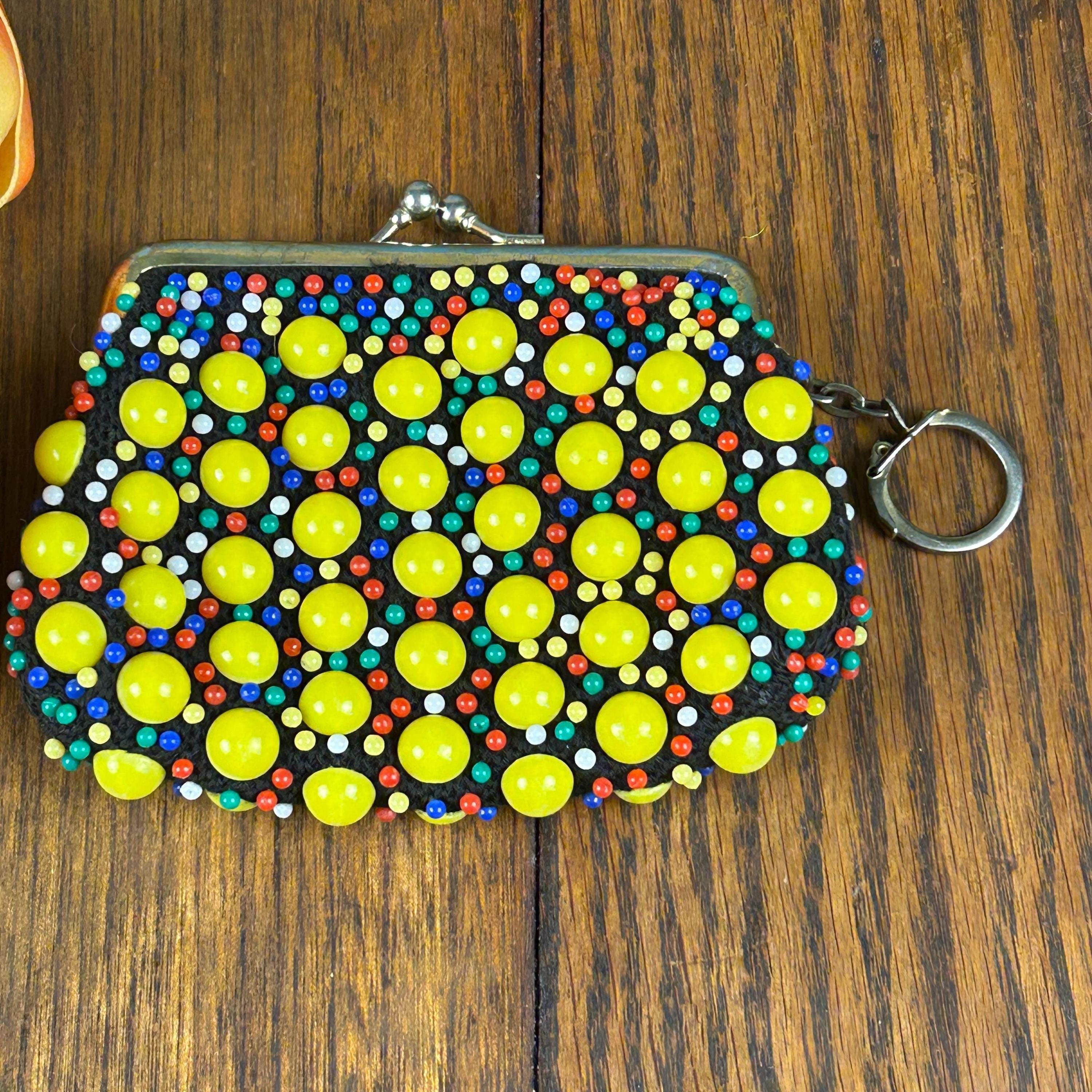 Add a touch of vintage charm to your accessory collection with this original, multi-colored beaded coin purse. The kiss lock closure adds a retro feel, while the beaded design adds a unique touch to this everyday essential. The purse is made of high-quality materials and has not been modified, making it a perfect choice for any adult unisex who loves vintage retro style. It also comes with a metal ring to clip to your purse, keychain, you name it!