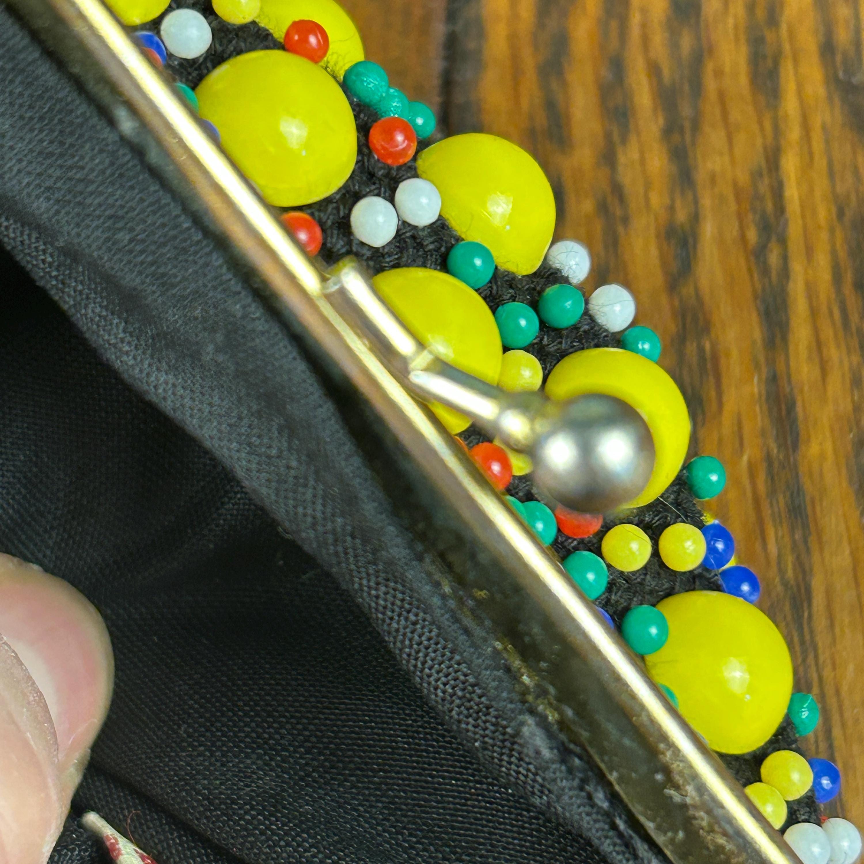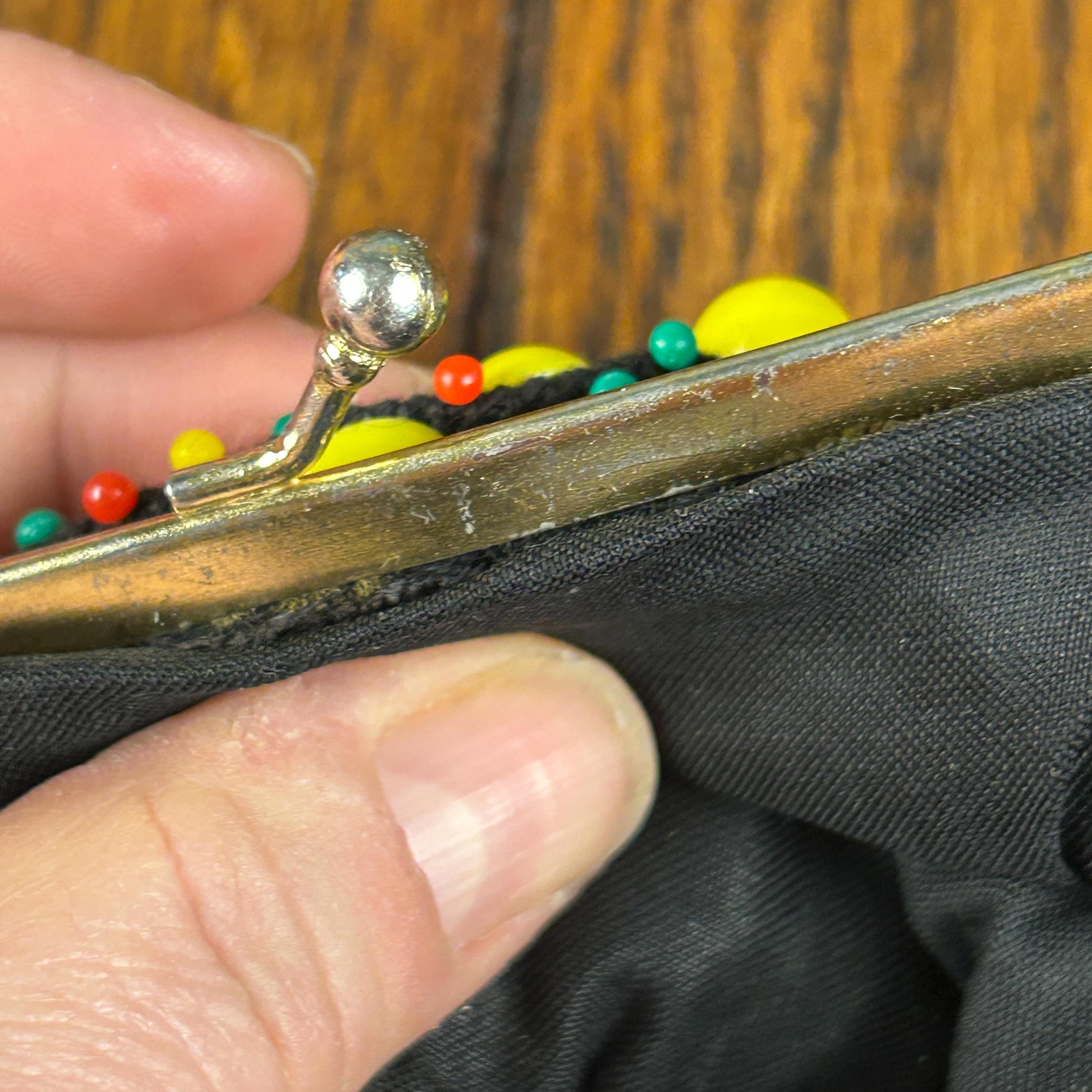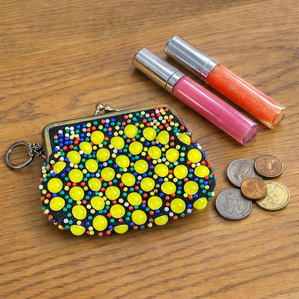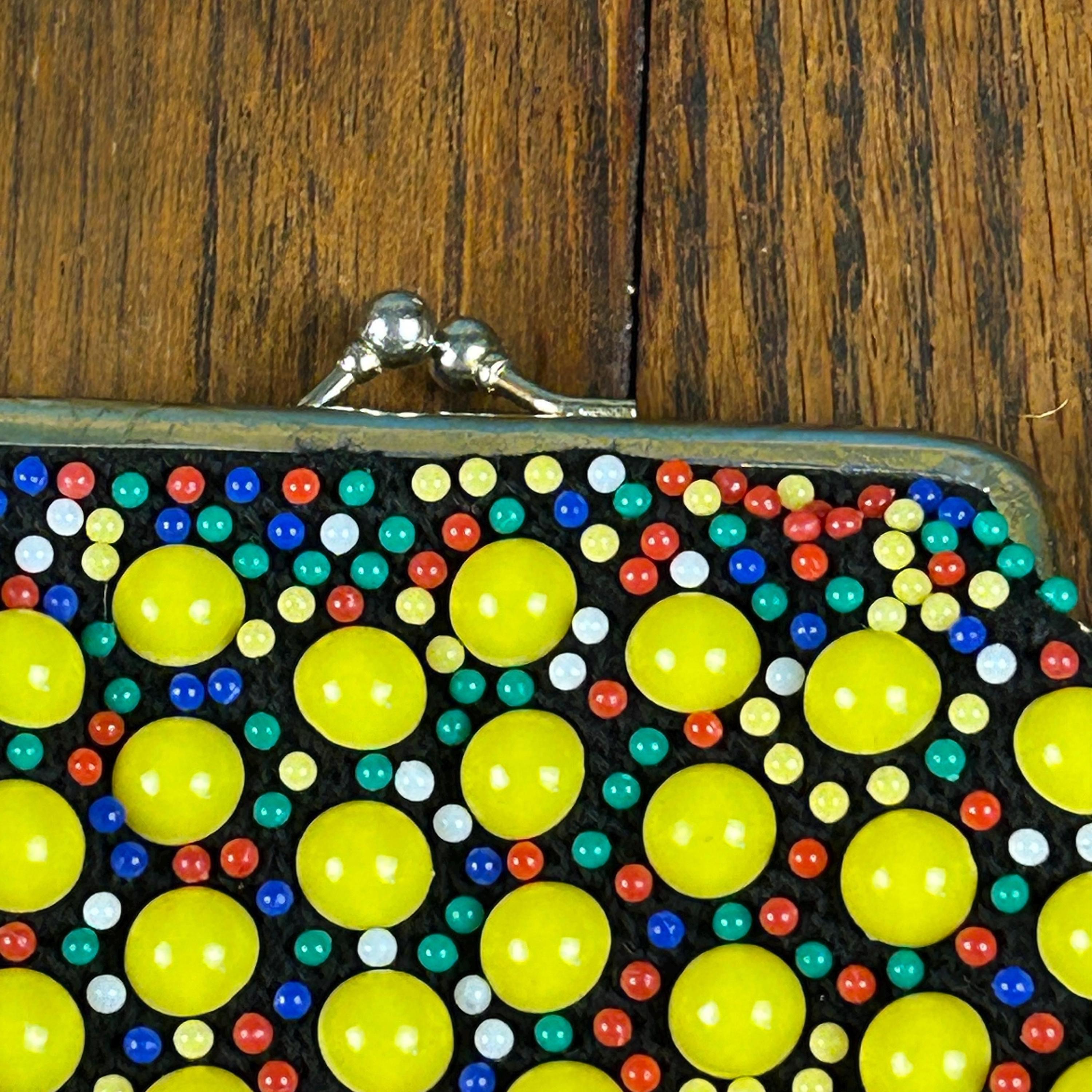 Add a touch of vintage charm to your accessory collection with this original, multi-colored beaded coin purse. The kiss lock closure adds a retro feel, while the beaded design adds a unique touch to this everyday essential. The purse is made of high-quality materials and has not been modified, making it a perfect choice for any adult unisex who loves vintage retro style. It also comes with a metal ring to clip to your purse, keychain, you name it!