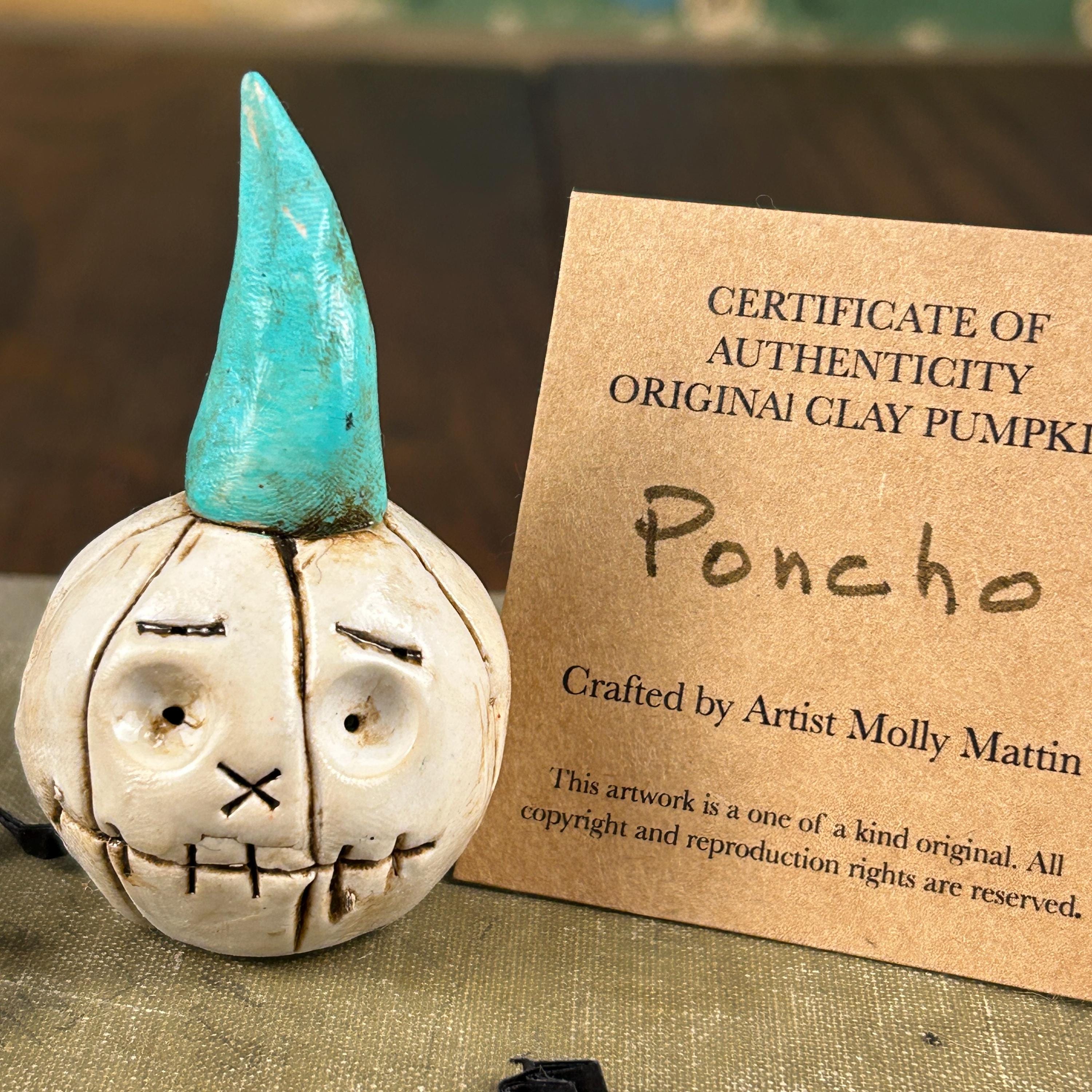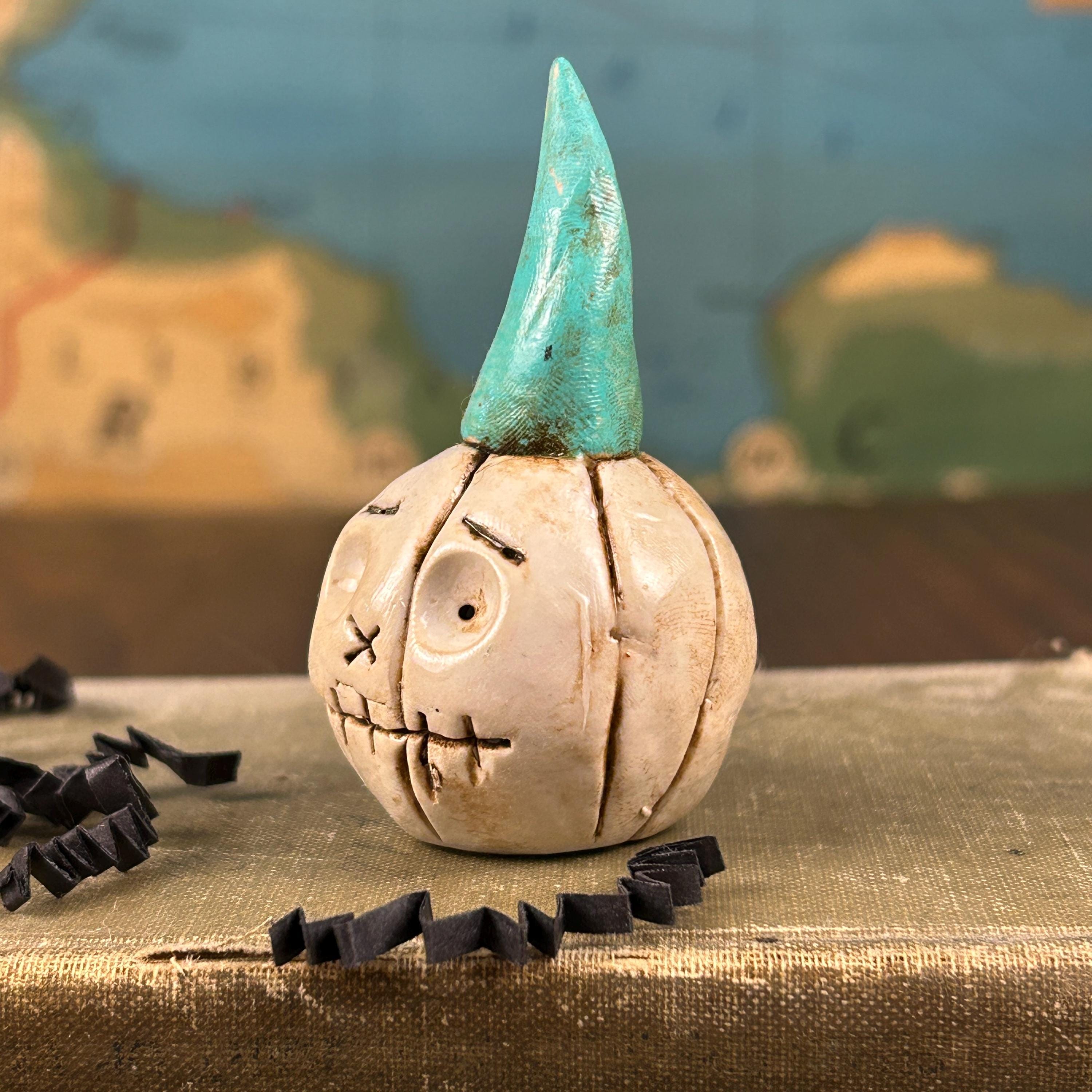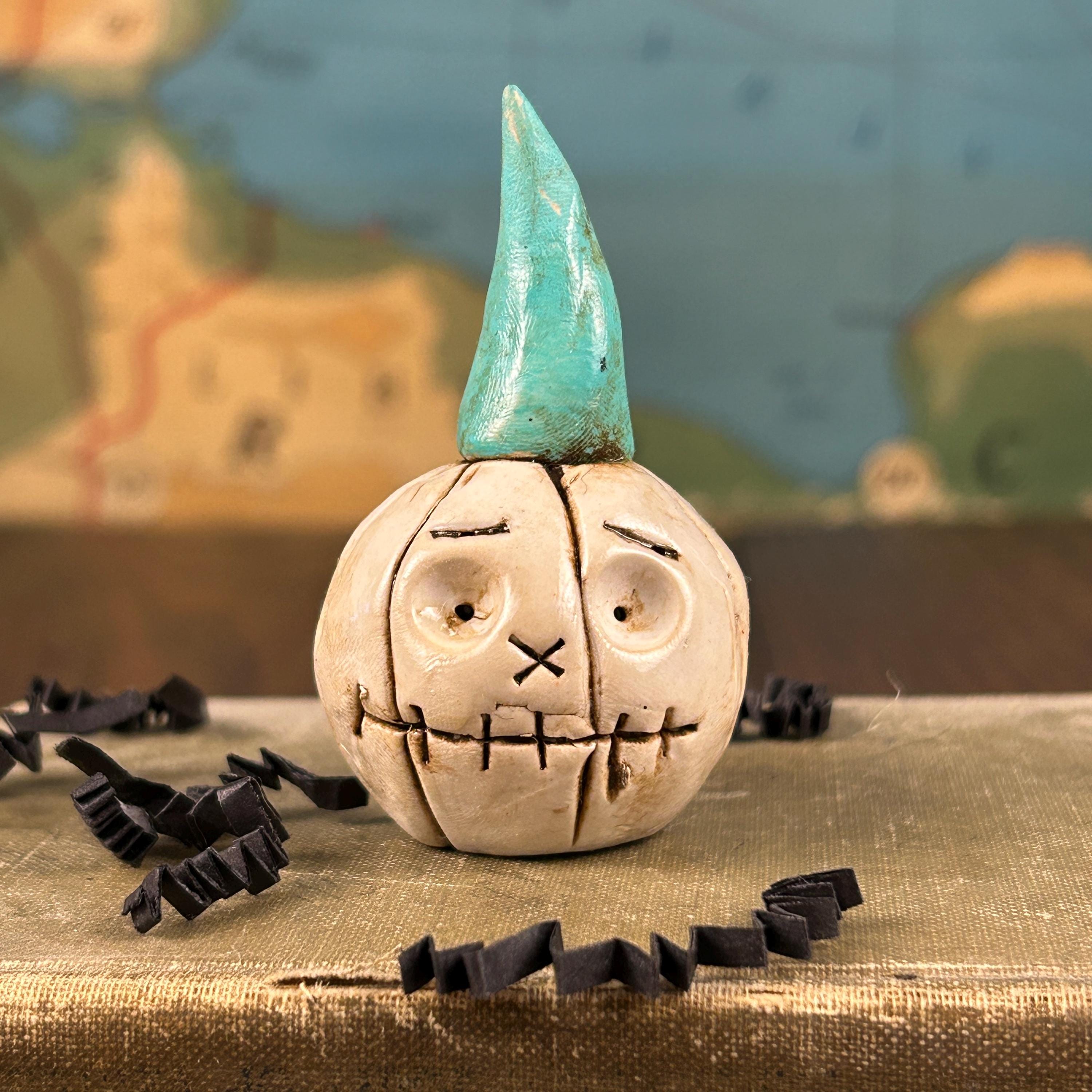 Meet PONCHO. This sweet little ghost pumpkin dons a light blue hat. He is small in stature, but full of personality and will add a touch of whimsy and fun to your Halloween decor, dollhouse, miniature Halloween scene, or just tucked on a shelf for a sweet Halloween surprise.