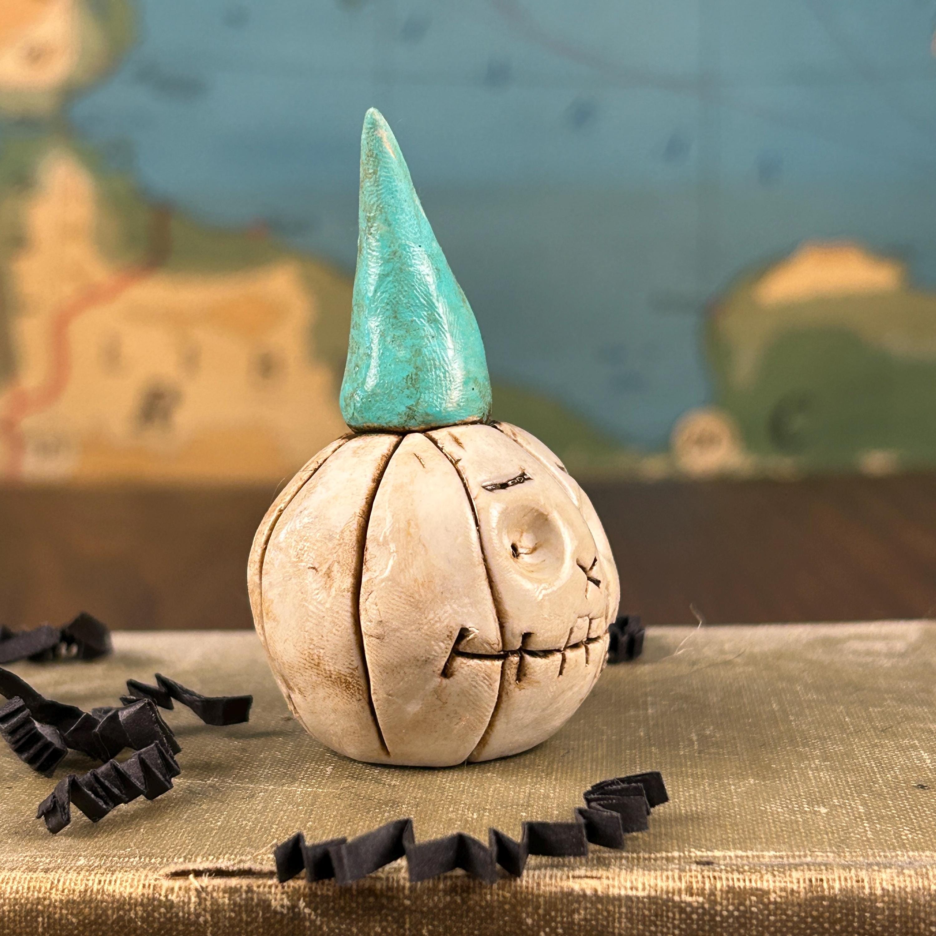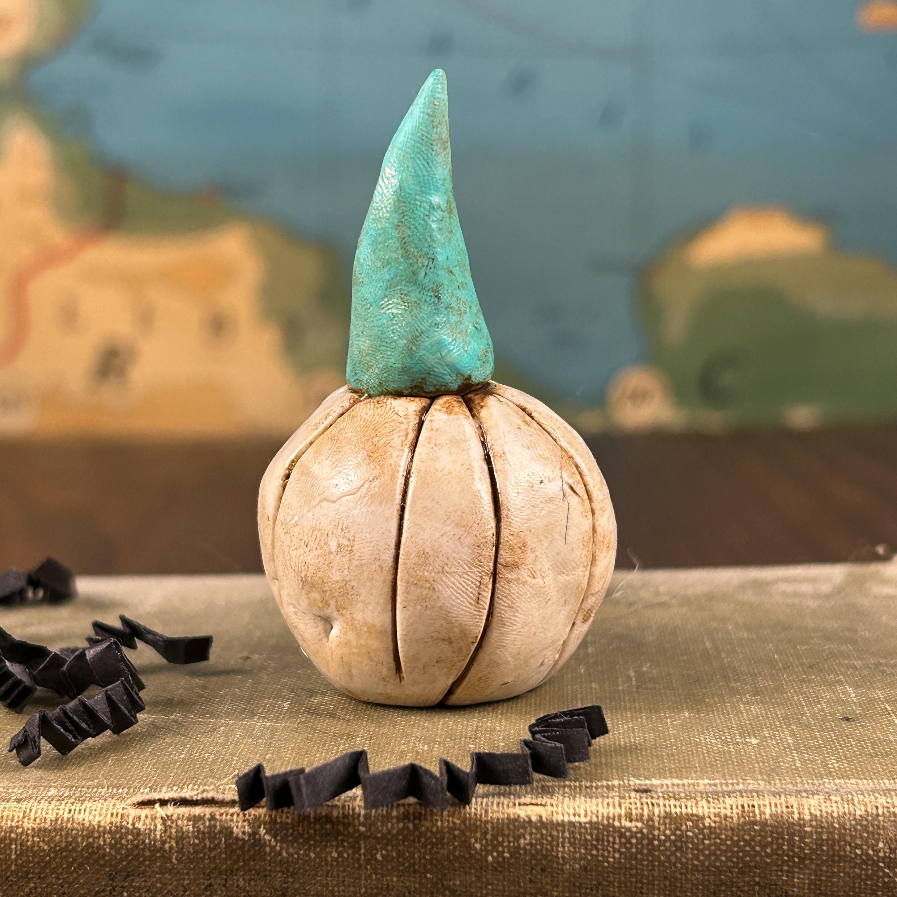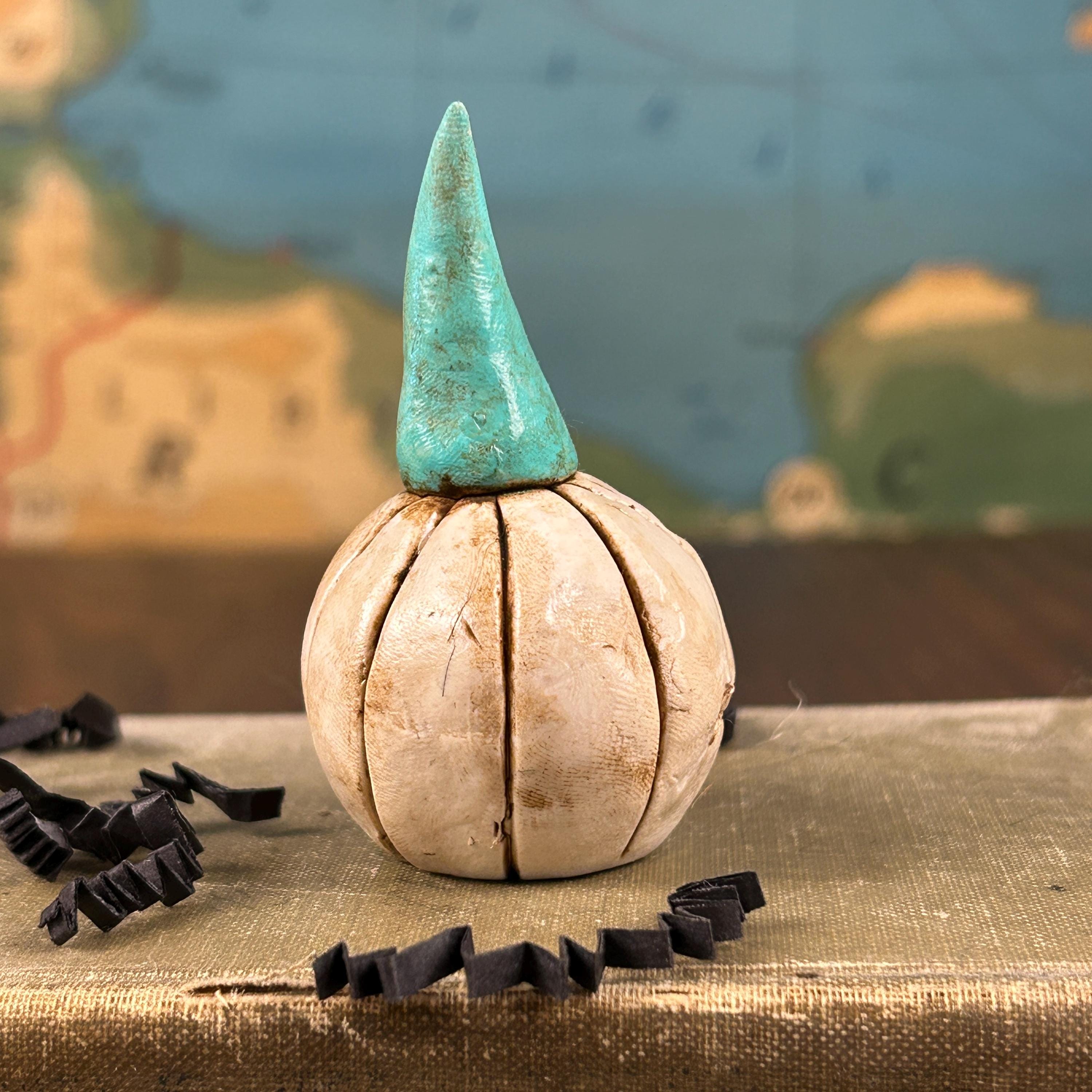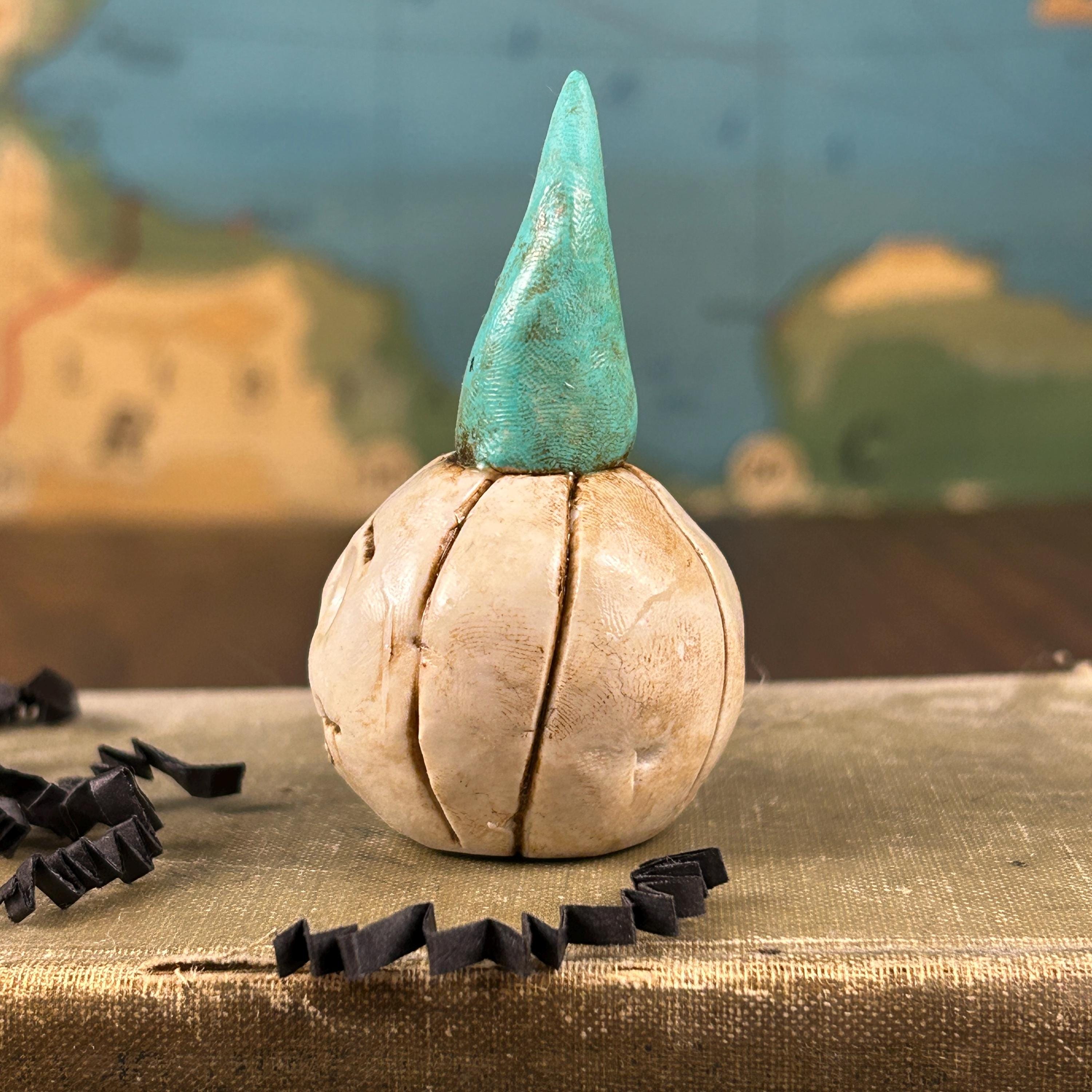 Meet PONCHO. This sweet little ghost pumpkin dons a light blue hat. He is small in stature, but full of personality and will add a touch of whimsy and fun to your Halloween decor, dollhouse, miniature Halloween scene, or just tucked on a shelf for a sweet Halloween surprise.