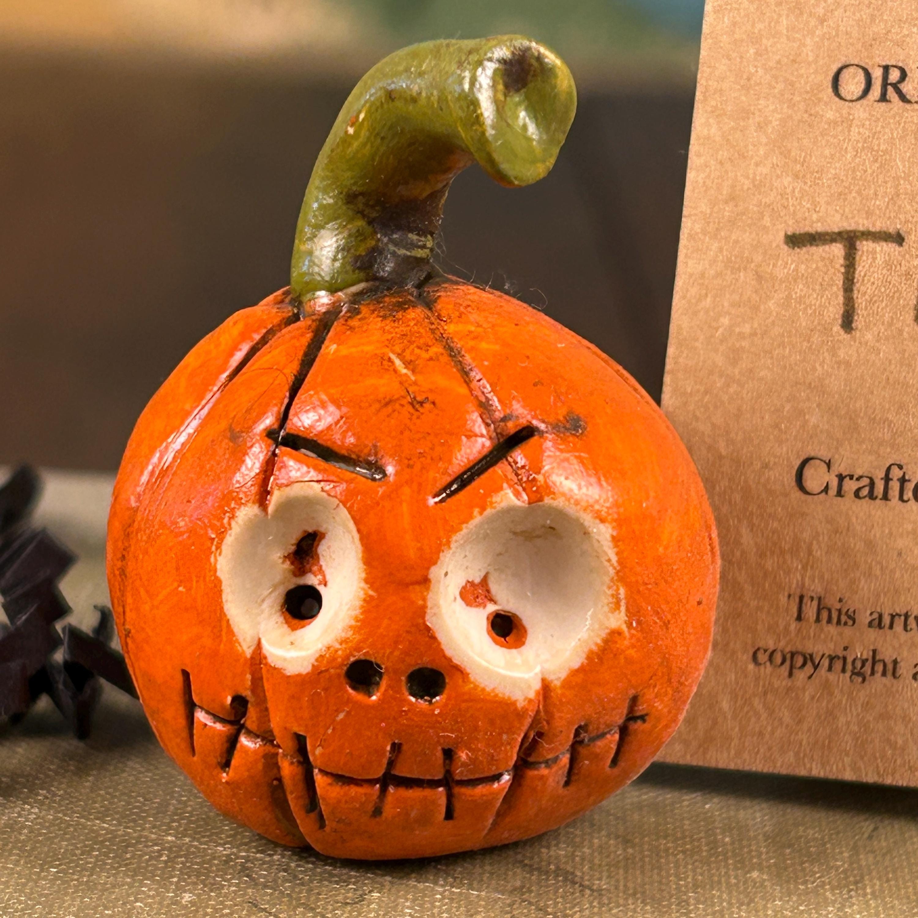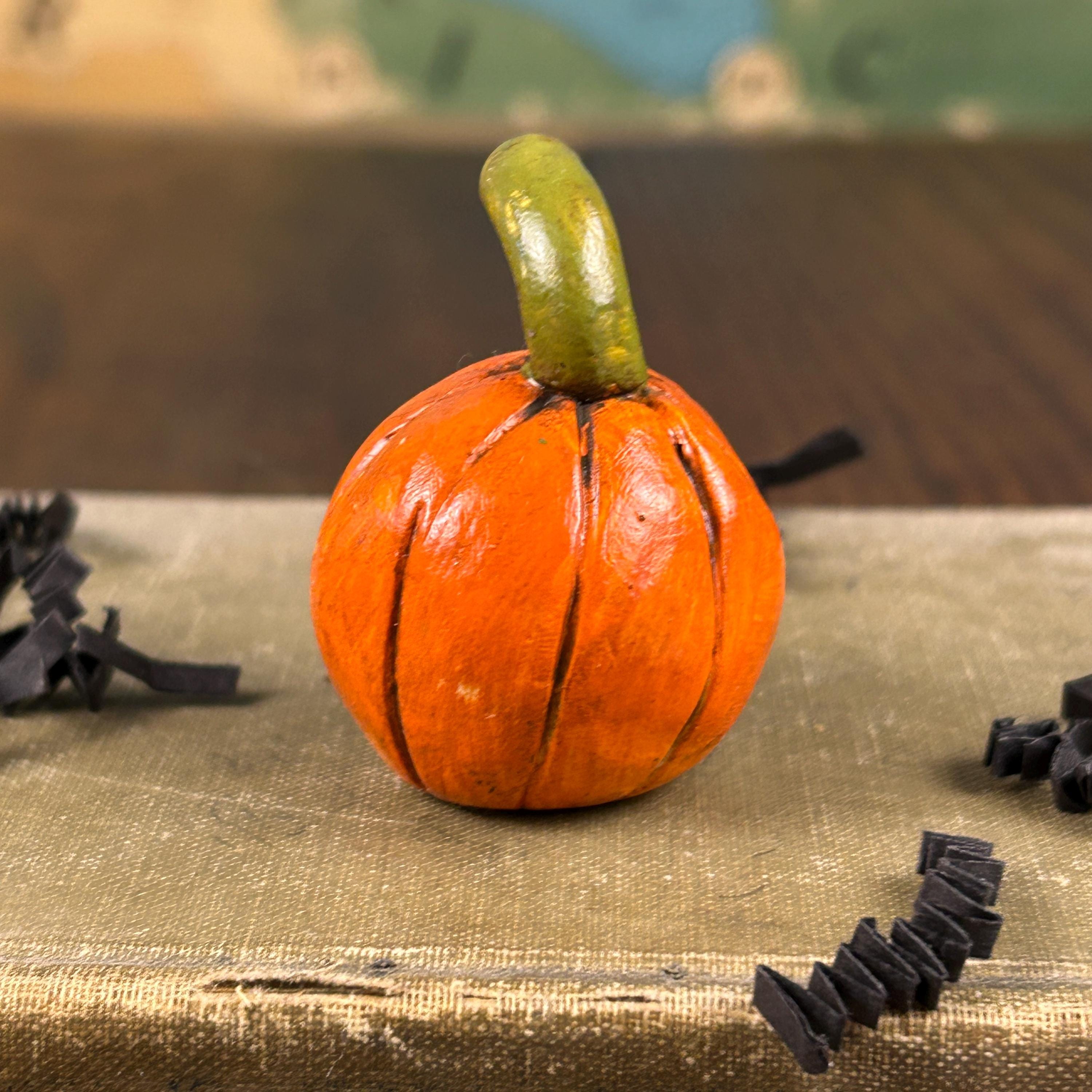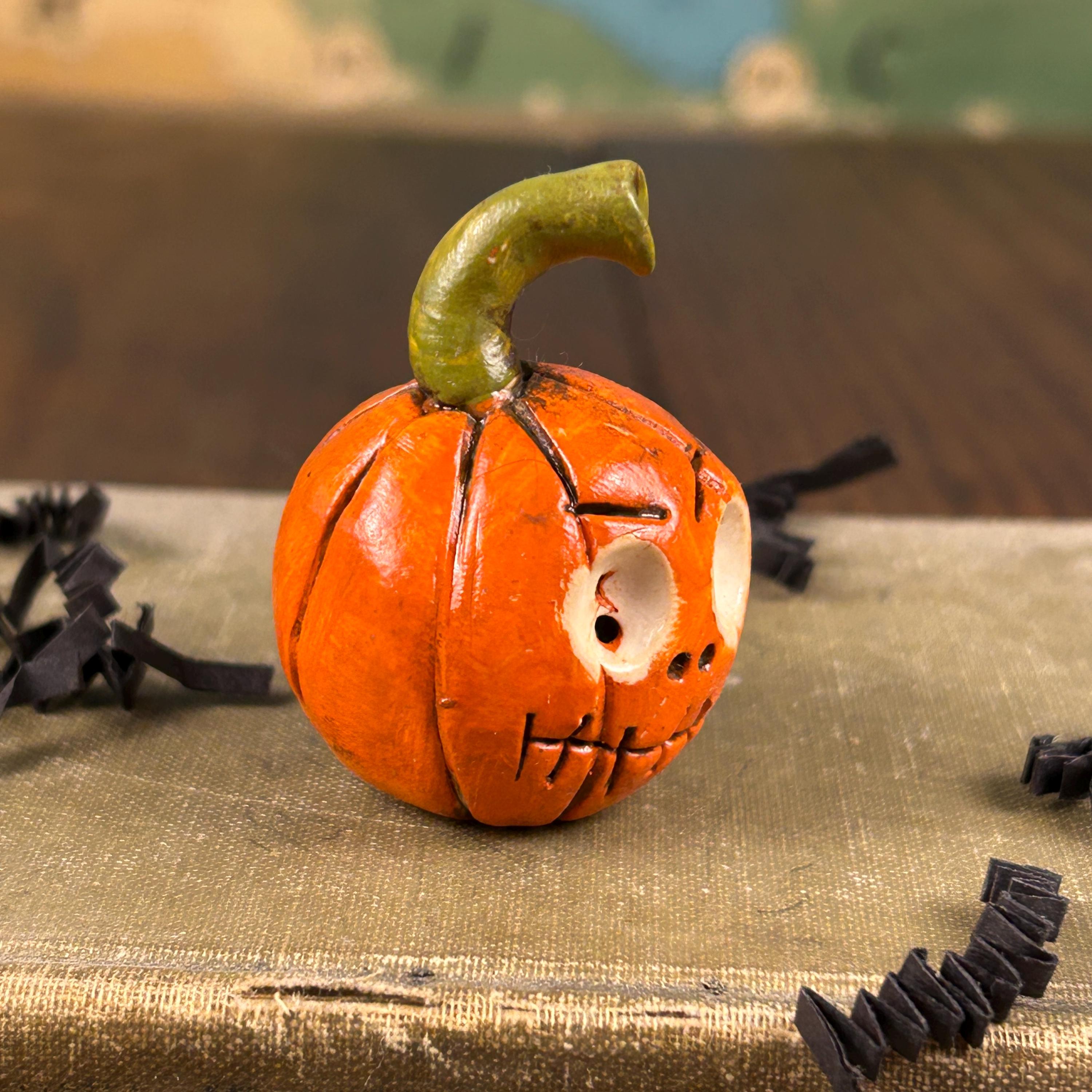 This sweet little pumpkin has a face only a mother would love, but he is ready to scare at Halloween. He is small in stature, but full of personality and will add a touch of whimsy and fun to your Halloween decor, dollhouse, miniature Halloween scene, or just tucked on a shelf for a sweet Halloween surprise.