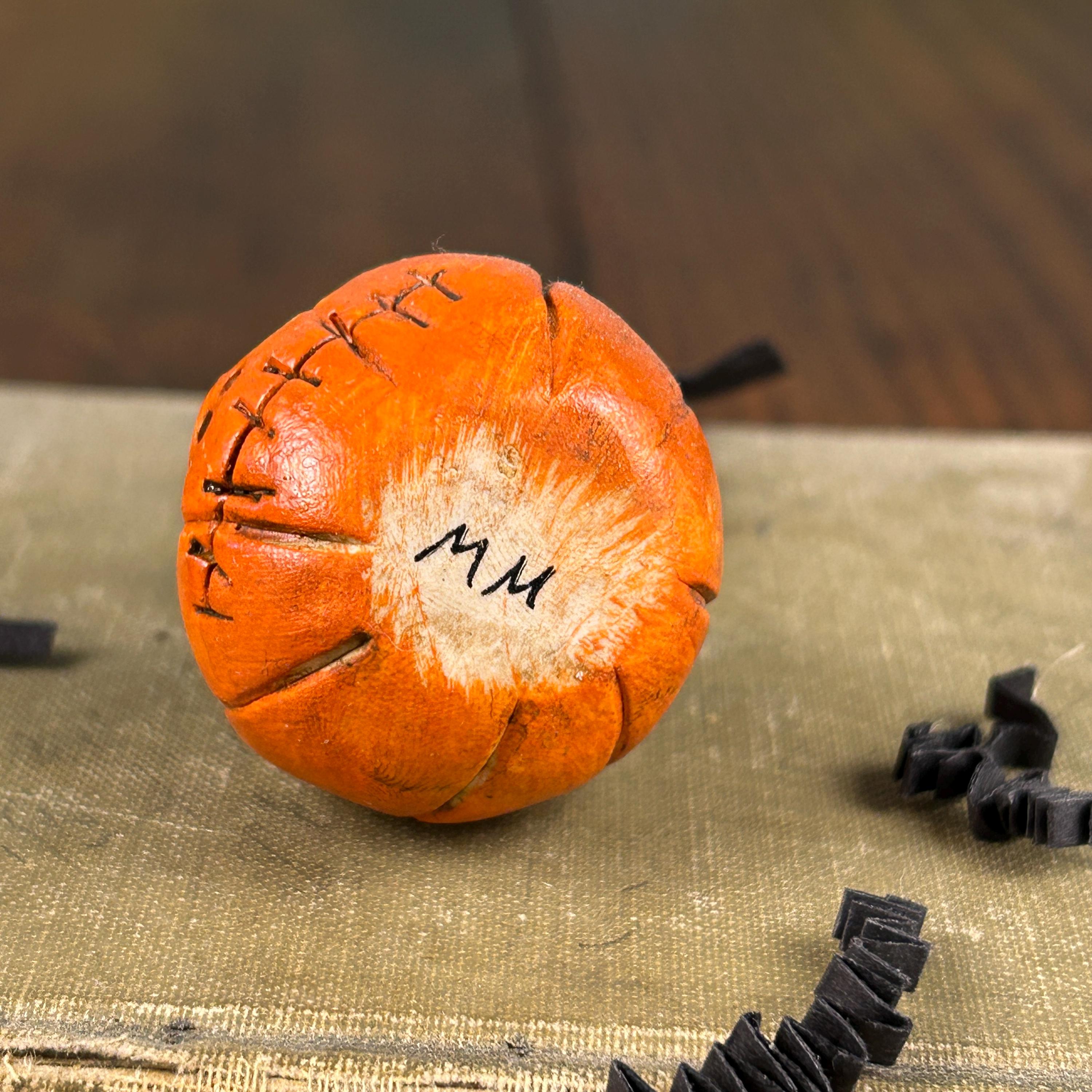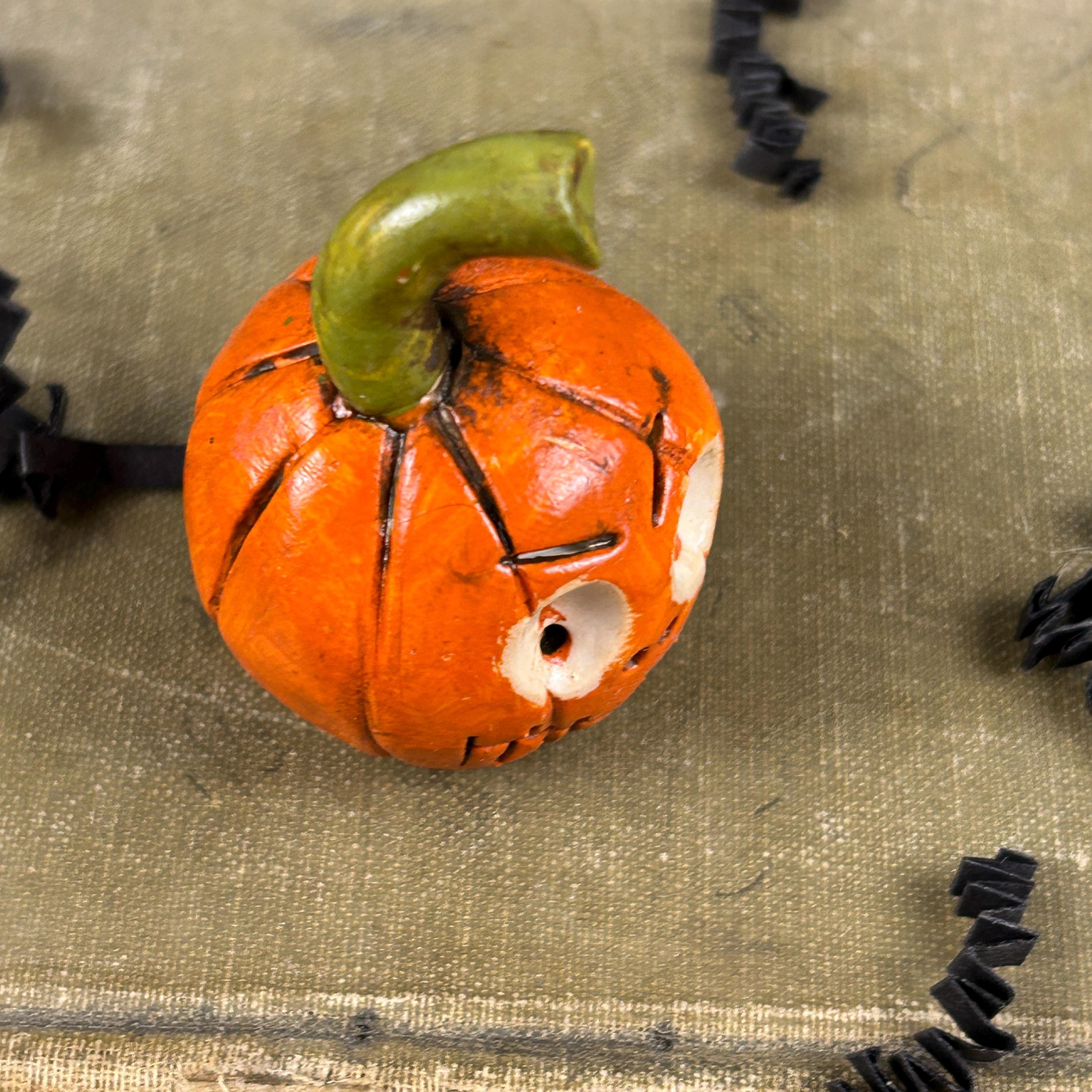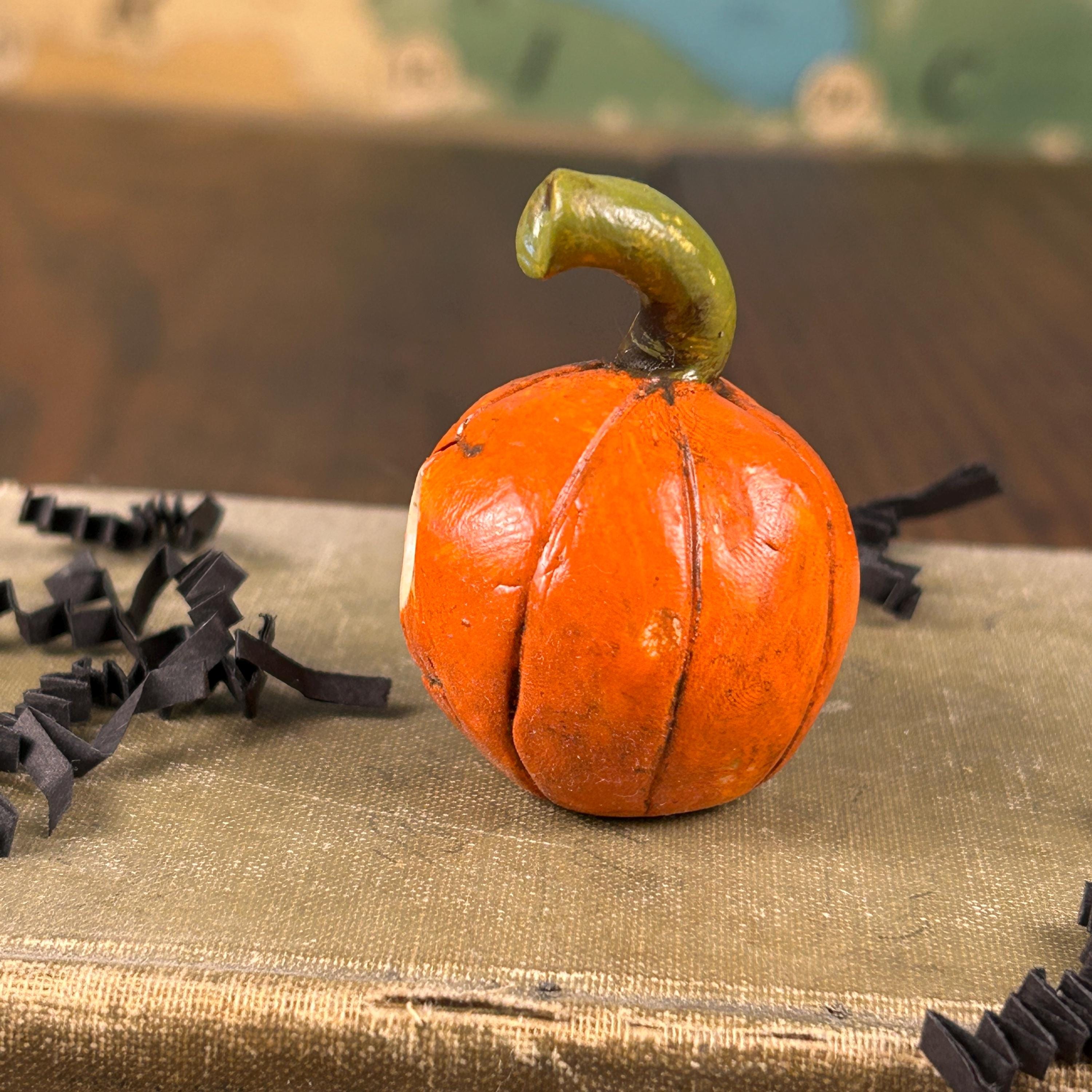 This sweet little pumpkin has a face only a mother would love, but he is ready to scare at Halloween. He is small in stature, but full of personality and will add a touch of whimsy and fun to your Halloween decor, dollhouse, miniature Halloween scene, or just tucked on a shelf for a sweet Halloween surprise.