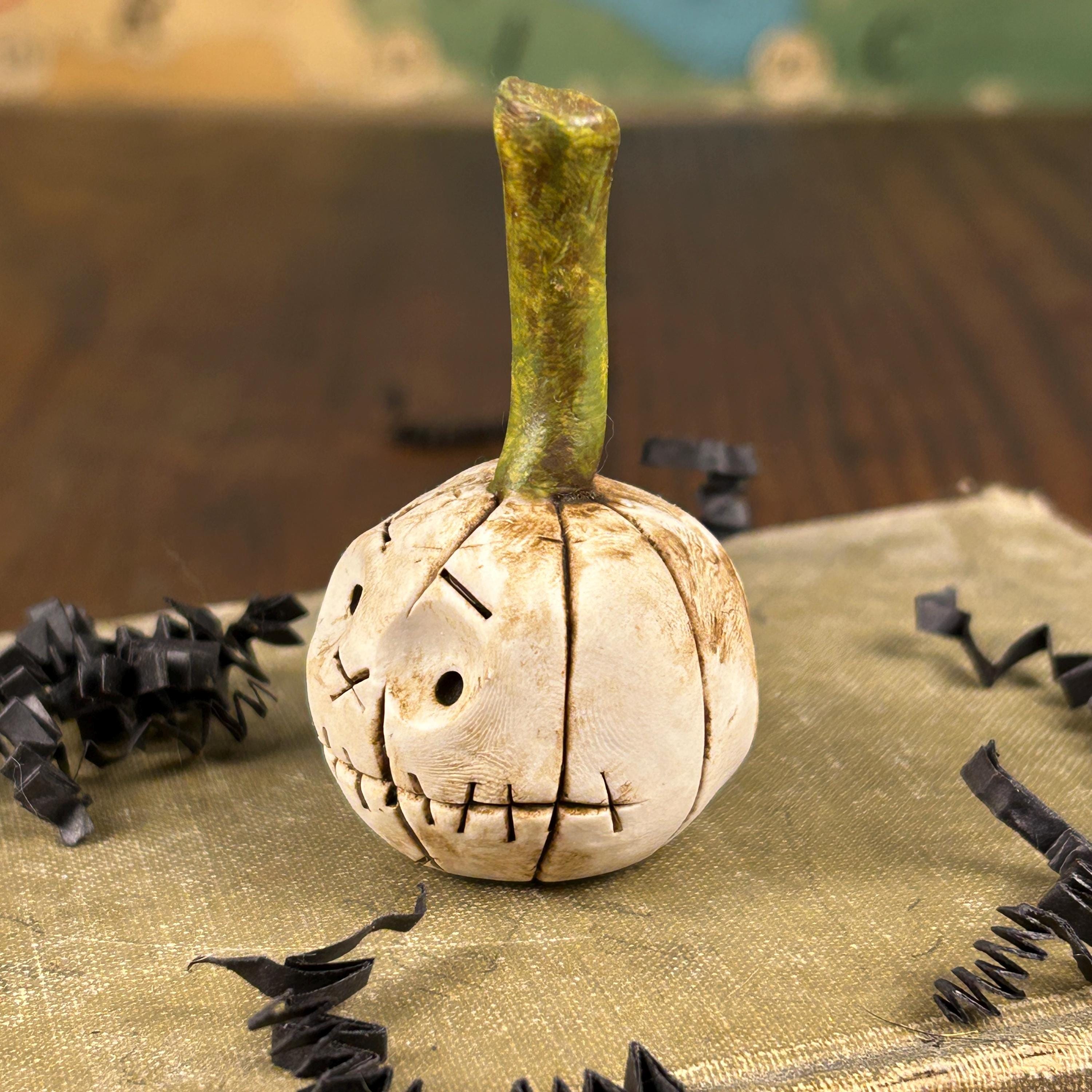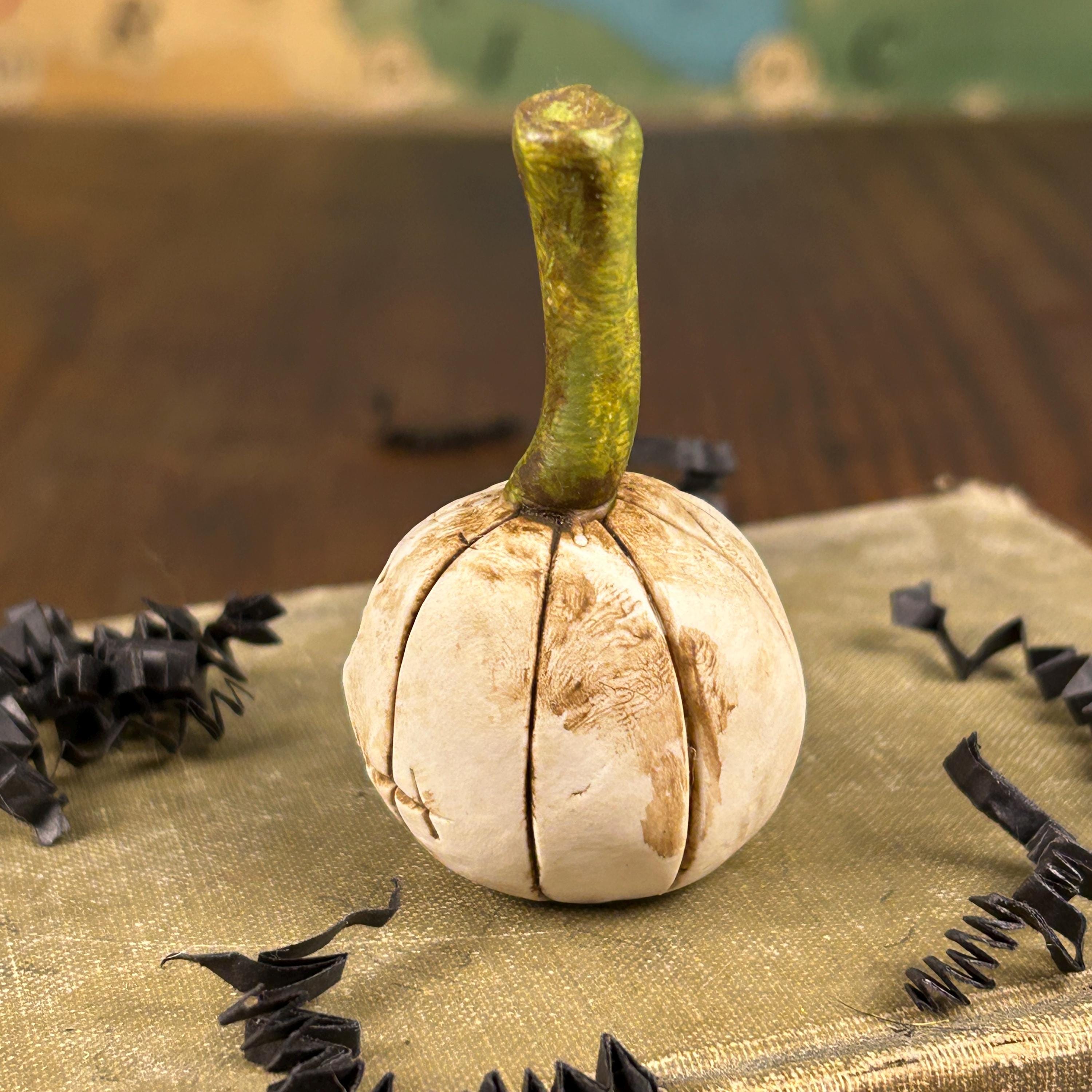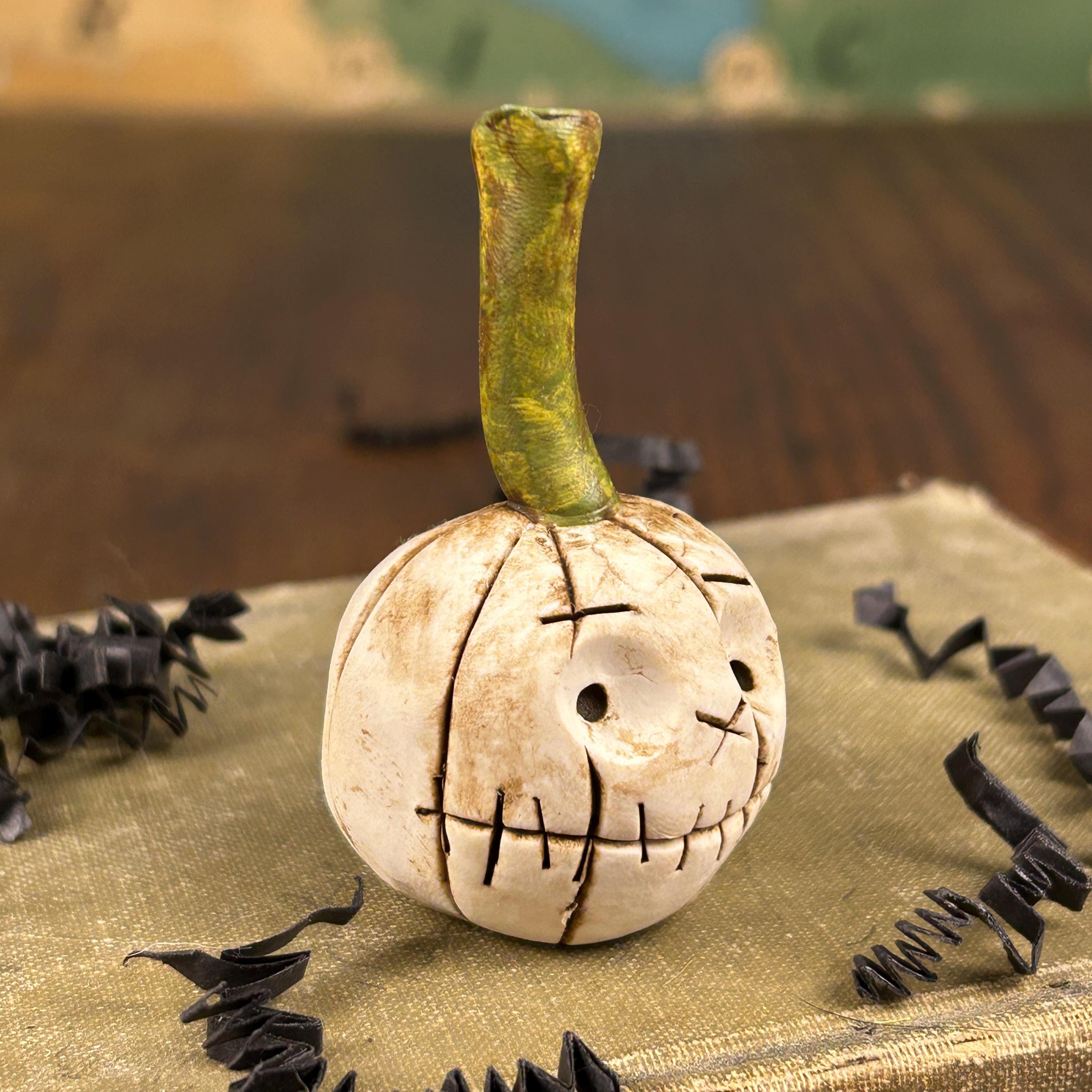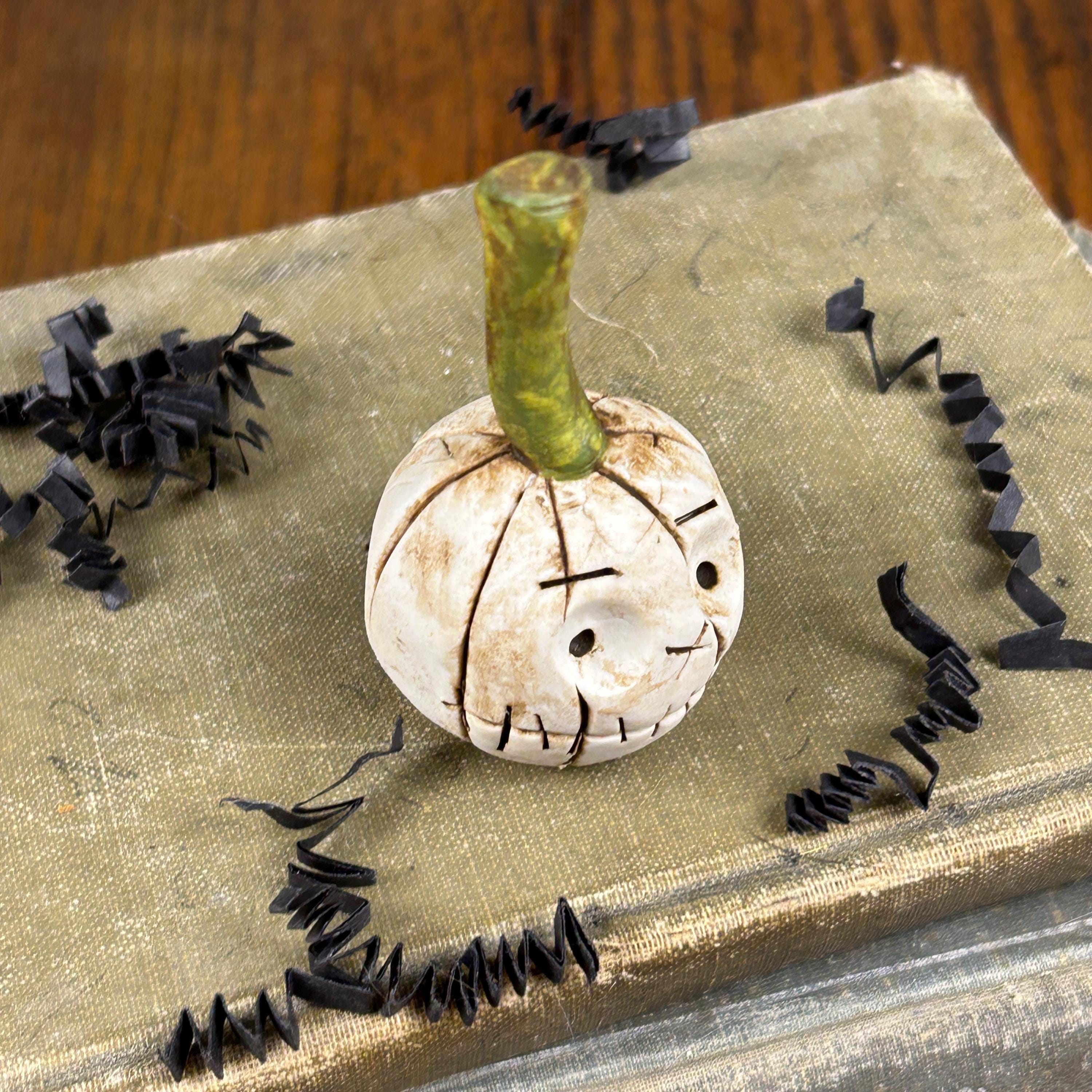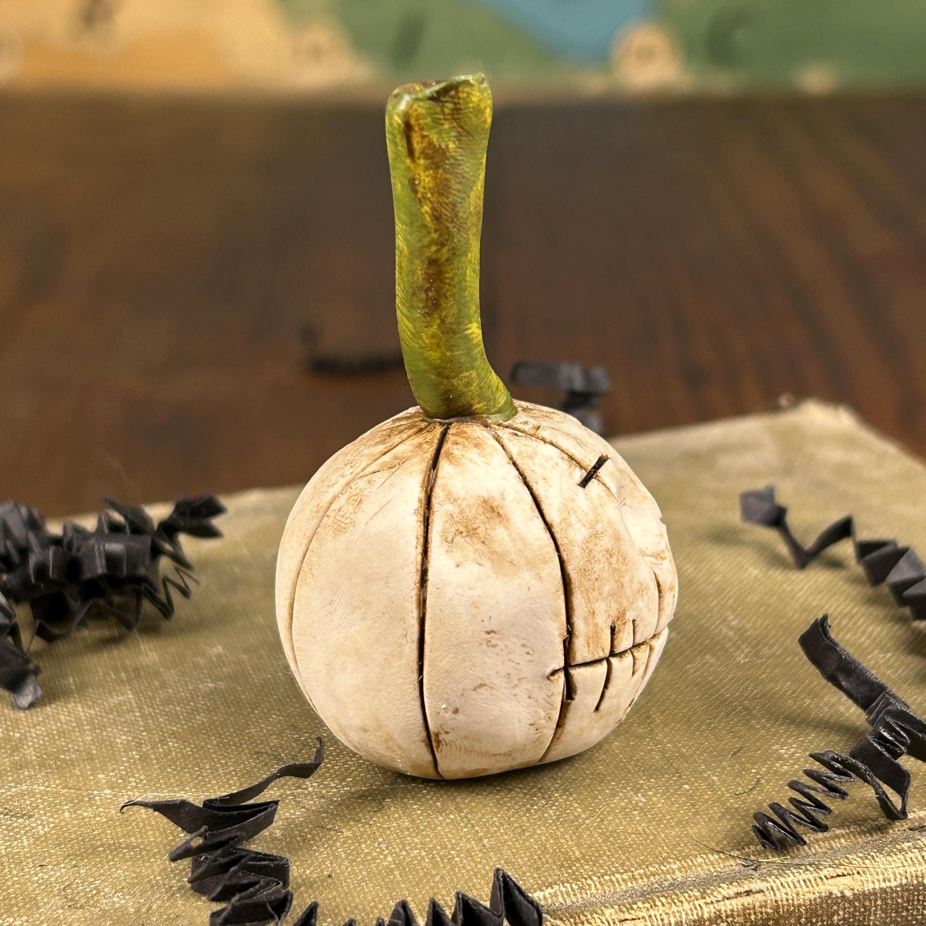 Meet FERDINAND. This sweet little ghost pumpkin has a bit of worry, but he is ready for Fall. He is small in stature, but full of personality and will add a touch of whimsy and fun to your Halloween decor, dollhouse, miniature Halloween scene, or just tucked on a shelf for a sweet Halloween surprise.
