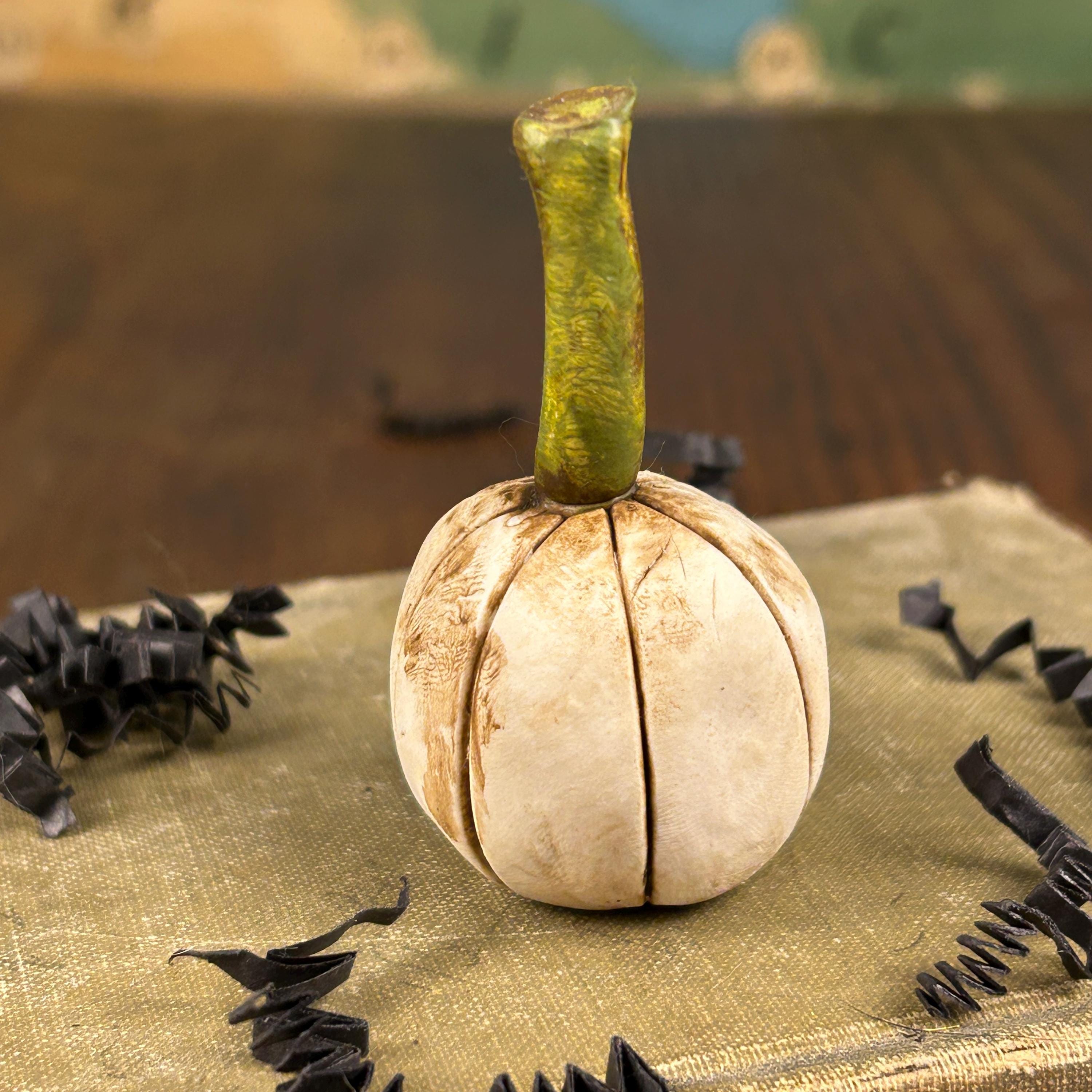 This tiny pumpkin is handmade by myself out of polymer clay. Each one has a unique style and look and comes with their own Certificate of Authenticity along with their name. They are sculpted, baked, hand-painted and finished with semi-gloss coating. Each one is signed on the bottom and comes packaged in its own little wooden box, crinkle paper shred, wrapped in a clear bag, and tied with twine.
