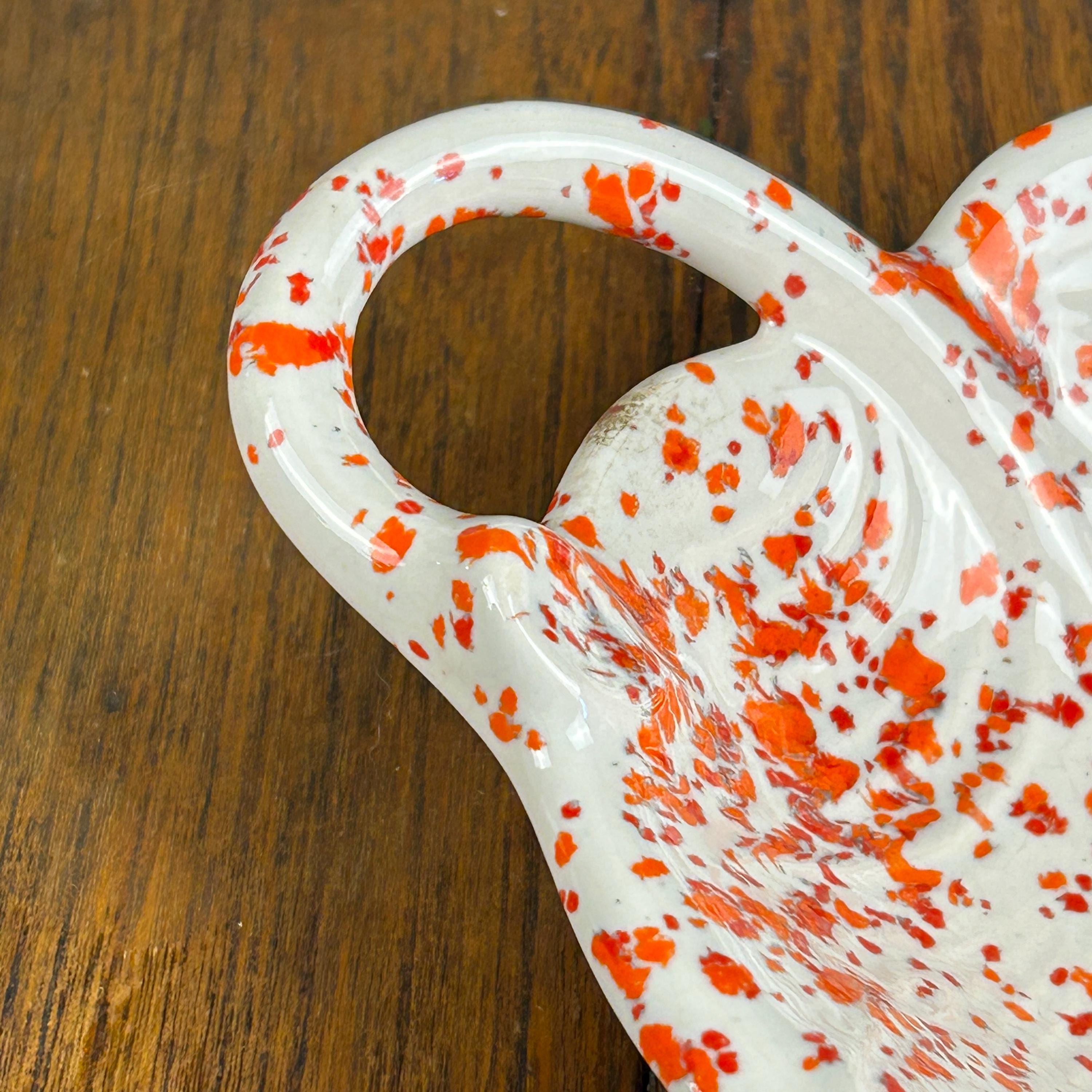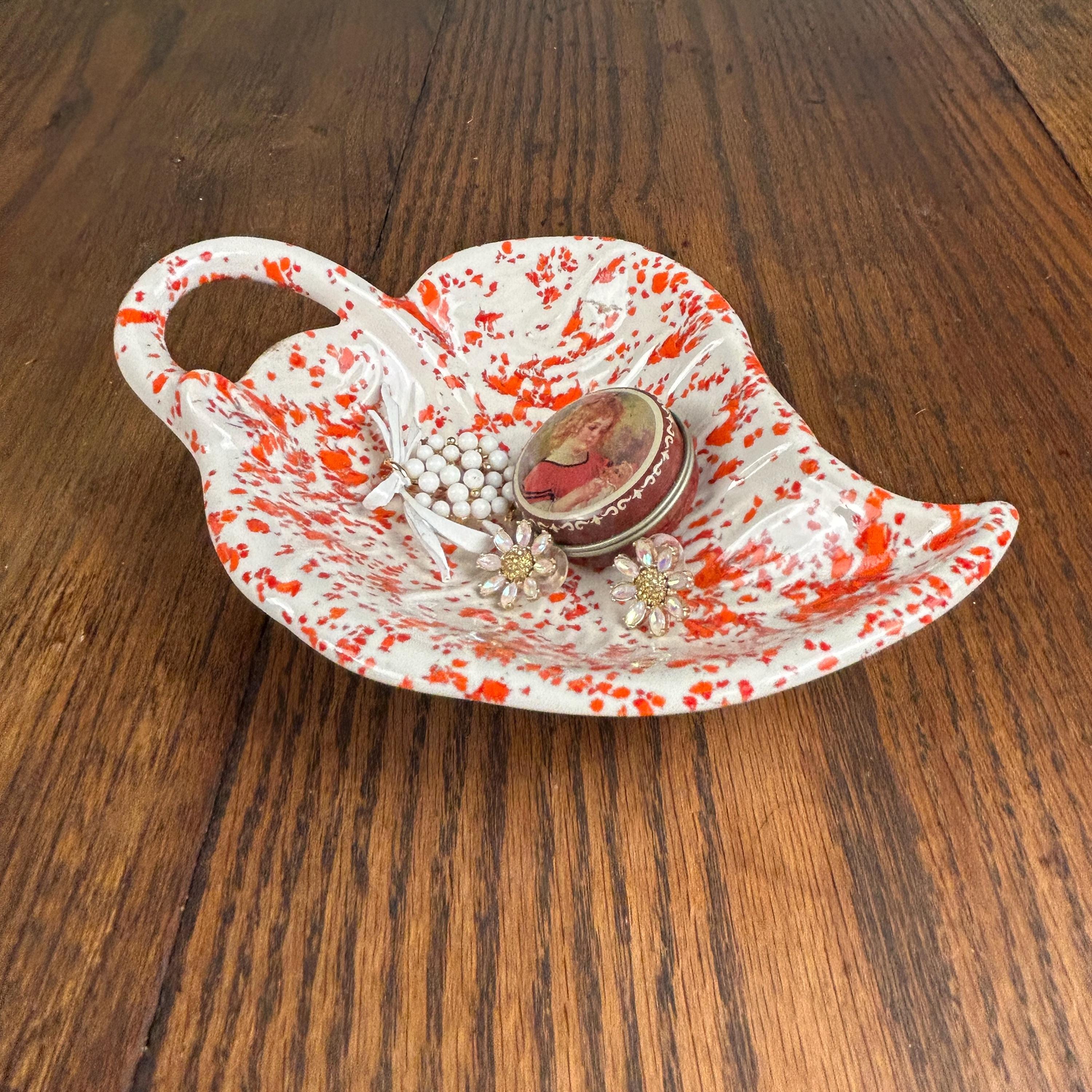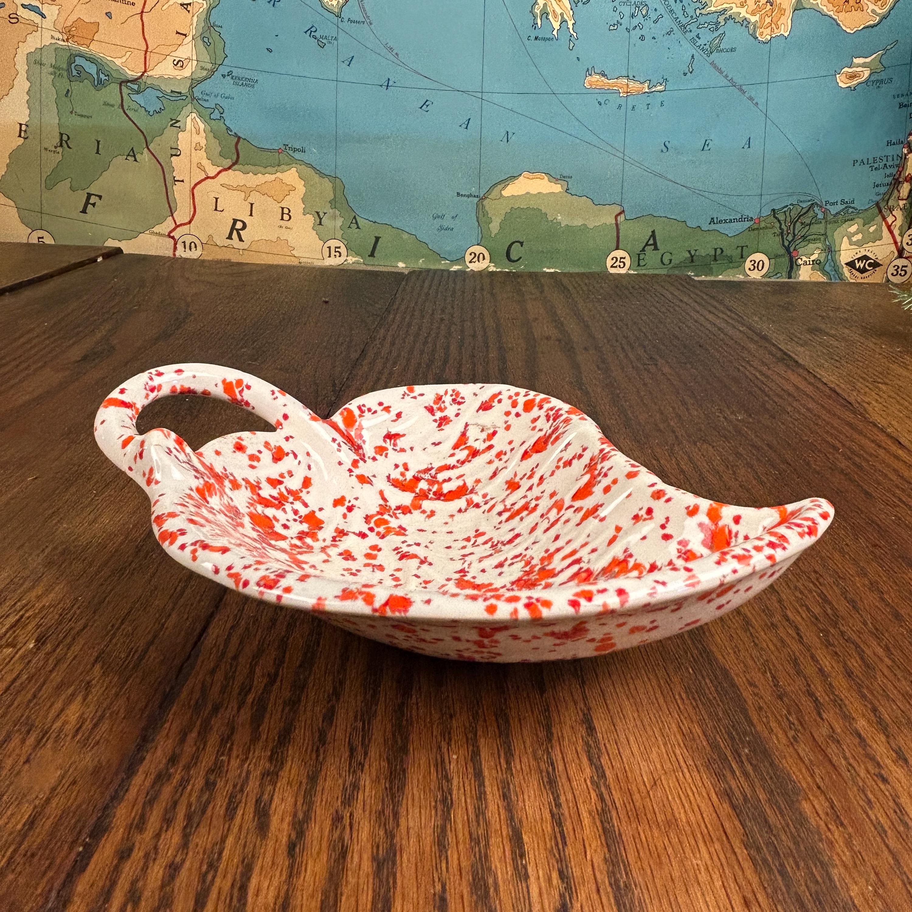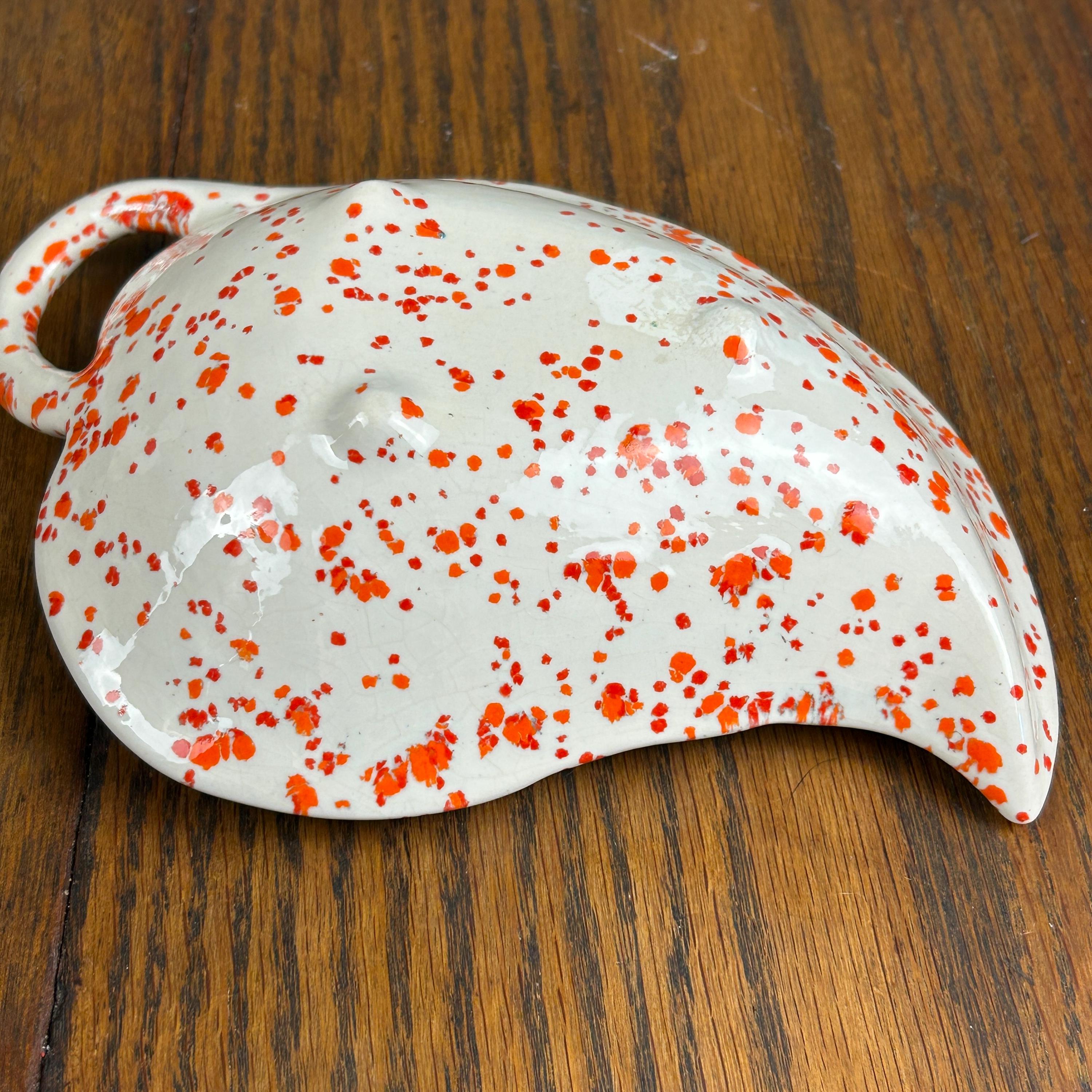 This ultra cool orange and red splatterware leaf bowl is flawless. Made in the 70s, its base is white with orange and red splatter glaze covering the top and bottom. A small leaf stem adorns one end. The piece is in excellent condition with no chips or cracks. Very minimal crazing. None is visible to the naked eye.