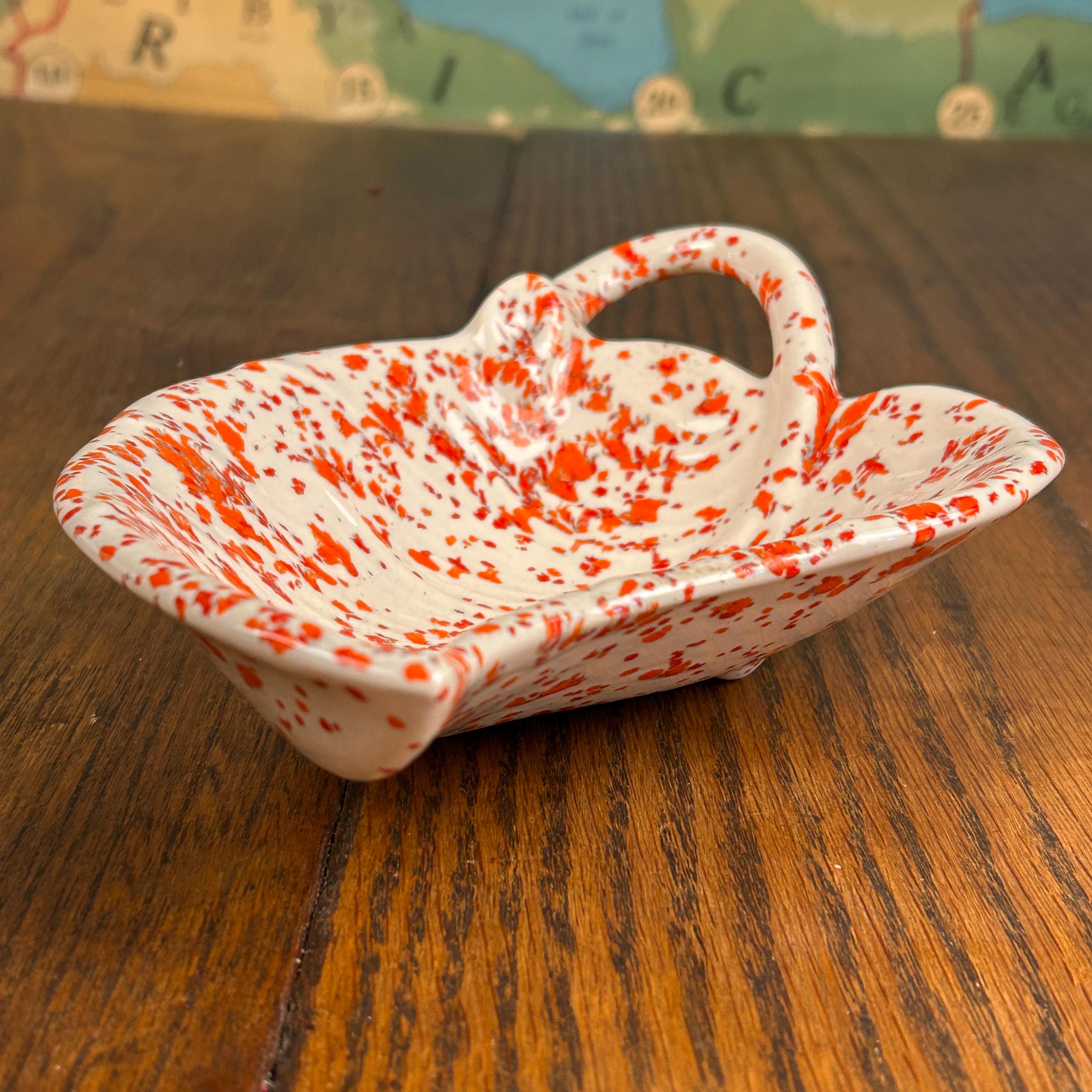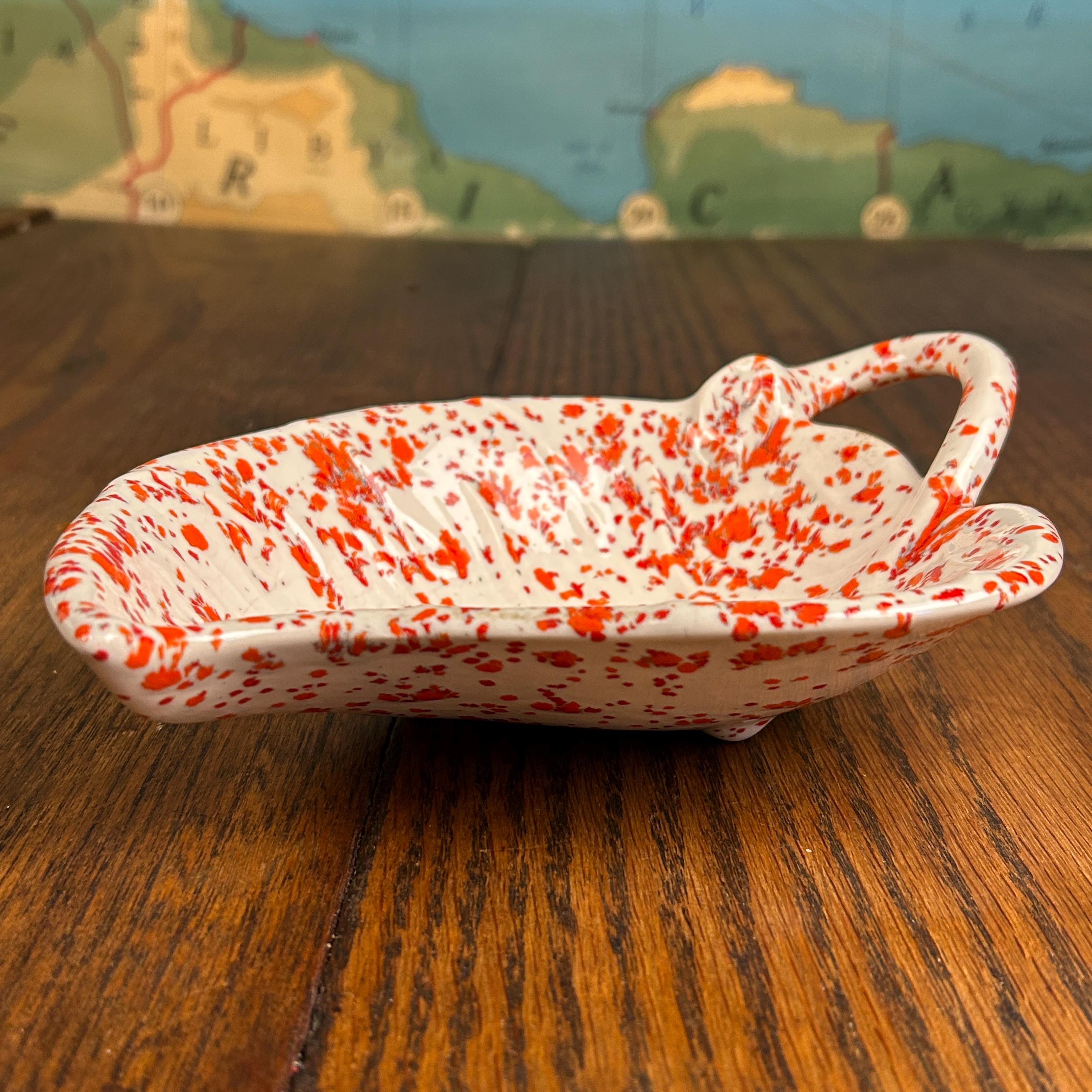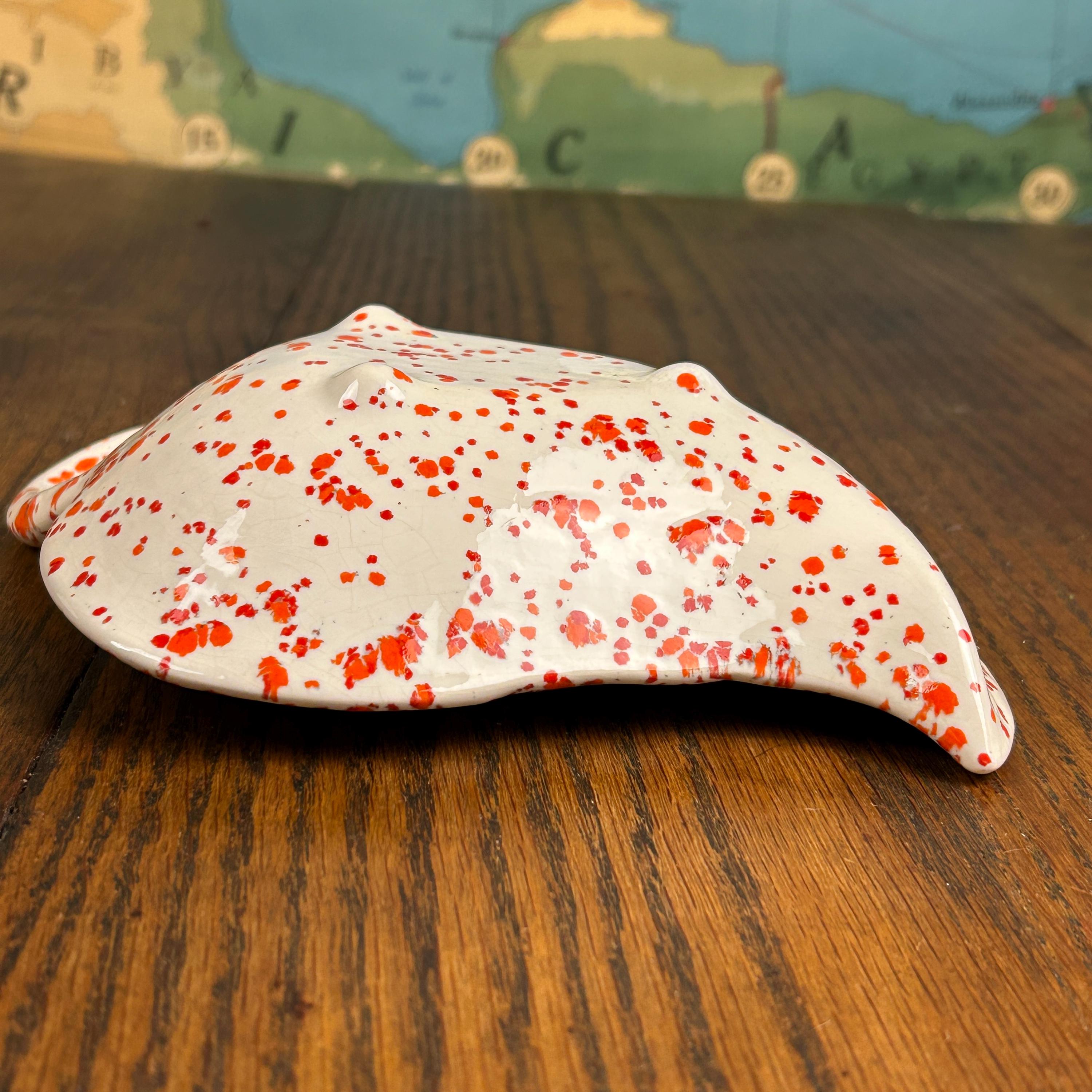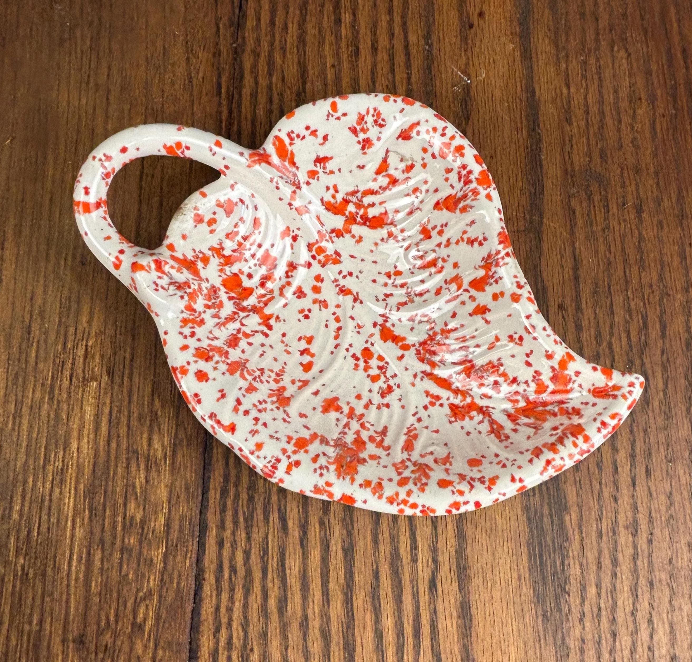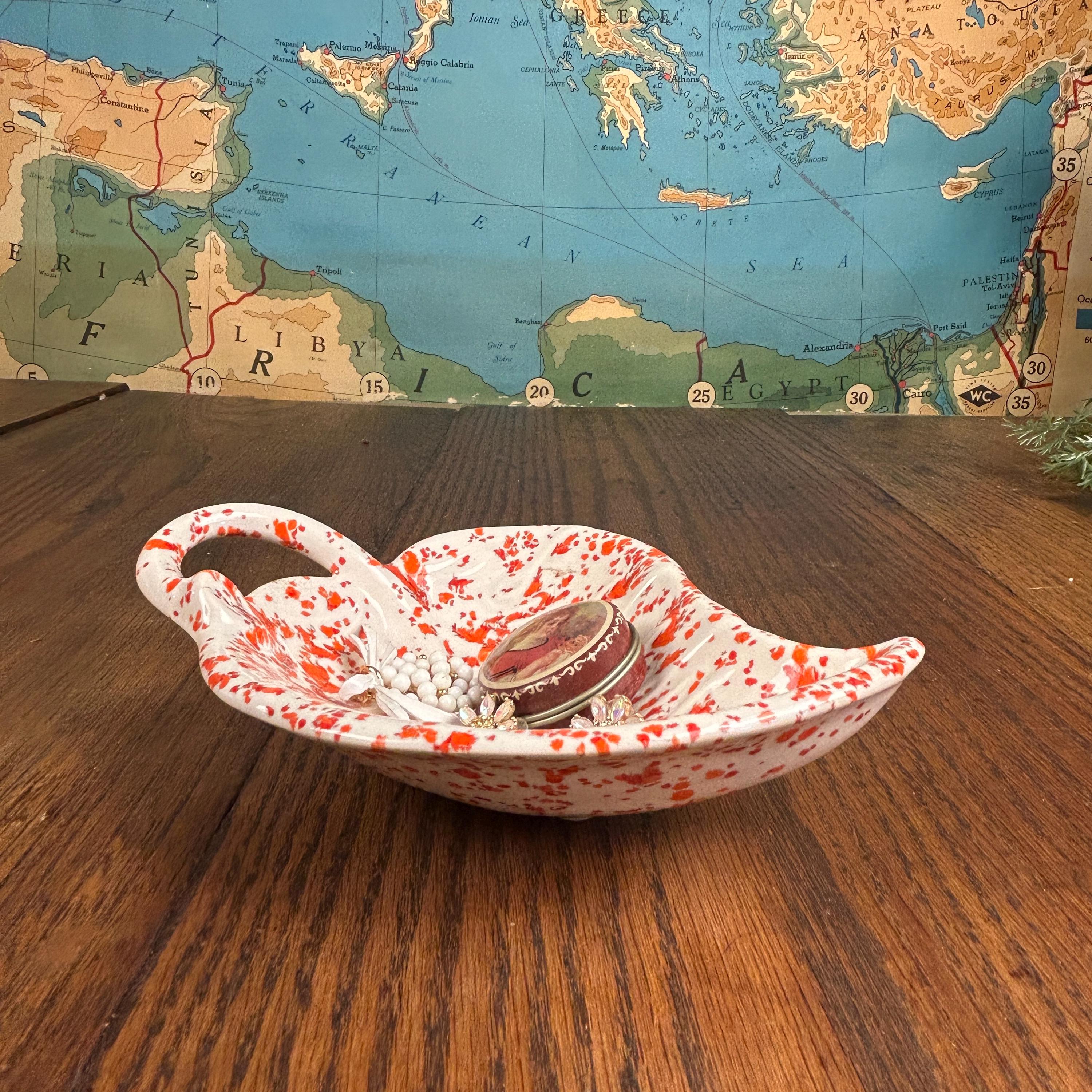 This ultra cool orange and red splatterware leaf bowl is flawless. Made in the 70s, its base is white with orange and red splatter glaze covering the top and bottom. A small leaf stem adorns one end. The piece is in excellent condition with no chips or cracks. Very minimal crazing. None is visible to the naked eye.