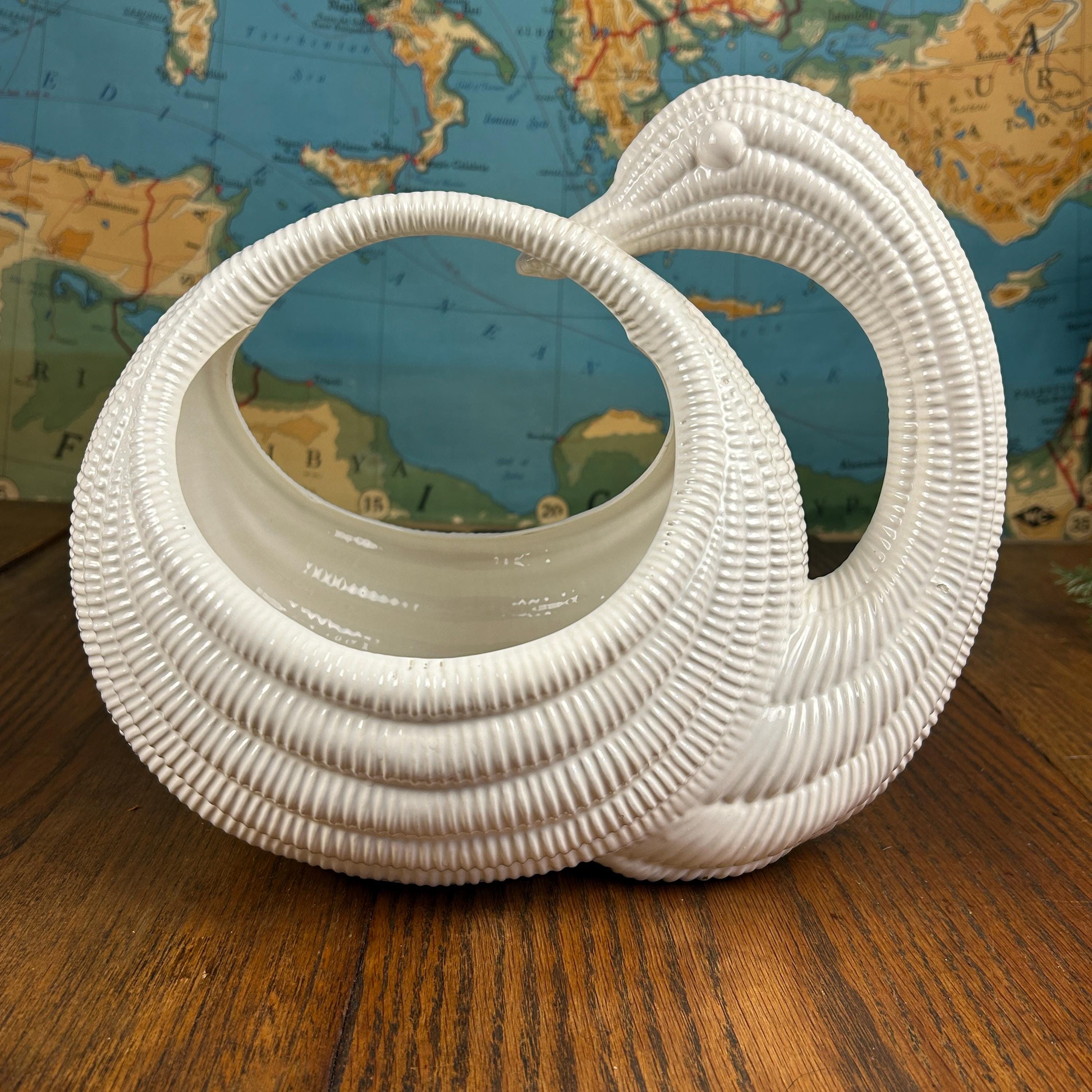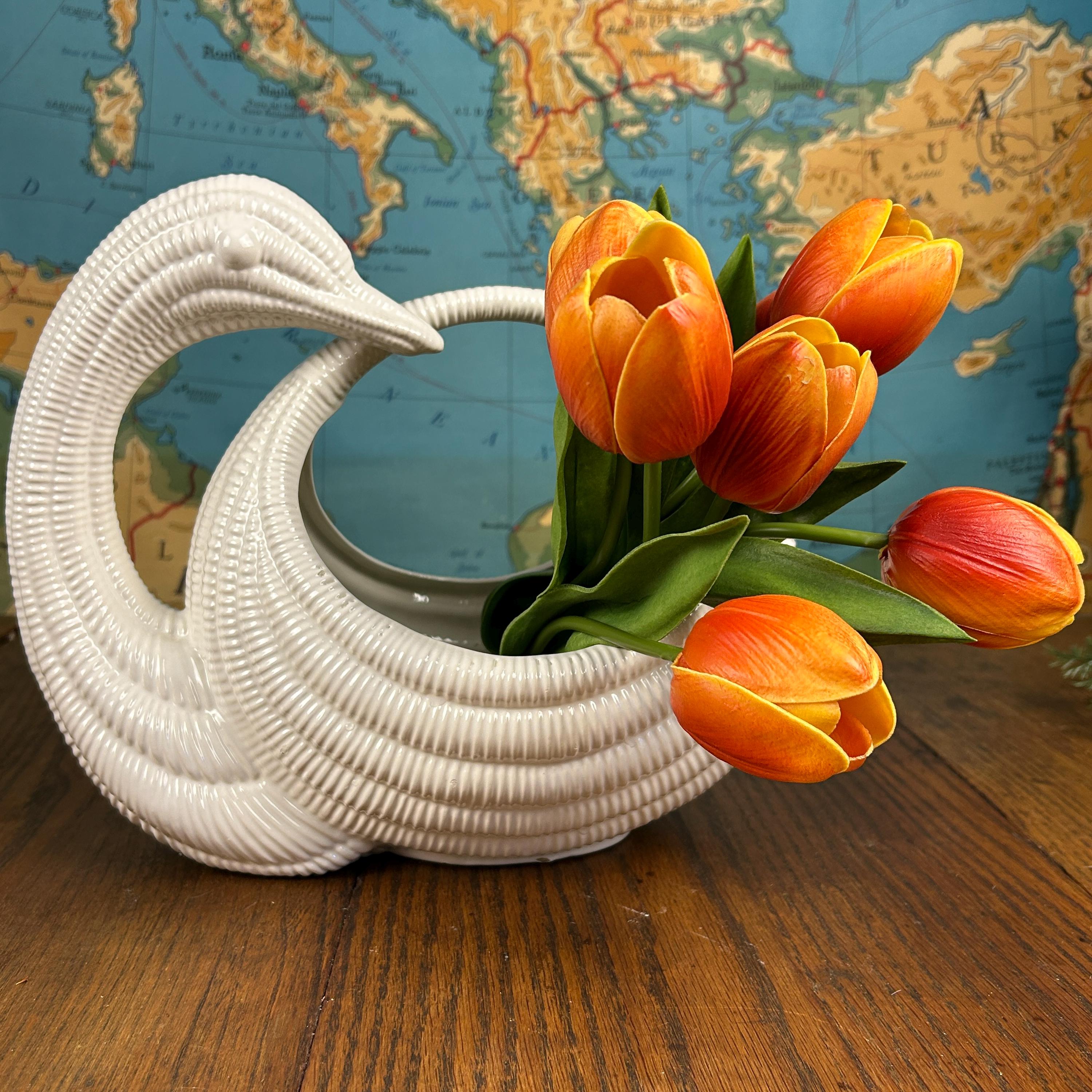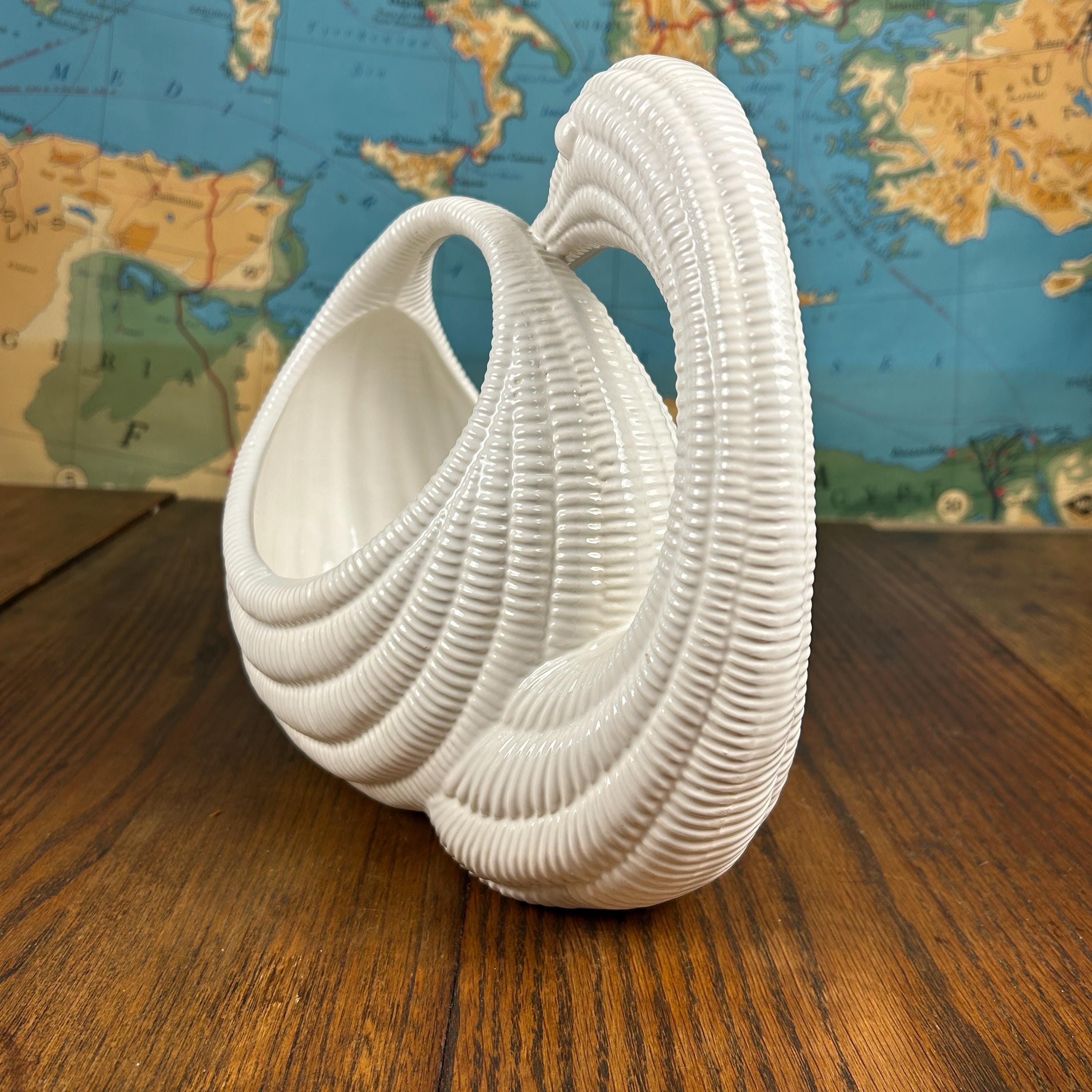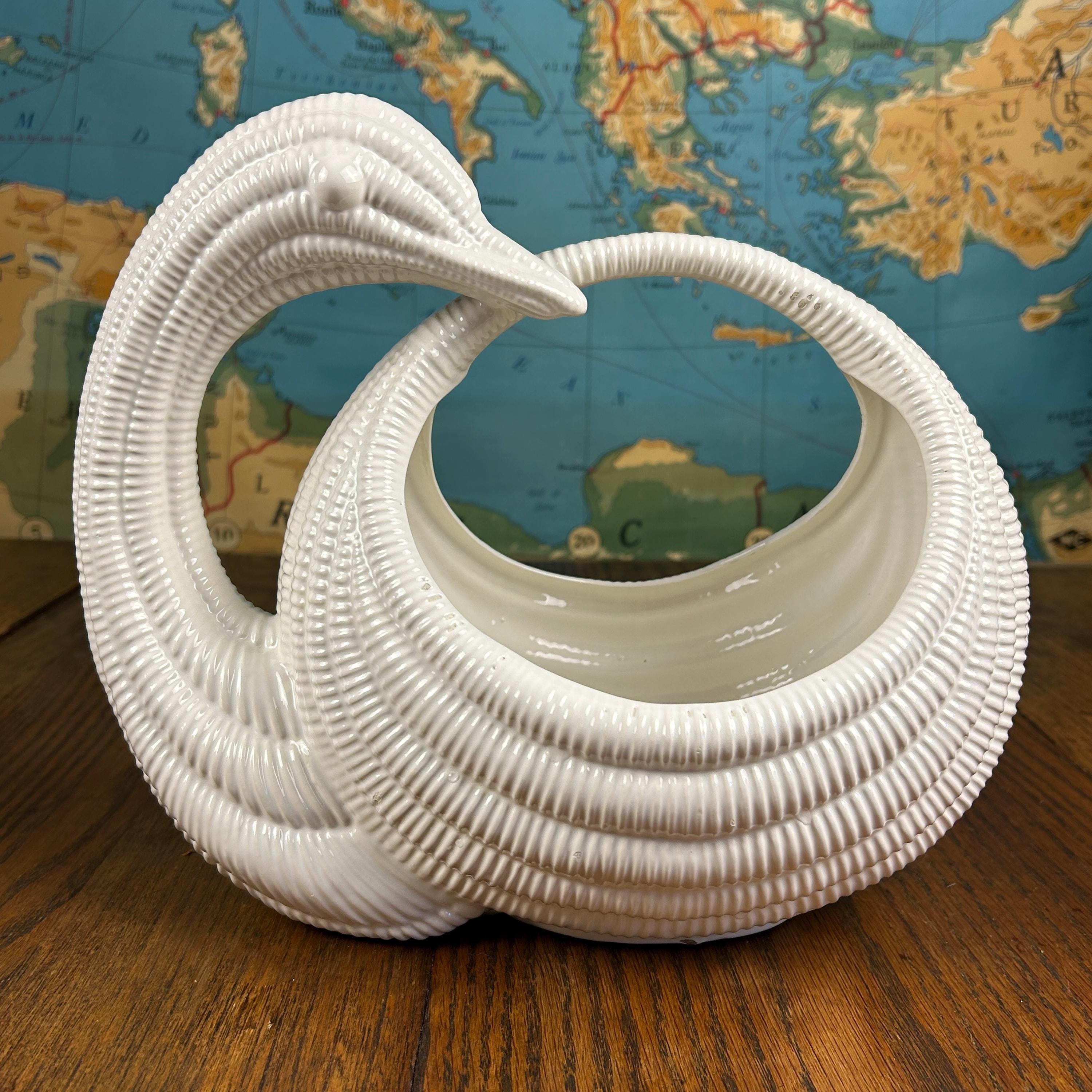 This 80s vintage ceramic faux wicker swan planter can be used as a planter, basket, or decorative piece.