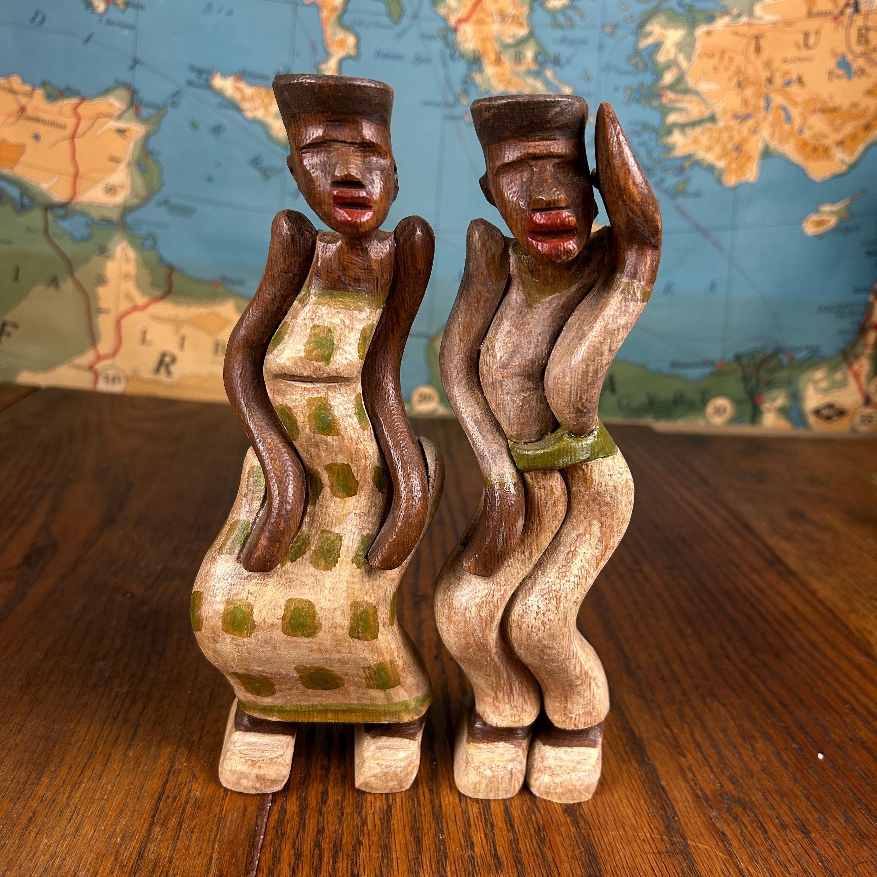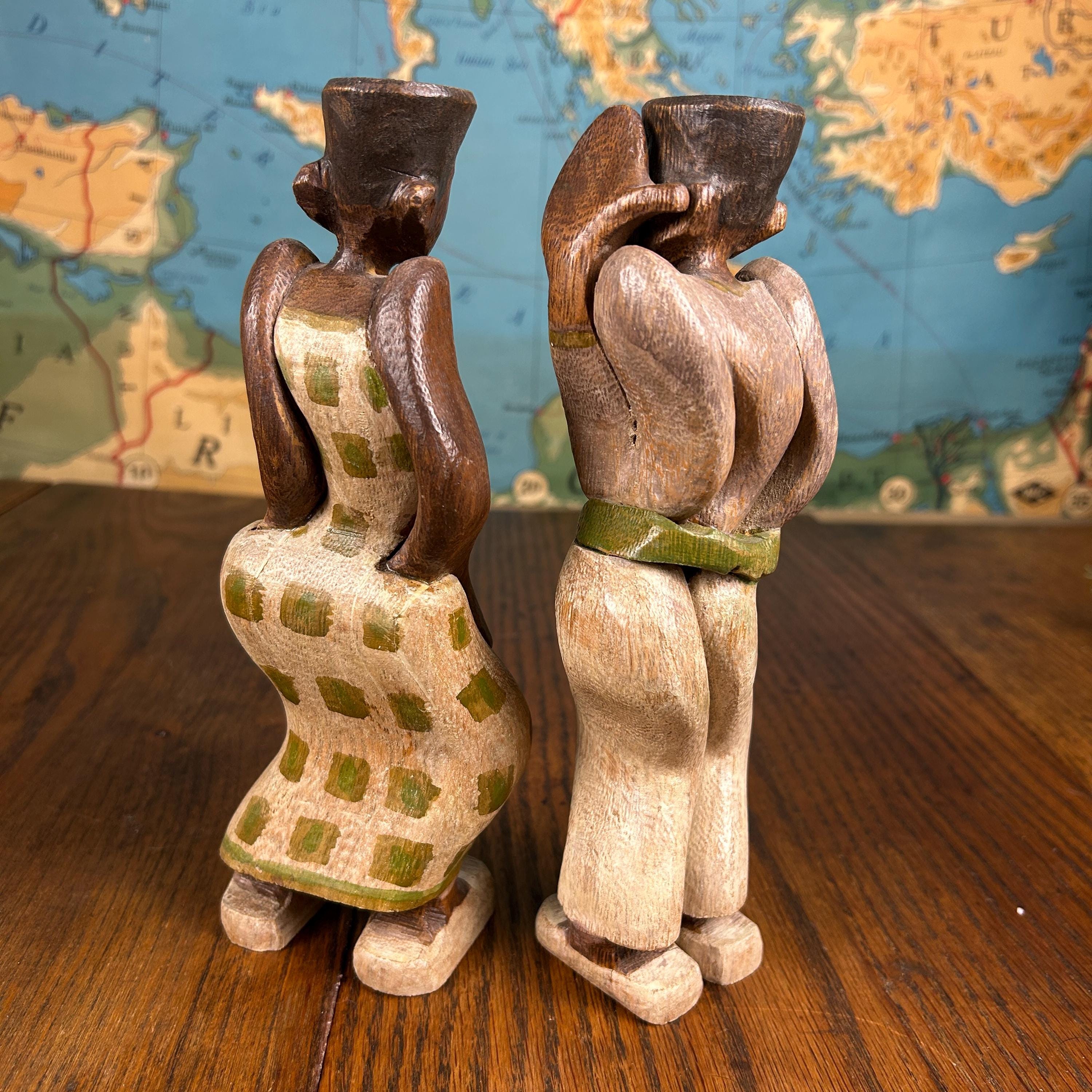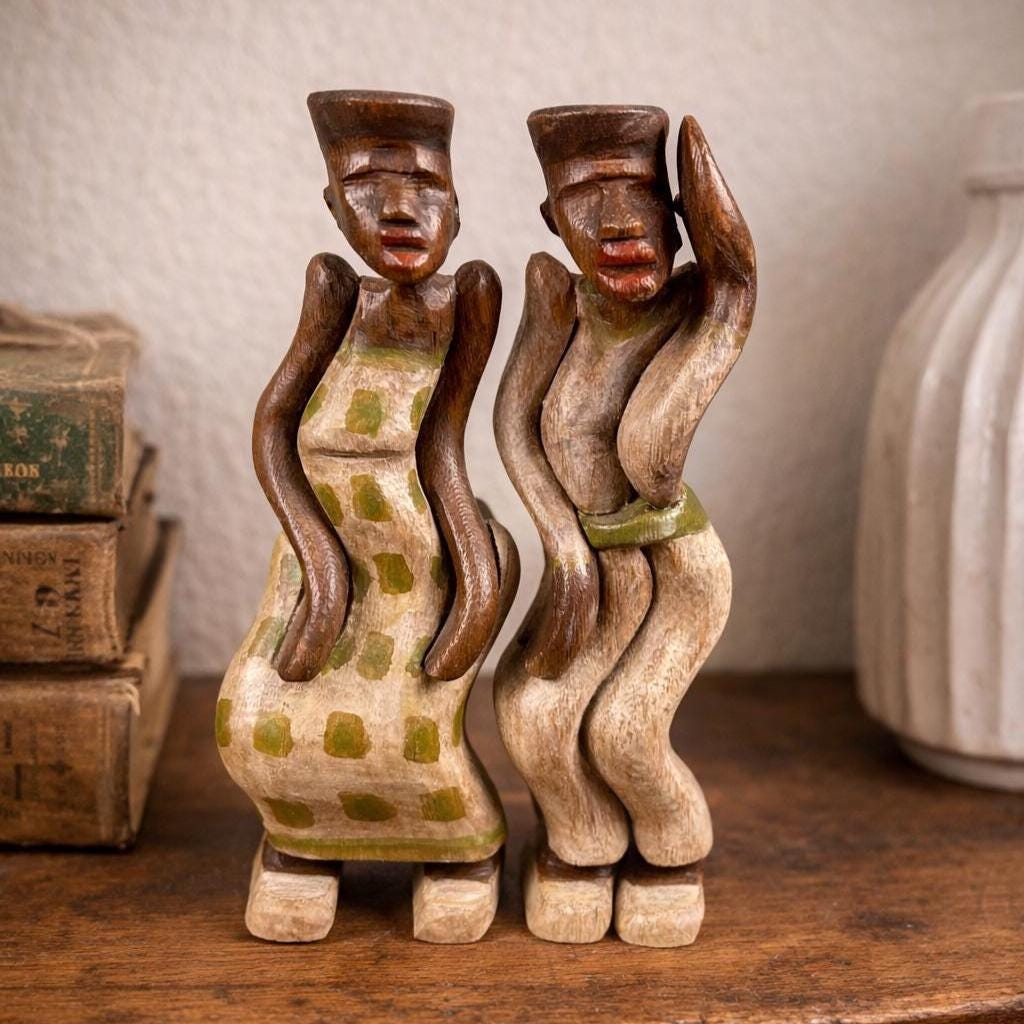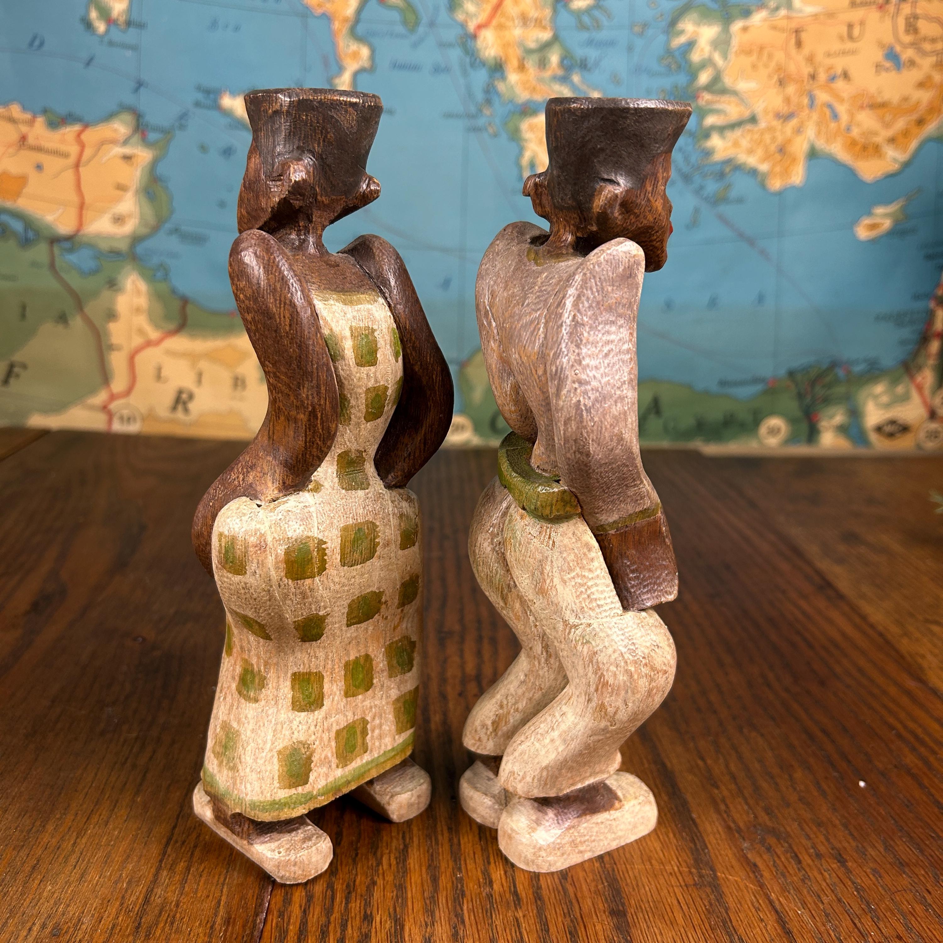 These are not only beautiful, but interesting as they are carved to stand together with a sway of their bodies. They would make a special gift for people who like antiques, especially wooden statues and figurines.