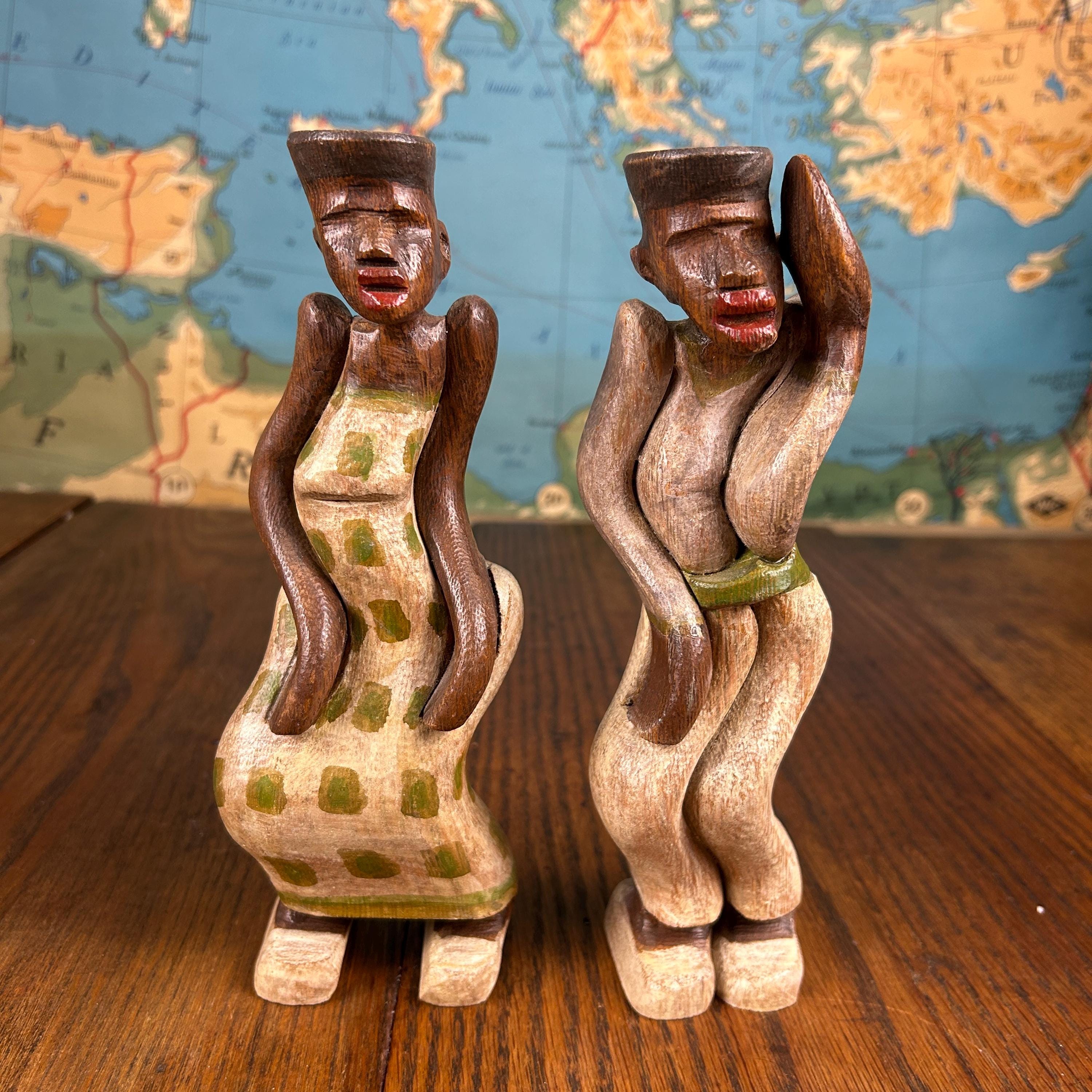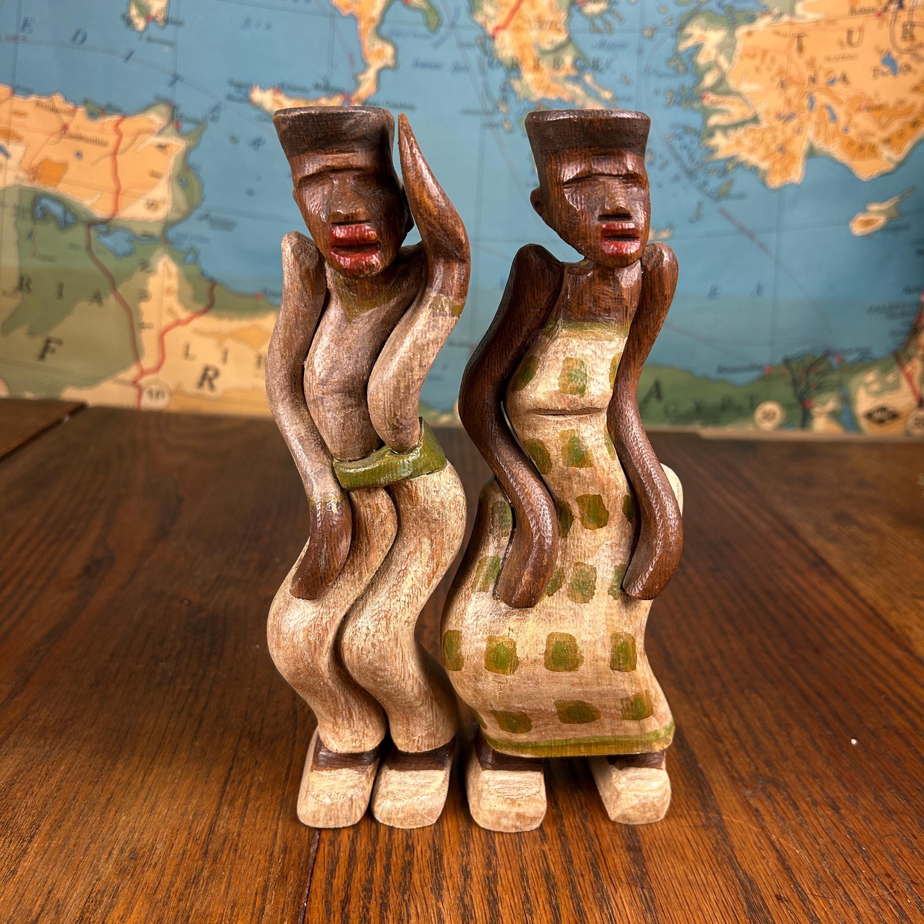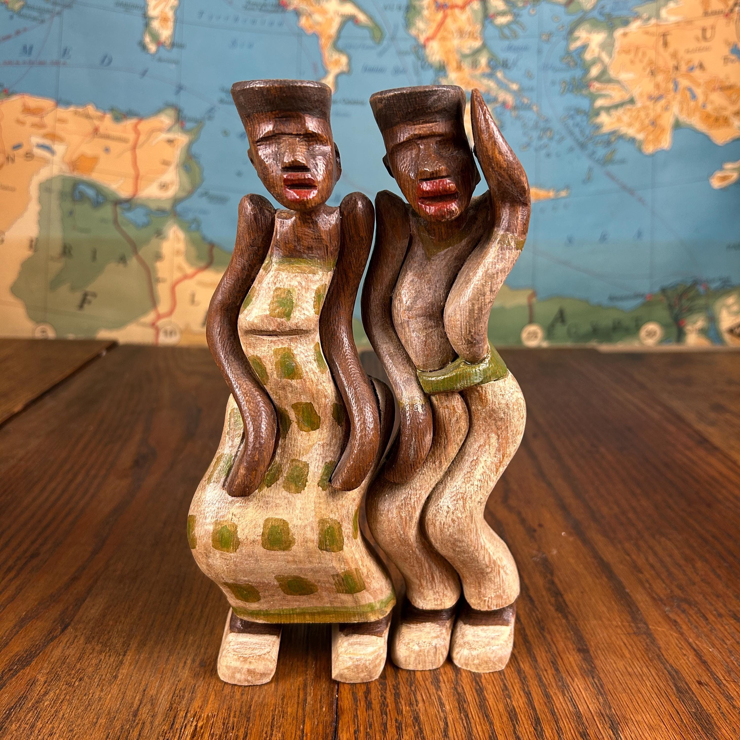 These are not only beautiful, but interesting as they are carved to stand together with a sway of their bodies. They would make a special gift for people who like antiques, especially wooden statues and figurines.