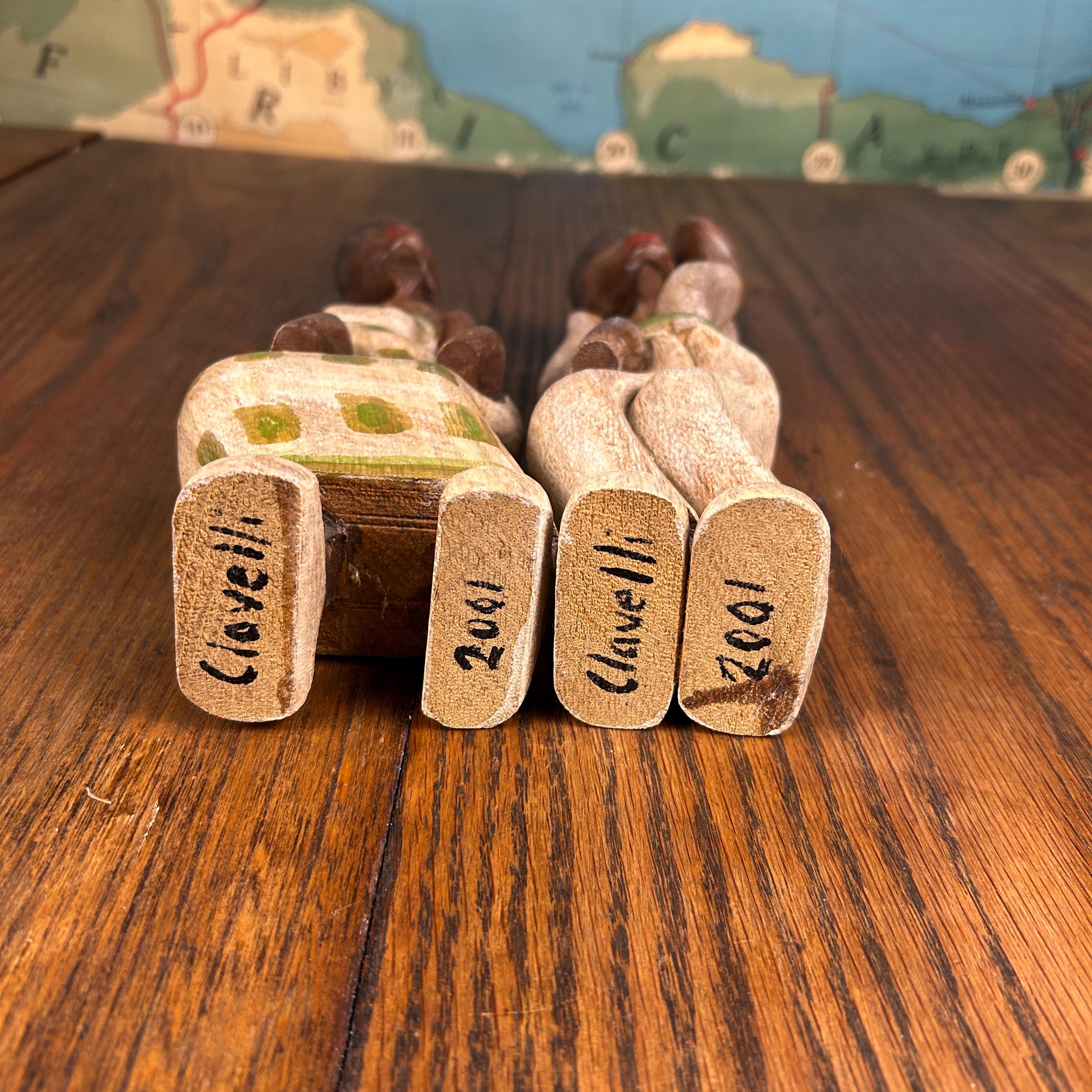These statues are in excellent condition. They are both hand-painted and hand-carved and are signed by the artist Clavelli 2001 on the bottoms.