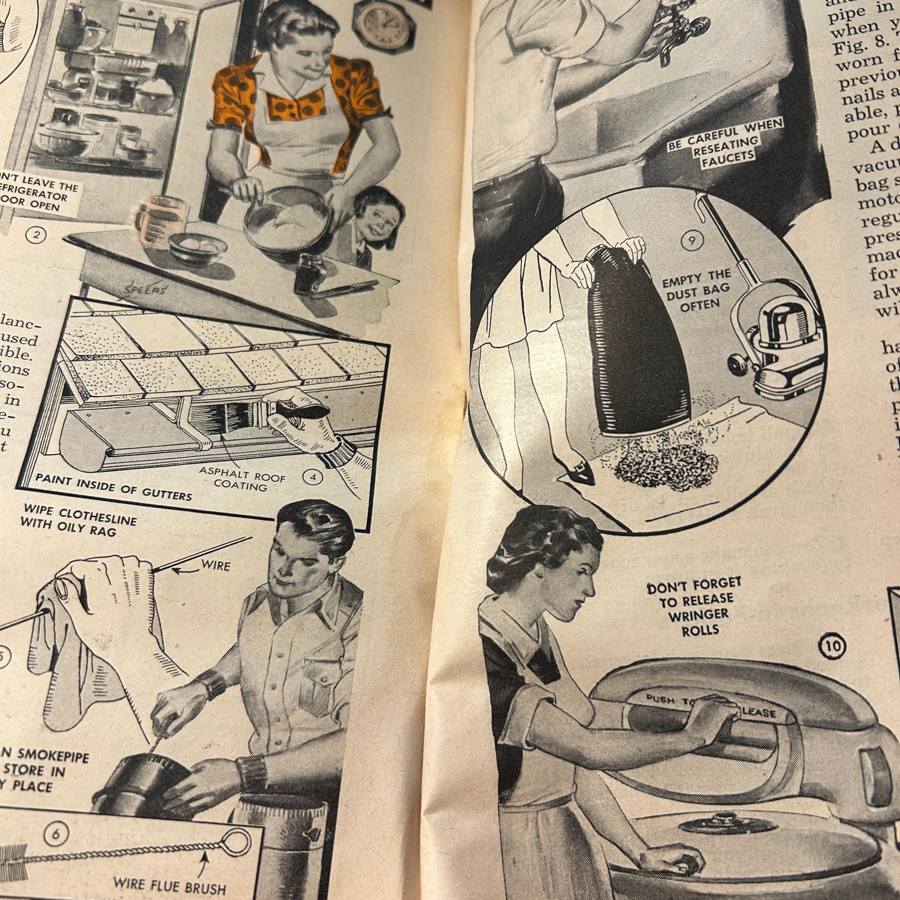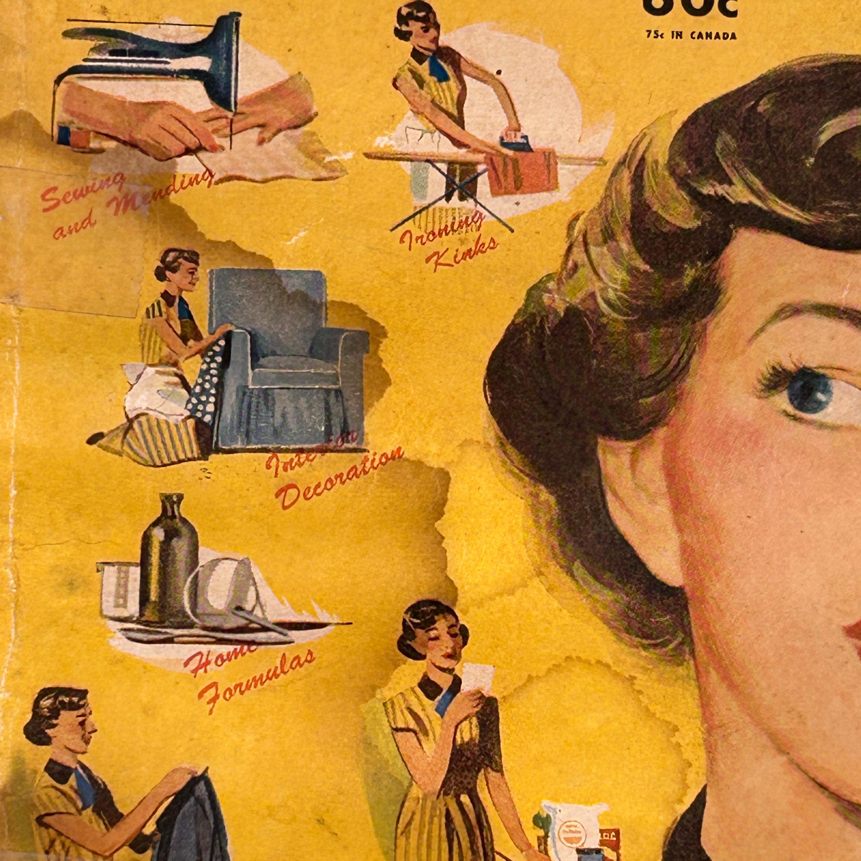 A fantastic cover with great illustrations. Magazine is in stained condition as you can see on the front Some, but not all, pages are stained on the inside. Great pieces for junk journaling or collages. Or just as a cool reminder of the life back in the 1940s.. All pages are intact and the binding is good with some tape holding it tight. Color and black and white illustrations throughout.