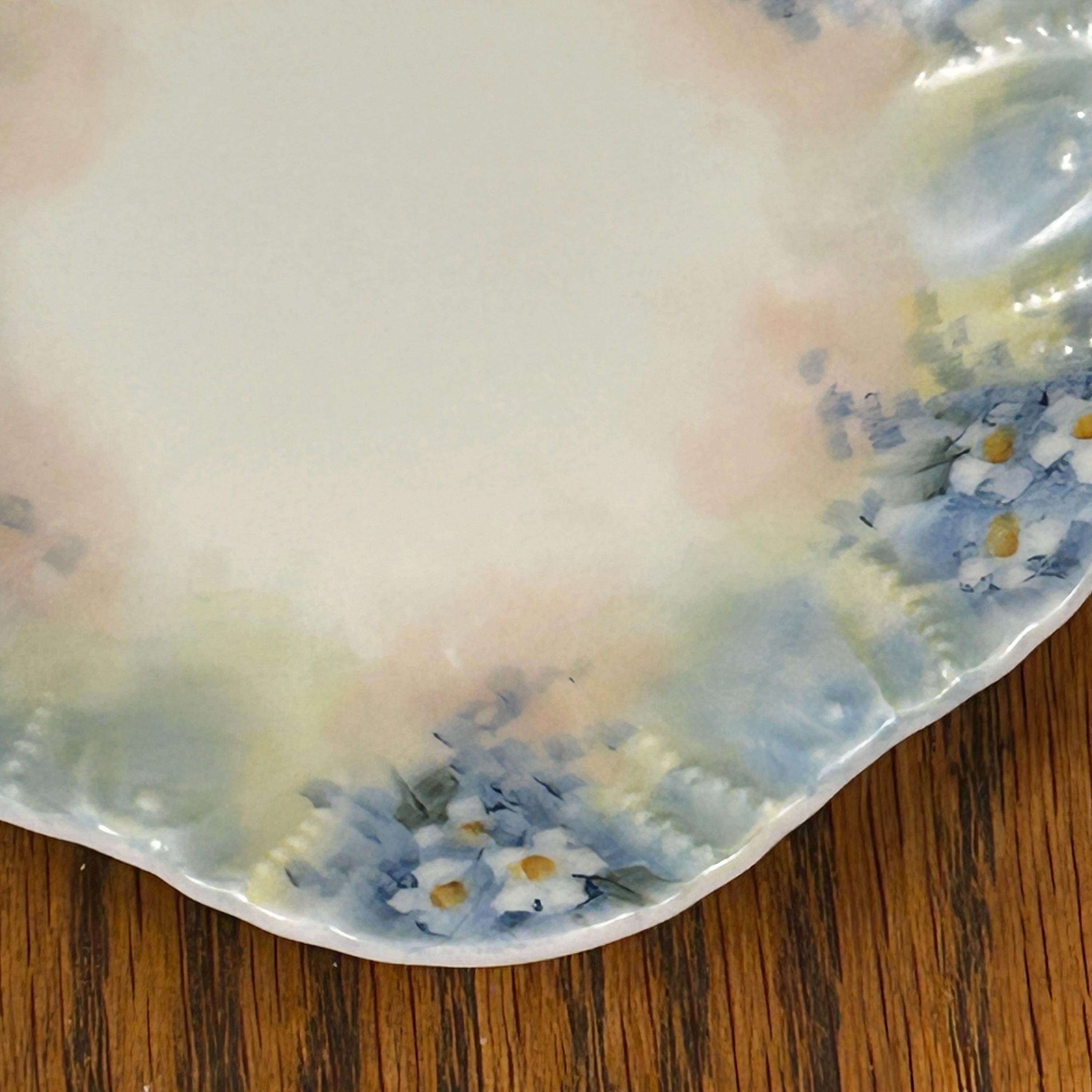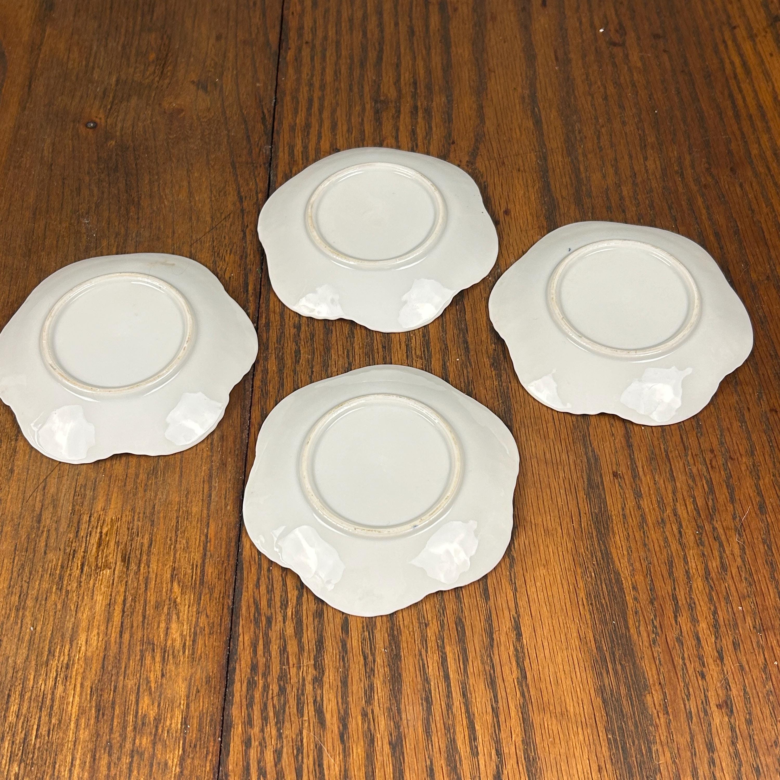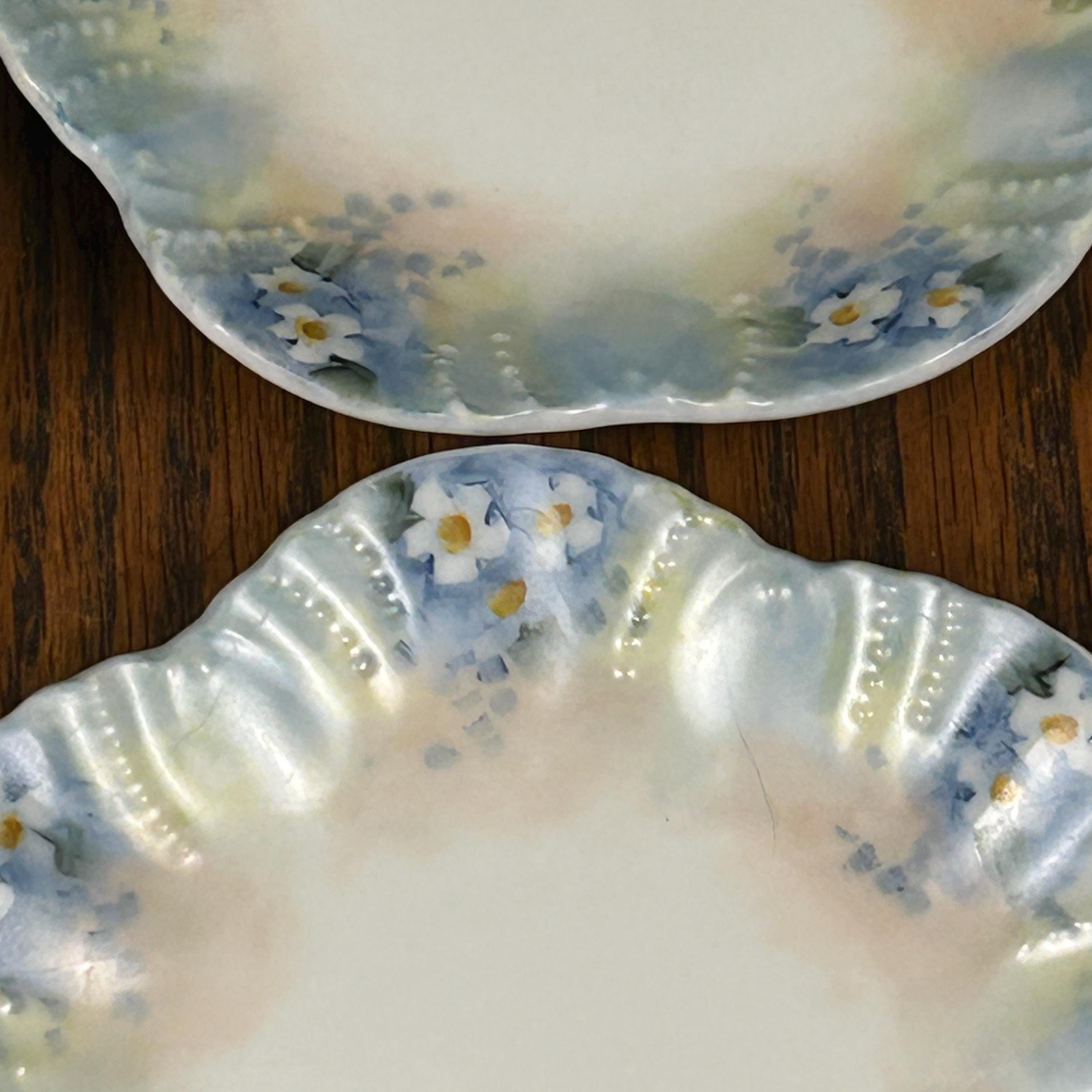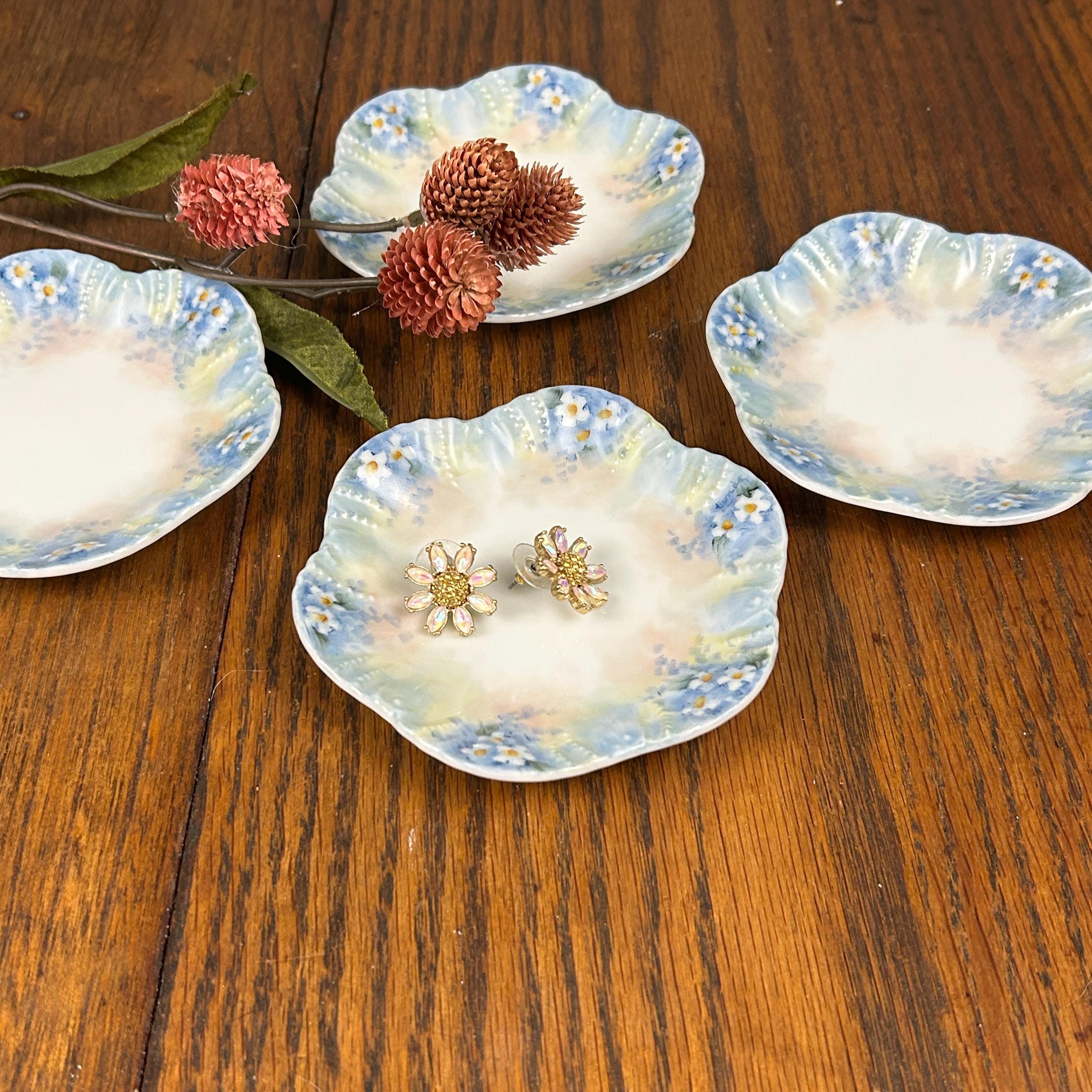 These beautiful little plates would be perfect for trinkets or jewelry. Delicately hand-painted with white and yellow daisies on a light blue background. Just a hint of peachy pink toward the middle of the plate. All four have beautifully scalloped edges with textured designs. Unmarked on the bottoms.