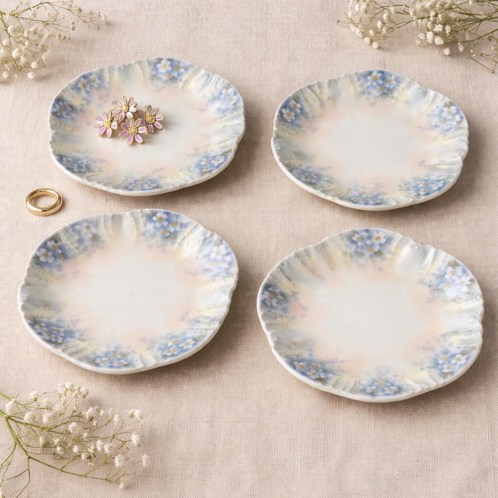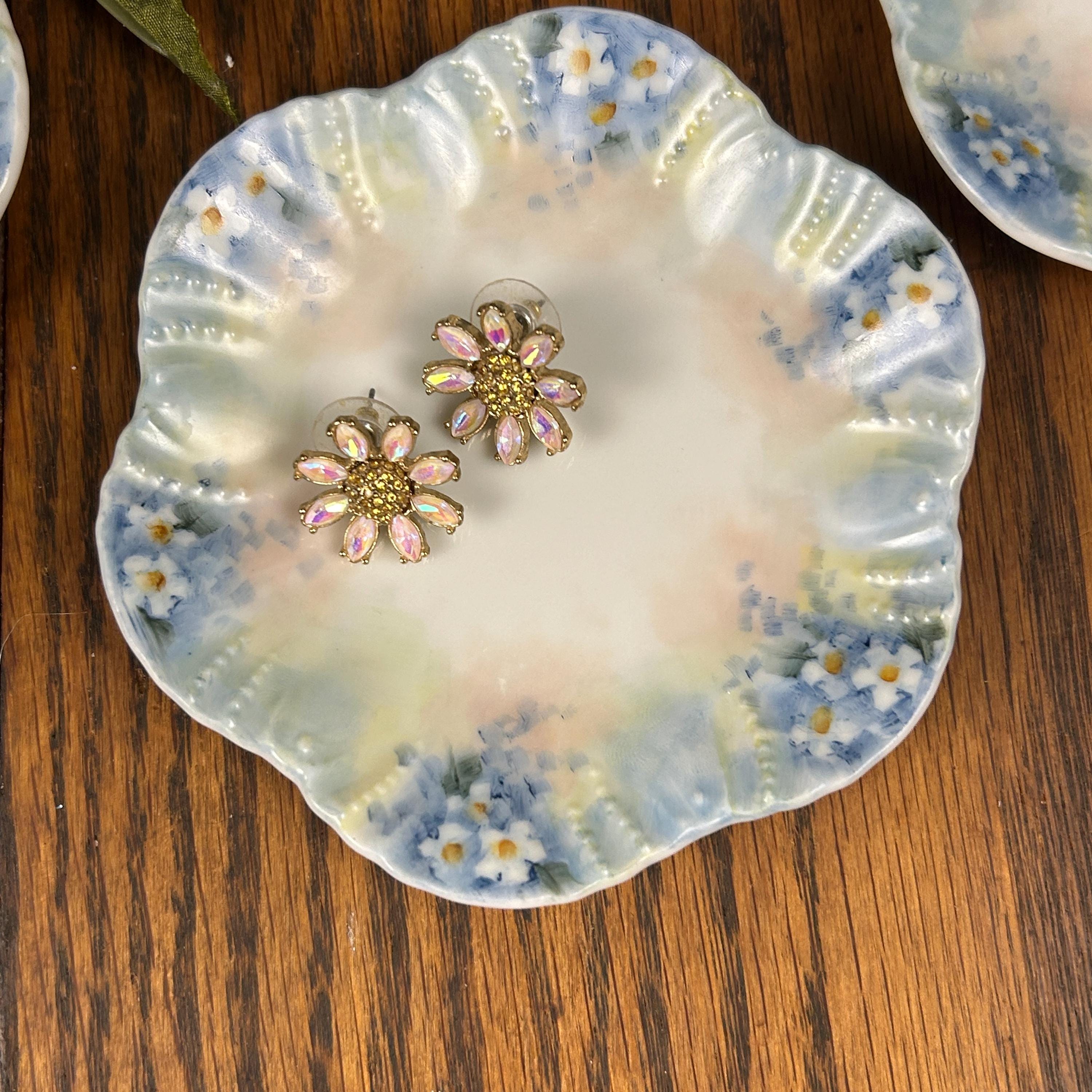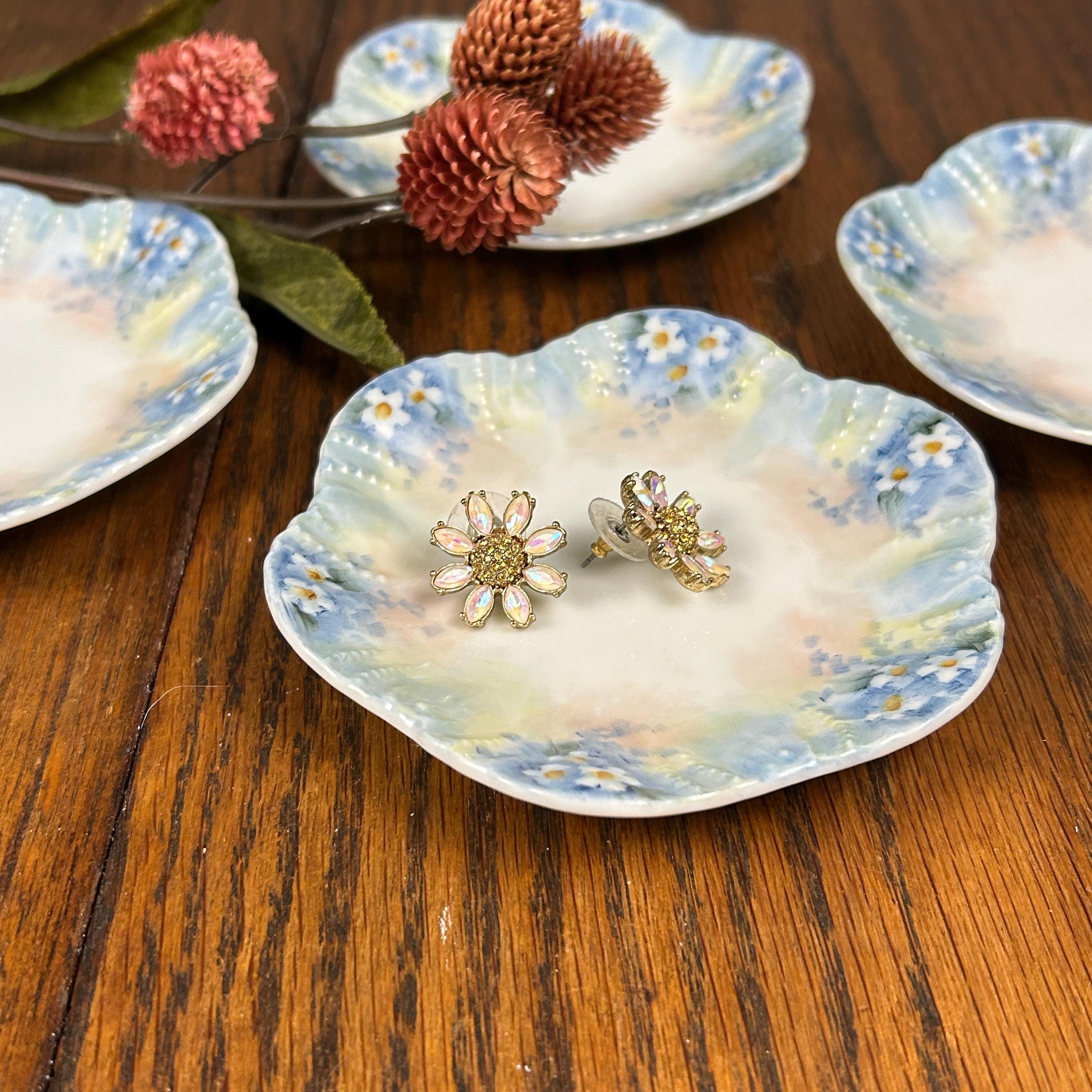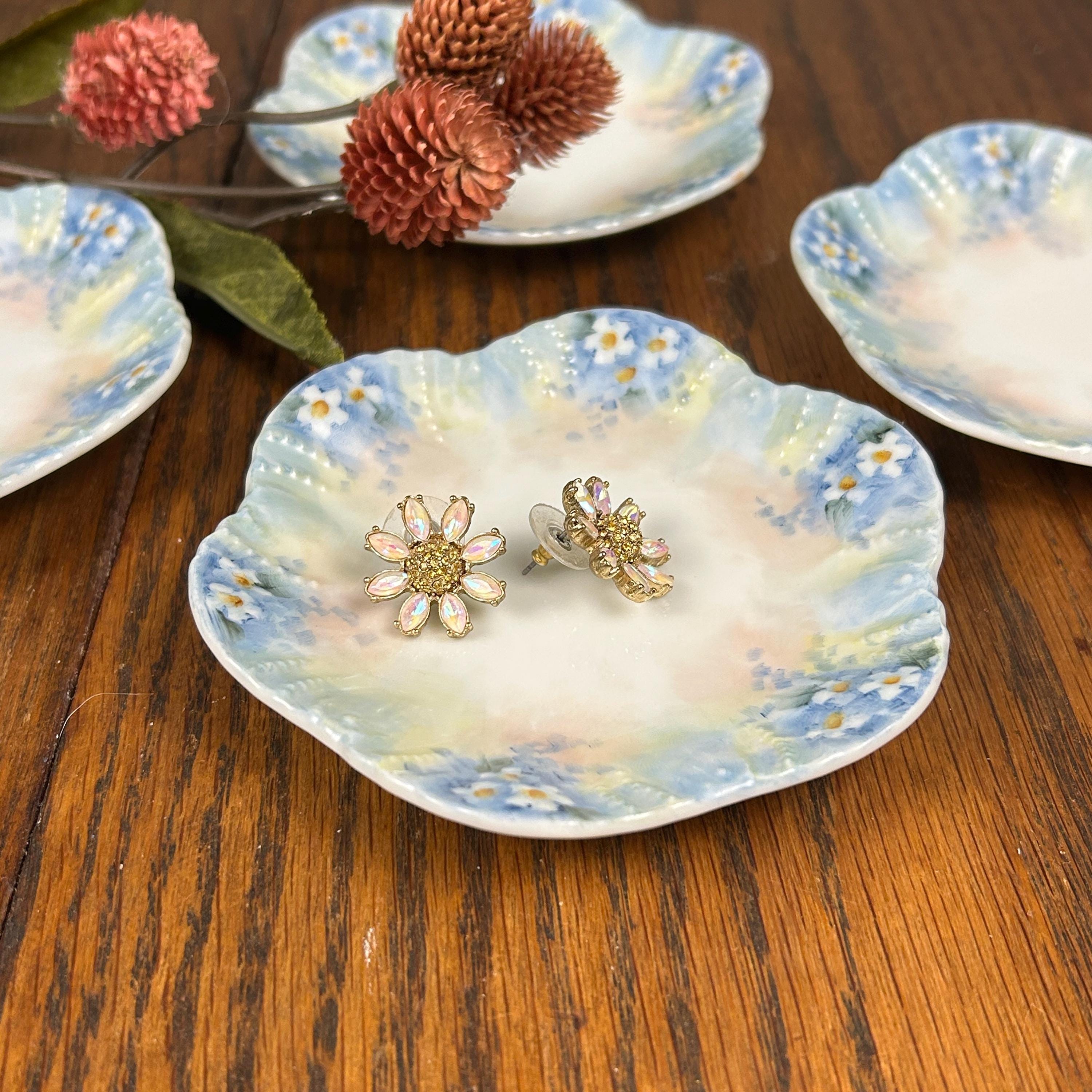 These beautiful little plates would be perfect for trinkets or jewelry. Delicately hand-painted with white and yellow daisies on a light blue background. Just a hint of peachy pink toward the middle of the plate. All four have beautifully scalloped edges with textured designs. Unmarked on the bottoms.