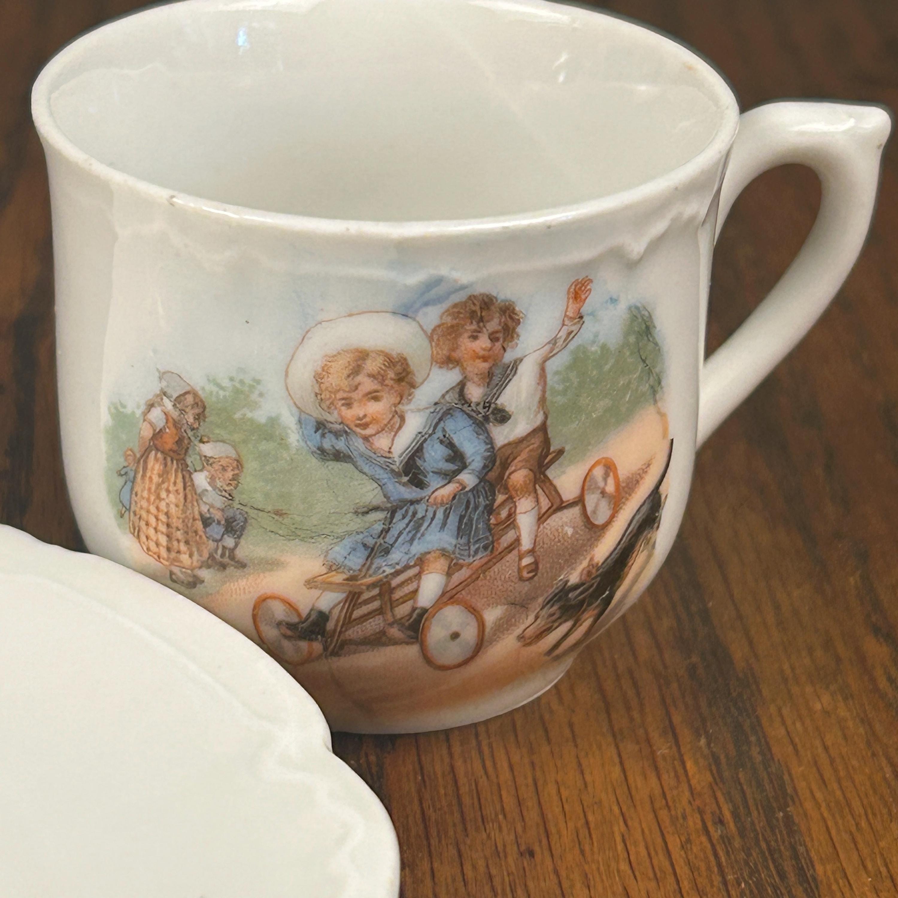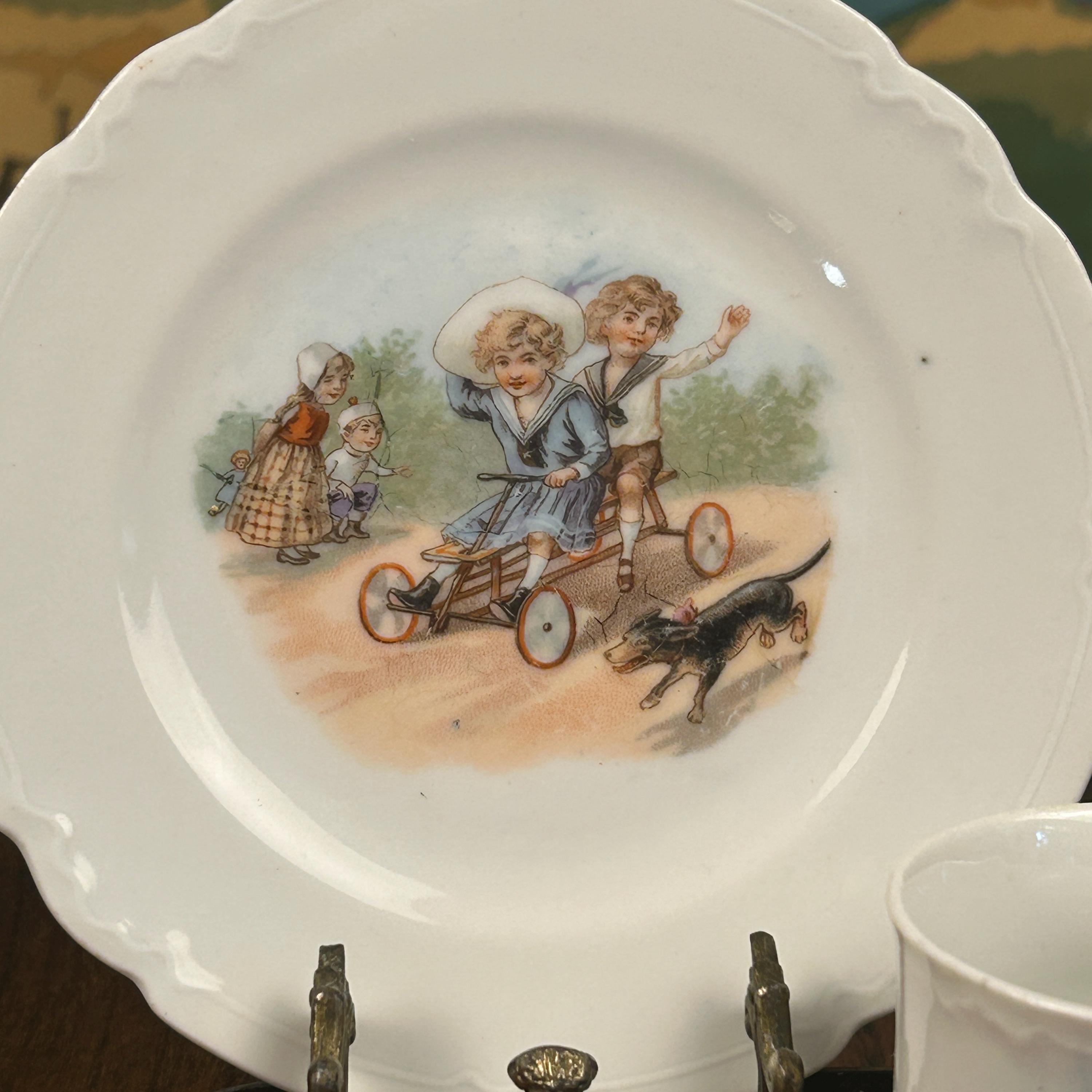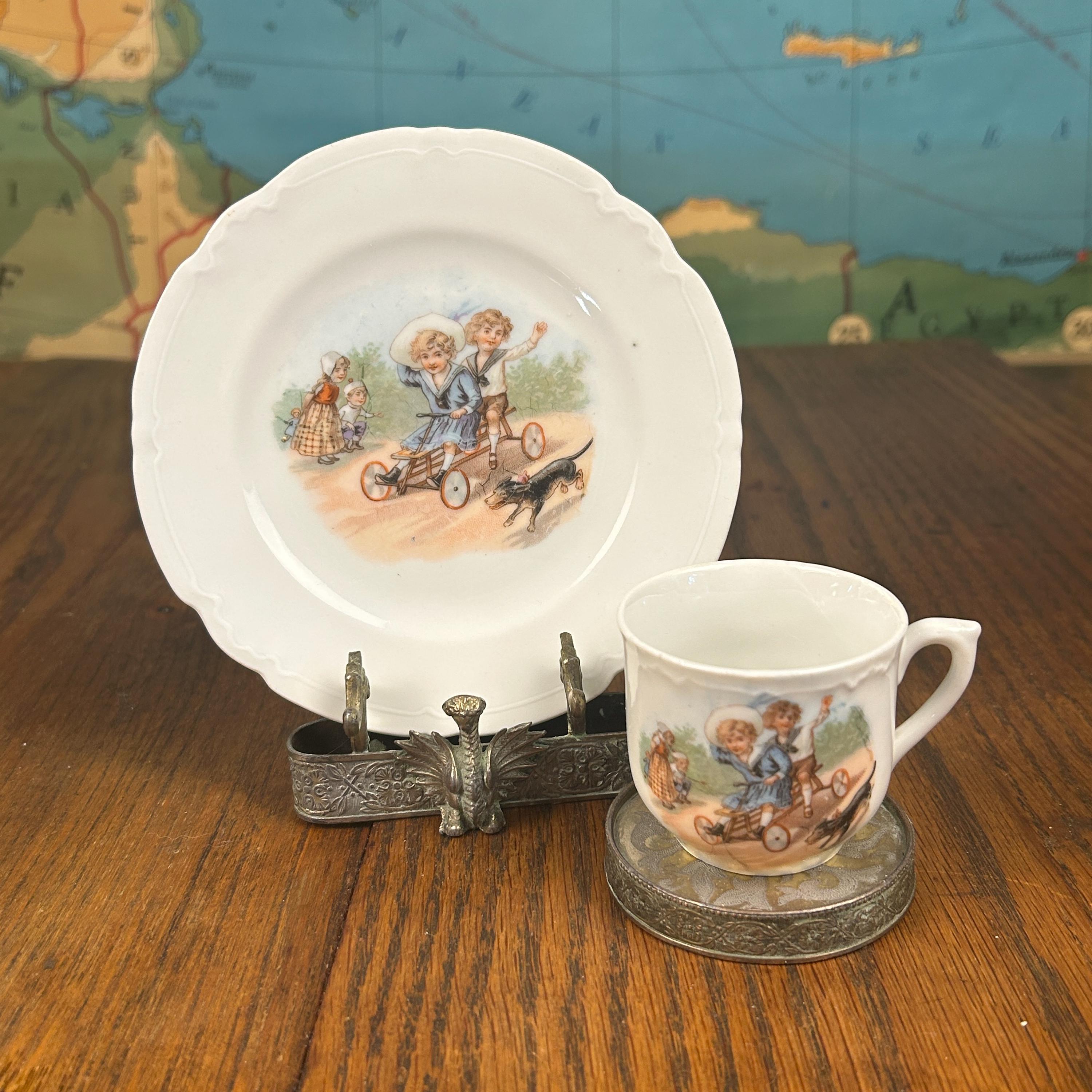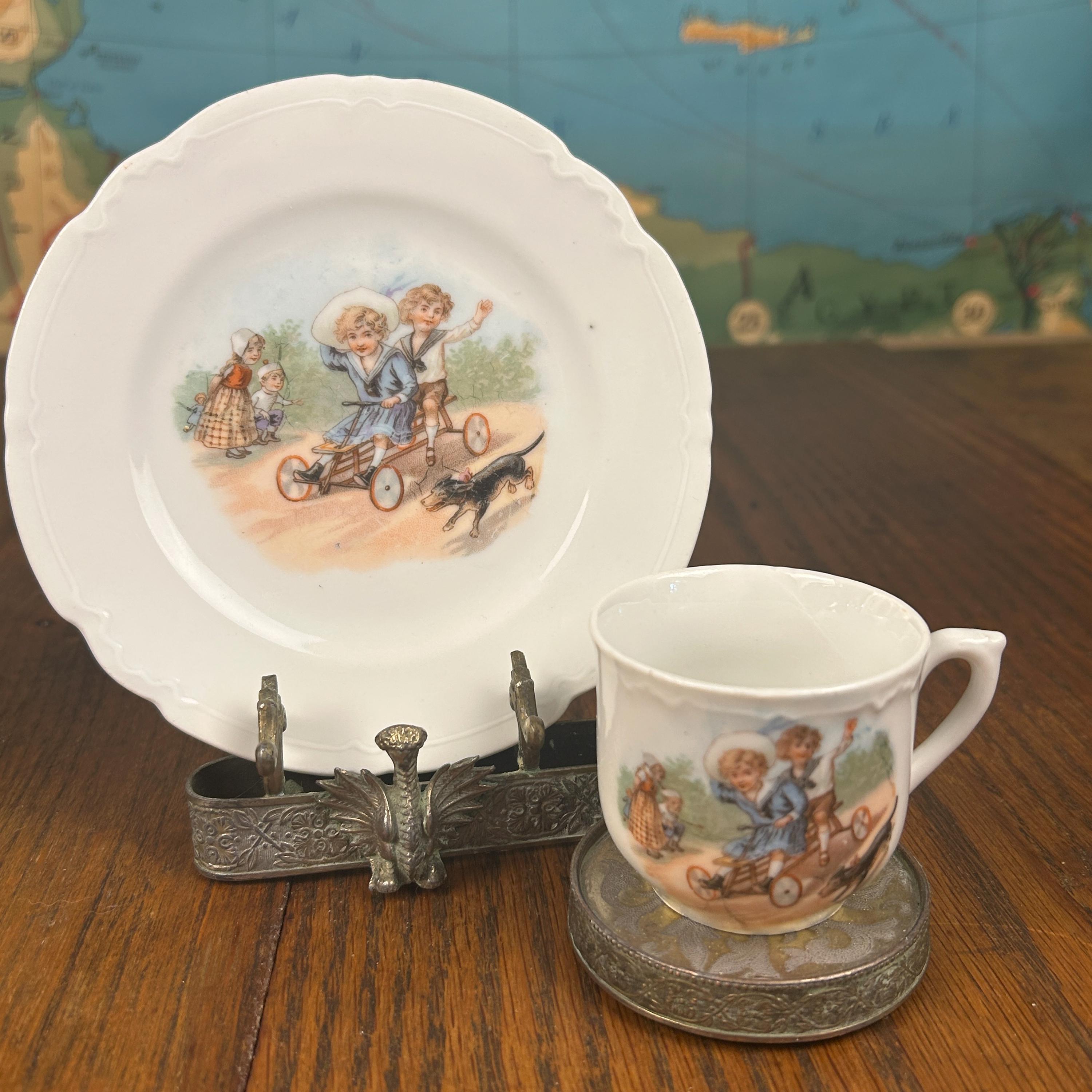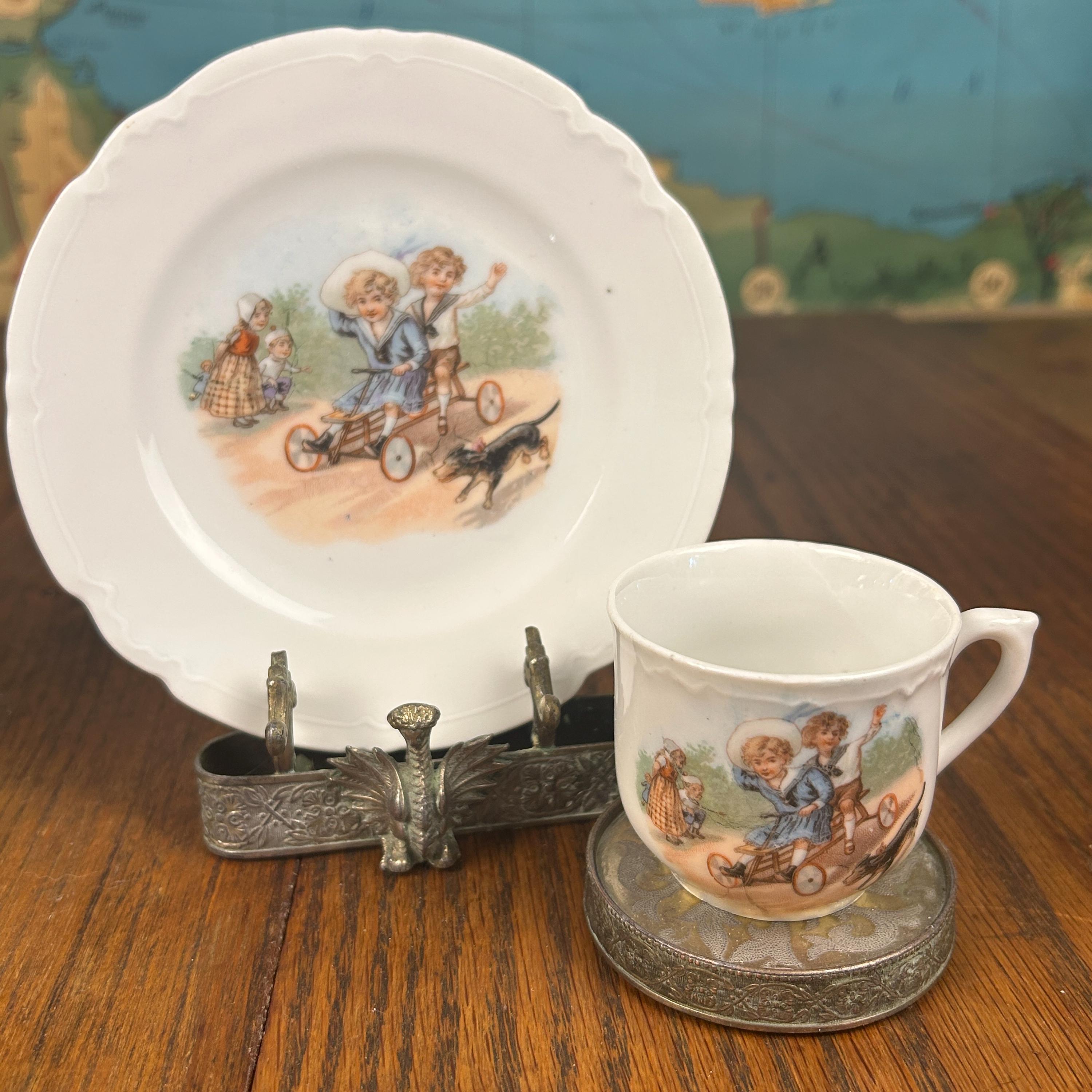 ANTIQUE Victorian “Germany” Children On a Scooter" Cup and Matching Plate. 1900’s. Marked Germany.