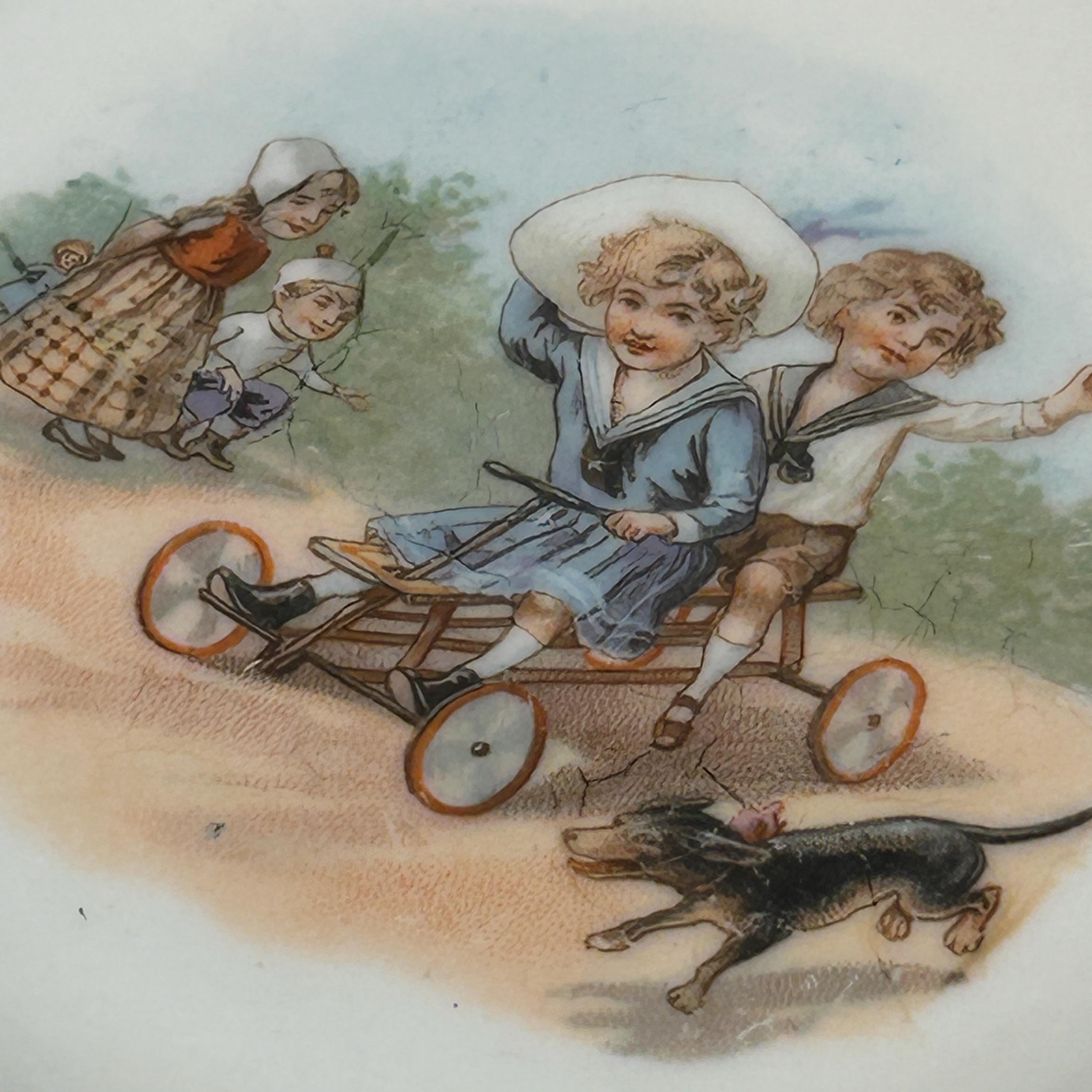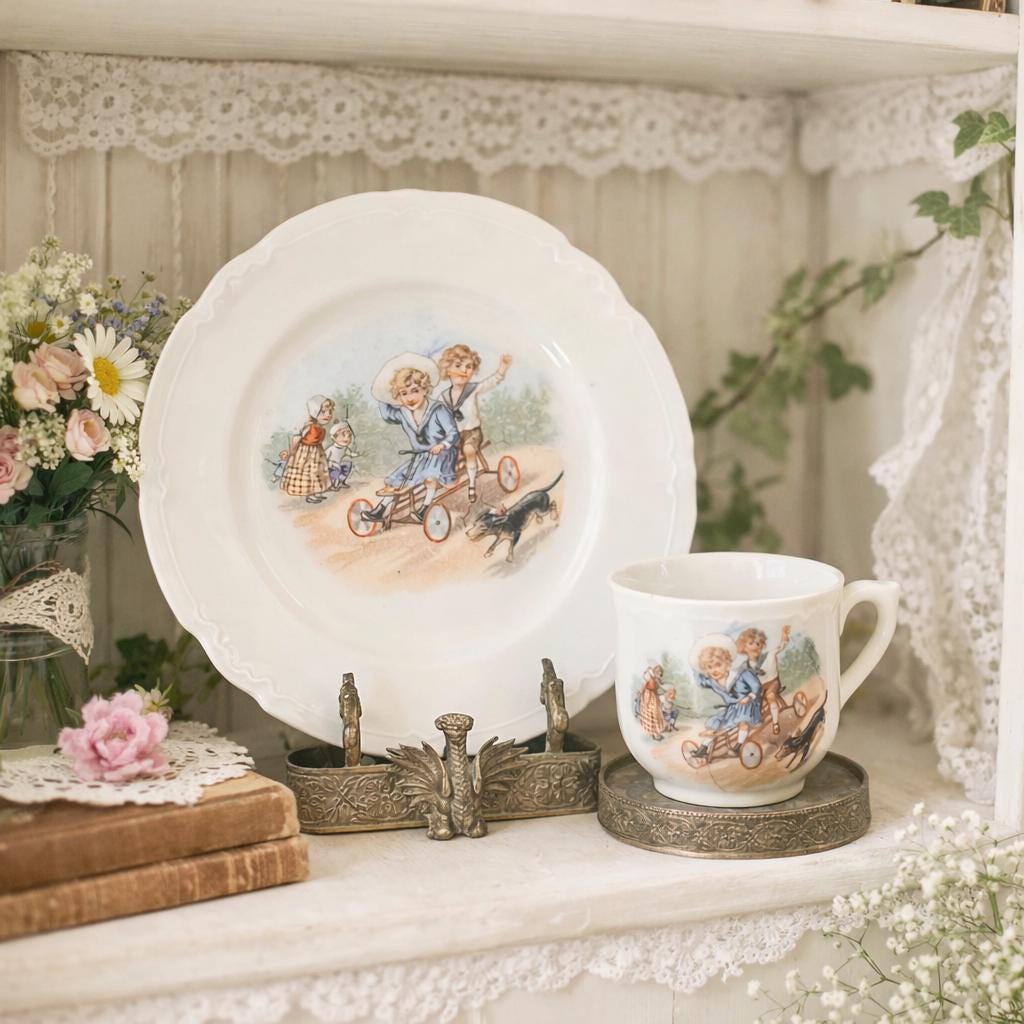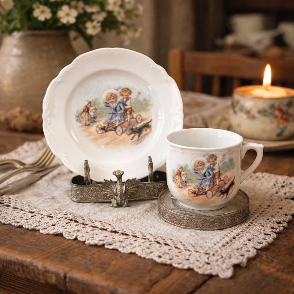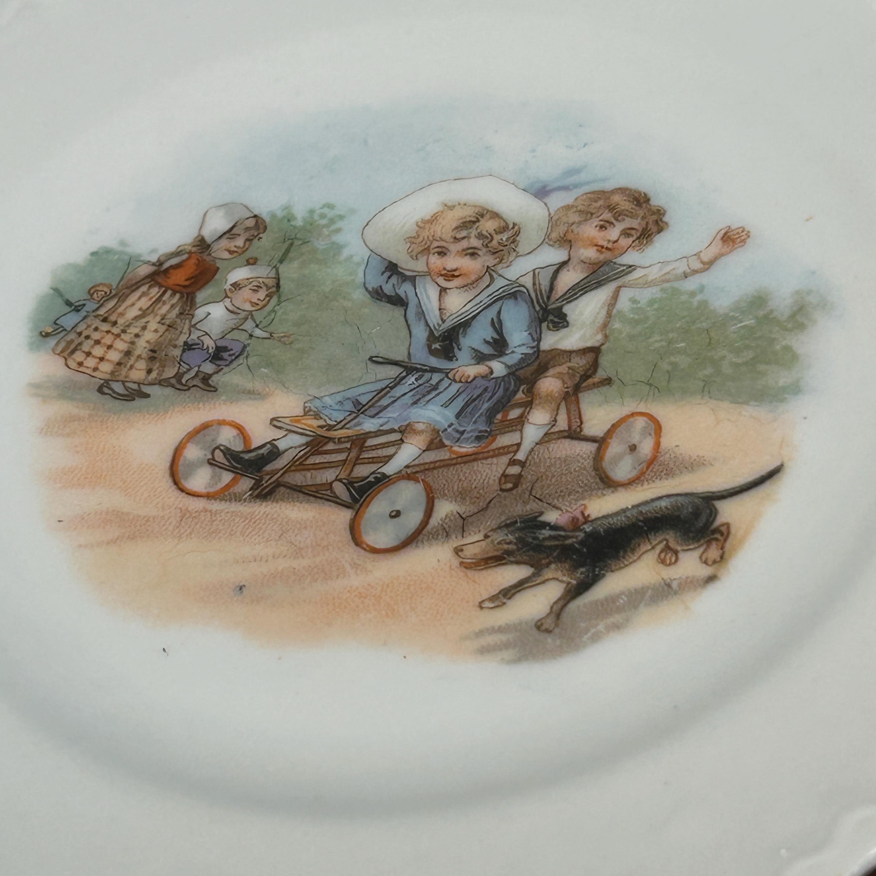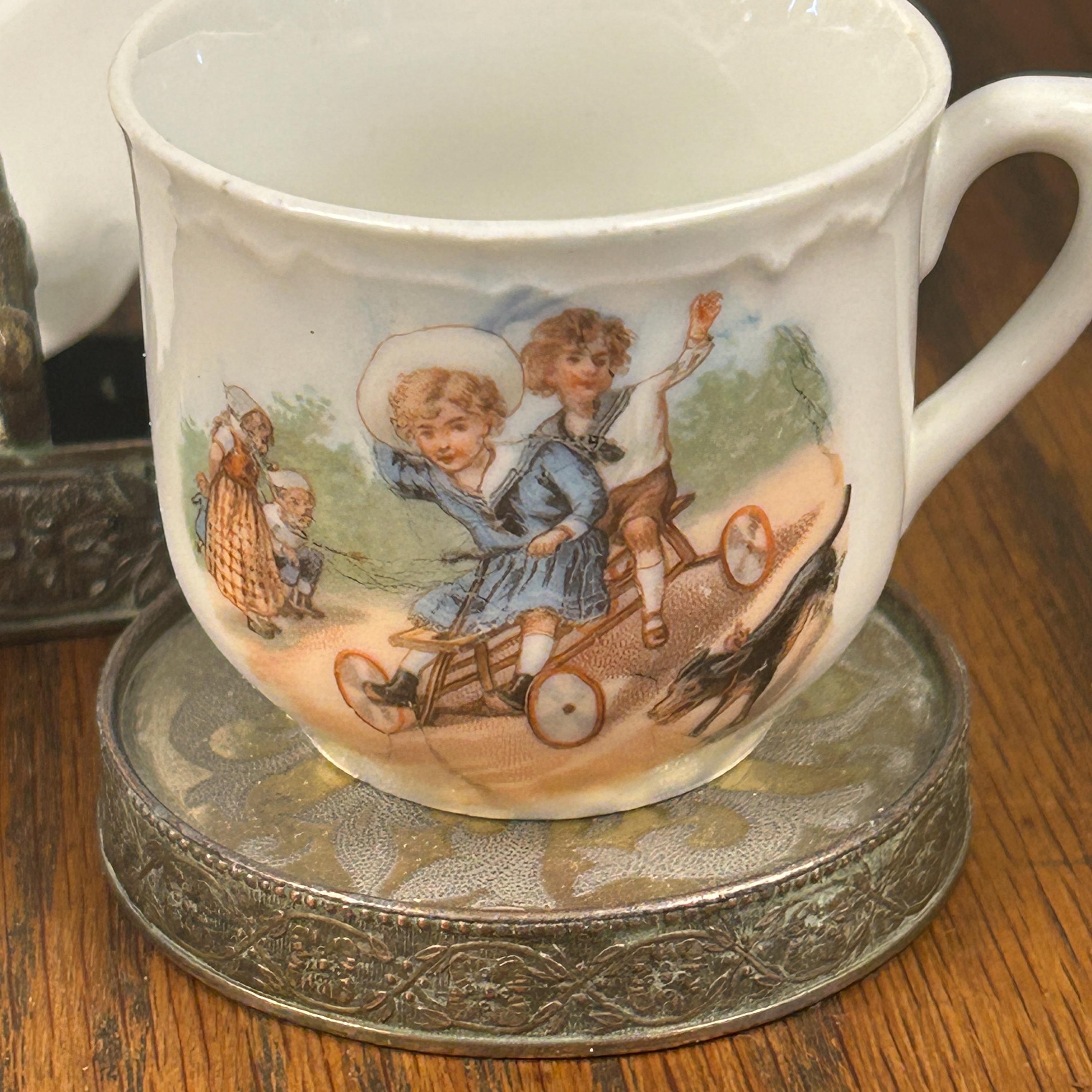 ANTIQUE Victorian “Germany” Children On a Scooter" Cup and Matching Plate. 1900’s. Marked Germany.