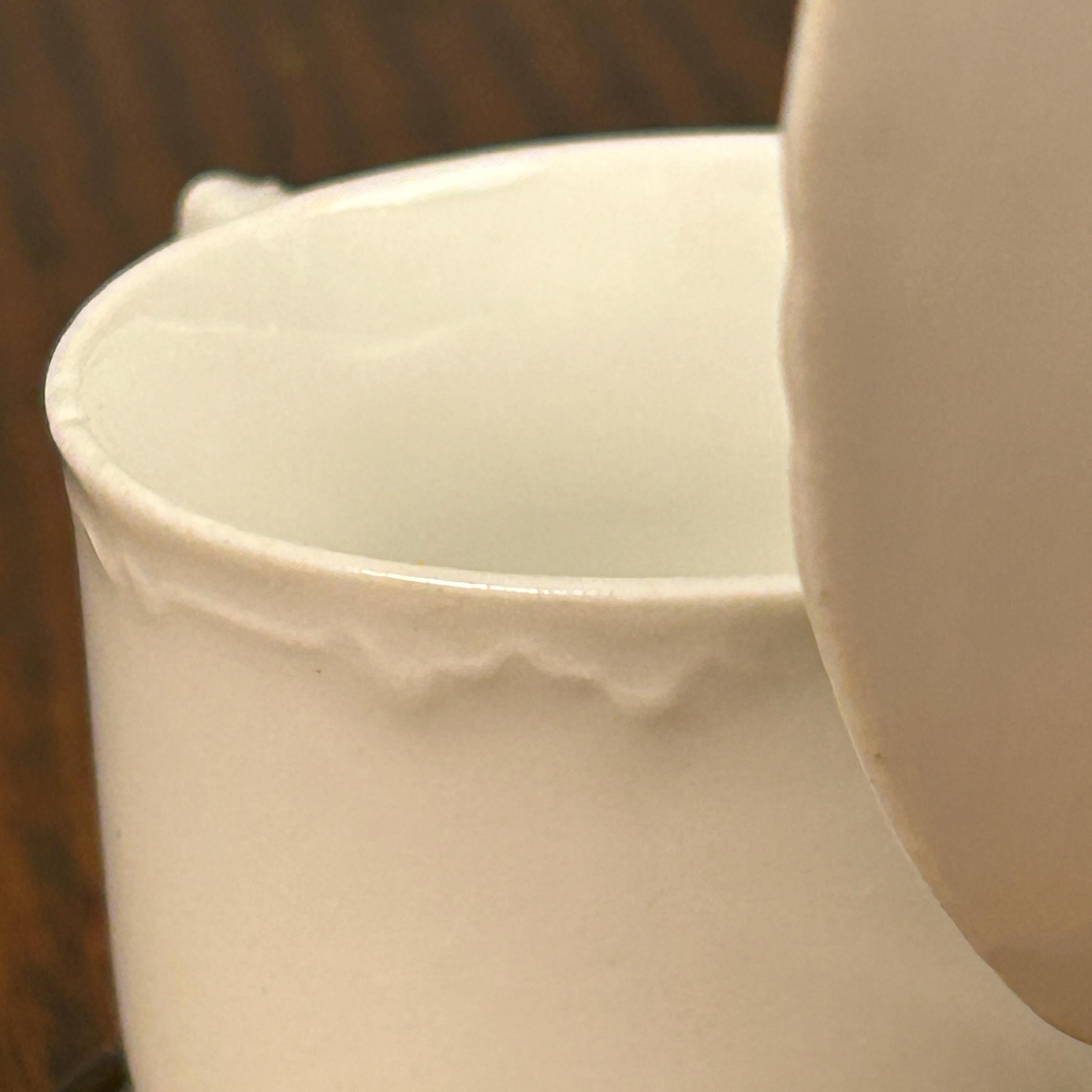 Baby Cup made of porcelain. Ribbon edges and fancy handle. Cup measures 2" in diameter and 2" tall.