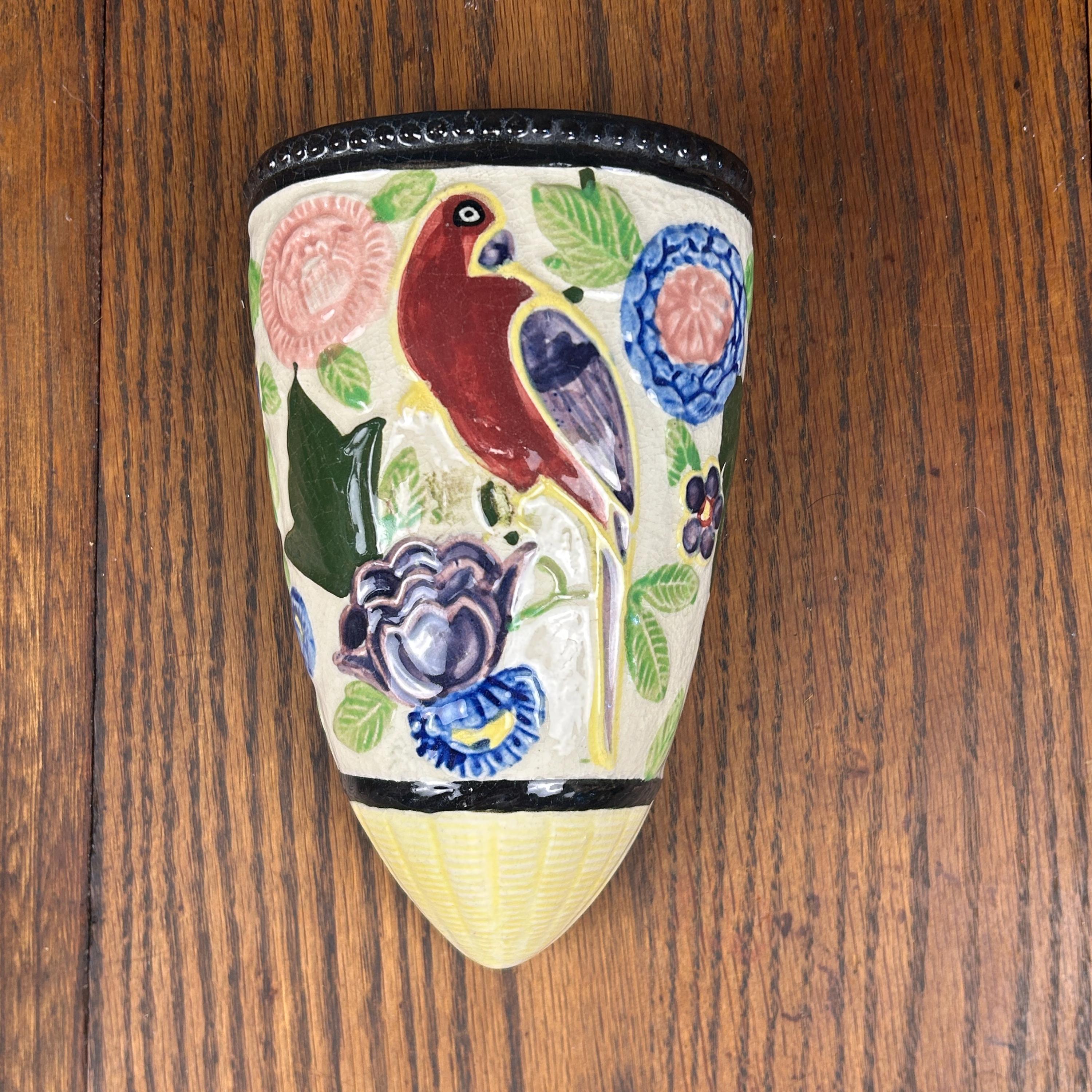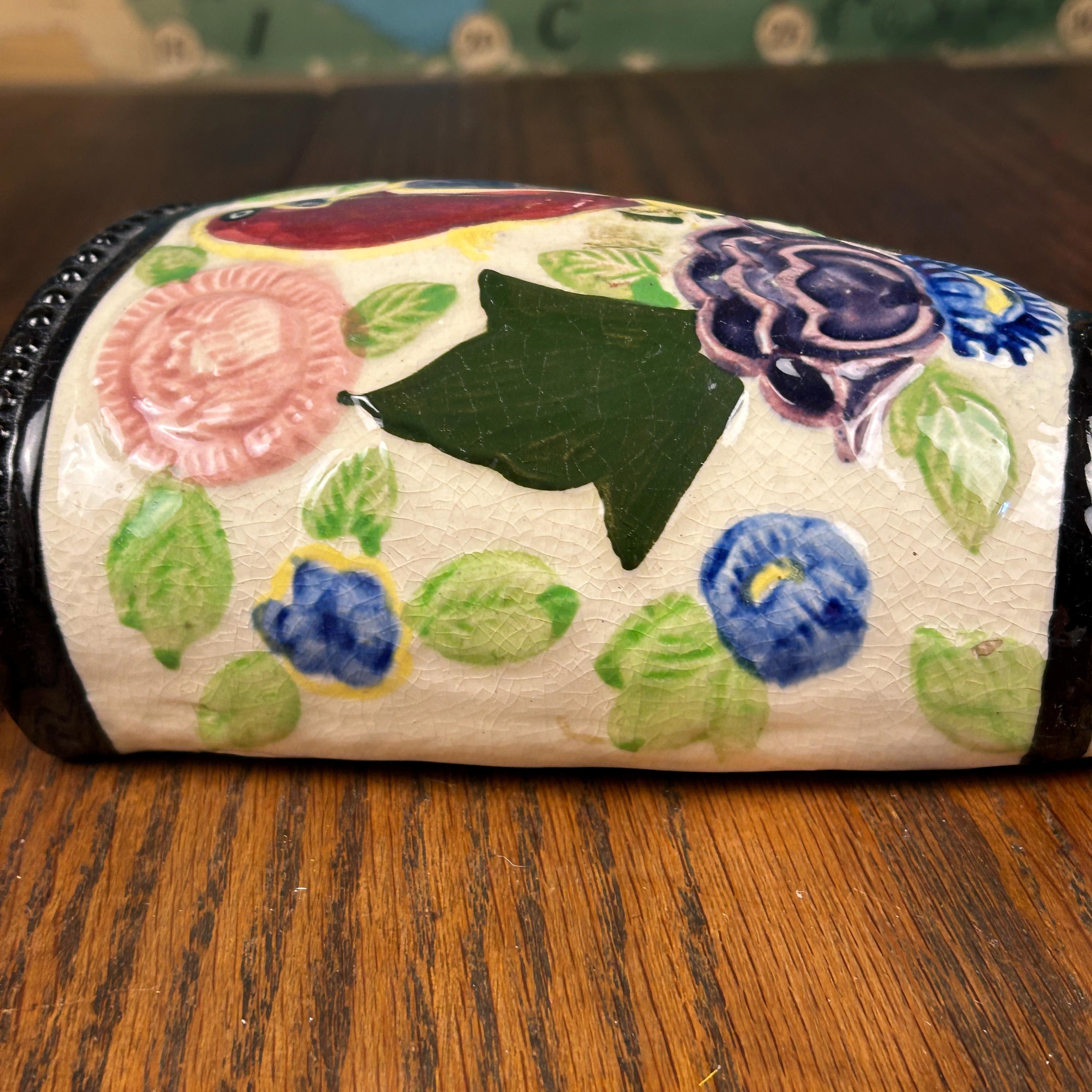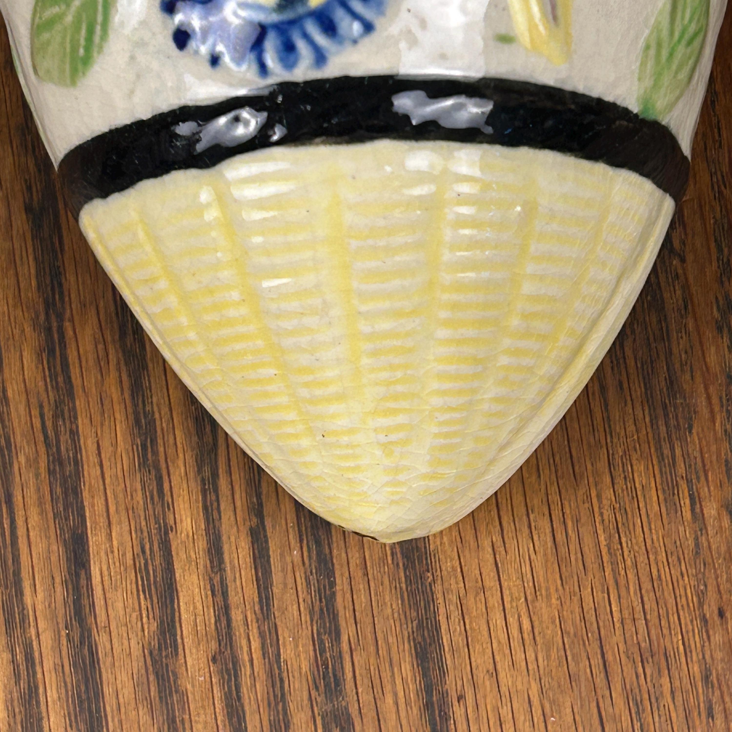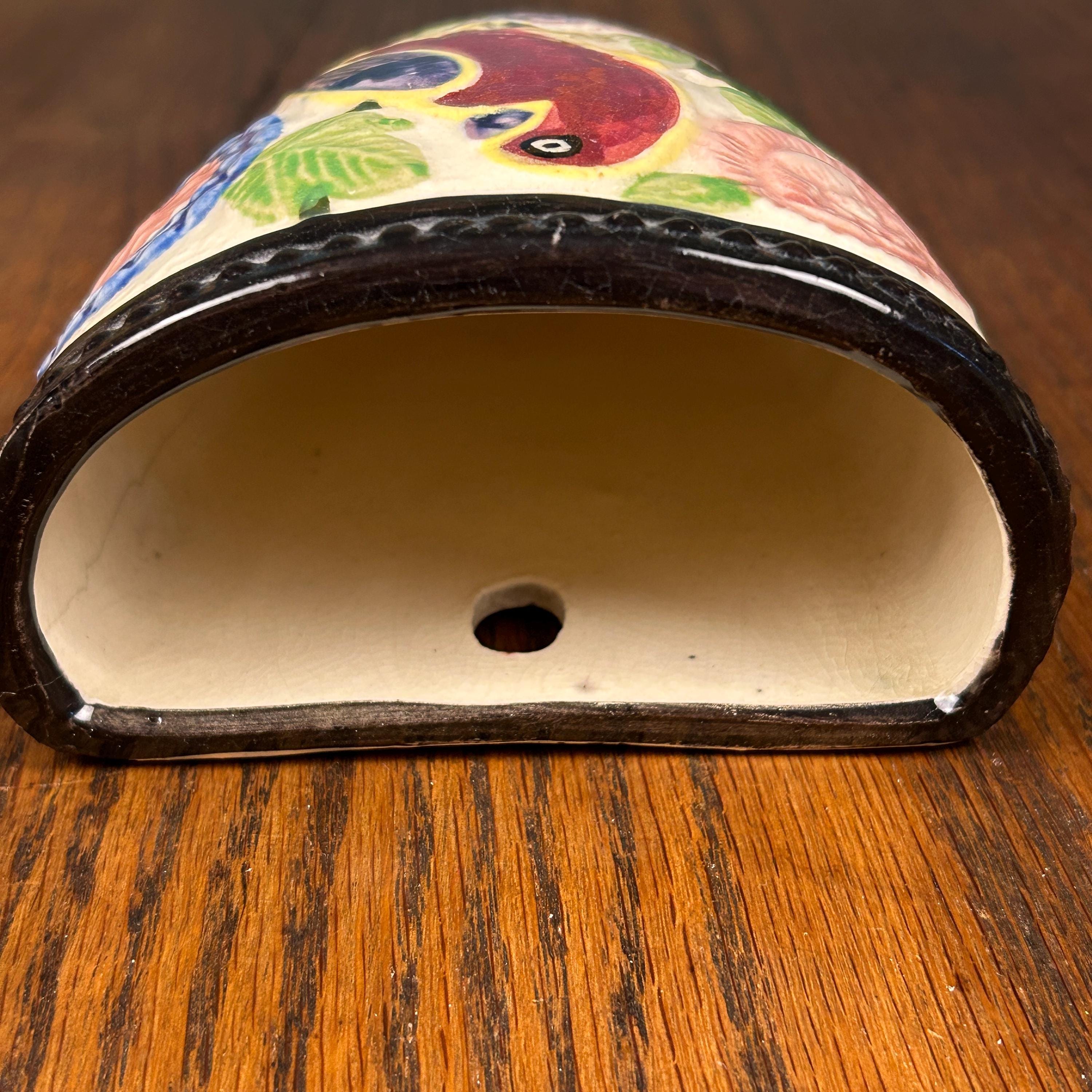 Lovely ceramic wall pocket made in Japan. The background is off-white with a black decorative rim at top and black stripe around bottom third. Beautiful colors of pinks, greens, blues, purples, and reds. Wonderful light crazing over entire piece. No cracks or chips to be seen. Small smudge on very bottom. Please see all photos. Hole in back for hanging.