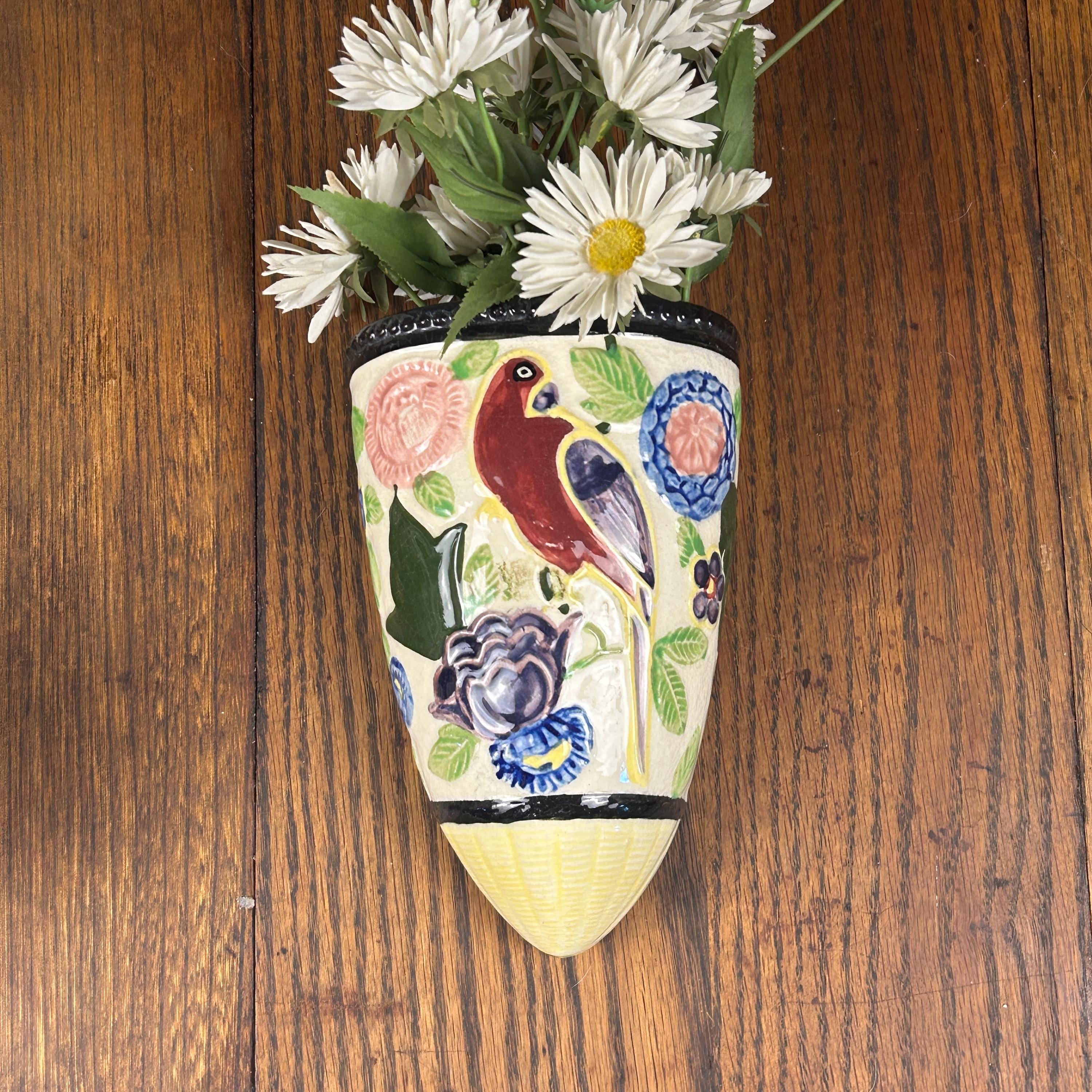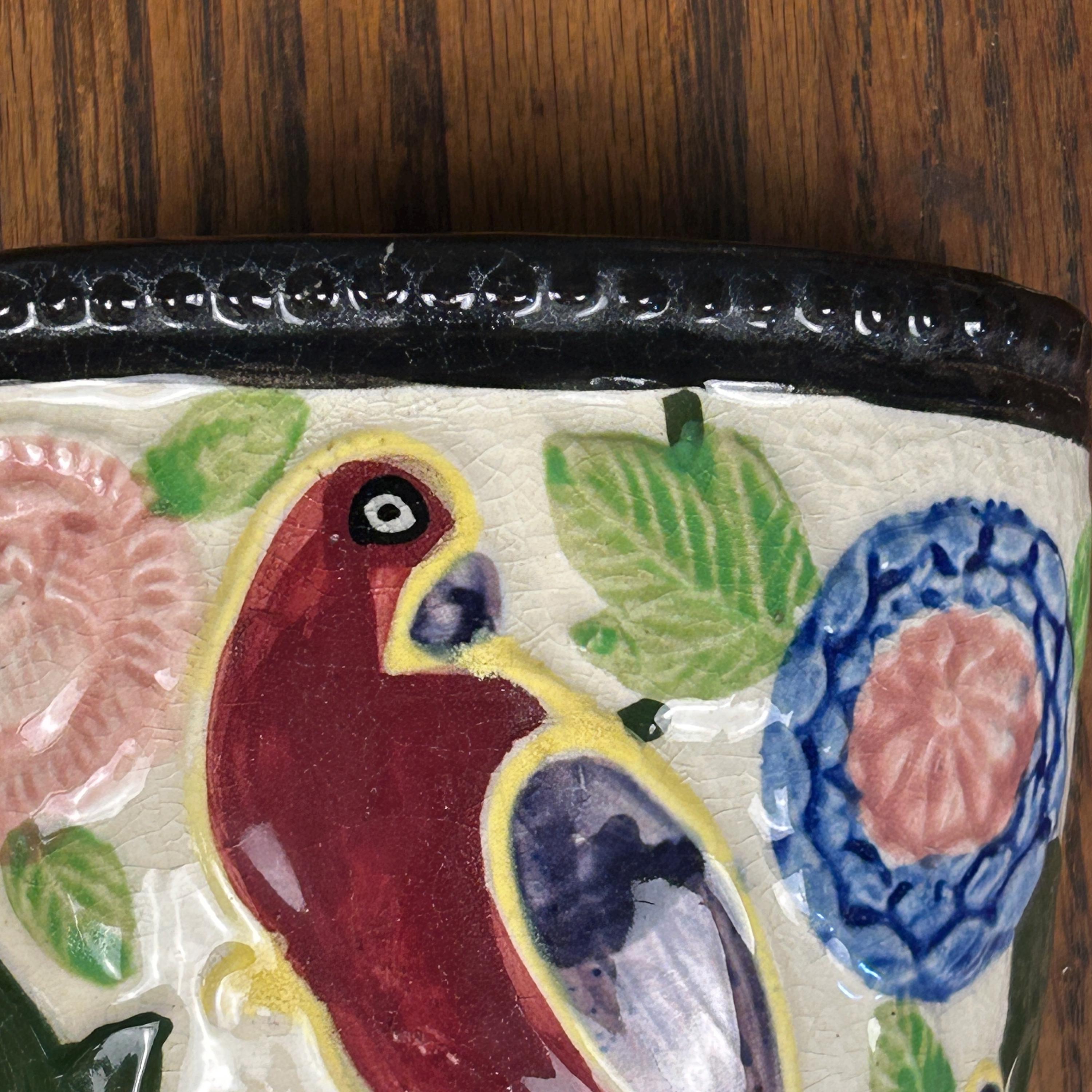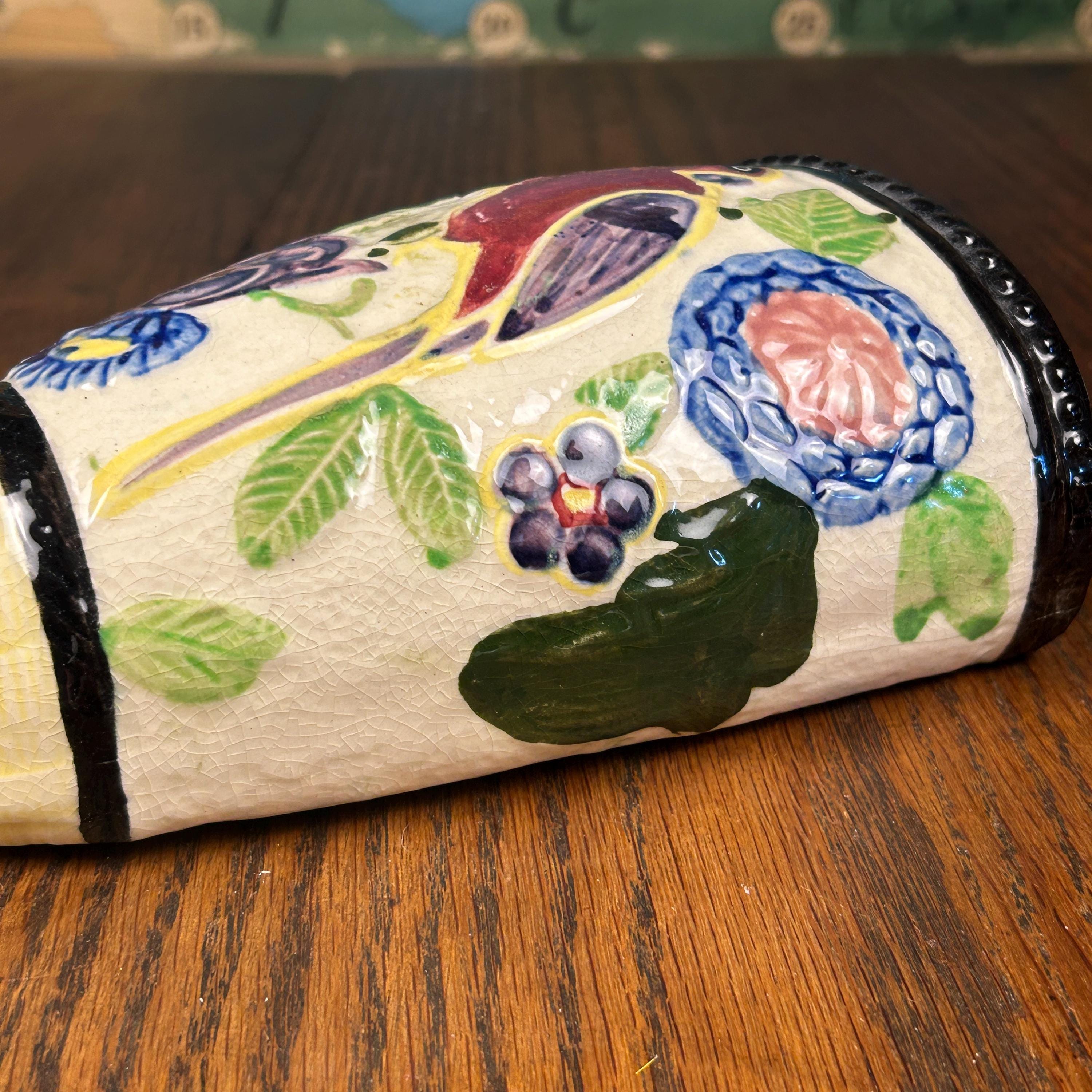 Lovely ceramic wall pocket made in Japan. The background is off-white with a black decorative rim at top and black stripe around bottom third. Beautiful colors of pinks, greens, blues, purples, and reds. Wonderful light crazing over entire piece. No cracks or chips to be seen. Small smudge on very bottom. Please see all photos. Hole in back for hanging.