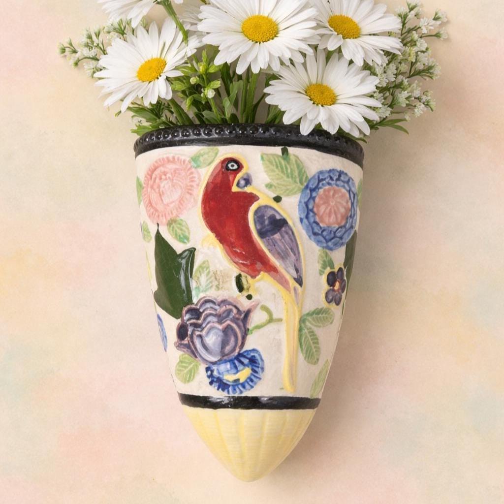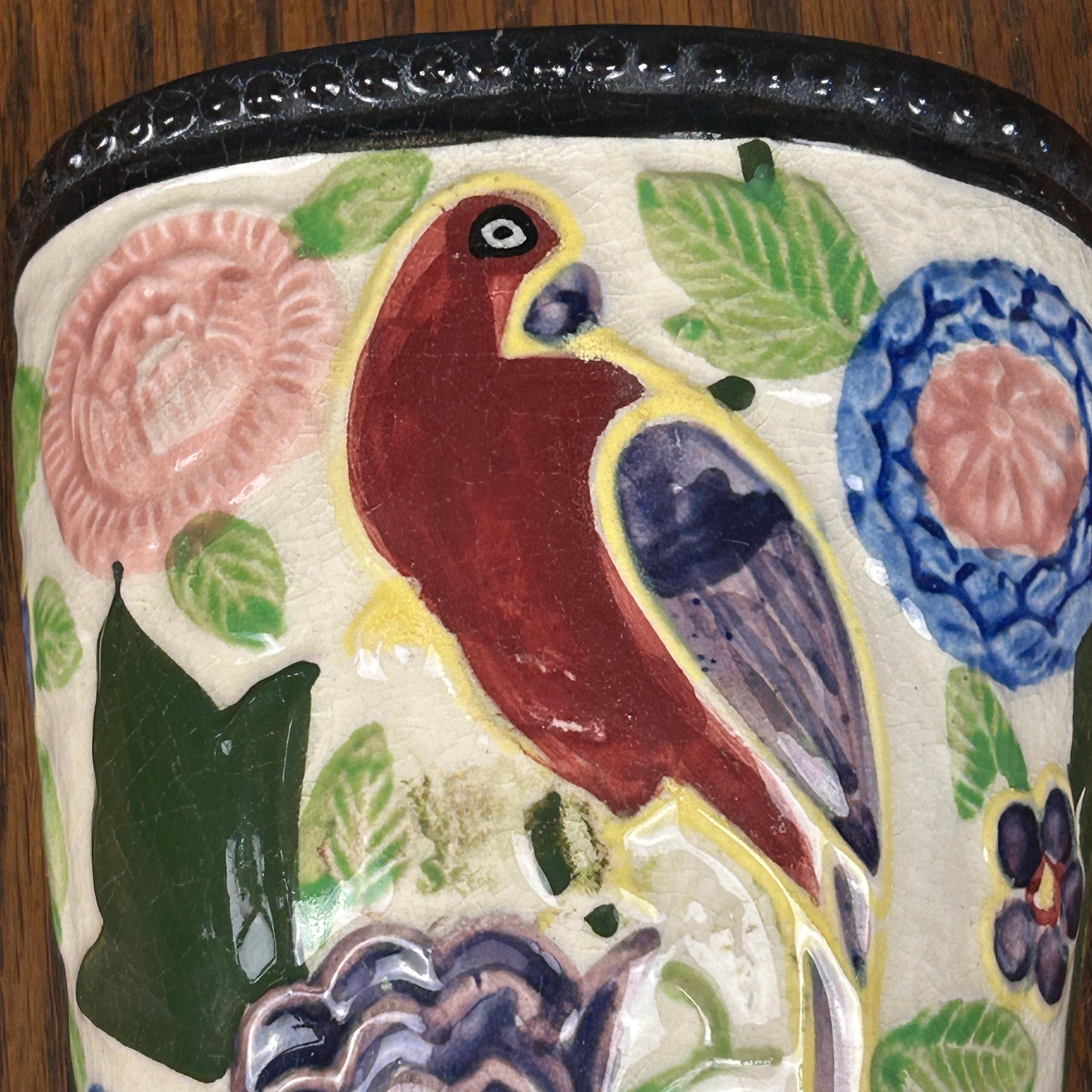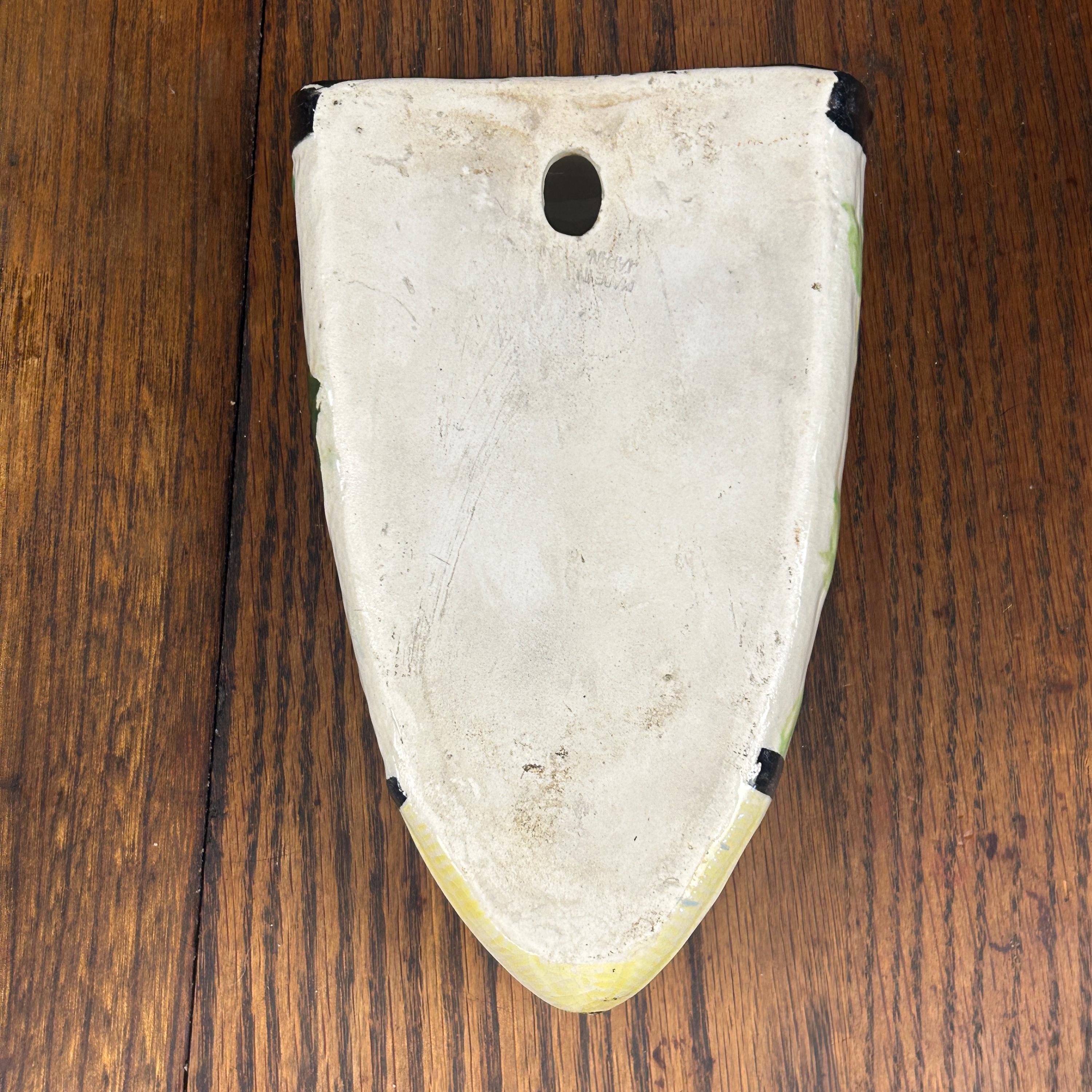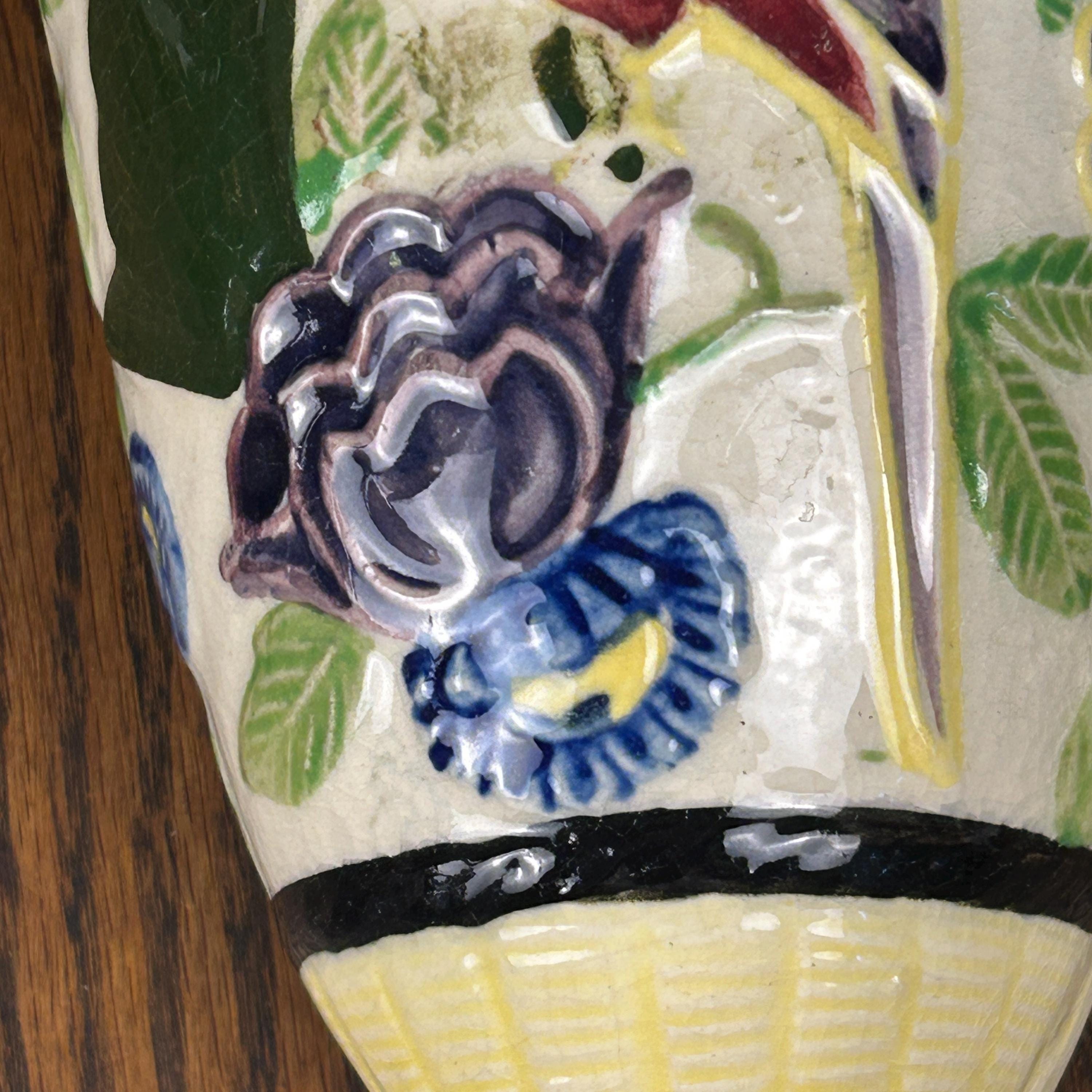 Lovely ceramic wall pocket made in Japan. The background is off-white with a black decorative rim at top and black stripe around bottom third. Beautiful colors of pinks, greens, blues, purples, and reds. Wonderful light crazing over entire piece. No cracks or chips to be seen. Small smudge on very bottom. Please see all photos. Hole in back for hanging.