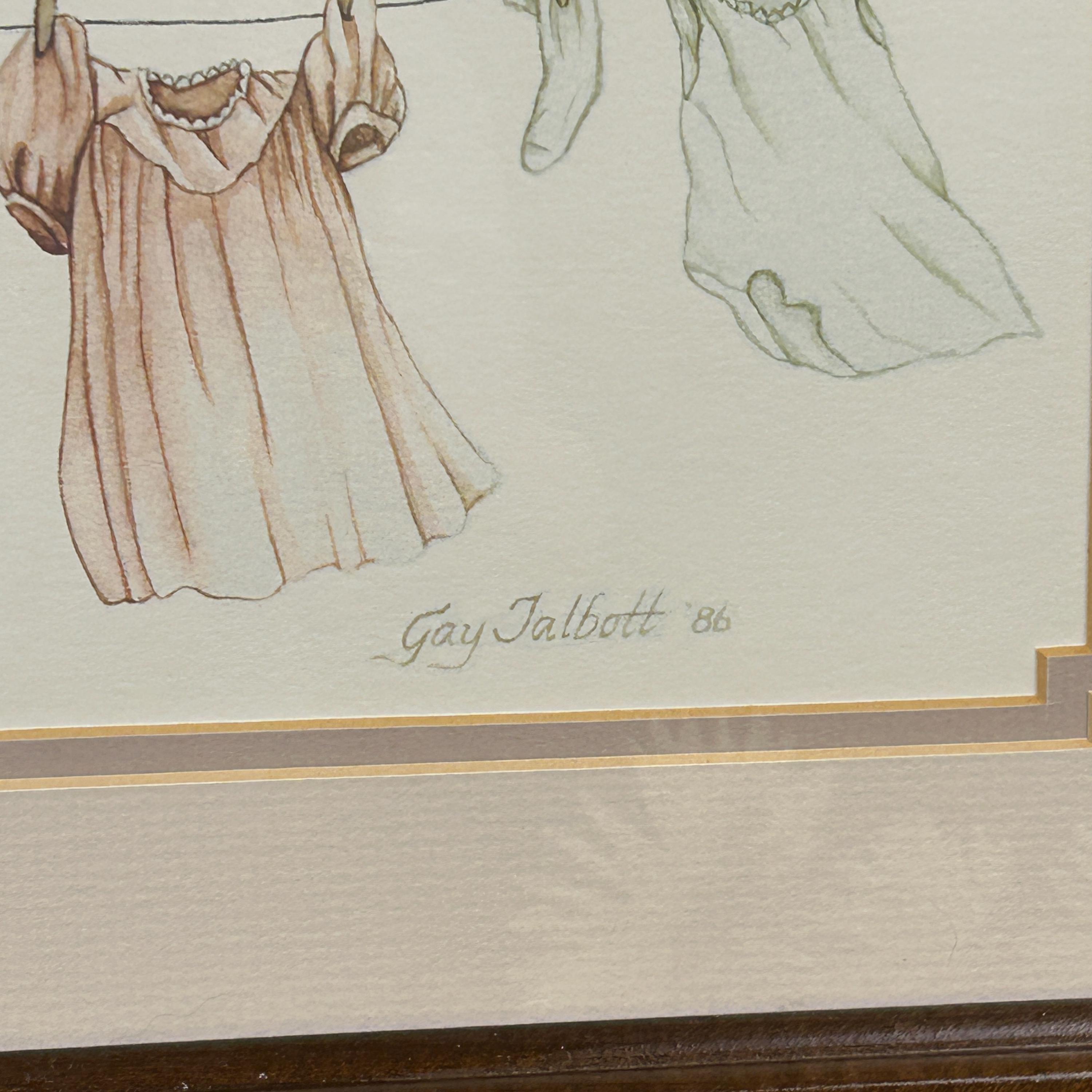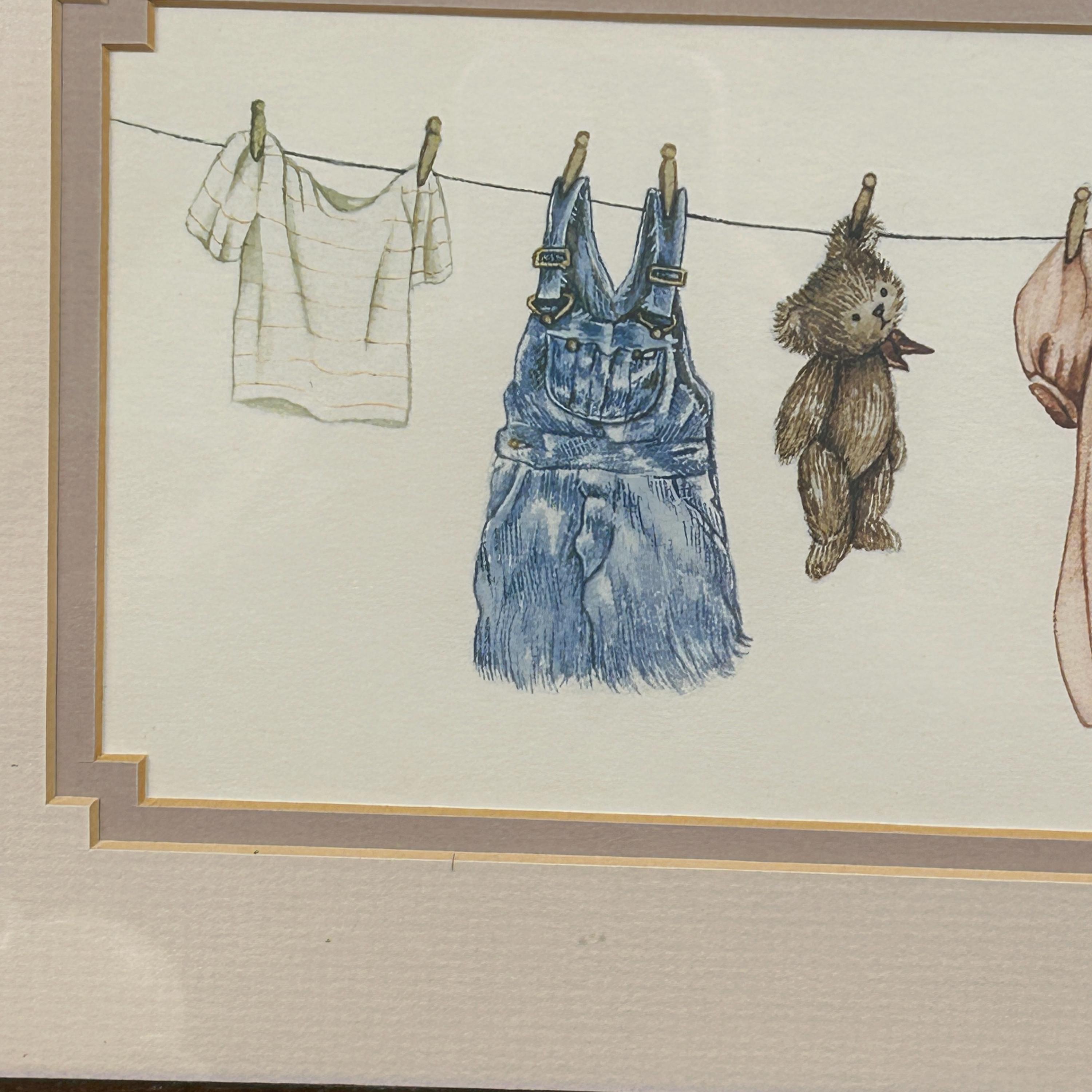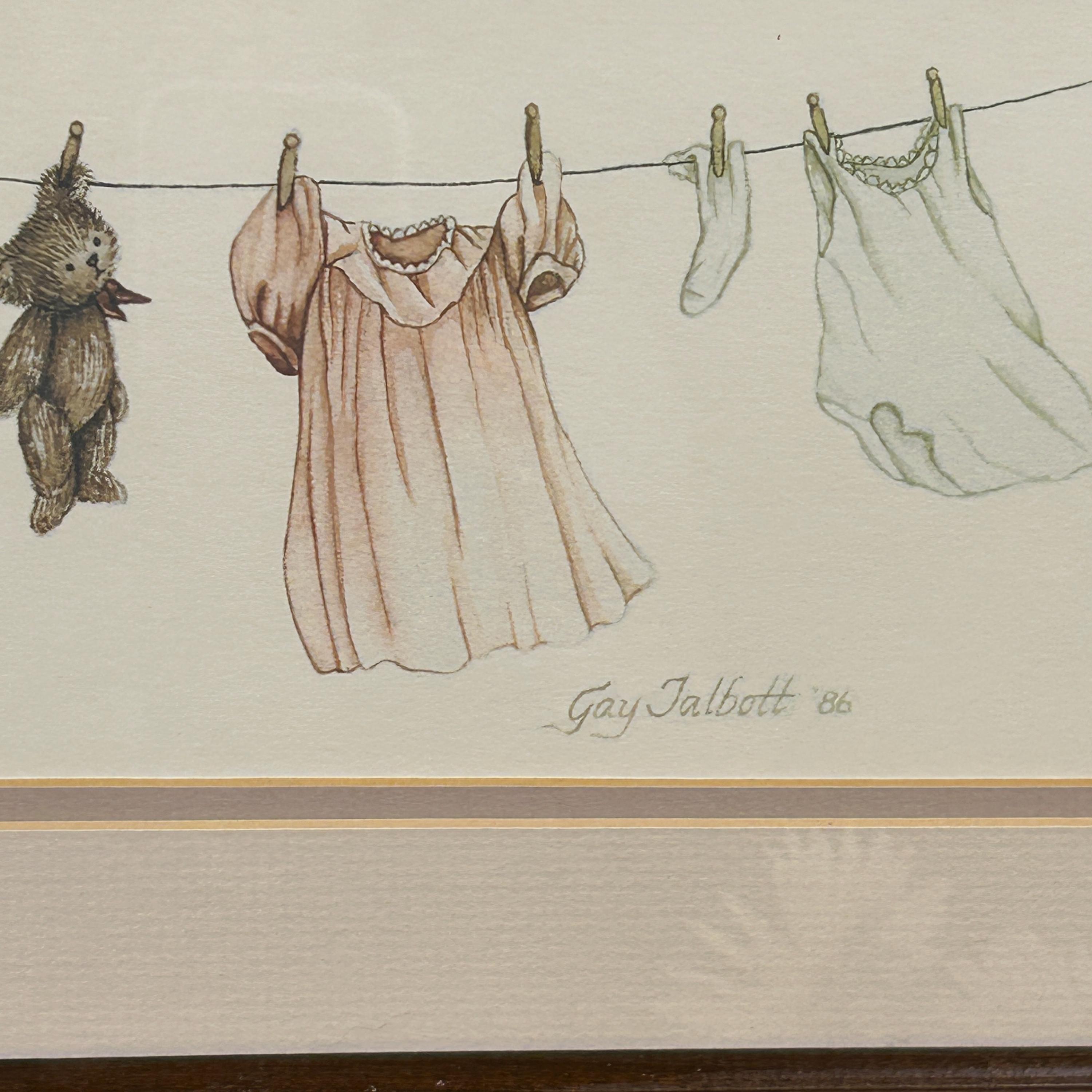 Gay Talbott (Boassy) is an American artist known for creating prints, often featuring whimsical or sentimental themes. This print features clothing items and a teddy bear hanging on a clothesline, which is signed by the artist, dated 1986.