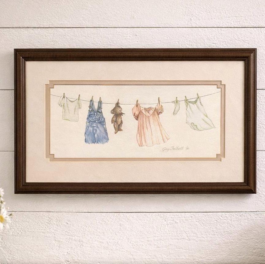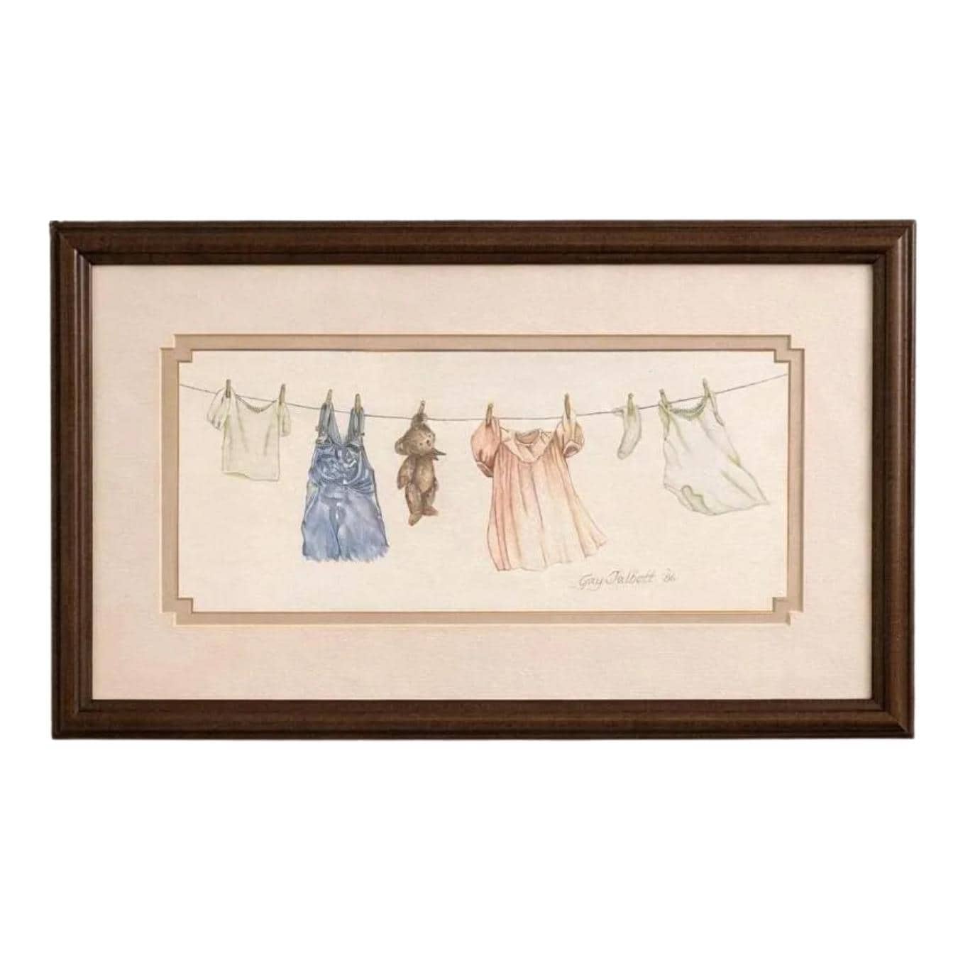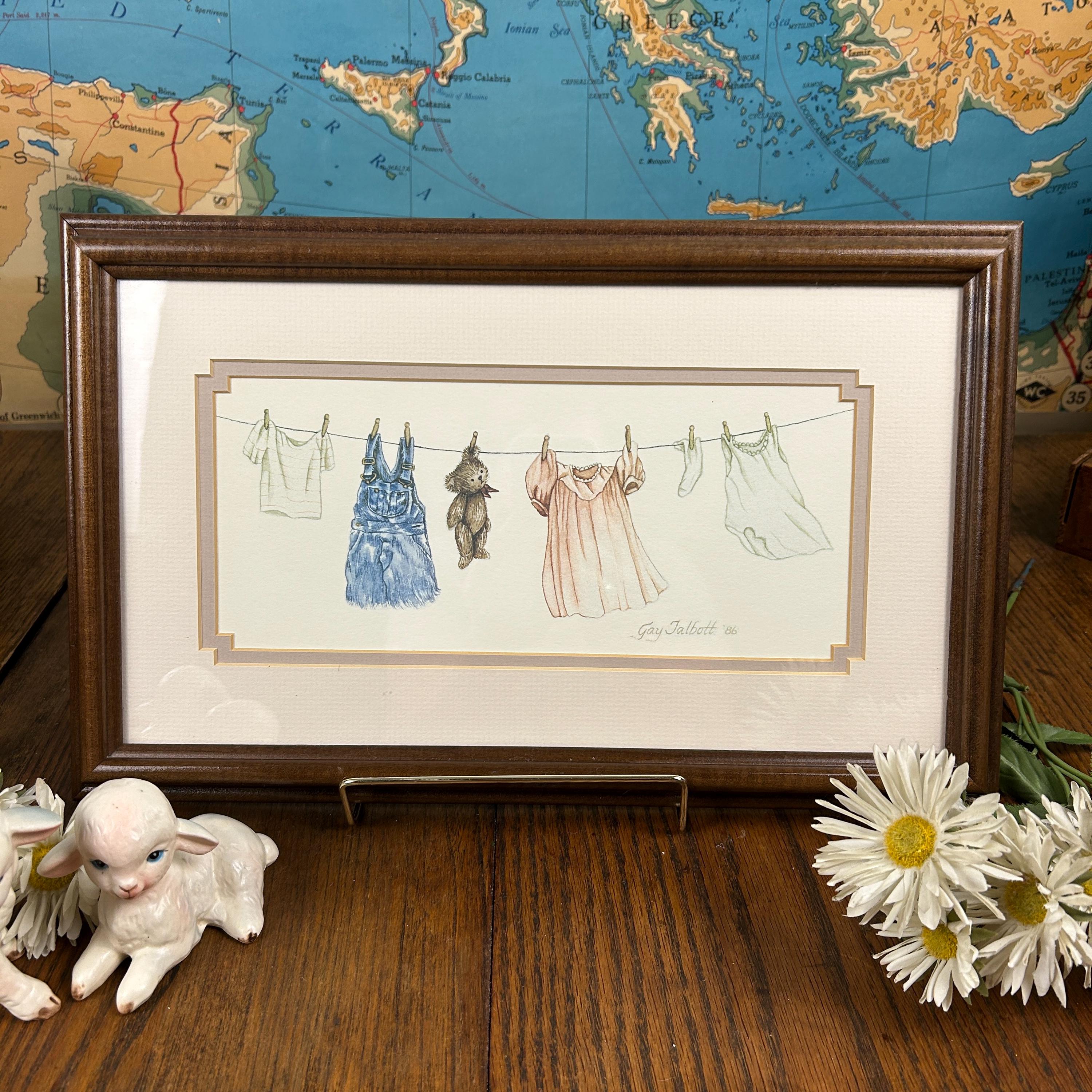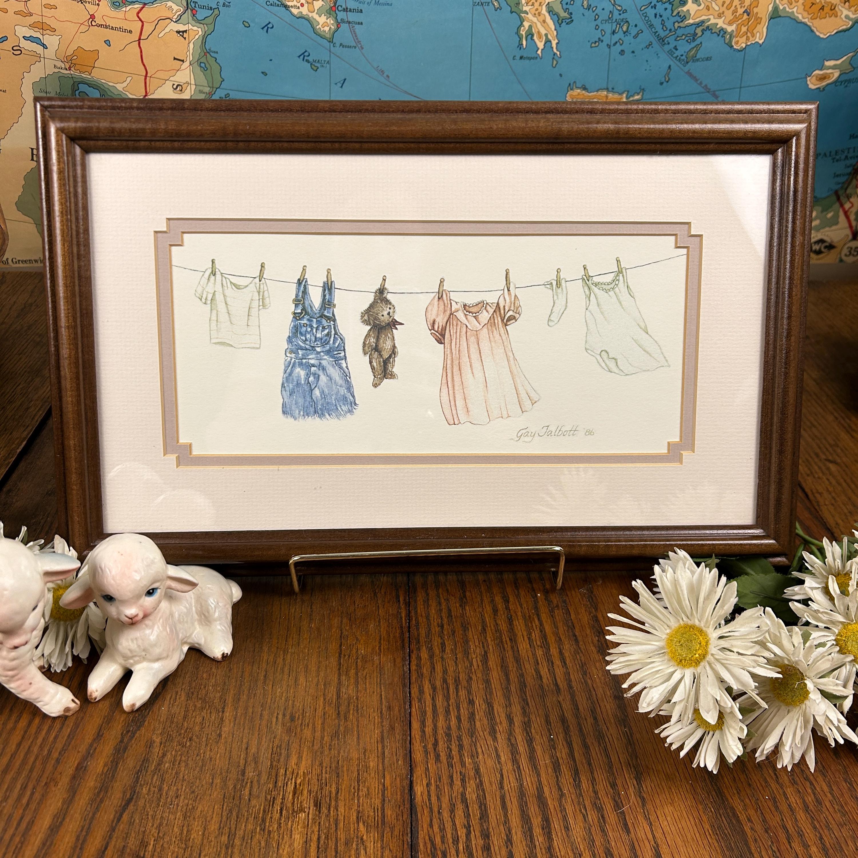 Gay Talbott (Boassy) is an American artist known for creating prints, often featuring whimsical or sentimental themes. This print features clothing items and a teddy bear hanging on a clothesline, which is signed by the artist, dated 1986.