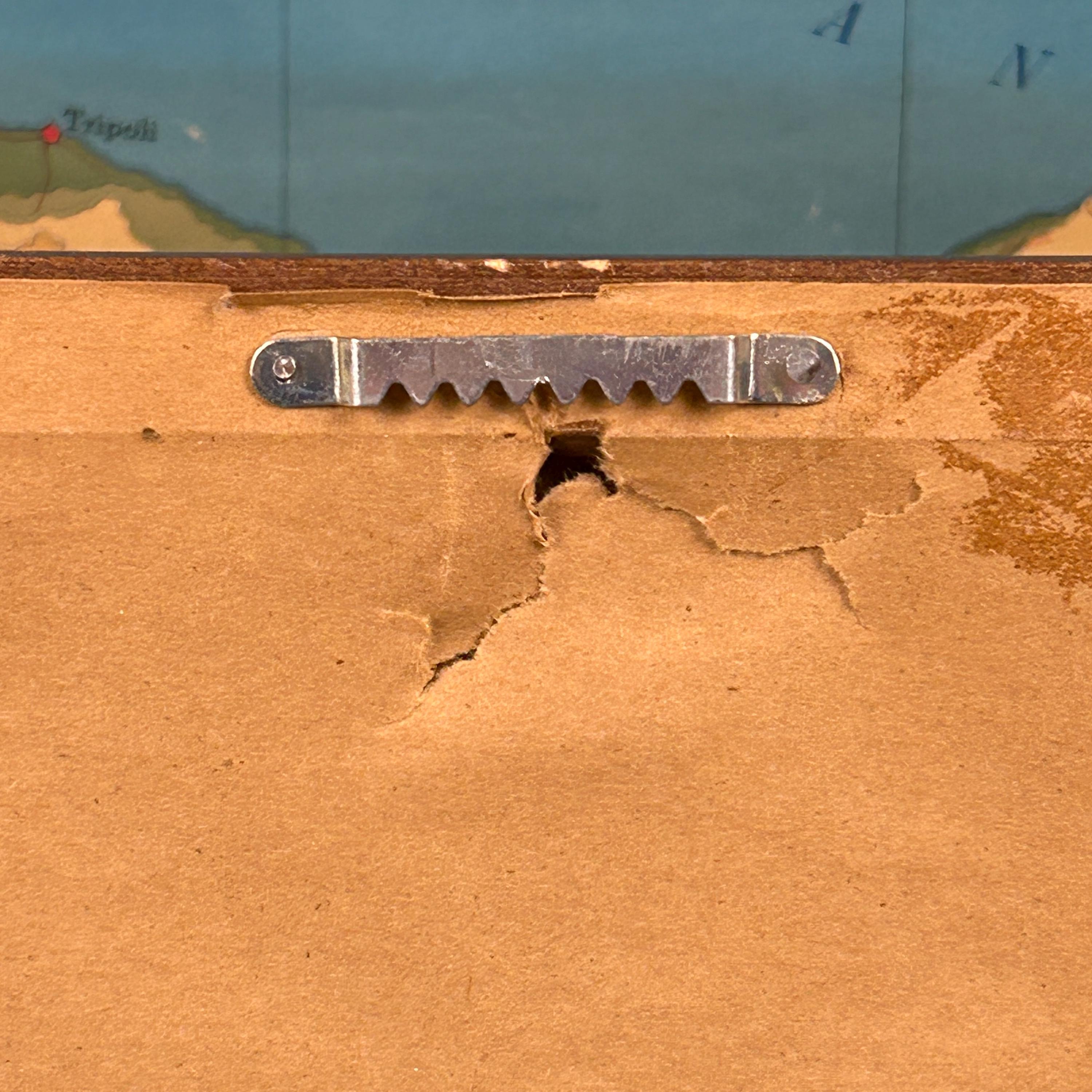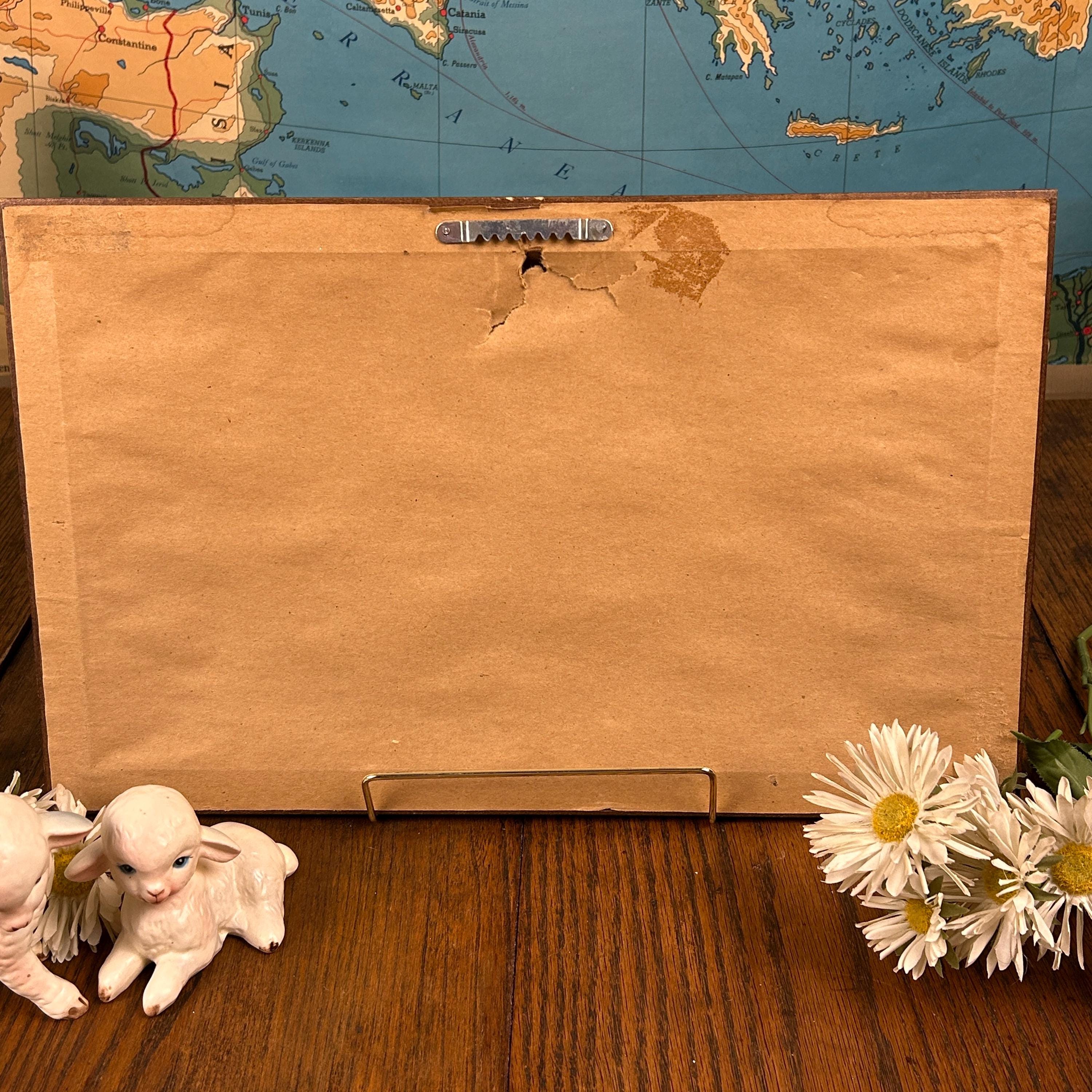 The framed print measures 16" x 10" and is in excellent condition. The paper that covers the back of the frame is torn near the hanger, but that does not affect the beauty or functionality of this piece and could easily be replaced if needed.