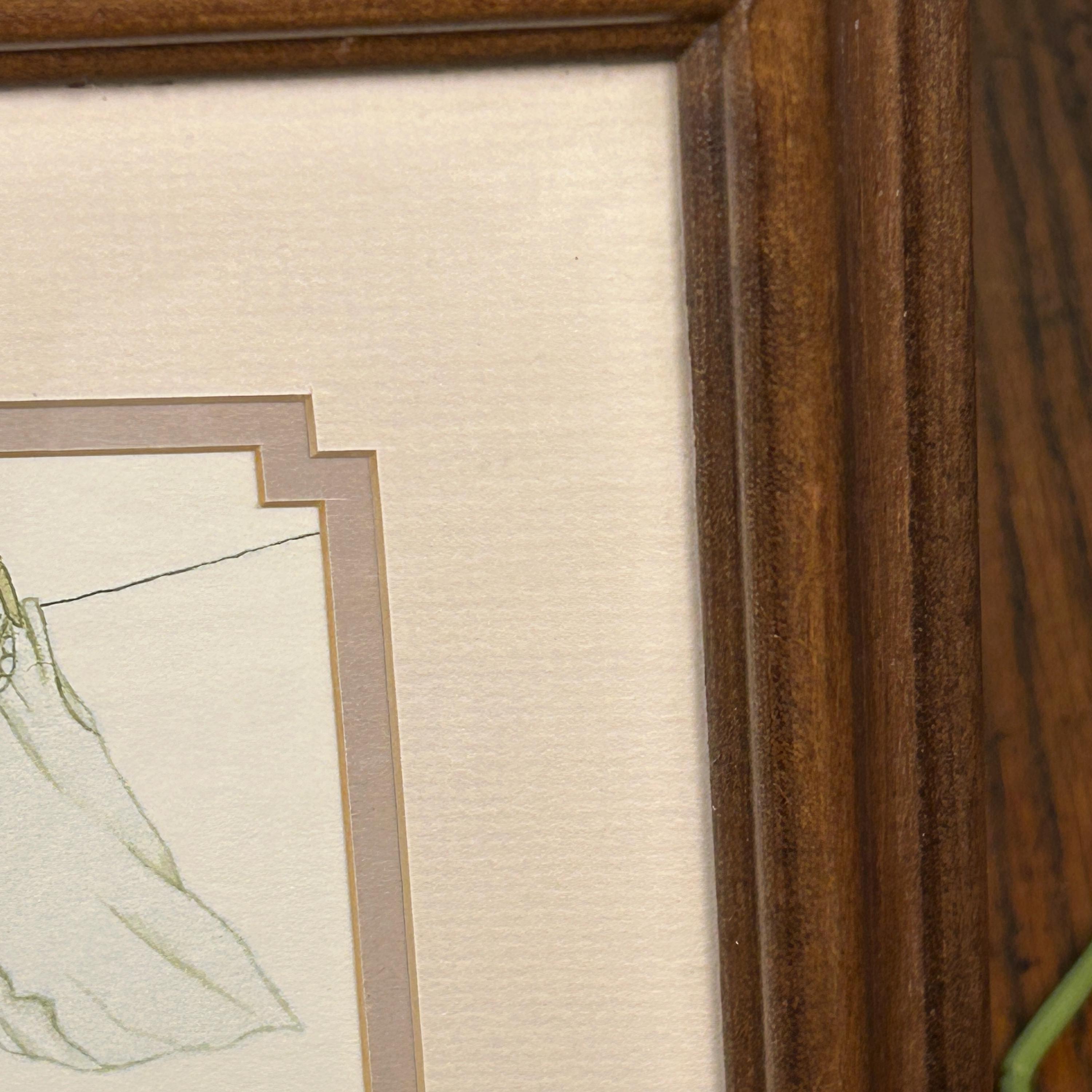 This is a signed, double-matted, professionally framed print in a beautiful dark wood frame. The mat colors are cream with a soft mauve pink inner mat which matches the colors in the art. The back has a saw-tooth hanger and is ready for hanging or for display on an easel.