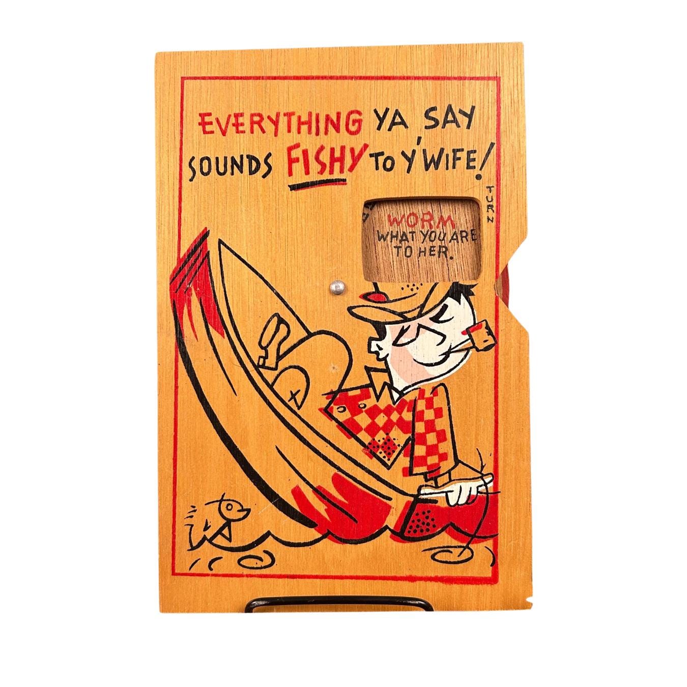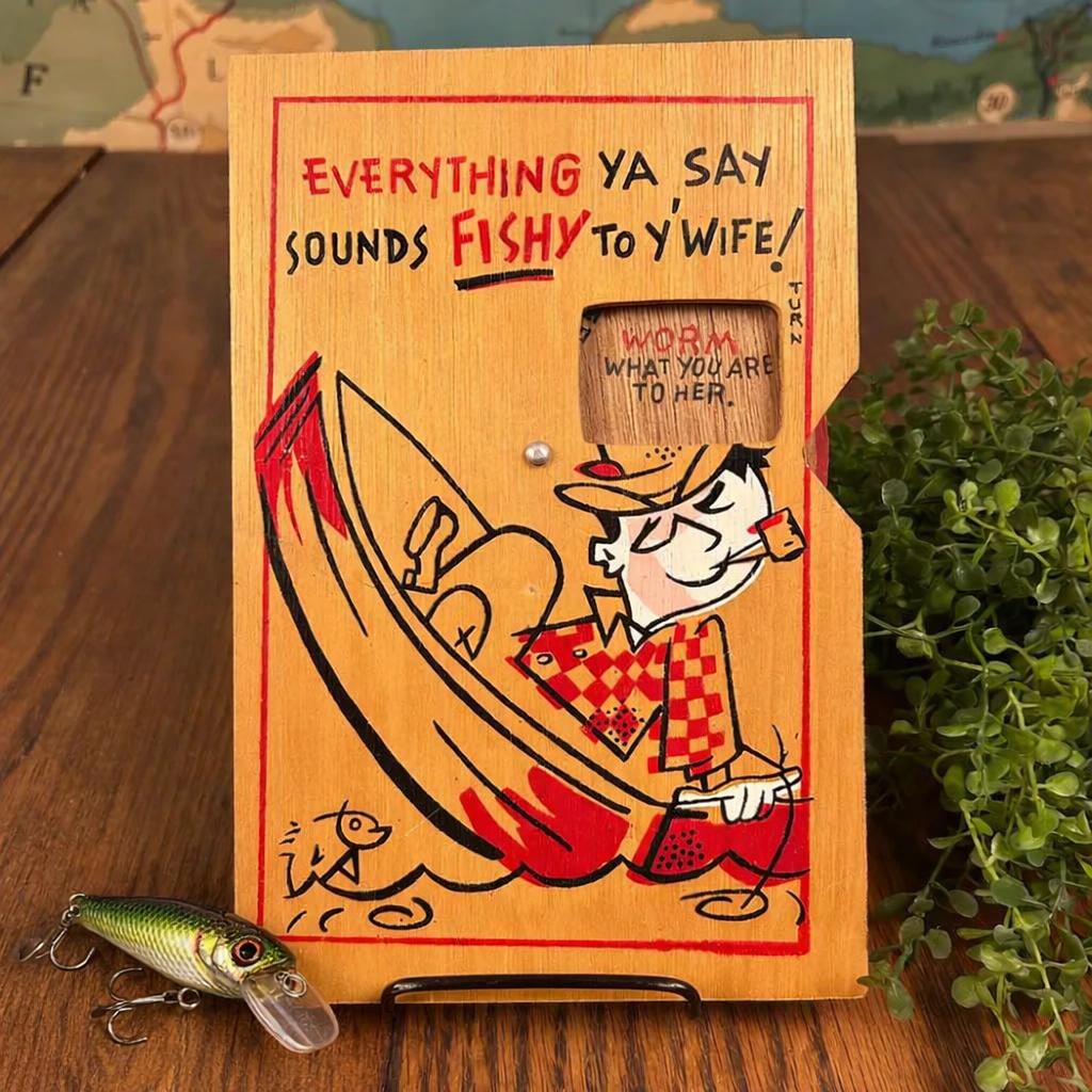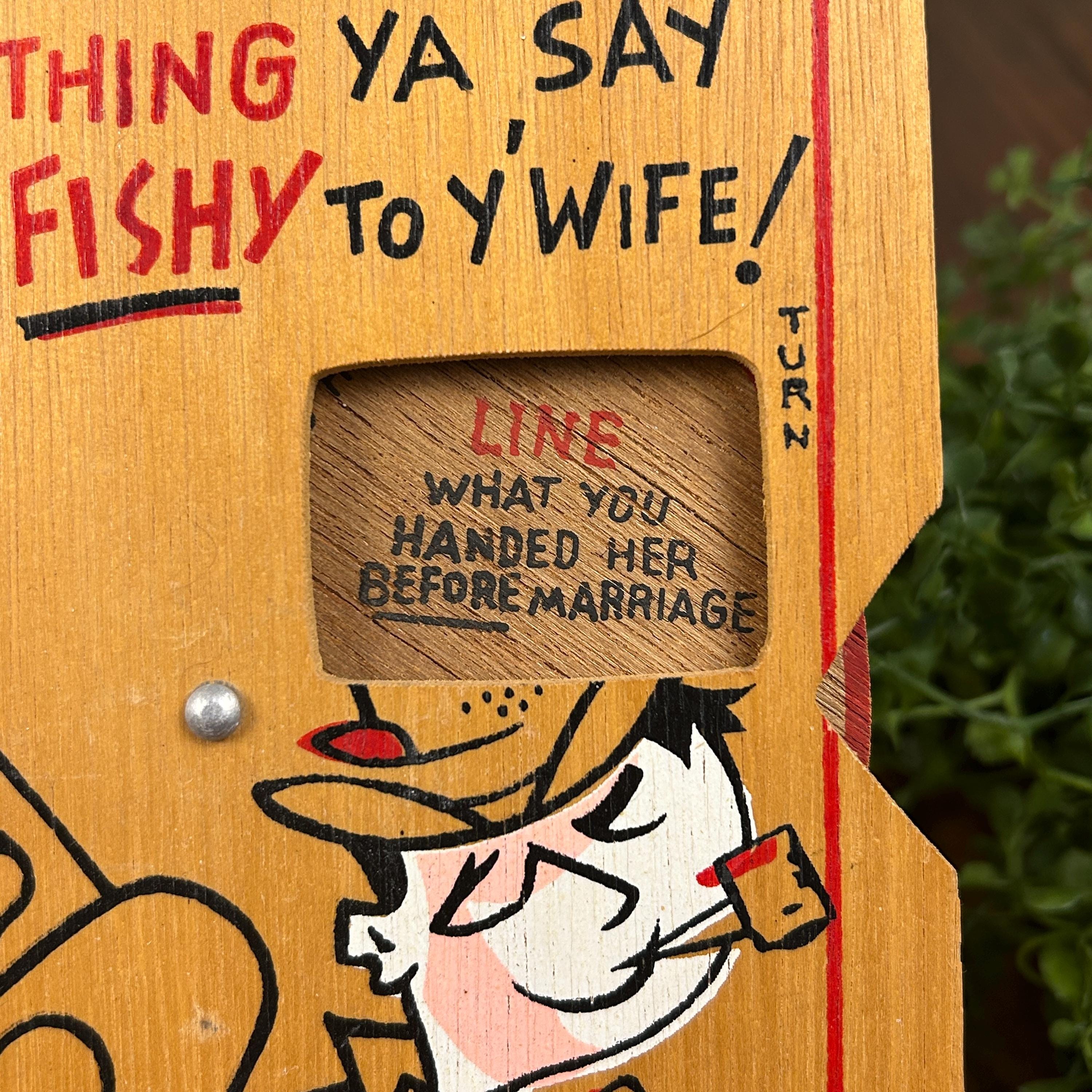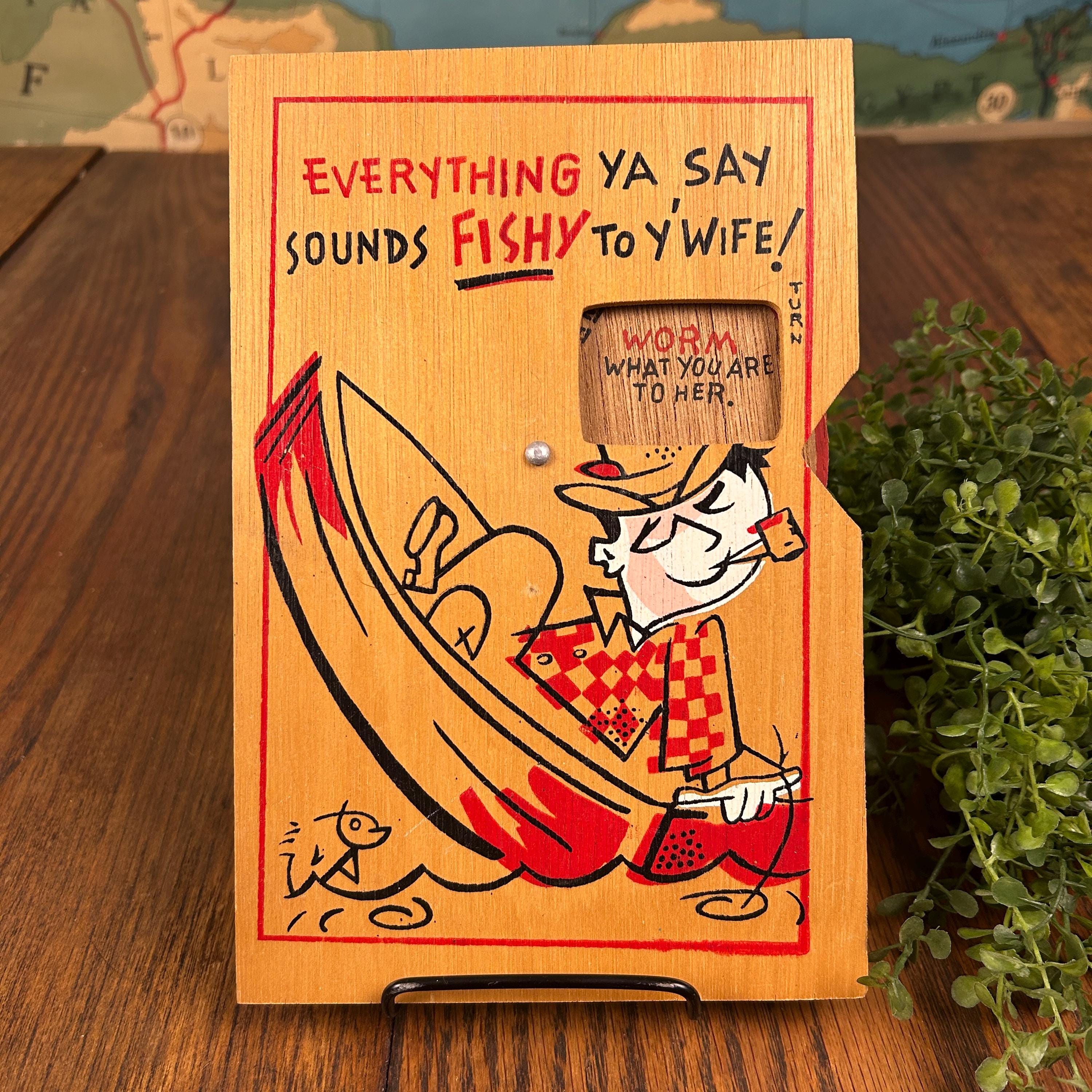 This vintage fishing sign is made of wood and painted. It features a humorous depiction “everything ya say sounds fishy to y’wife” turning the wheel, making it a comical decor for a man cave, shop, or garage. The sign is rectangular in shape and can be wall mounted or displayed on a table, perfect for all occasions. The subject of the sign is fishing, adding a fun touch to any space.