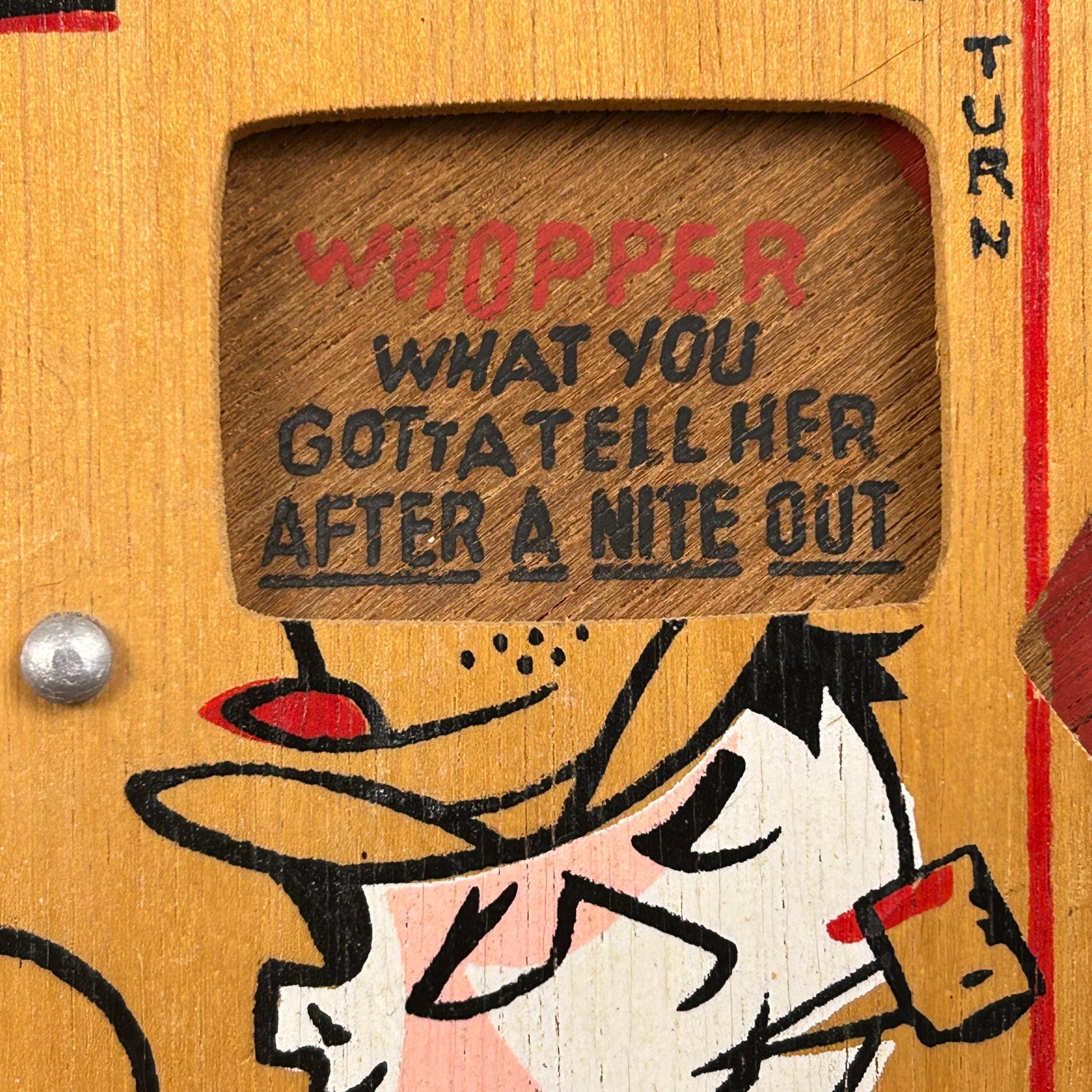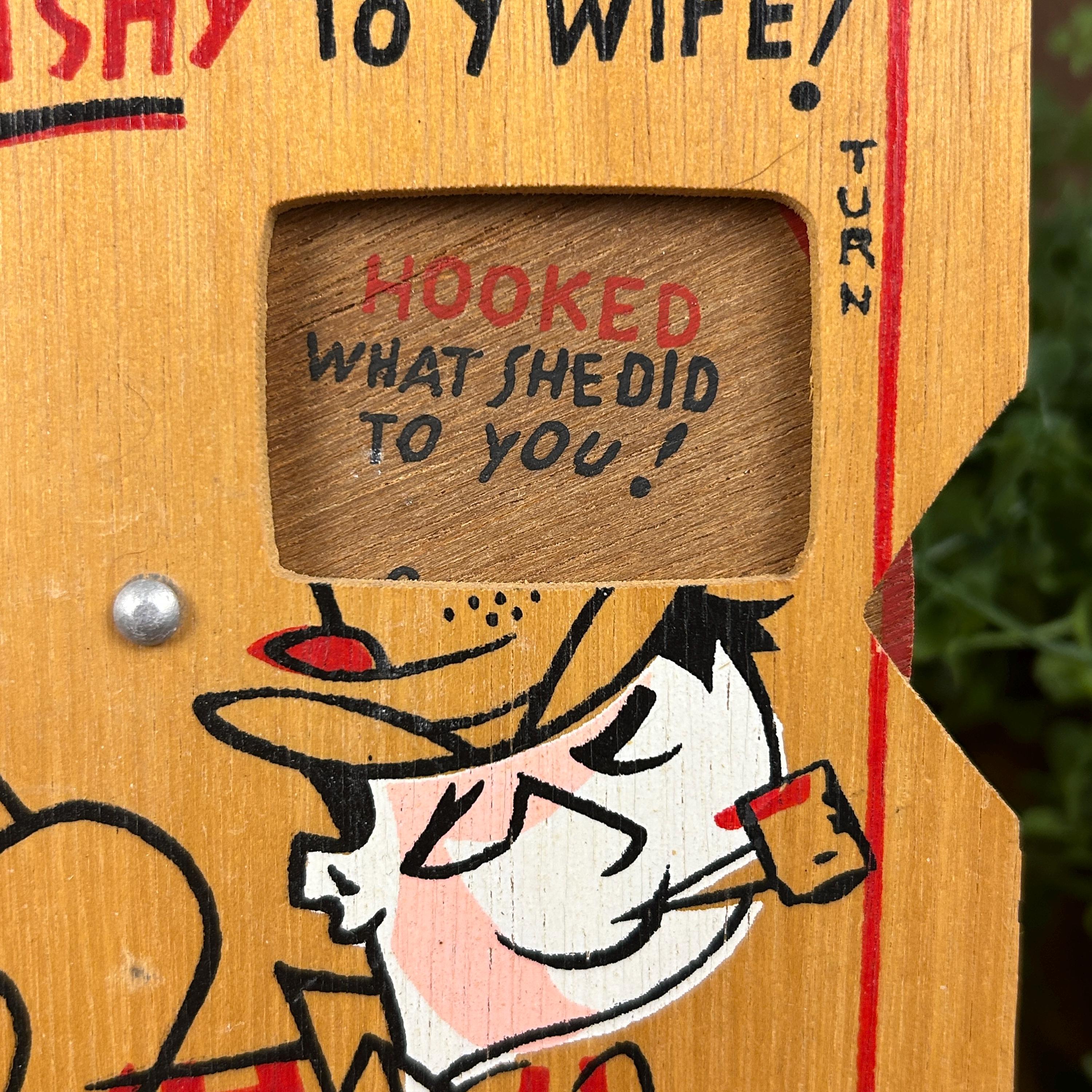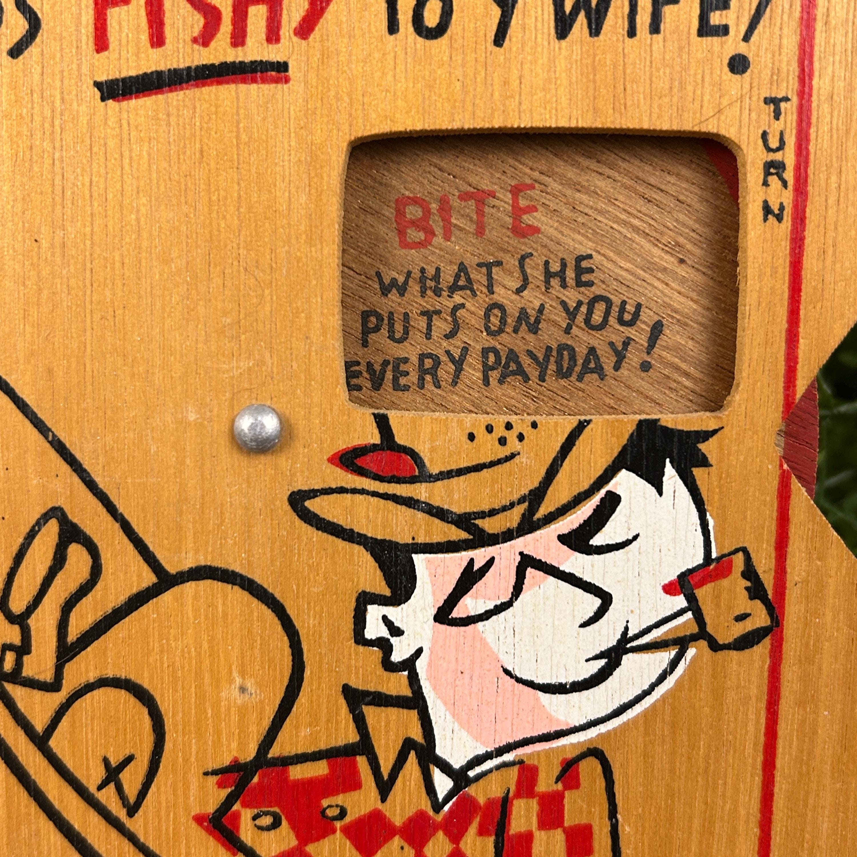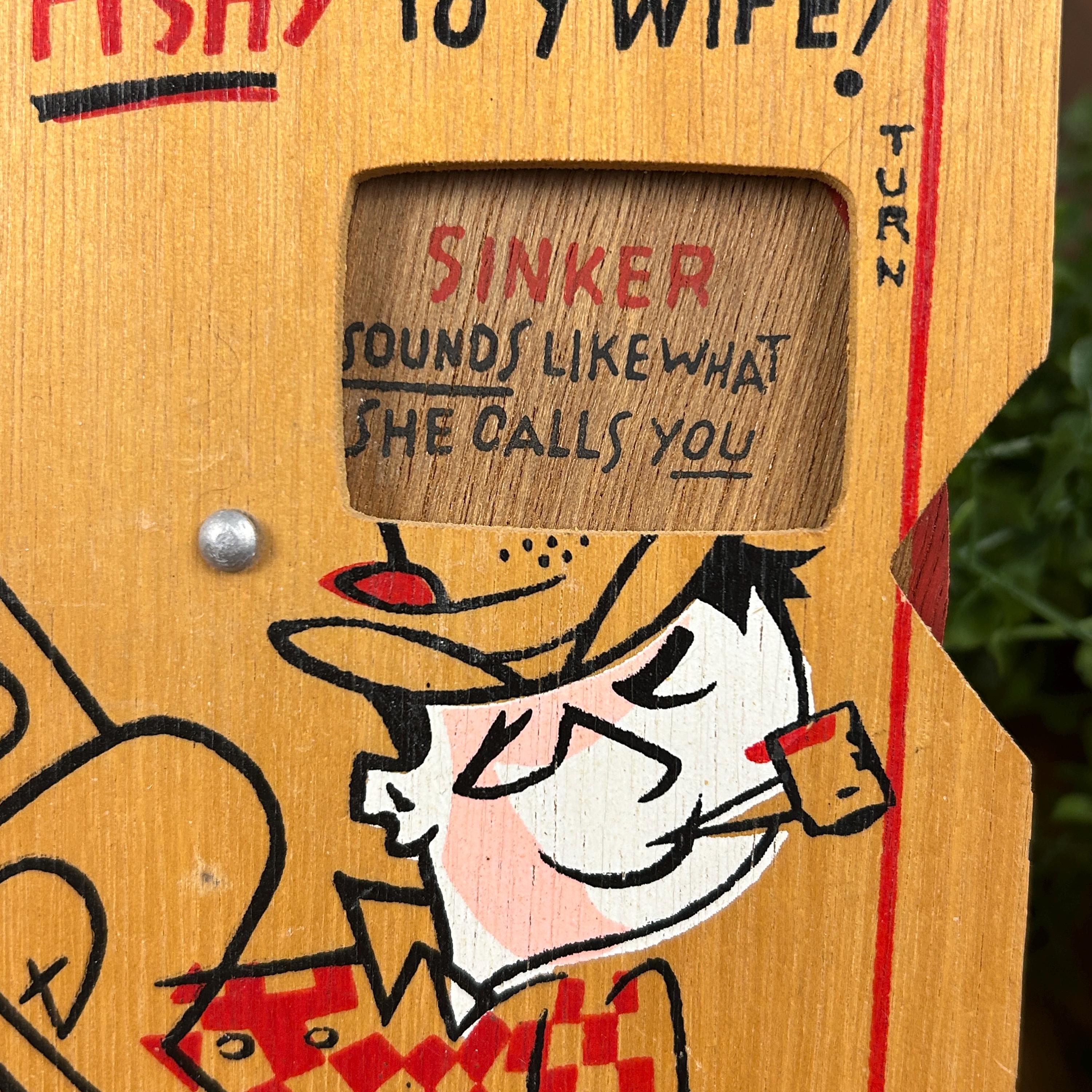 This vintage fishing sign is made of wood and painted. It features a humorous depiction “everything ya say sounds fishy to y’wife” turning the wheel, making it a comical decor for a man cave, shop, or garage. The sign is rectangular in shape and can be wall mounted or displayed on a table, perfect for all occasions. The subject of the sign is fishing, adding a fun touch to any space.