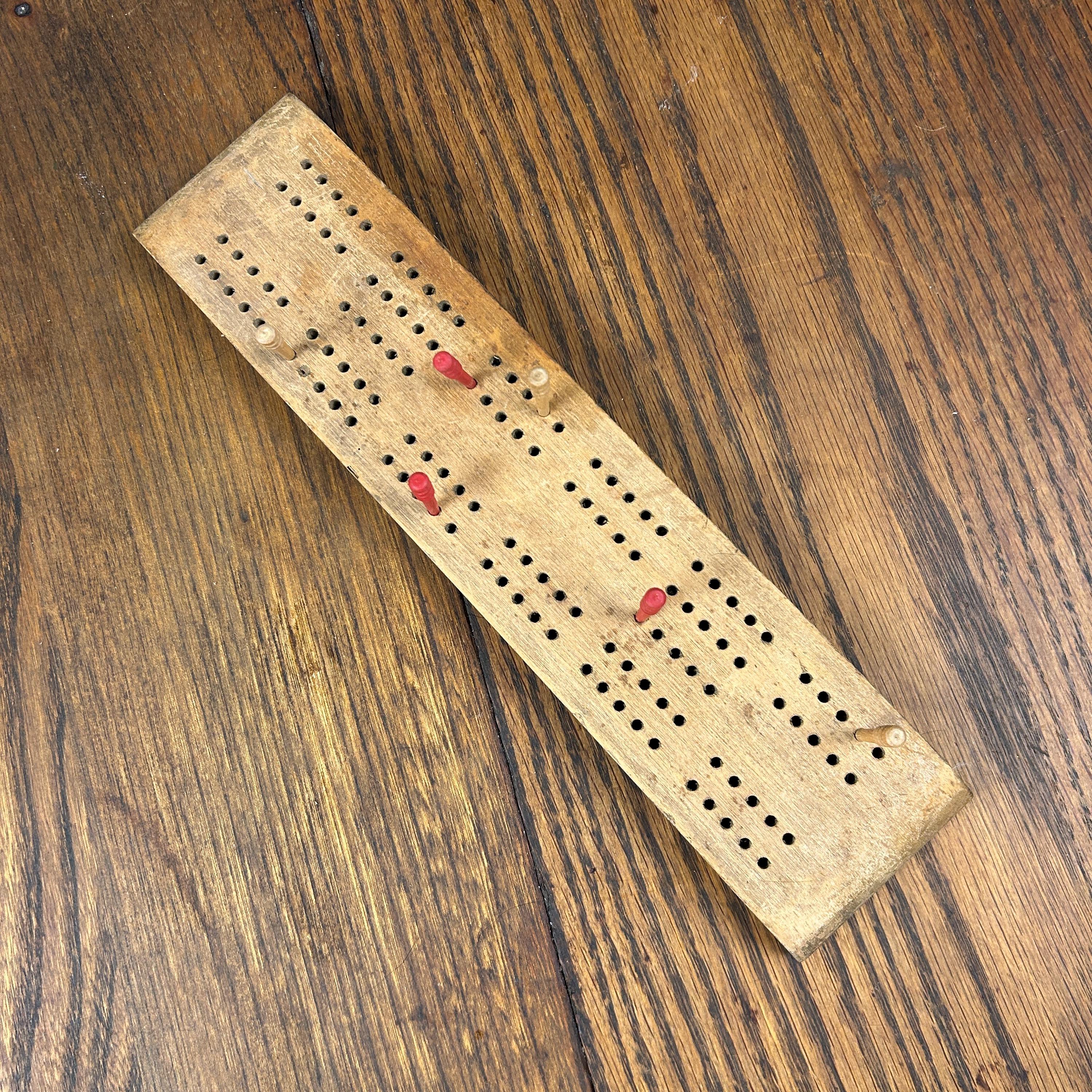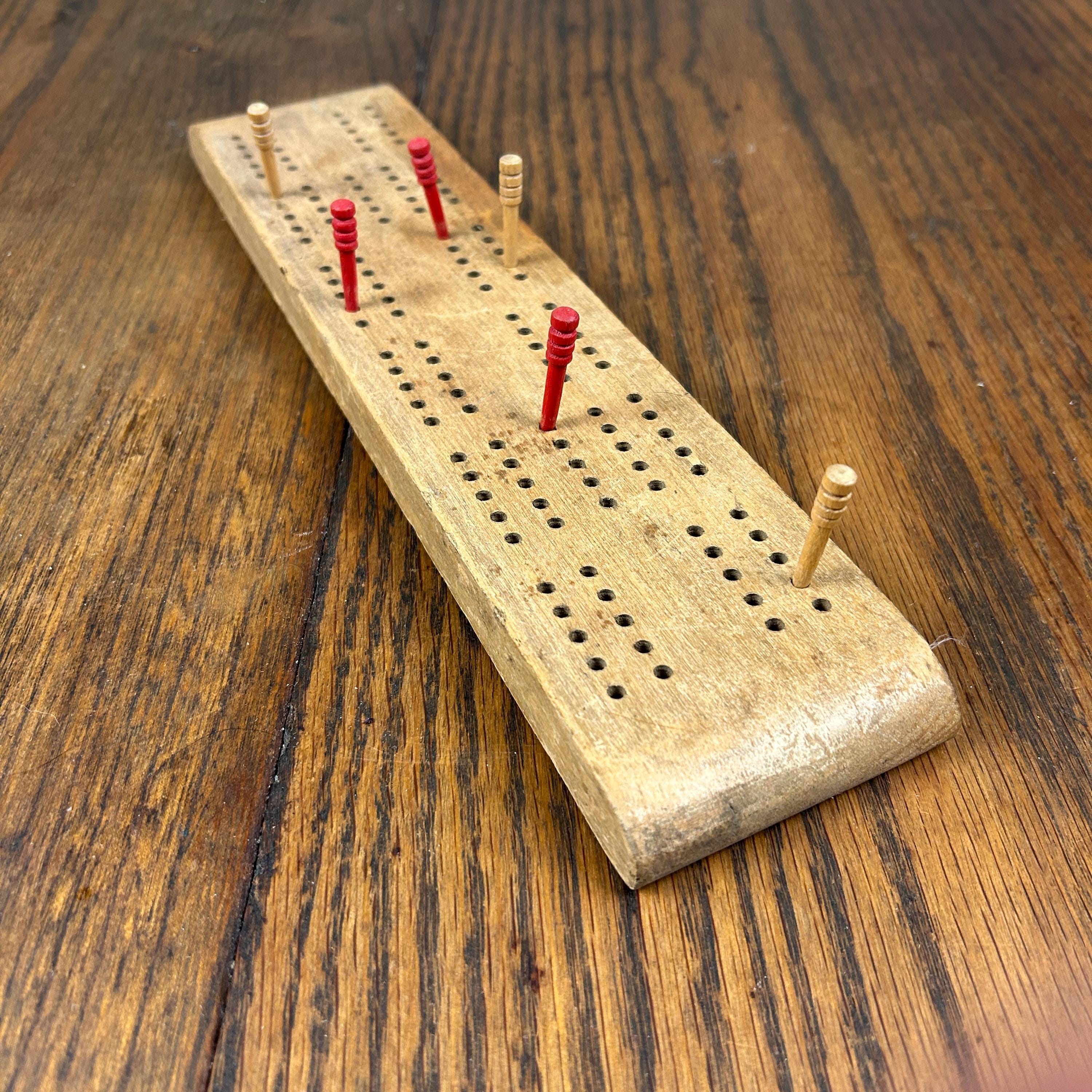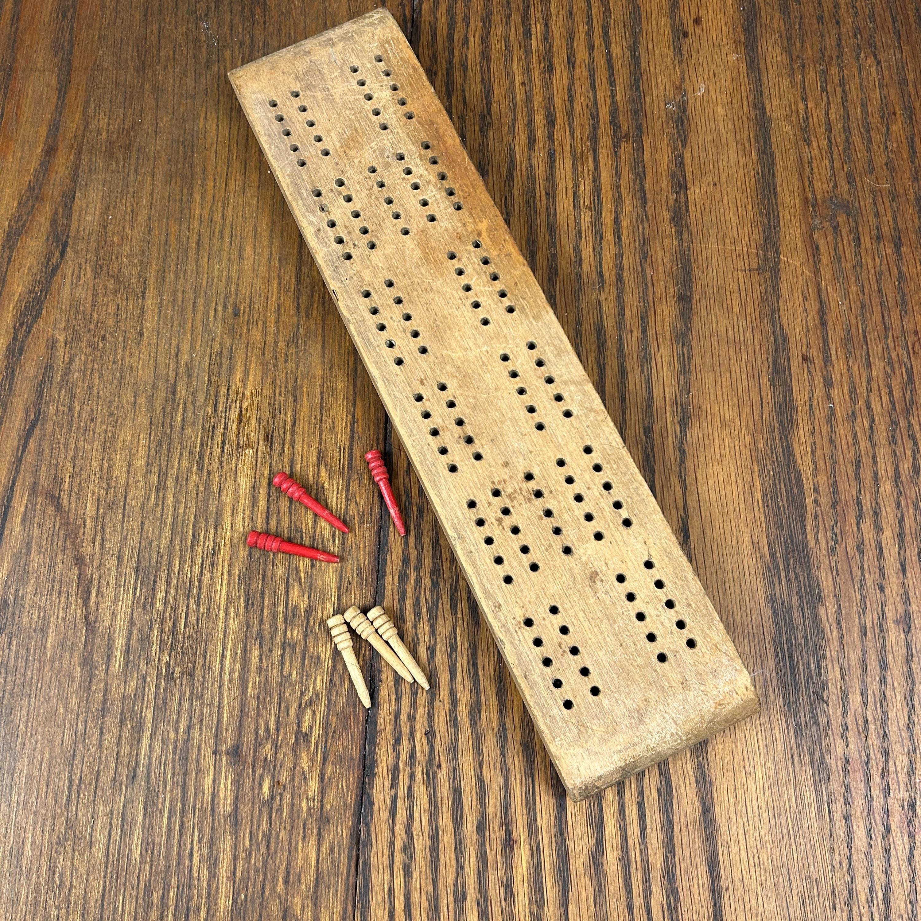 This is a beautiful old Cribbage game of solid wood with indent carved underneath to store the wooden pegs, three red and three natural wood. The space closes with an old piece of metal that slides in and out to store the pegs underneath. This appears to be handmade. In very good vintage condition. Pegs are perfect and game is a beautiful old wood.