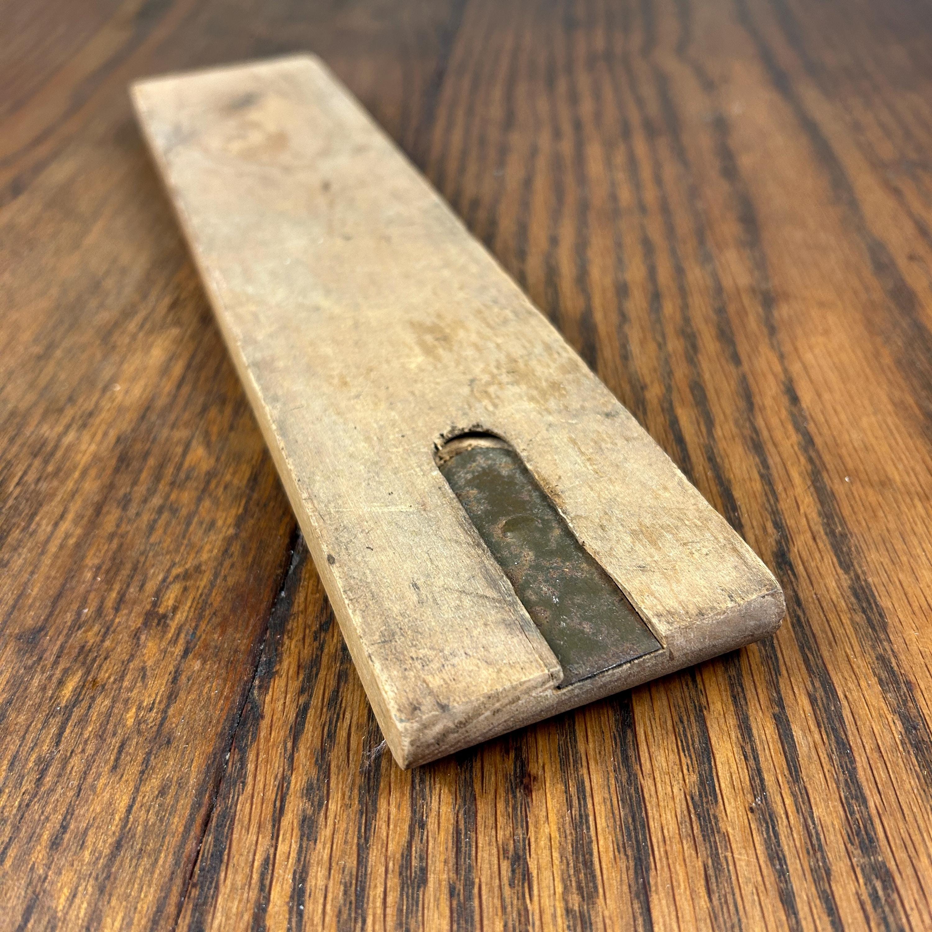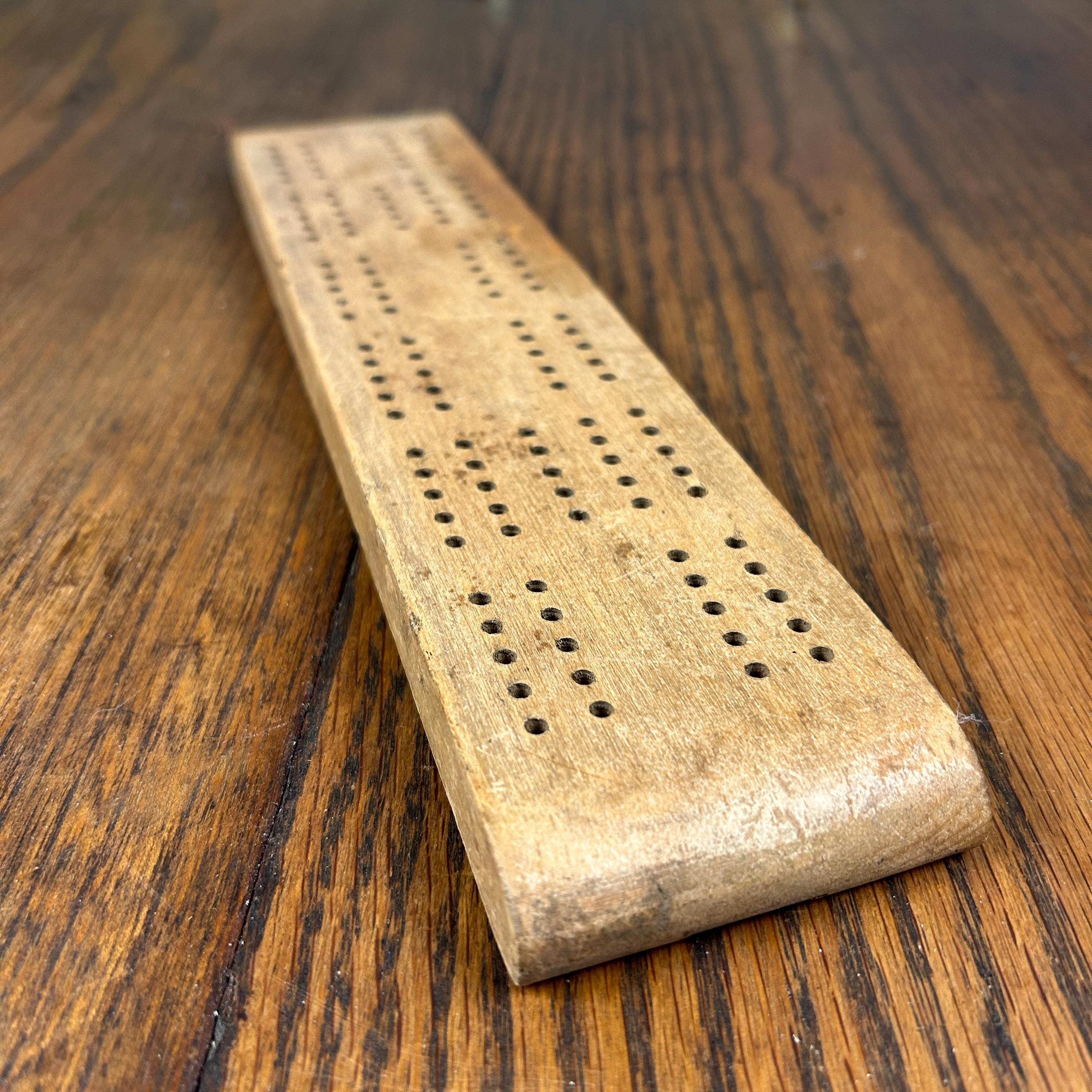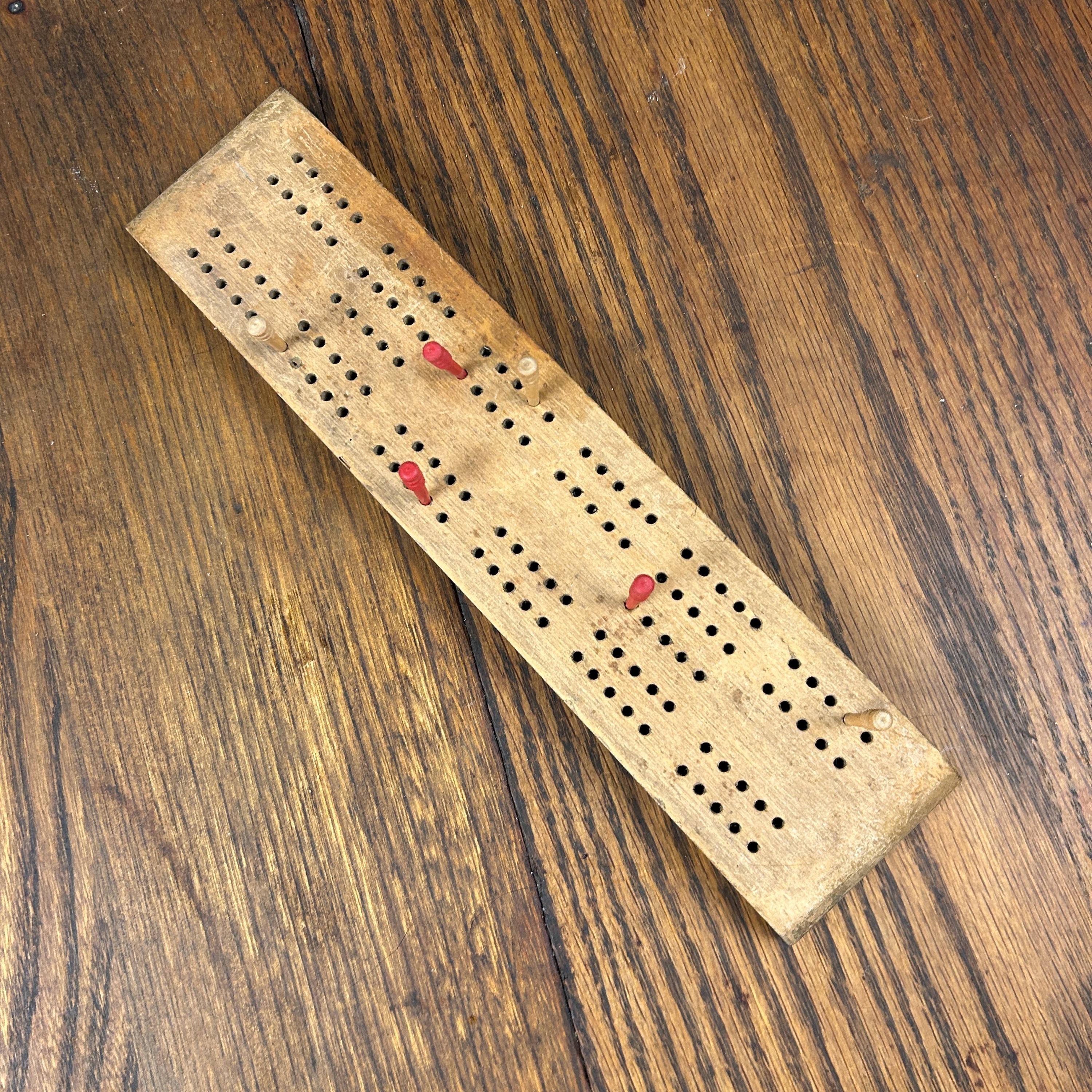 This is a beautiful old Cribbage game of solid wood with indent carved underneath to store the wooden pegs, three red and three natural wood. The space closes with an old piece of metal that slides in and out to store the pegs underneath. This appears to be handmade. In very good vintage condition. Pegs are perfect and game is a beautiful old wood.