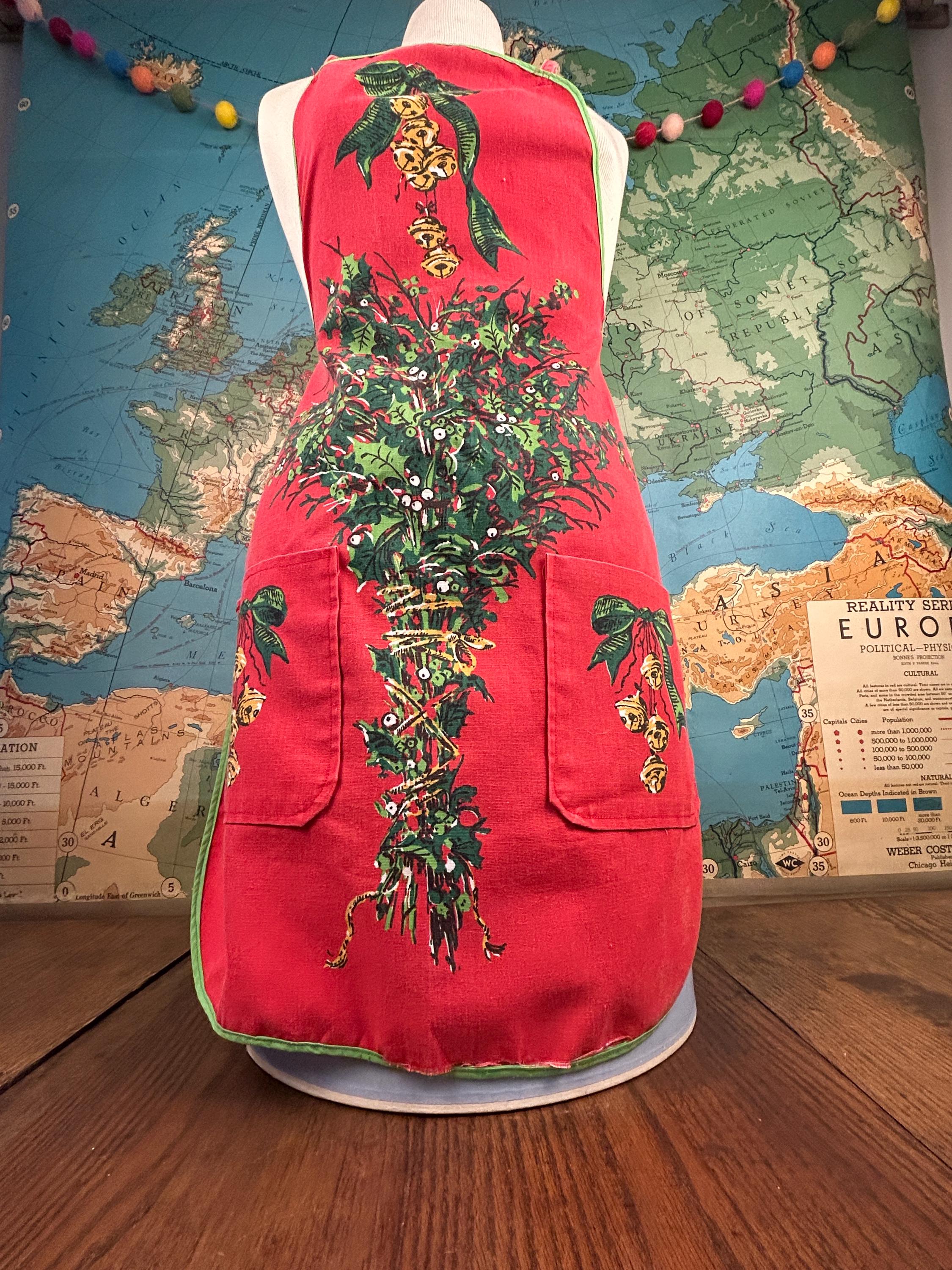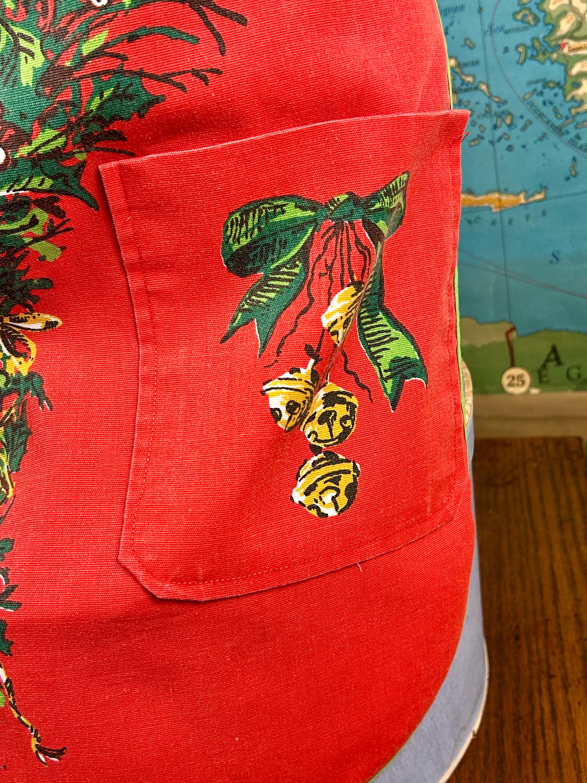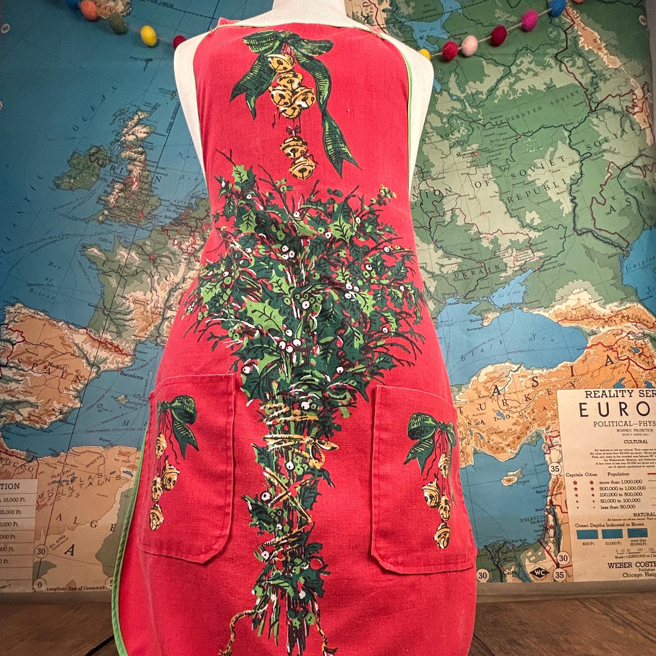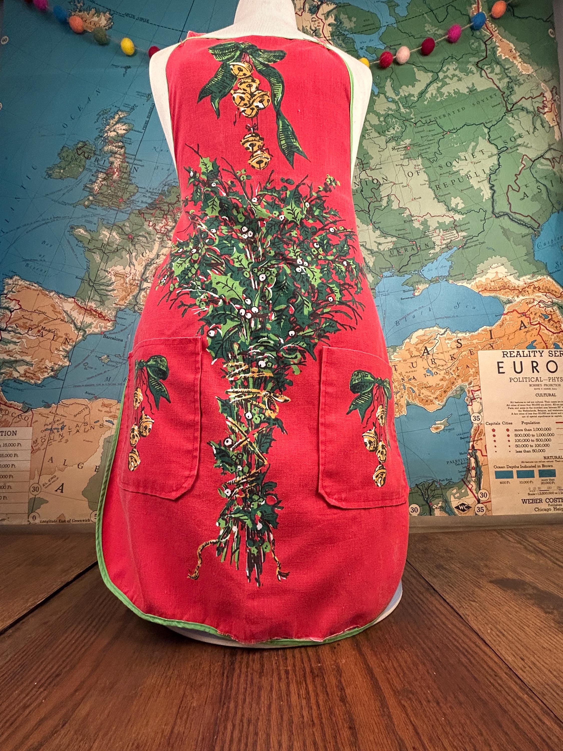 Embrace the spirit of the season with our delightful vintage Christmas apron! Handmade with love, this charming apron features a pocket on each side, perfect for holding your holiday essentials. Adorned with festive holiday bells and greenery, it adds a cheerful touch to your festive kitchen wear. Designed for convenience, it easily slips over the head and ties at the waist. Make your holiday cooking a joyous affair with this unique and functional piece! Perfect for gifting or treating yourself.