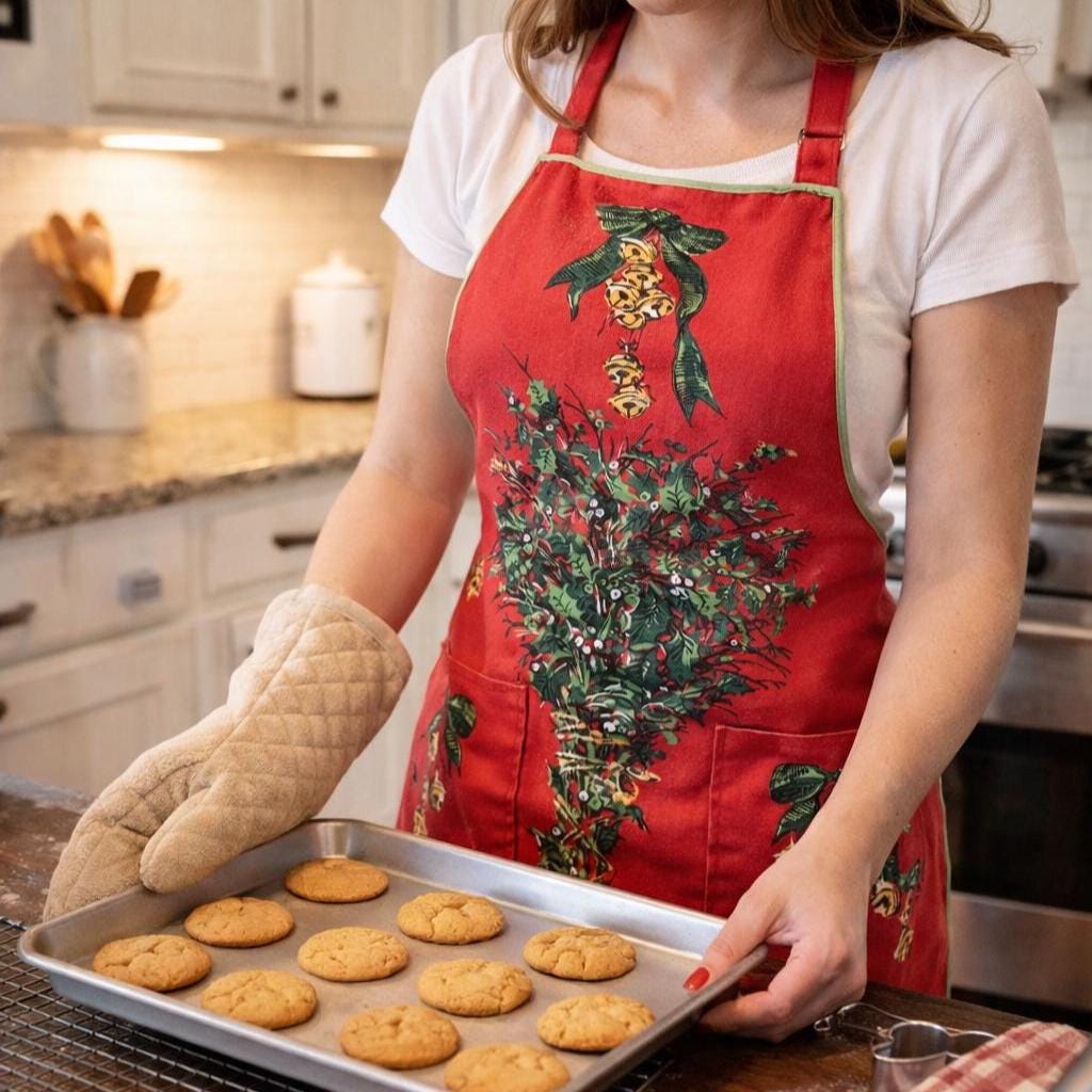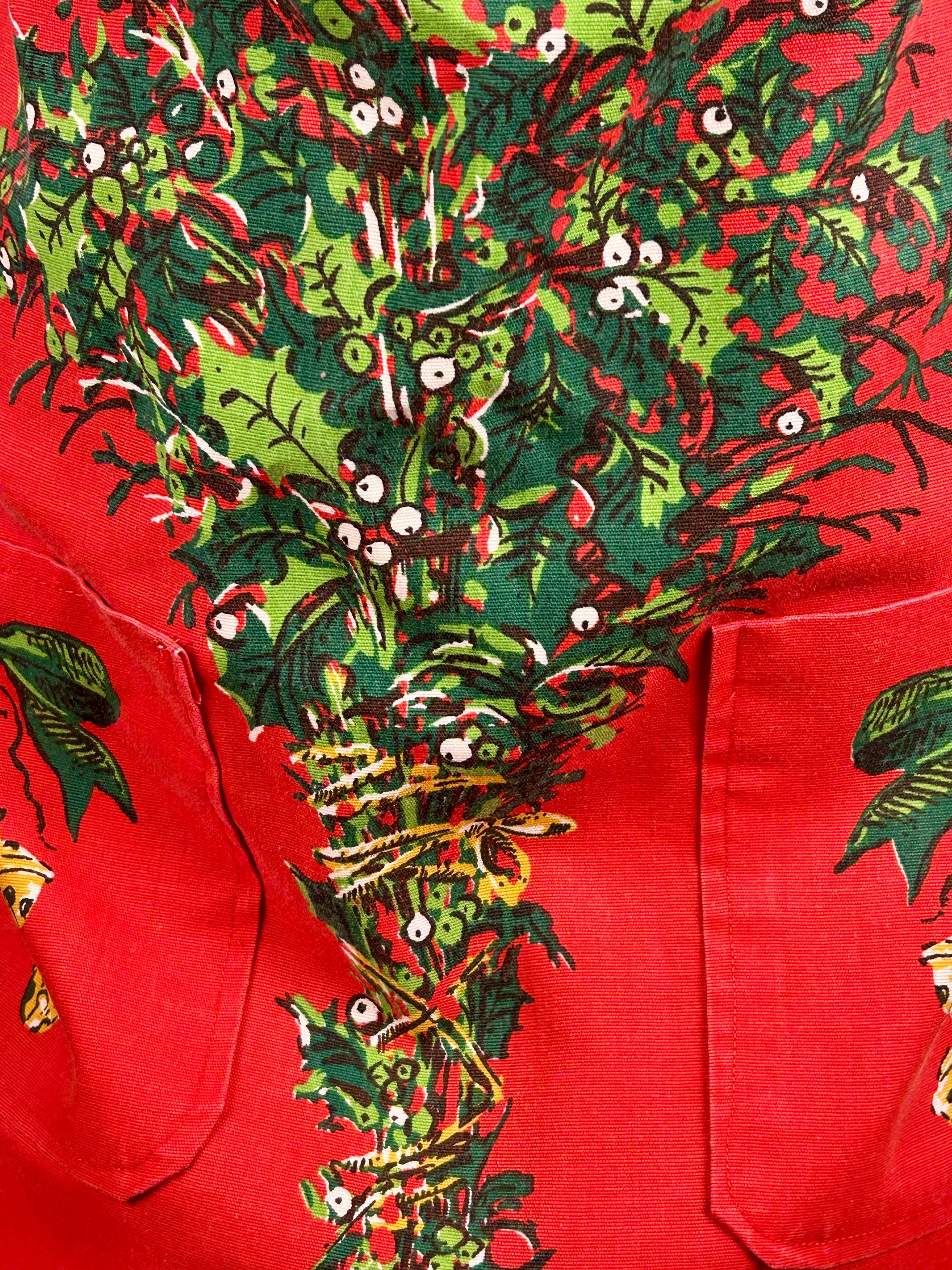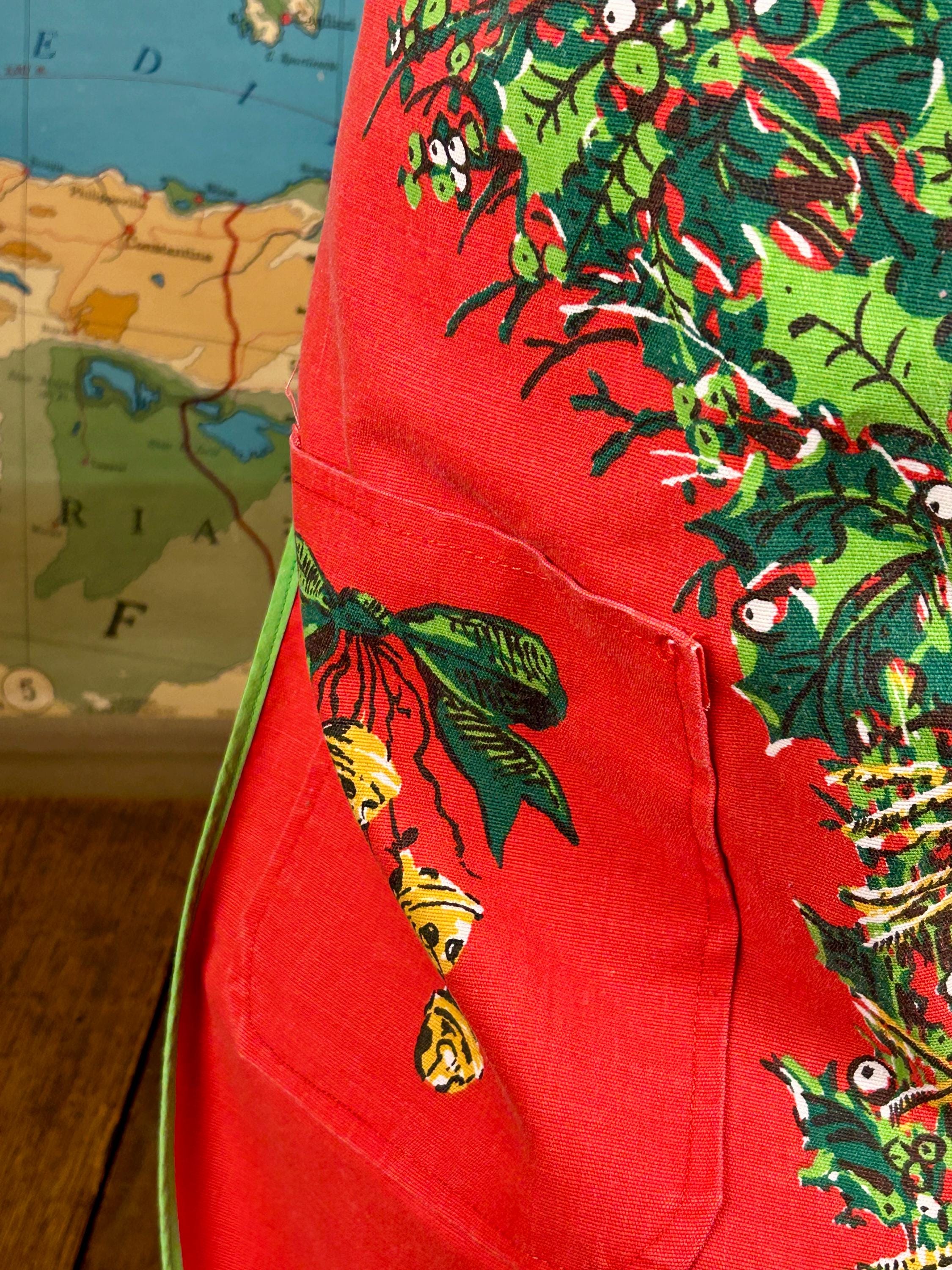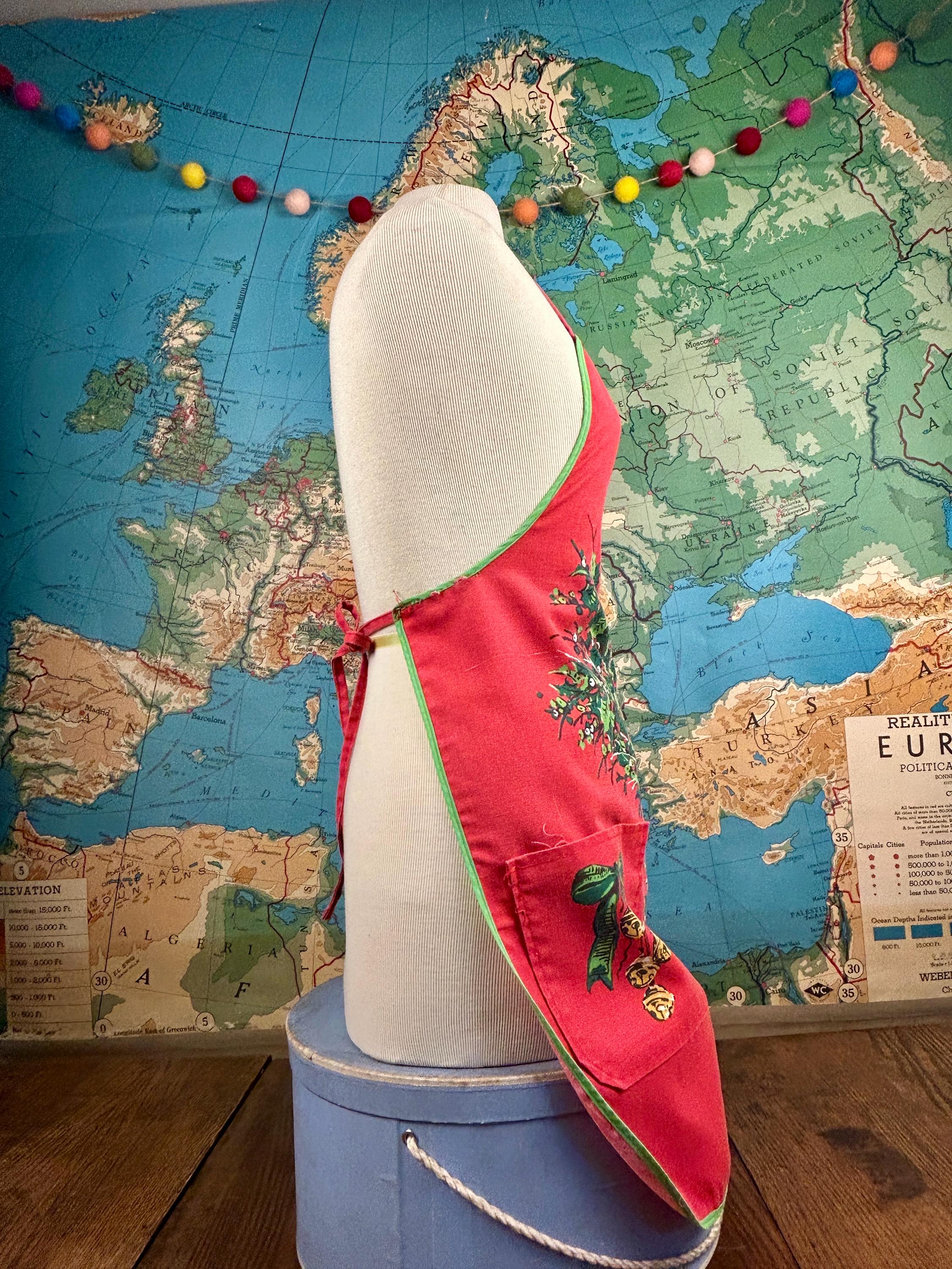 Embrace the spirit of the season with our delightful vintage Christmas apron! Handmade with love, this charming apron features a pocket on each side, perfect for holding your holiday essentials. Adorned with festive holiday bells and greenery, it adds a cheerful touch to your festive kitchen wear. Designed for convenience, it easily slips over the head and ties at the waist. Make your holiday cooking a joyous affair with this unique and functional piece! Perfect for gifting or treating yourself.