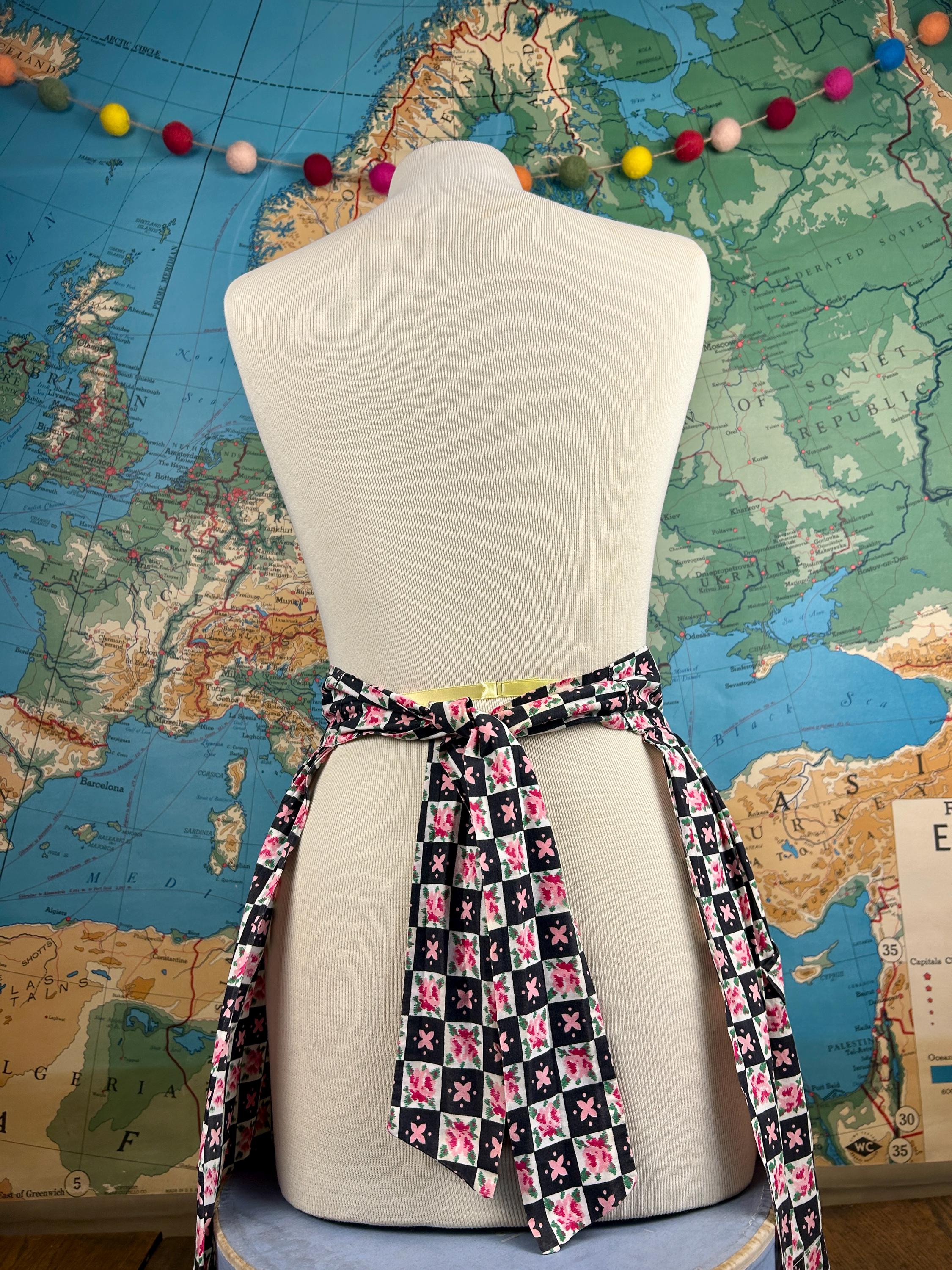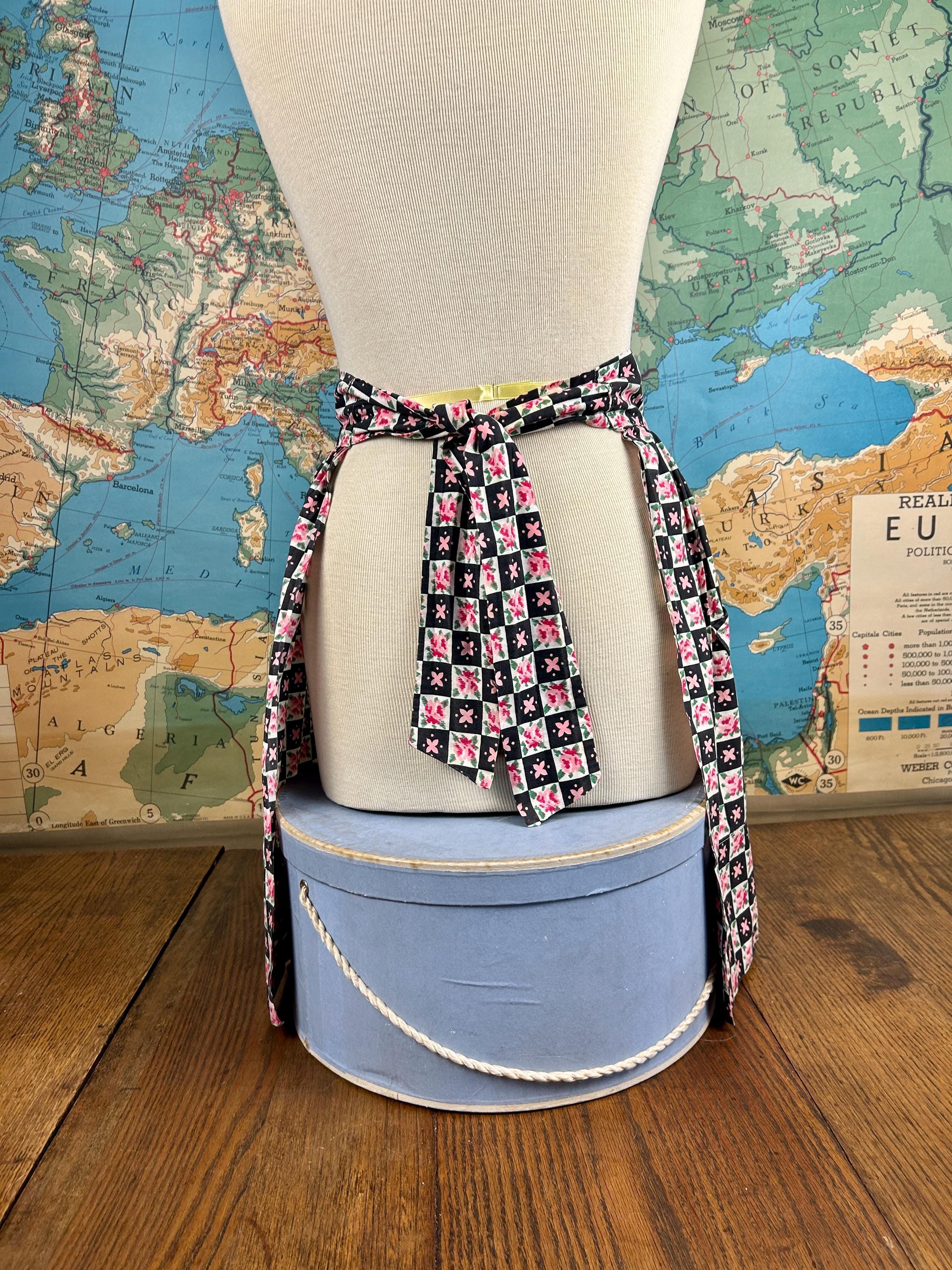 Apron measures 20 1/2" from top of waistband to bottom of hem. It measures 35" at the bottom hem.In lovely vintage condition with no fraying or tears. No visible stains are noticed. Please see all photos as they are part of the description.