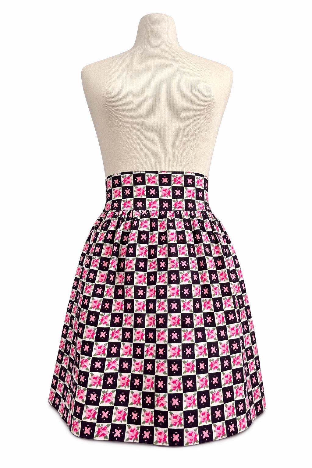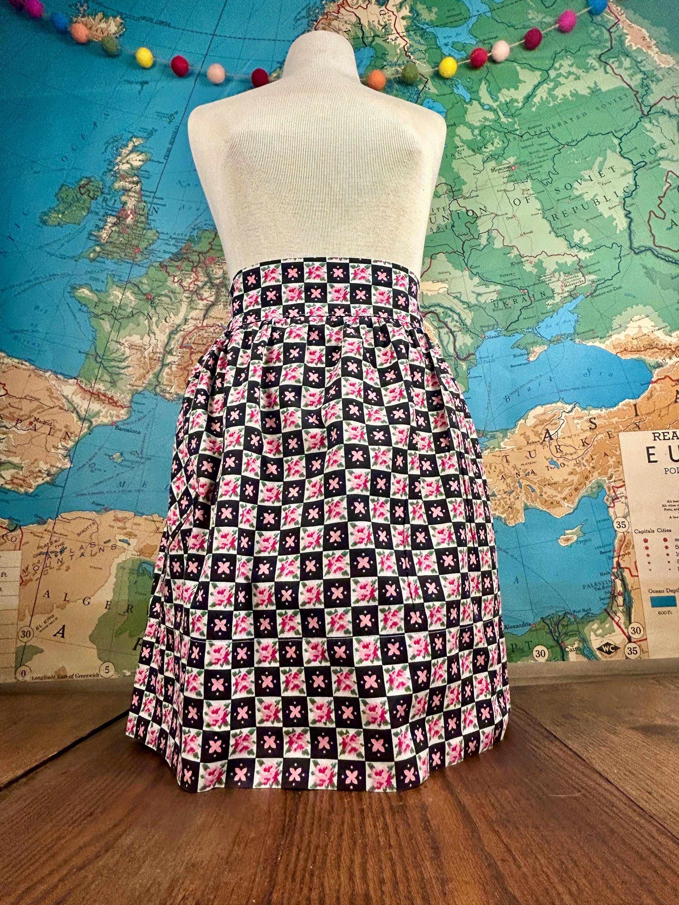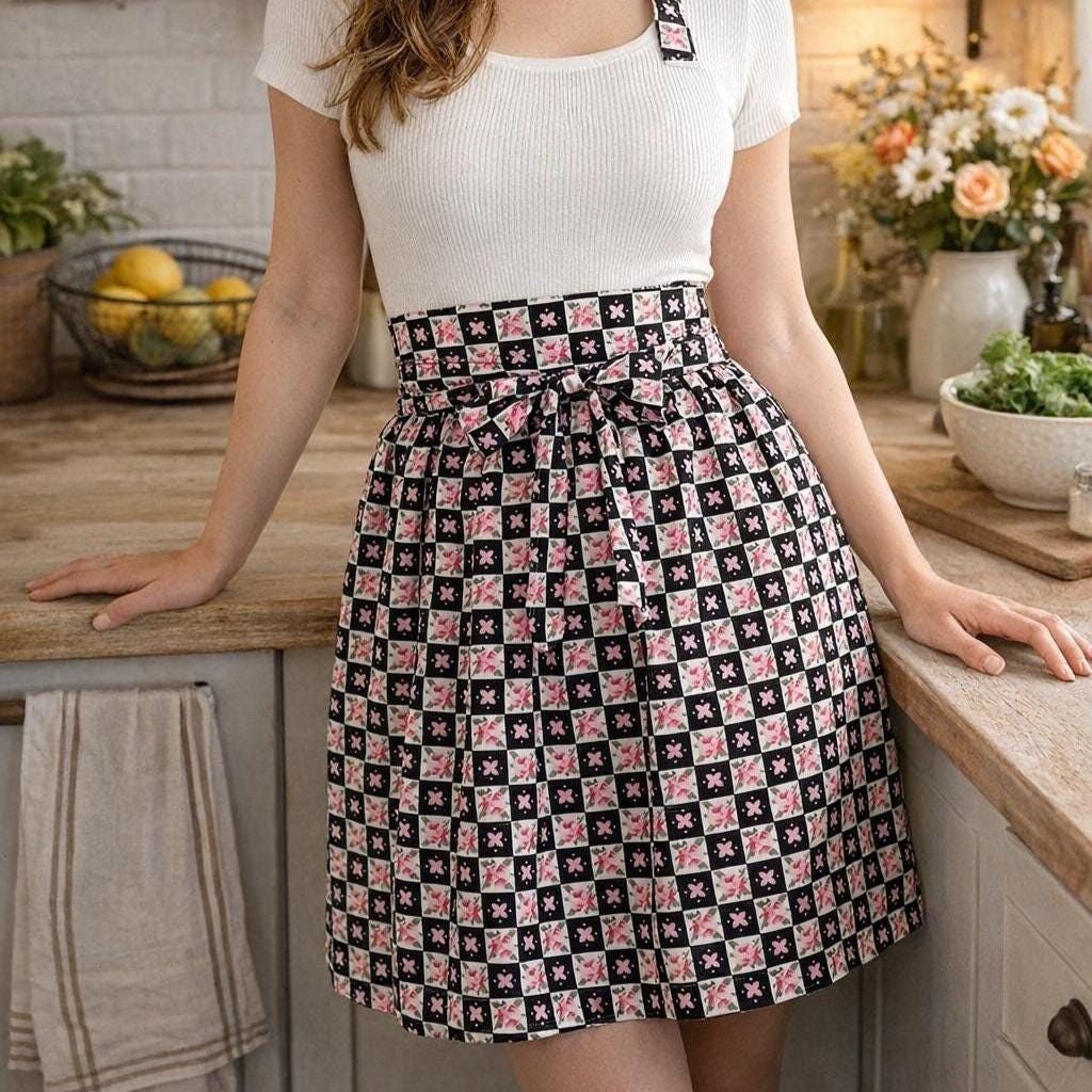 Embrace cottagecore charm with this festive cotton apron! Featuring a delightful floral black design in pinks, reds, greens, whites, and black. This apron combines nostalgia with practicality, making it an ideal gift or personal treat for those who adore vintage vibes. Elevate your look today with this whimsical piece! A slanted patch pocket adorns one side along with a wide waistband and gathered skirt.