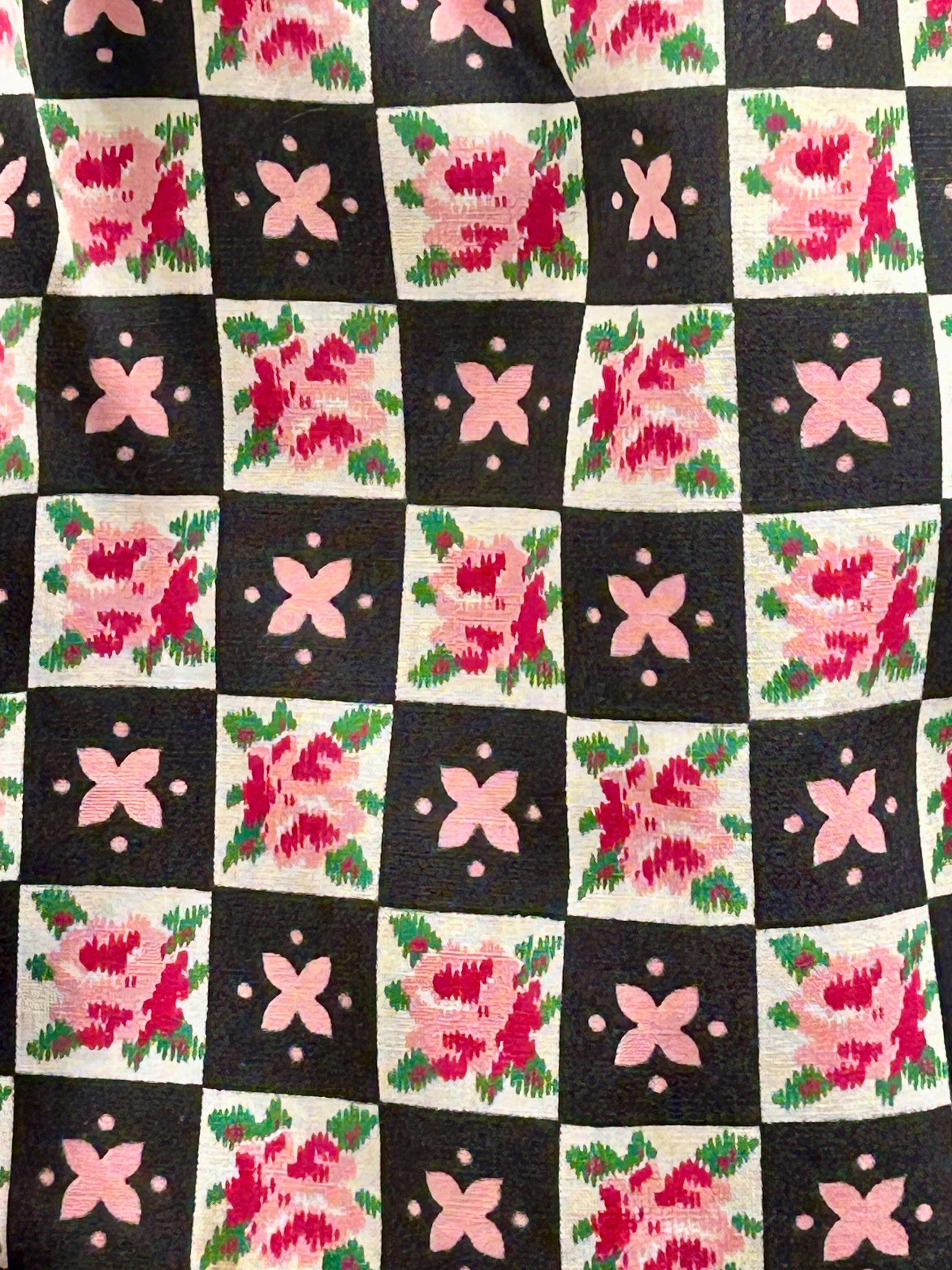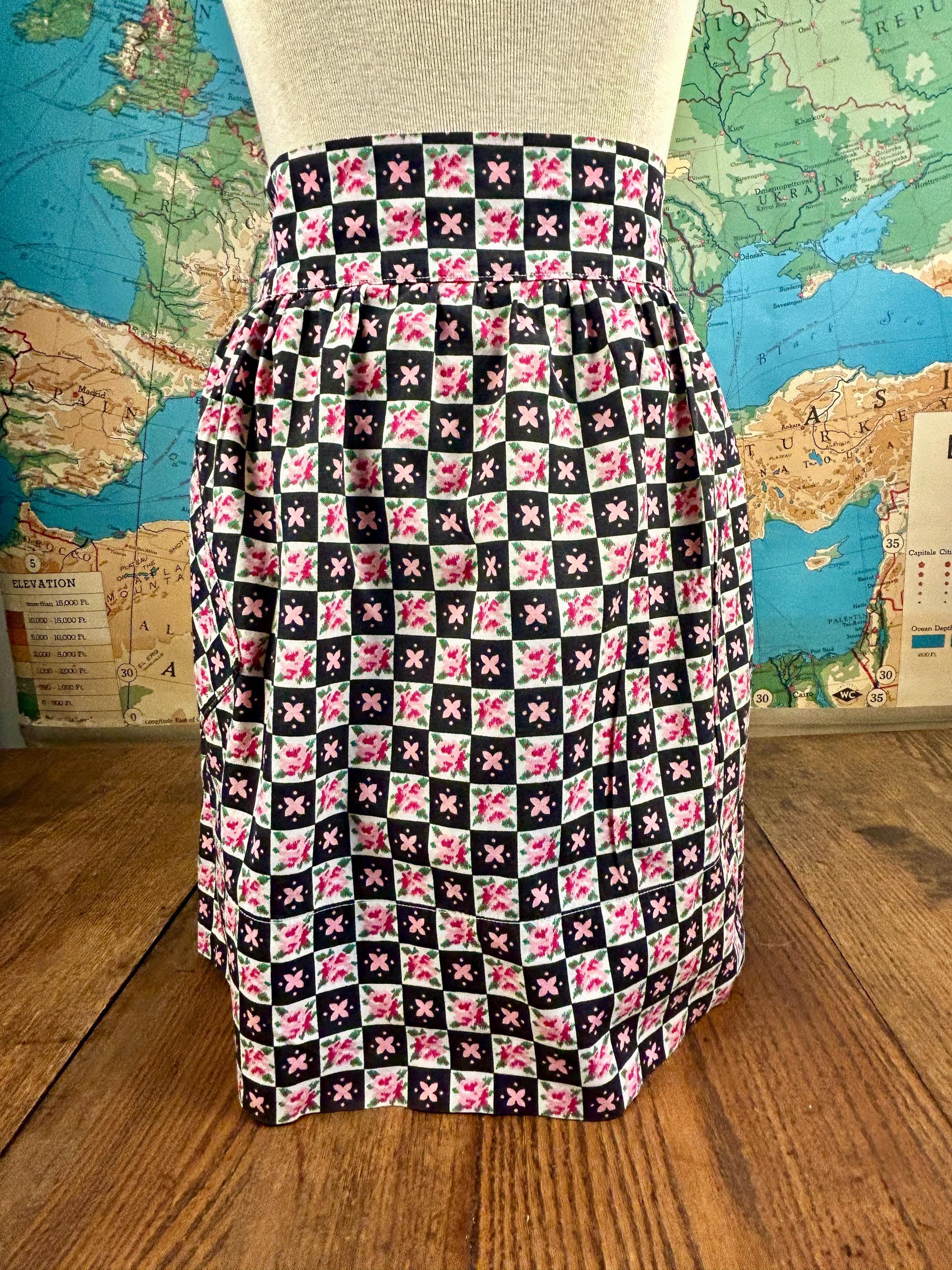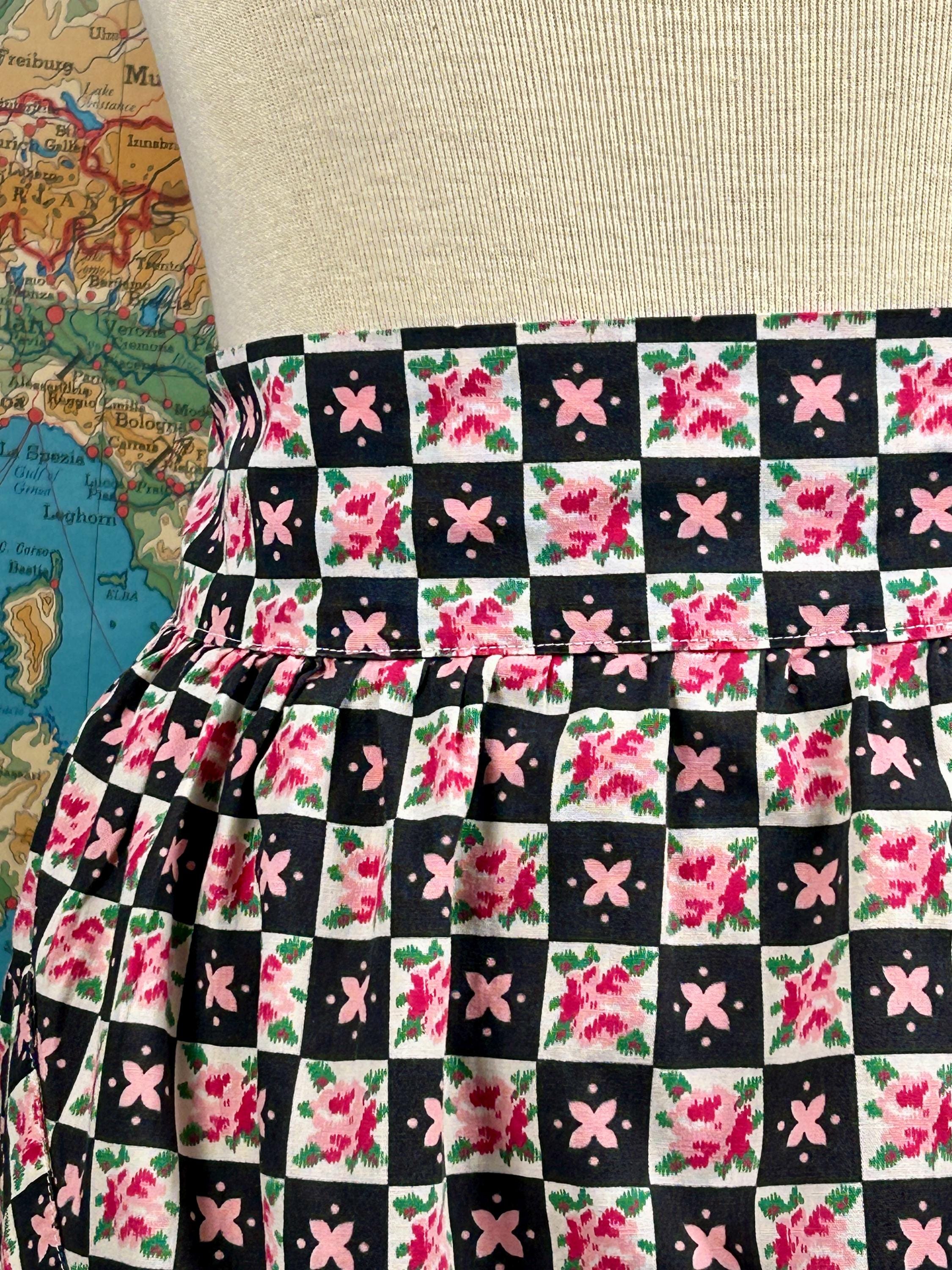 Embrace cottagecore charm with this festive cotton apron! Featuring a delightful floral black design in pinks, reds, greens, whites, and black. This apron combines nostalgia with practicality, making it an ideal gift or personal treat for those who adore vintage vibes. Elevate your look today with this whimsical piece! A slanted patch pocket adorns one side along with a wide waistband and gathered skirt.