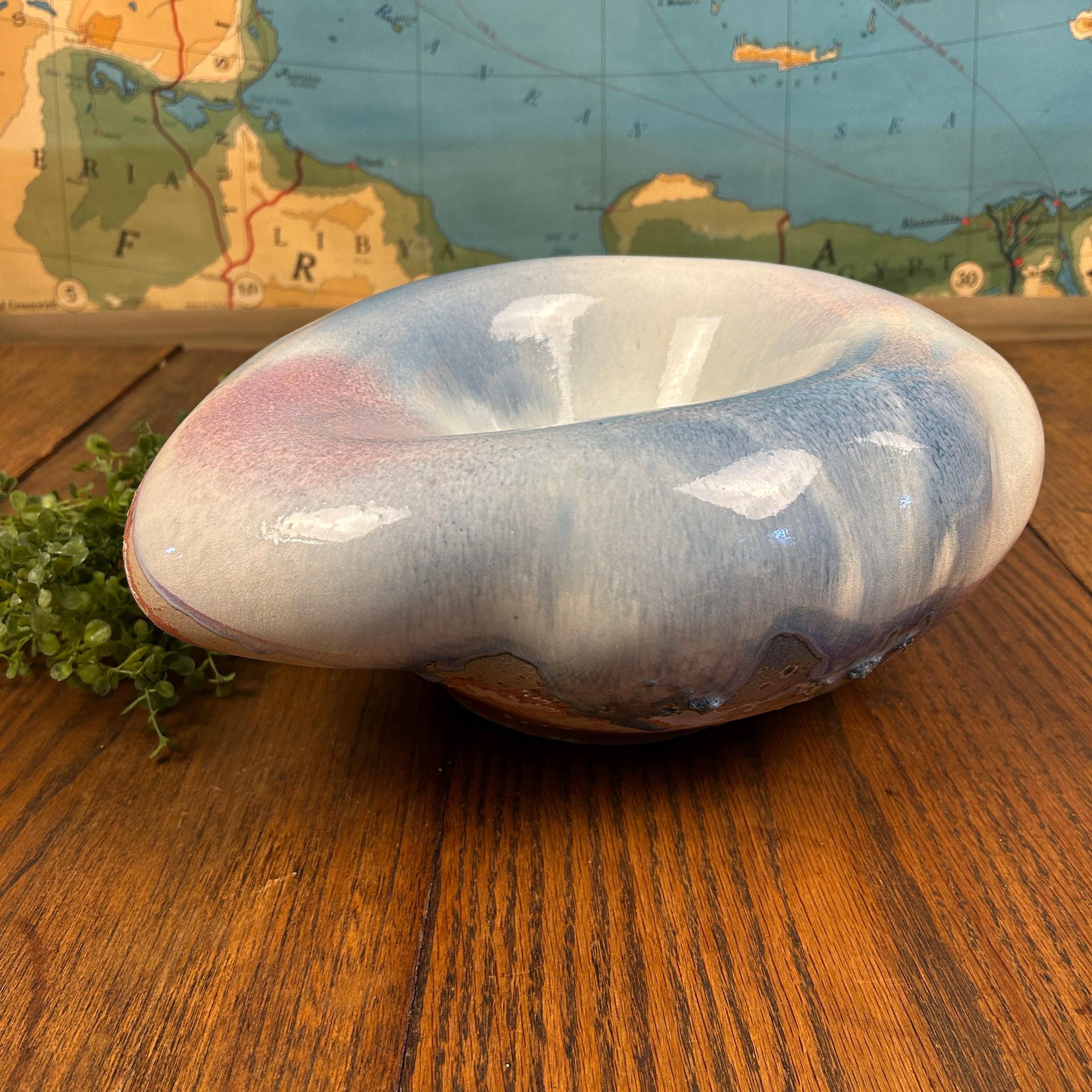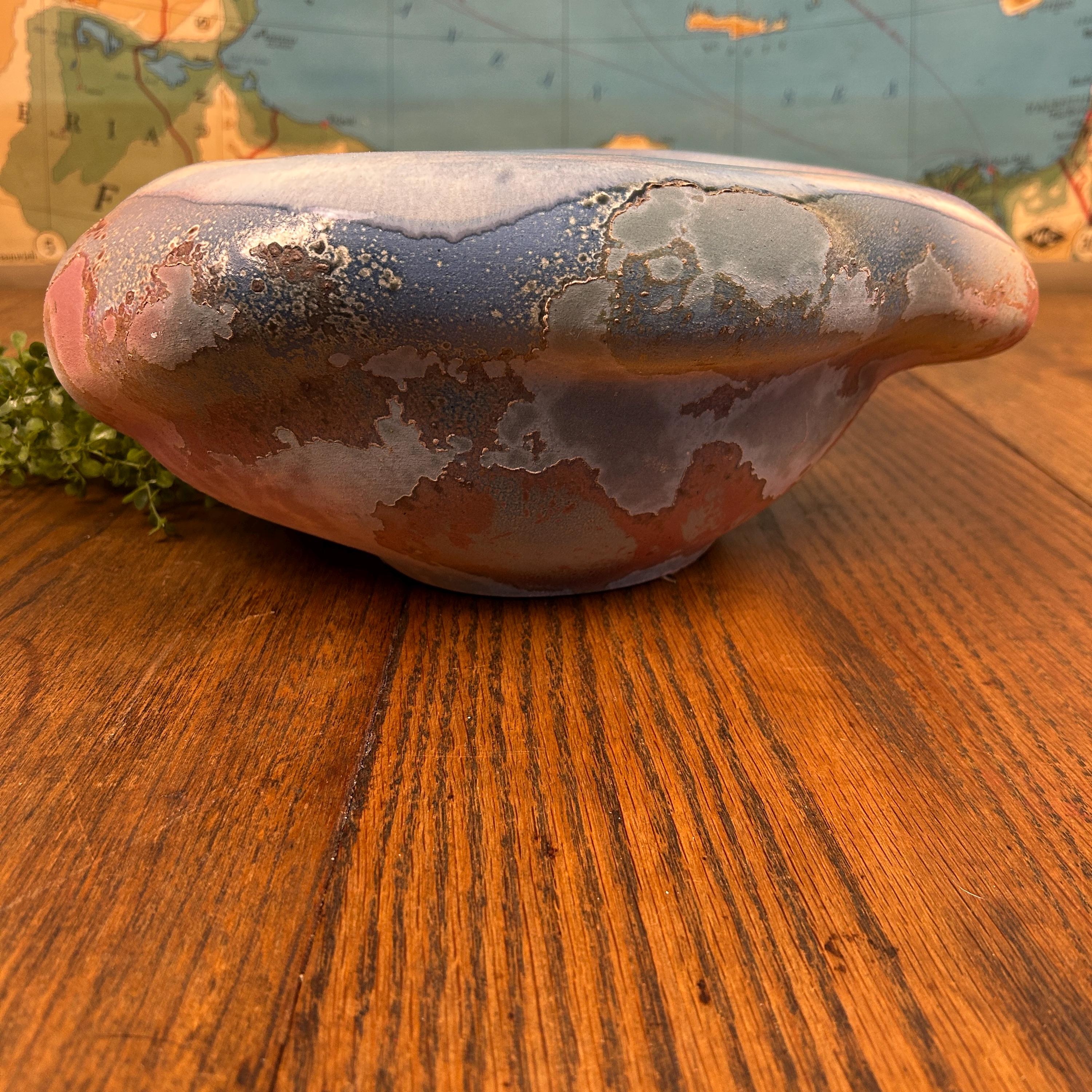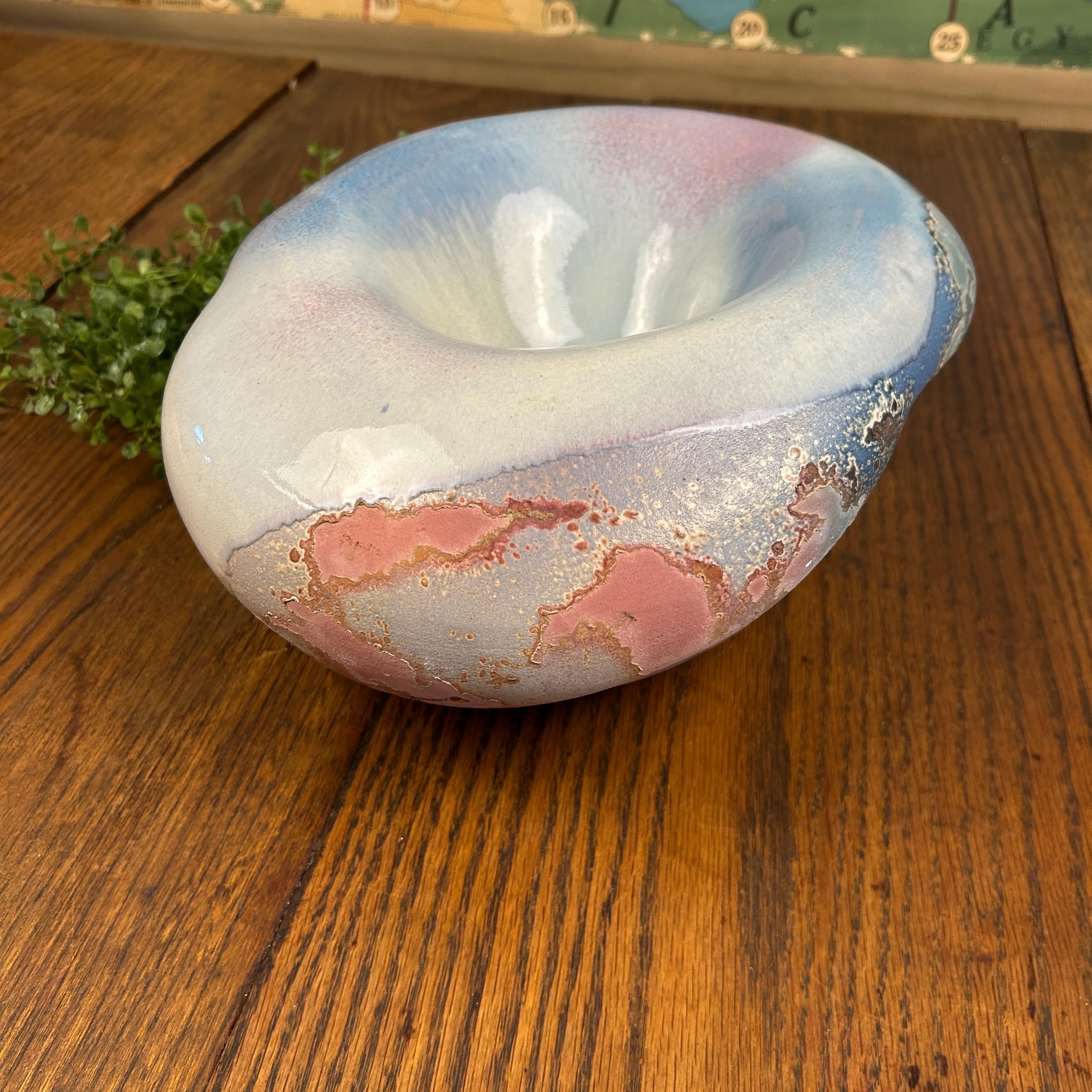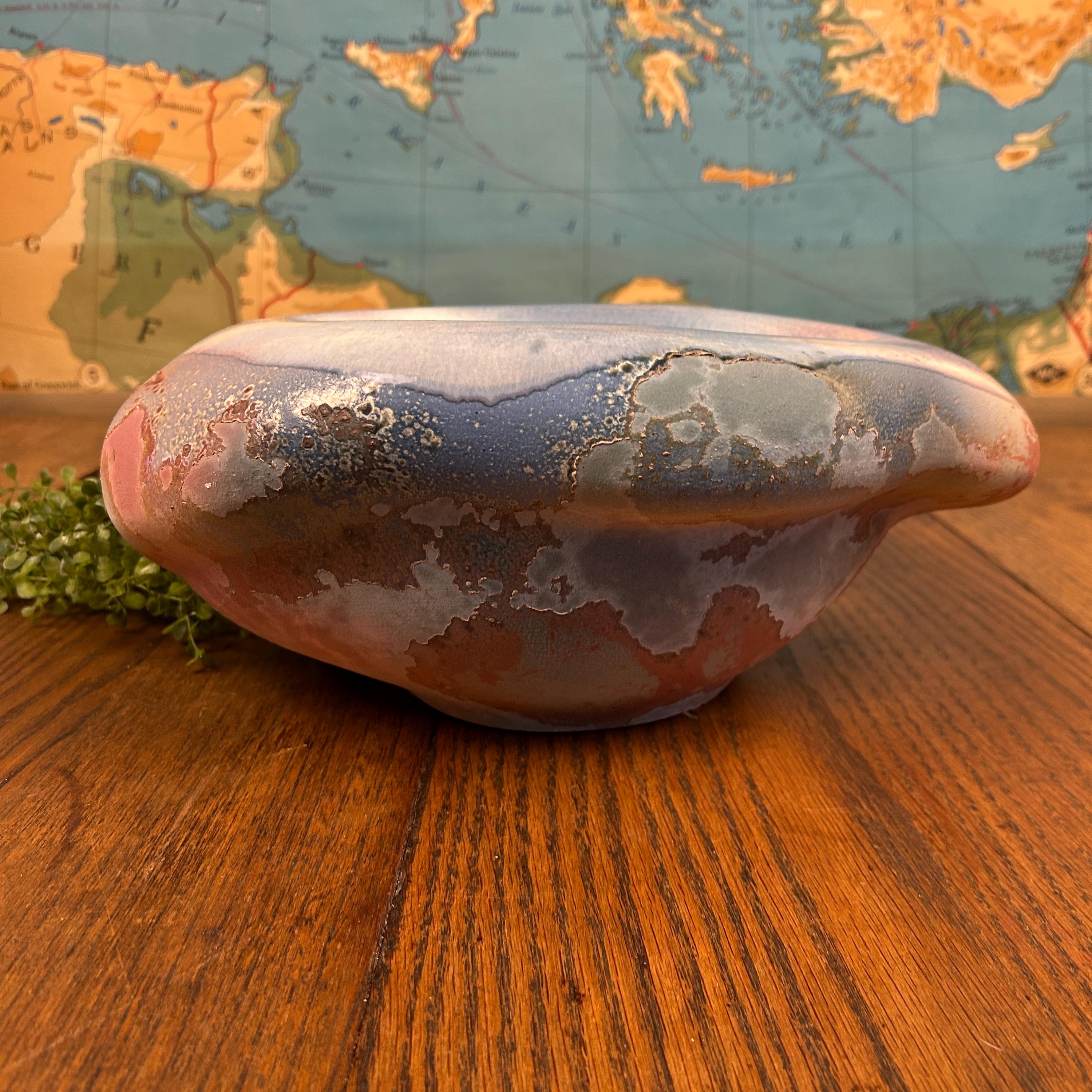 Discover the allure of this large oval abstract handmade bowl, showcasing stunning faded shades of blues and reds accented with a unique Raku glaze. This pottery bowl sculpture embodies a captivating blend of art and functionality, perfect for elevating your home decor. While unsigned, its style resonates with the work of Tony Evans. Embrace the beauty of handcrafted artistry with this one-of-a-kind piece that will be a standout addition to any collection or centerpiece display! Areas of the sculpture/bowl appear cracked or mis-fired, but this is the essense of Raku pottery. It appears that was something attached to the bottom, as in felt or a base. This, however, does not affect the beauty or functionality of this quirky one-of-a-kind creation.