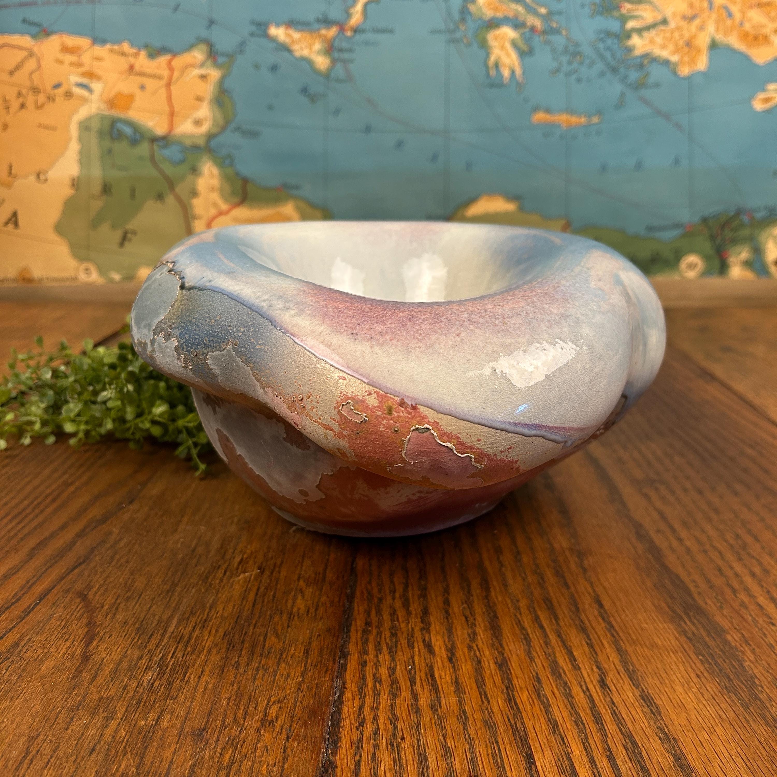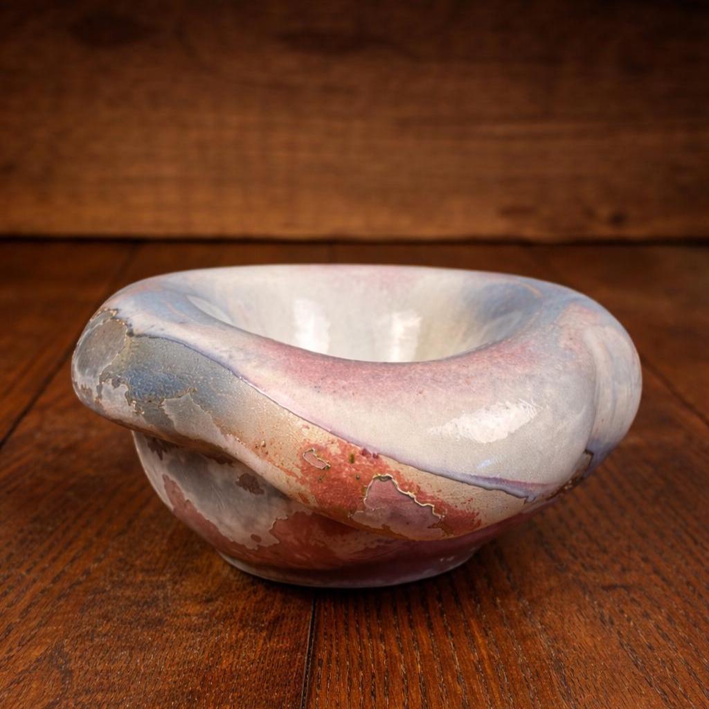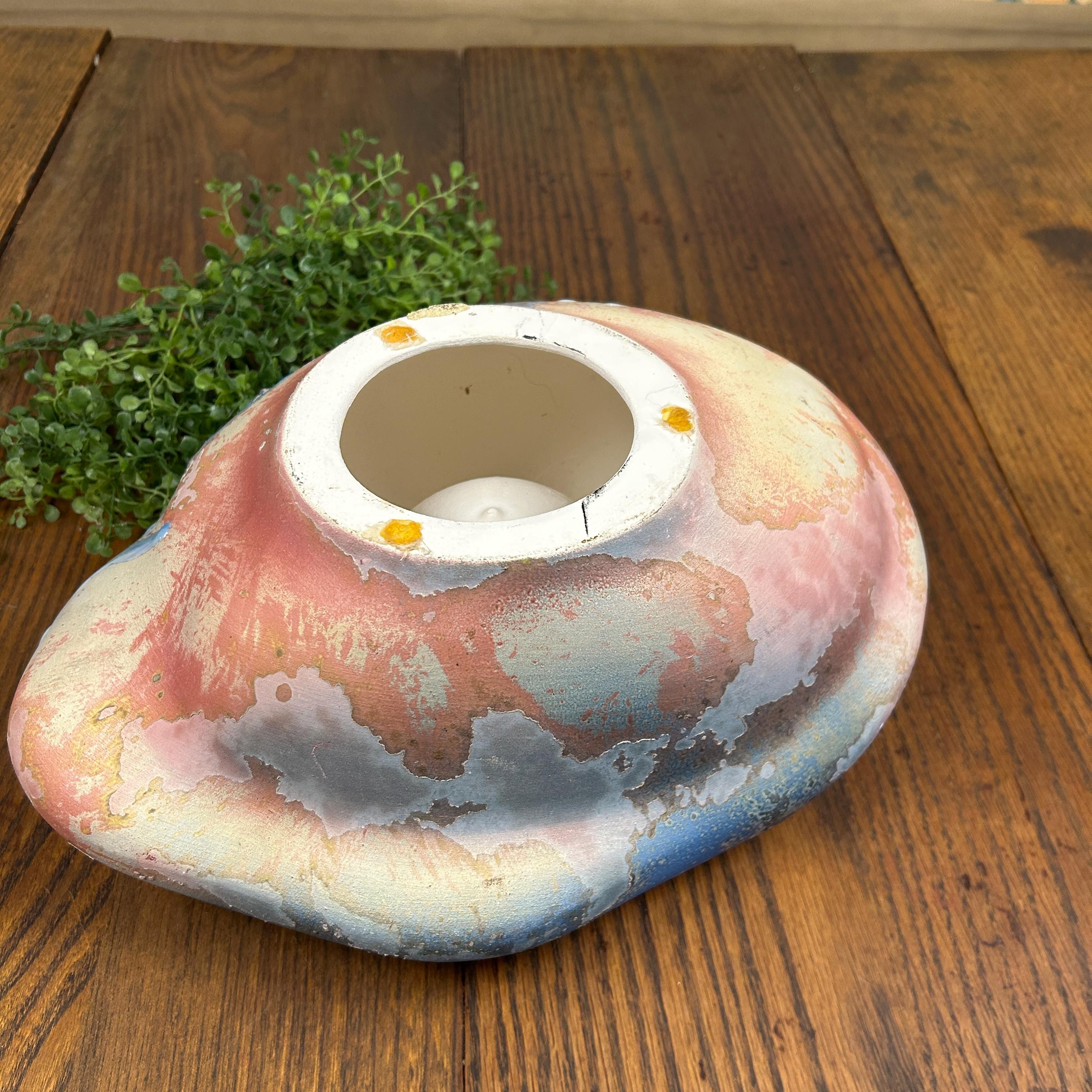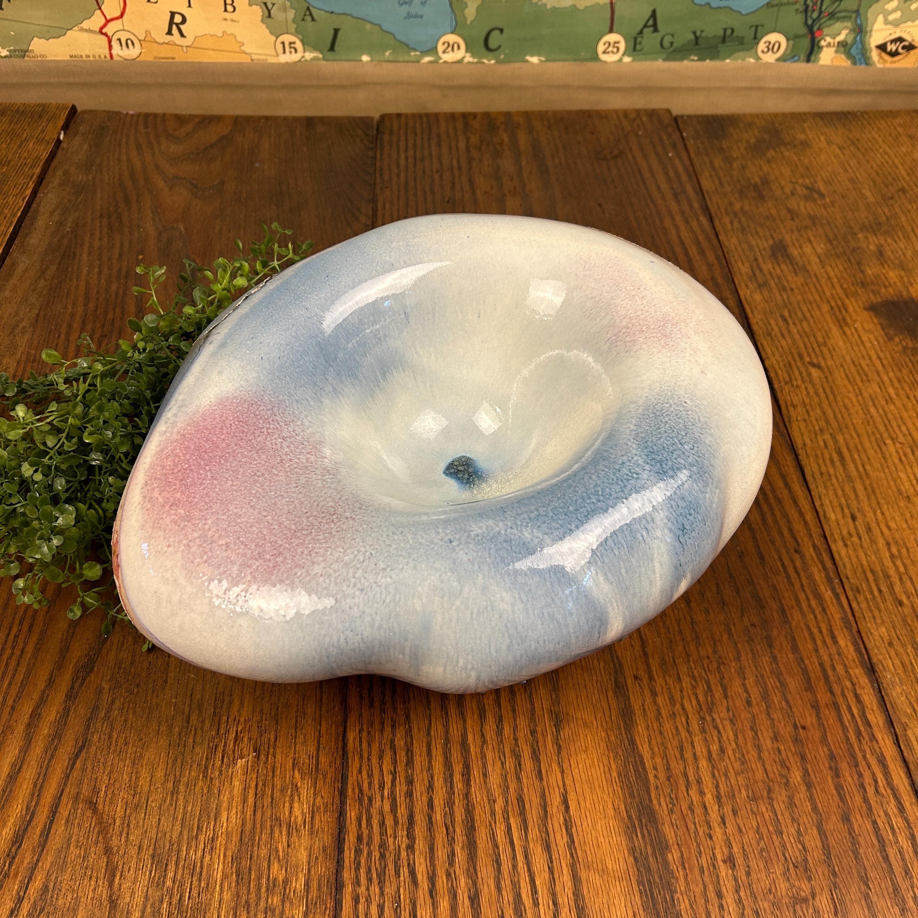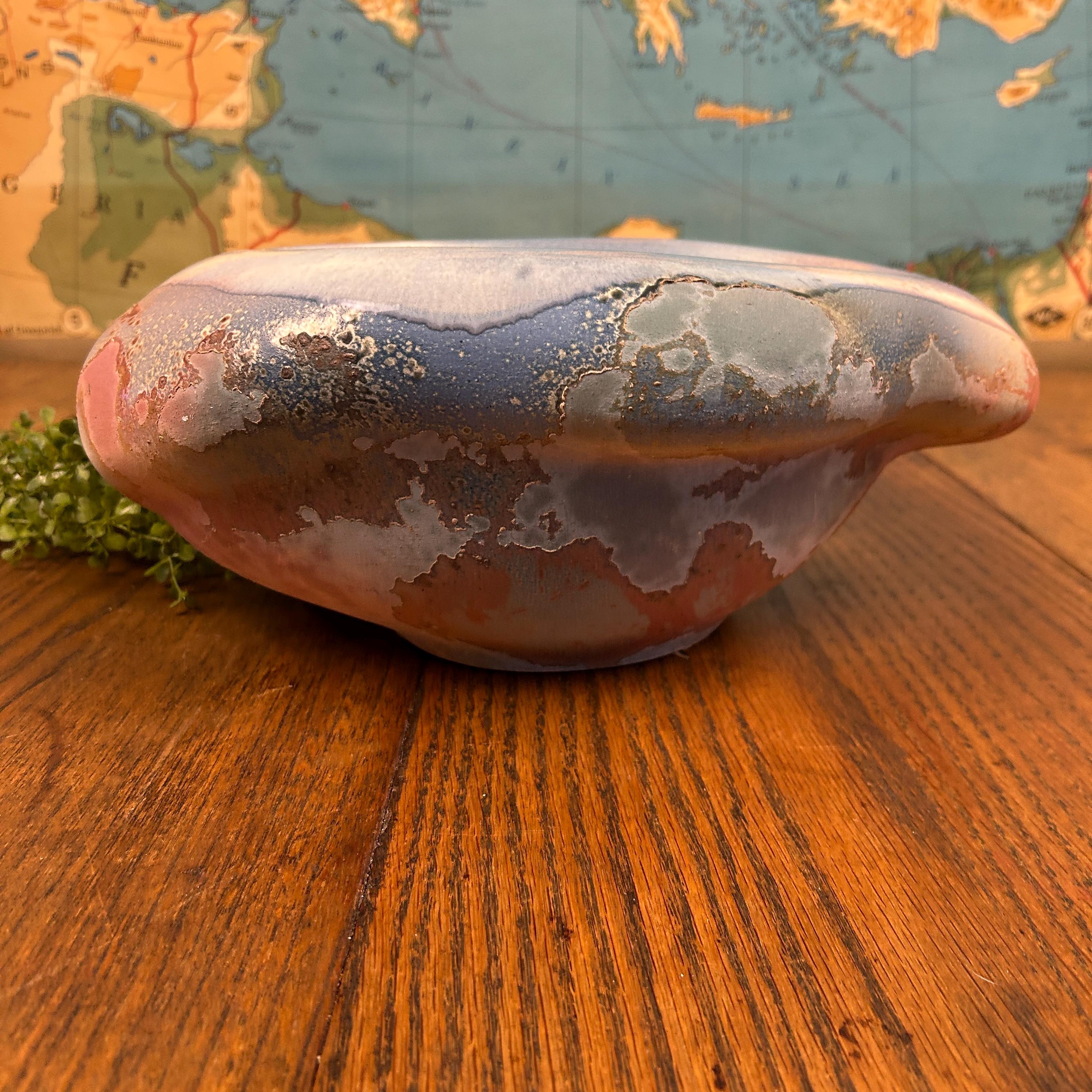 Discover the allure of this large oval abstract handmade bowl, showcasing stunning faded shades of blues and reds accented with a unique Raku glaze. This pottery bowl sculpture embodies a captivating blend of art and functionality, perfect for elevating your home decor. While unsigned, its style resonates with the work of Tony Evans. Embrace the beauty of handcrafted artistry with this one-of-a-kind piece that will be a standout addition to any collection or centerpiece display! Areas of the sculpture/bowl appear cracked or mis-fired, but this is the essense of Raku pottery. It appears that was something attached to the bottom, as in felt or a base. This, however, does not affect the beauty or functionality of this quirky one-of-a-kind creation.