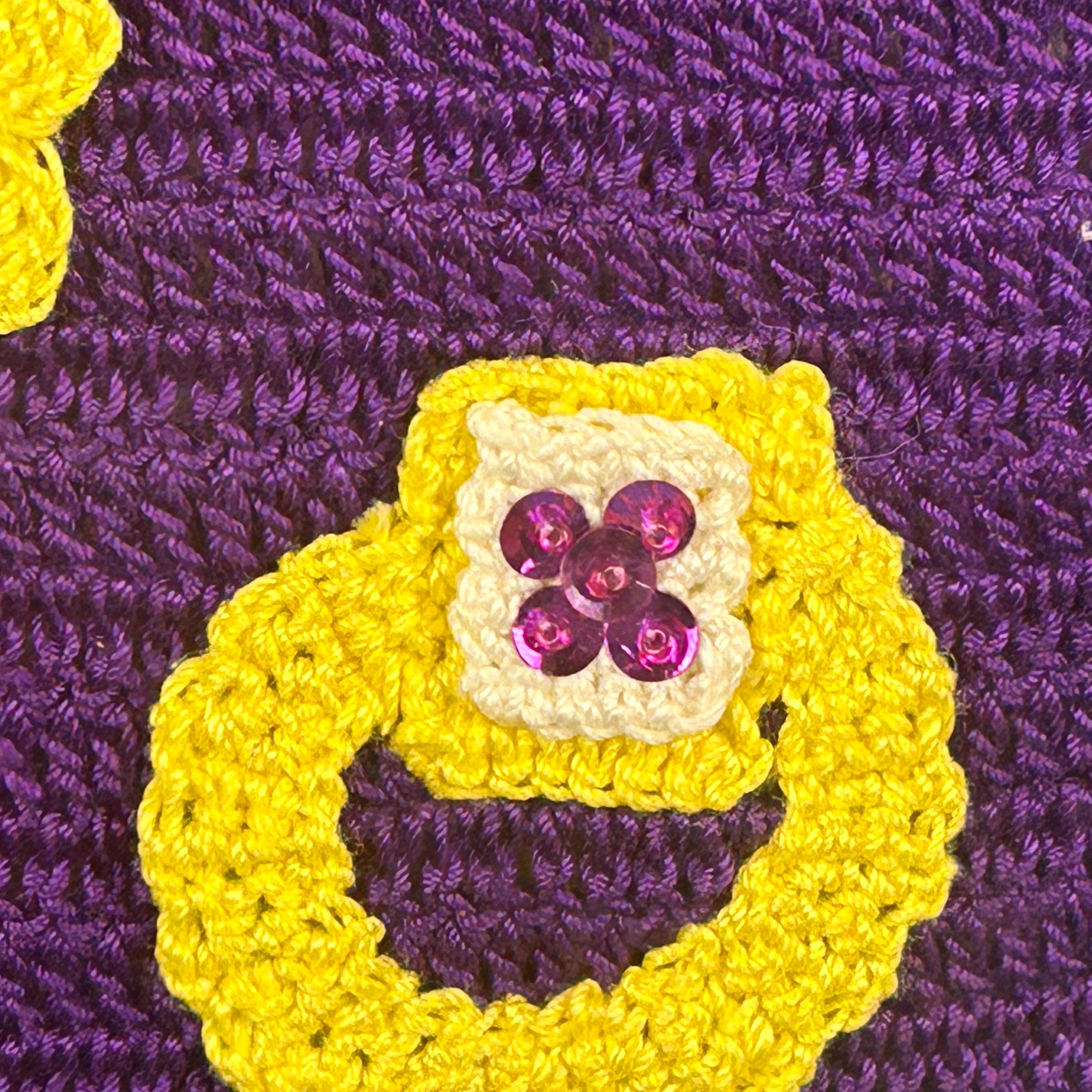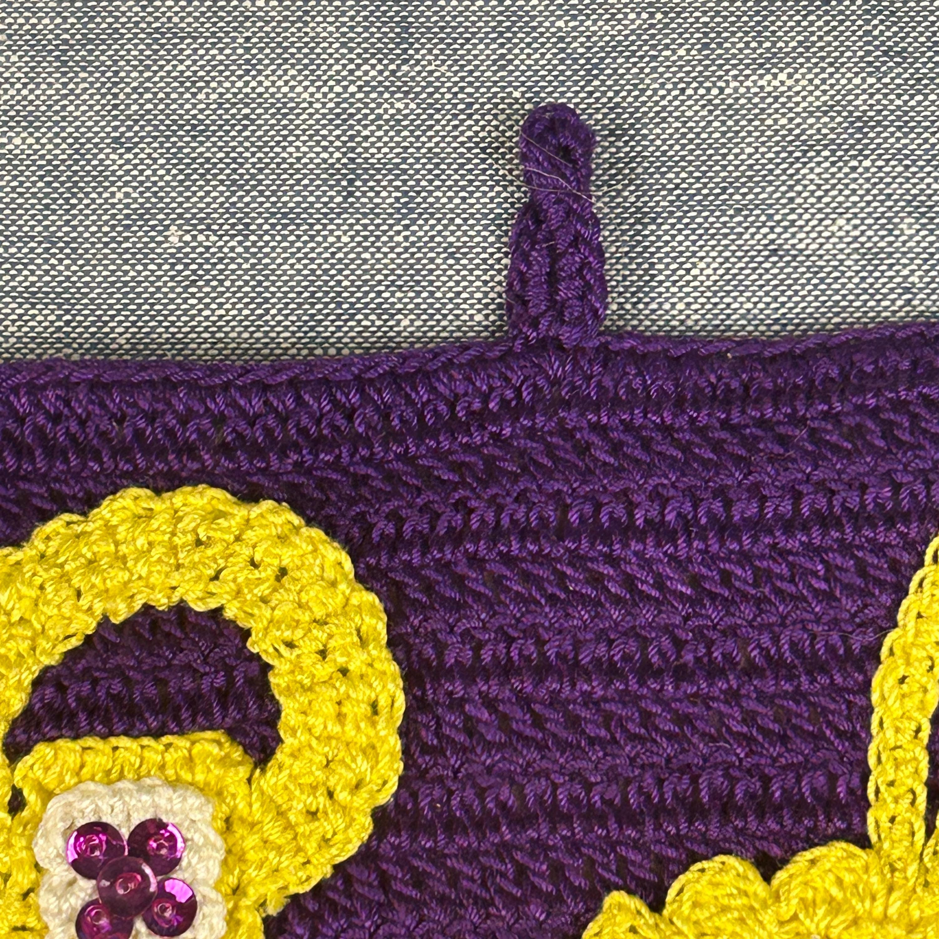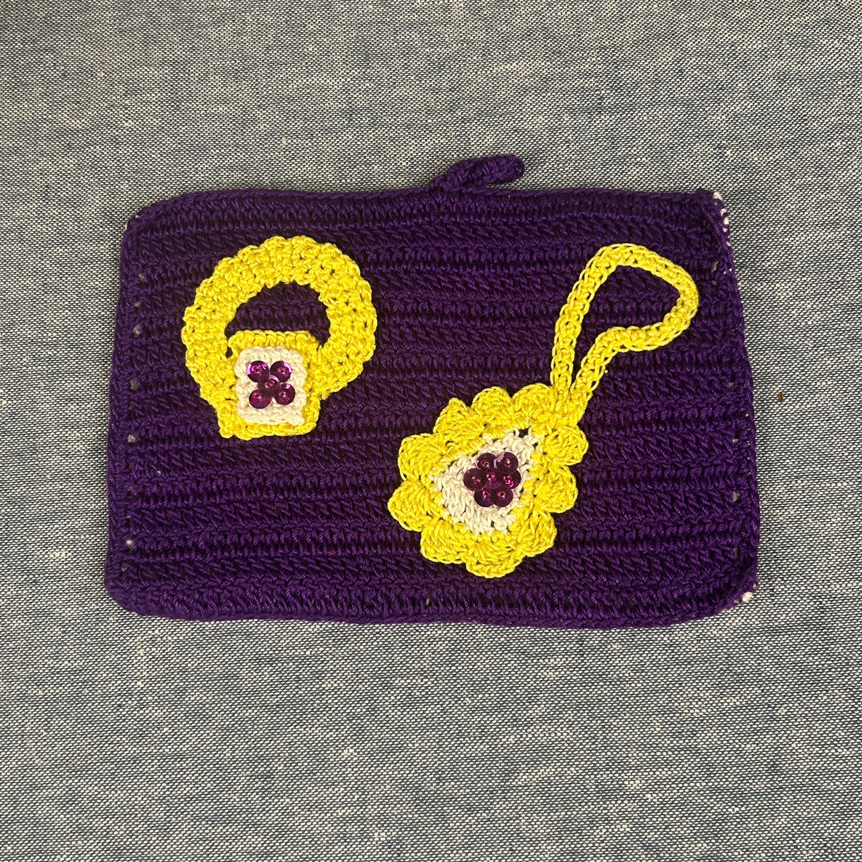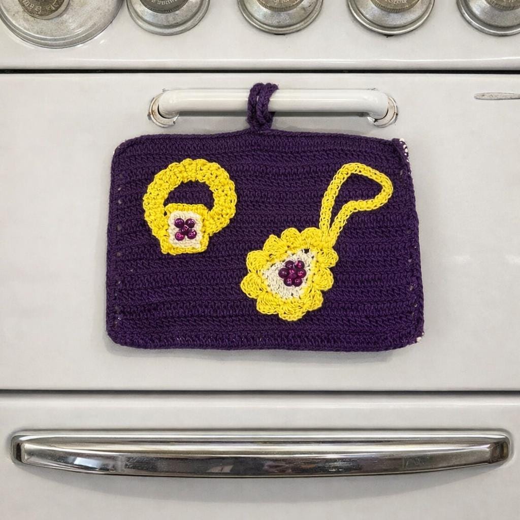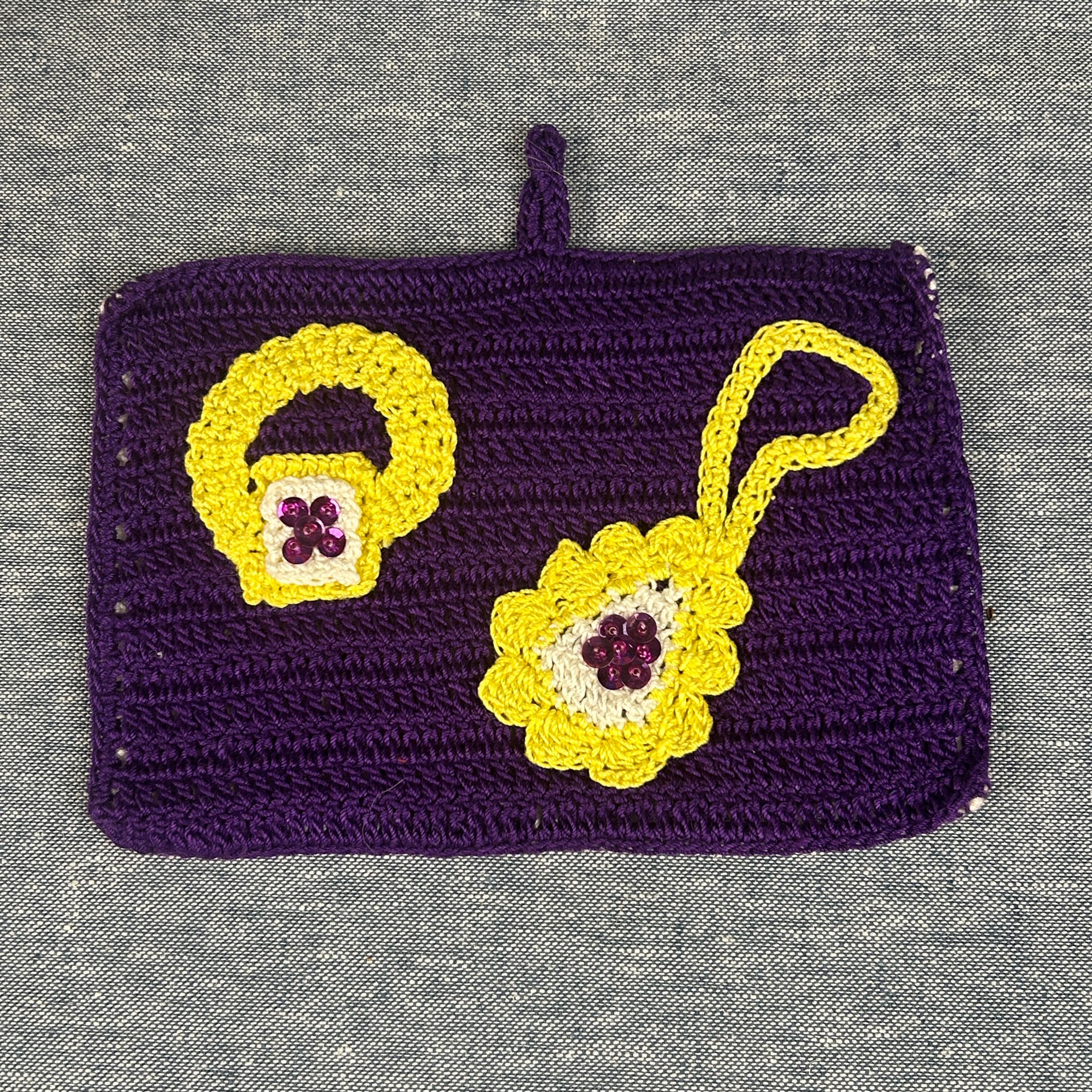 Add a touch of nostalgia to your home with this Vintage 60s Hotpad, featuring a charming "golden" ring and purse design on vibrant purple background. This kitschy crochet piece serves as both a trivet and pot holder, perfect for hot dishes or as a unique wall decor accent. The tiny seed beeds and sequins brings whimsical flair to your kitchen or dining area. Brighten your space with this delightful hot plate that’s as functional as it is fun—ideal for collectors and vintage enthusiasts alike! This came from an estate. Hook for hanging. Back is solid without a design. Maker's information is pinned to the back, dated August 13, 1966.