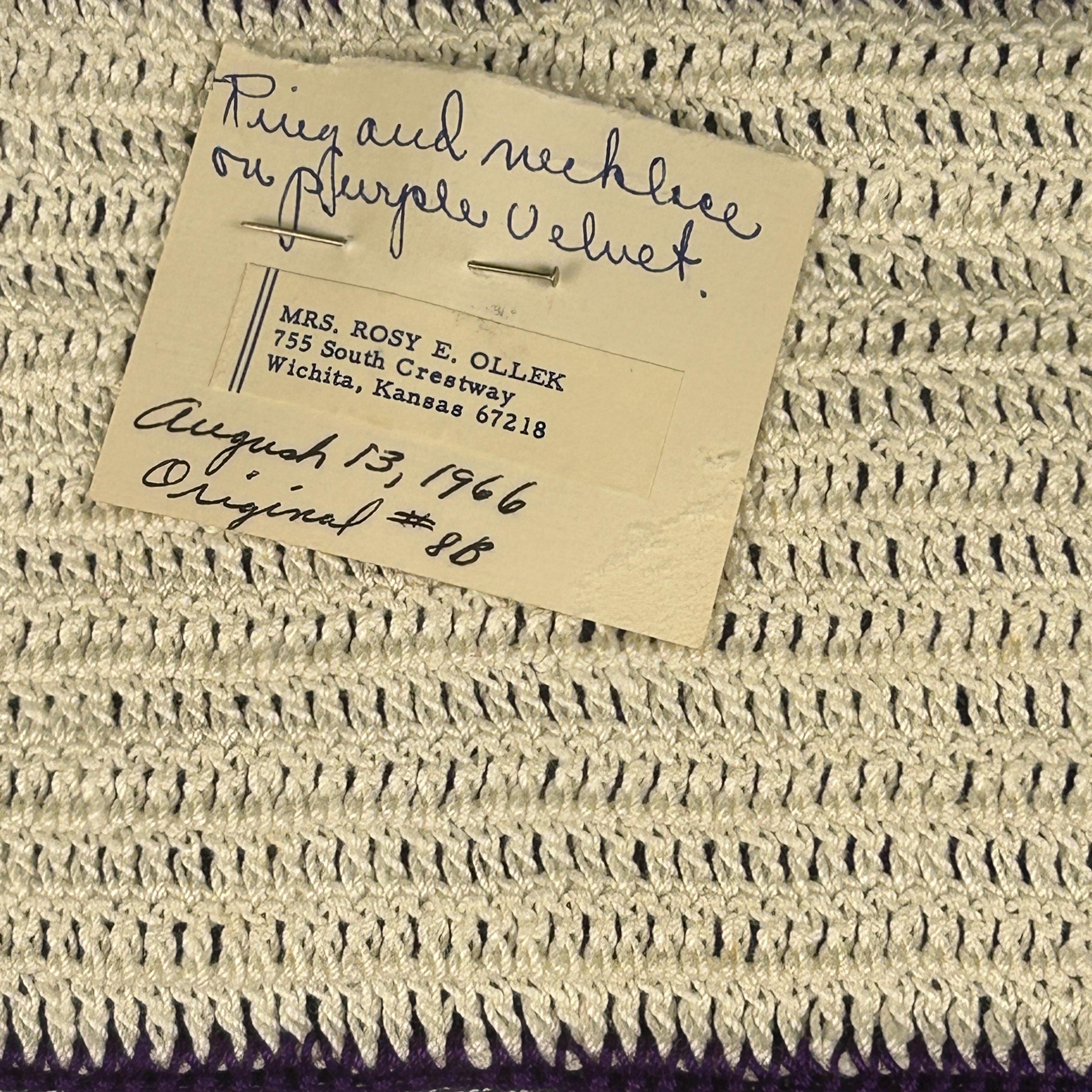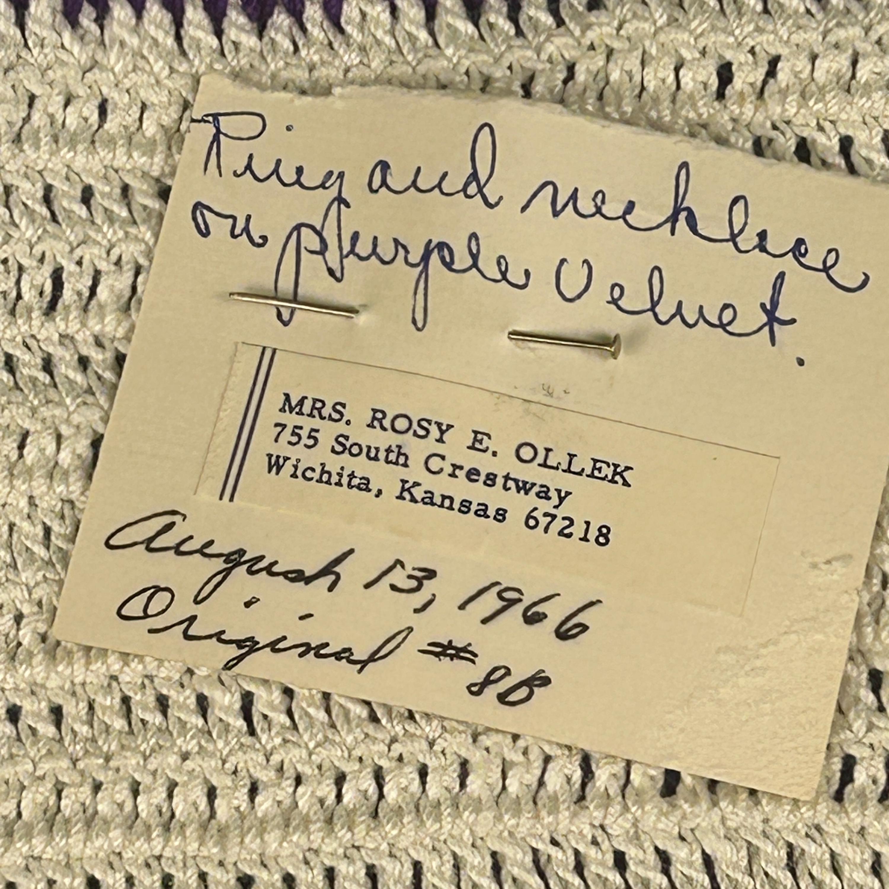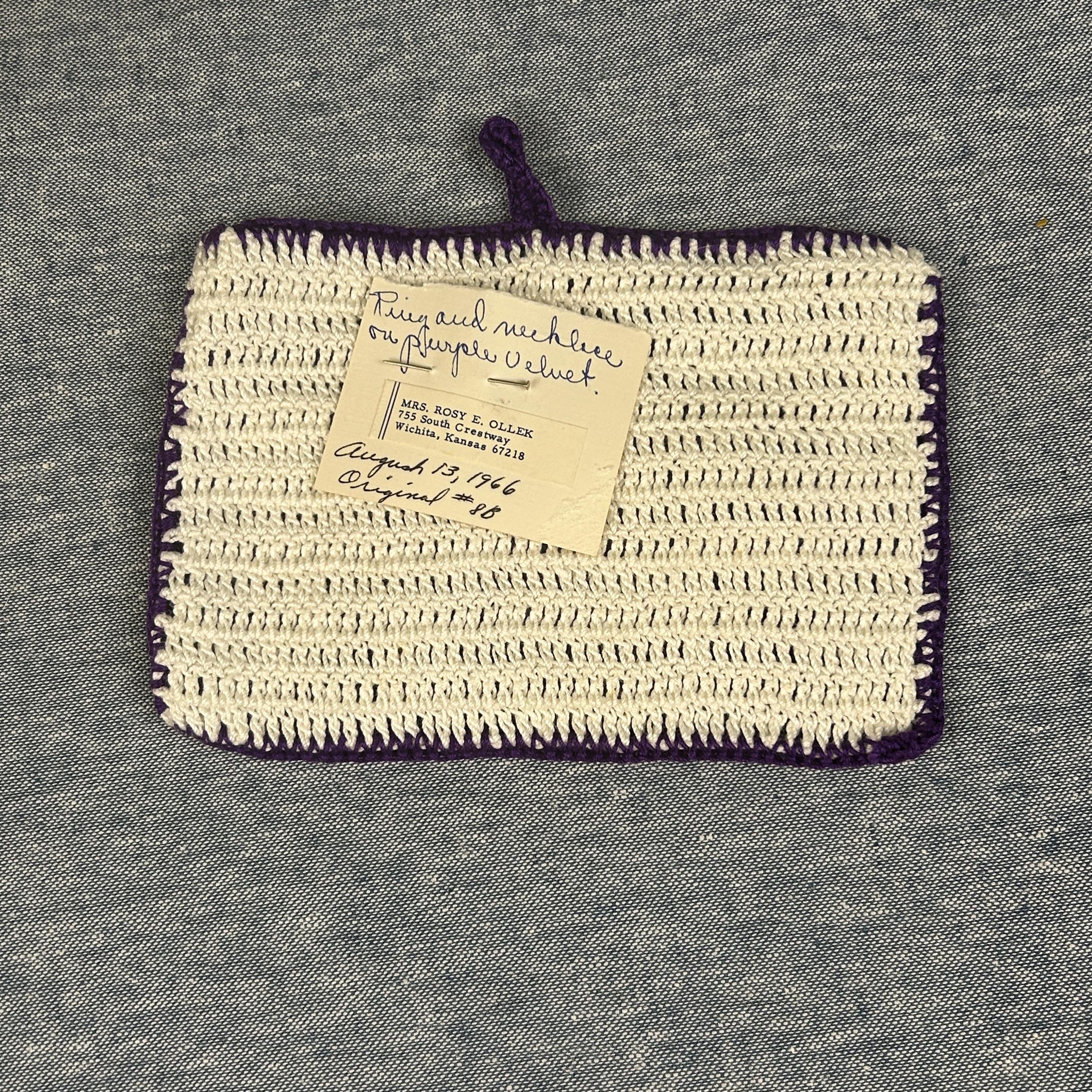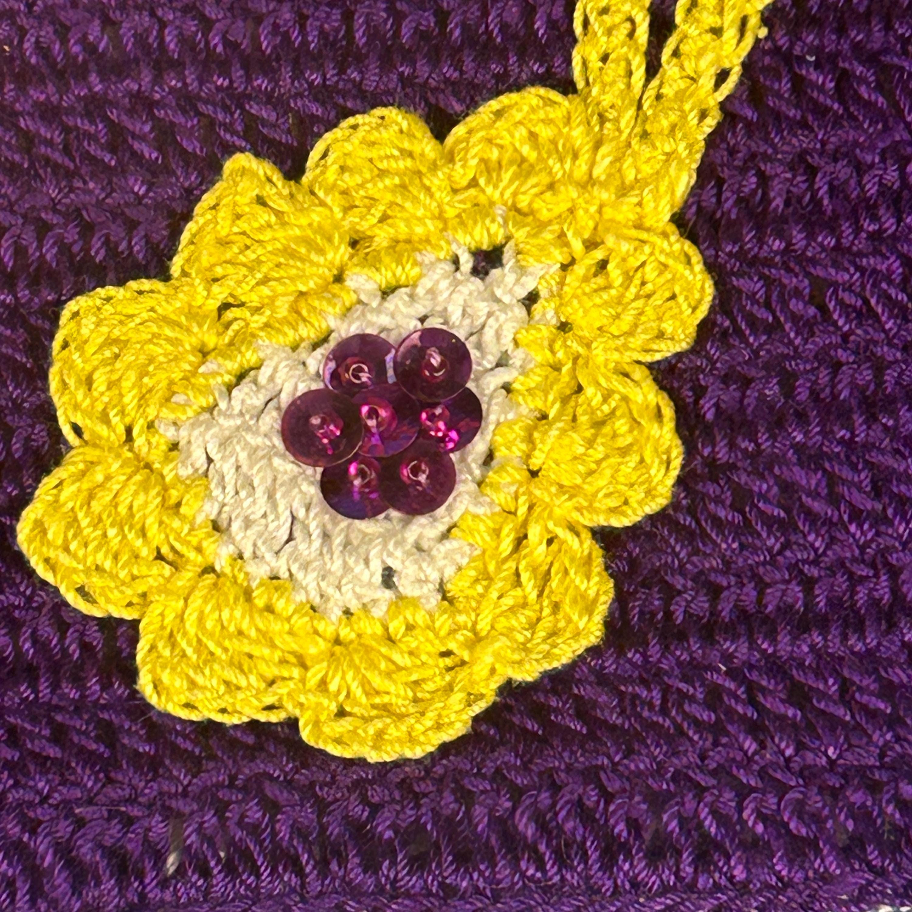 Add a touch of nostalgia to your home with this Vintage 60s Hotpad, featuring a charming "golden" ring and purse design on vibrant purple background. This kitschy crochet piece serves as both a trivet and pot holder, perfect for hot dishes or as a unique wall decor accent. The tiny seed beeds and sequins brings whimsical flair to your kitchen or dining area. Brighten your space with this delightful hot plate that’s as functional as it is fun—ideal for collectors and vintage enthusiasts alike! This came from an estate. Hook for hanging. Back is solid without a design. Maker's information is pinned to the back, dated August 13, 1966.