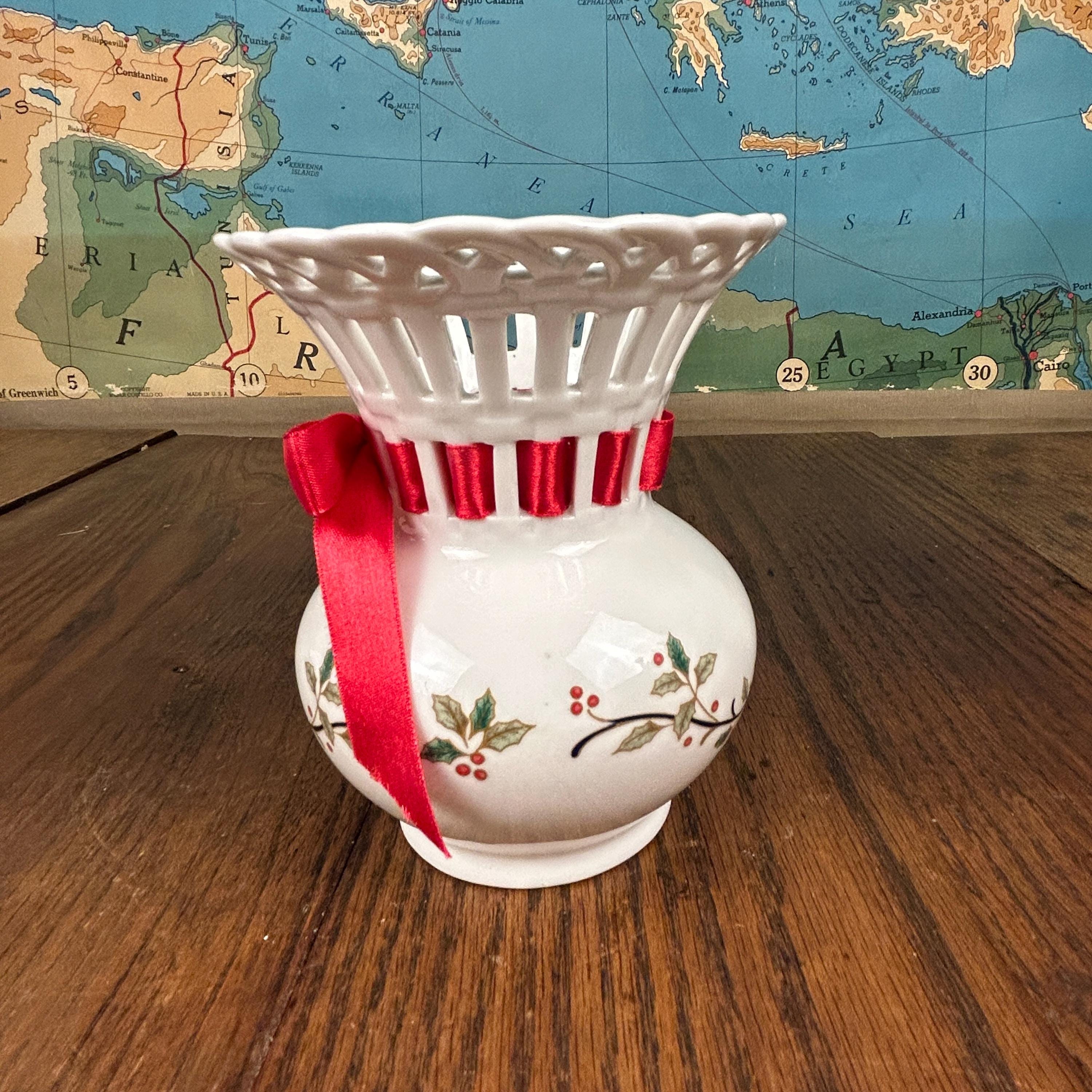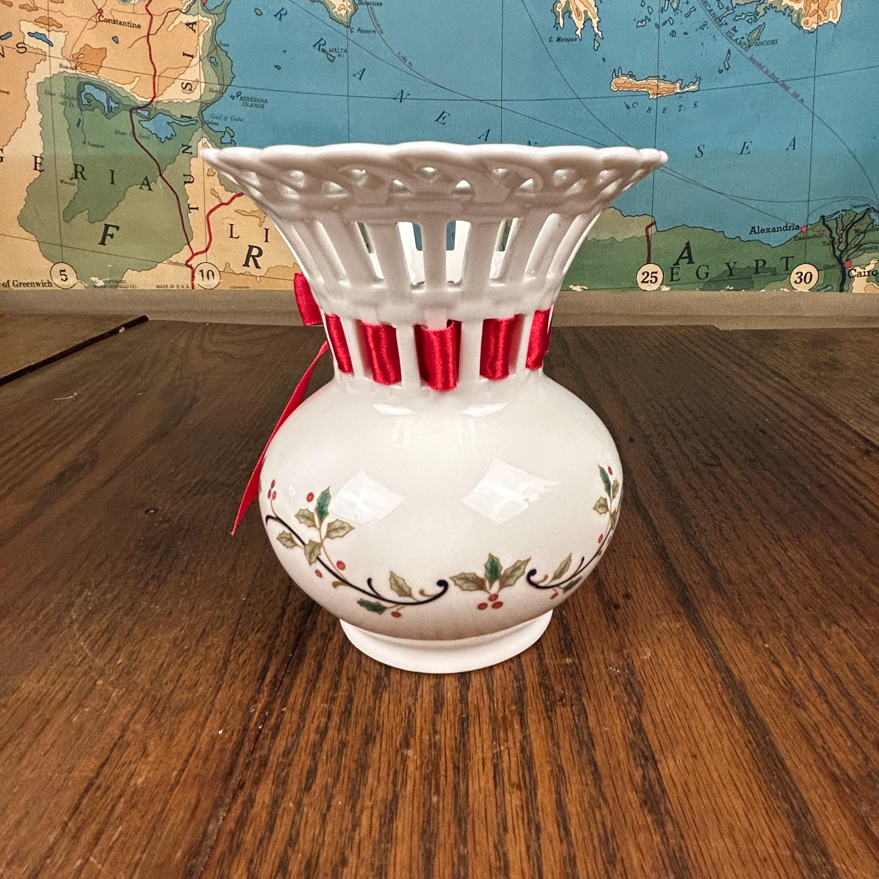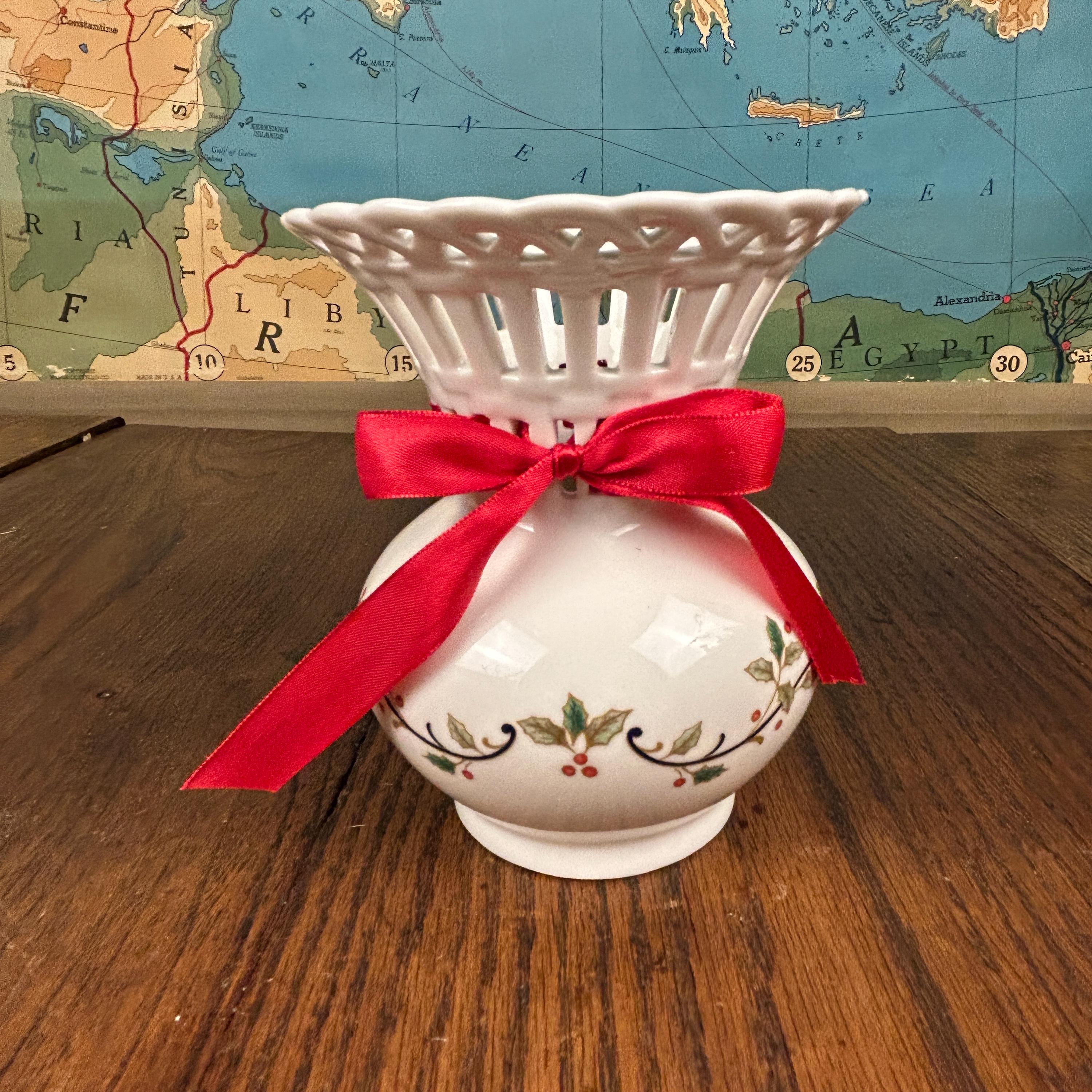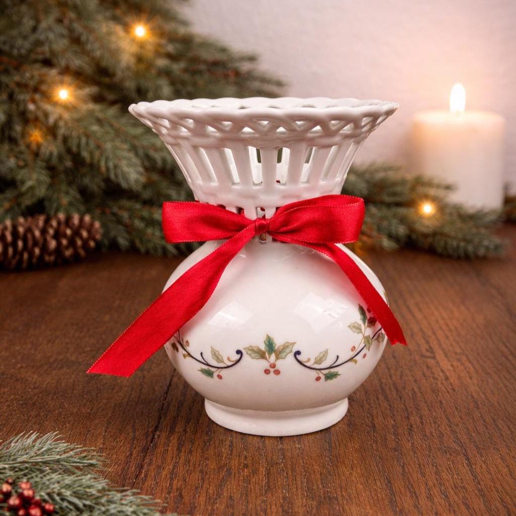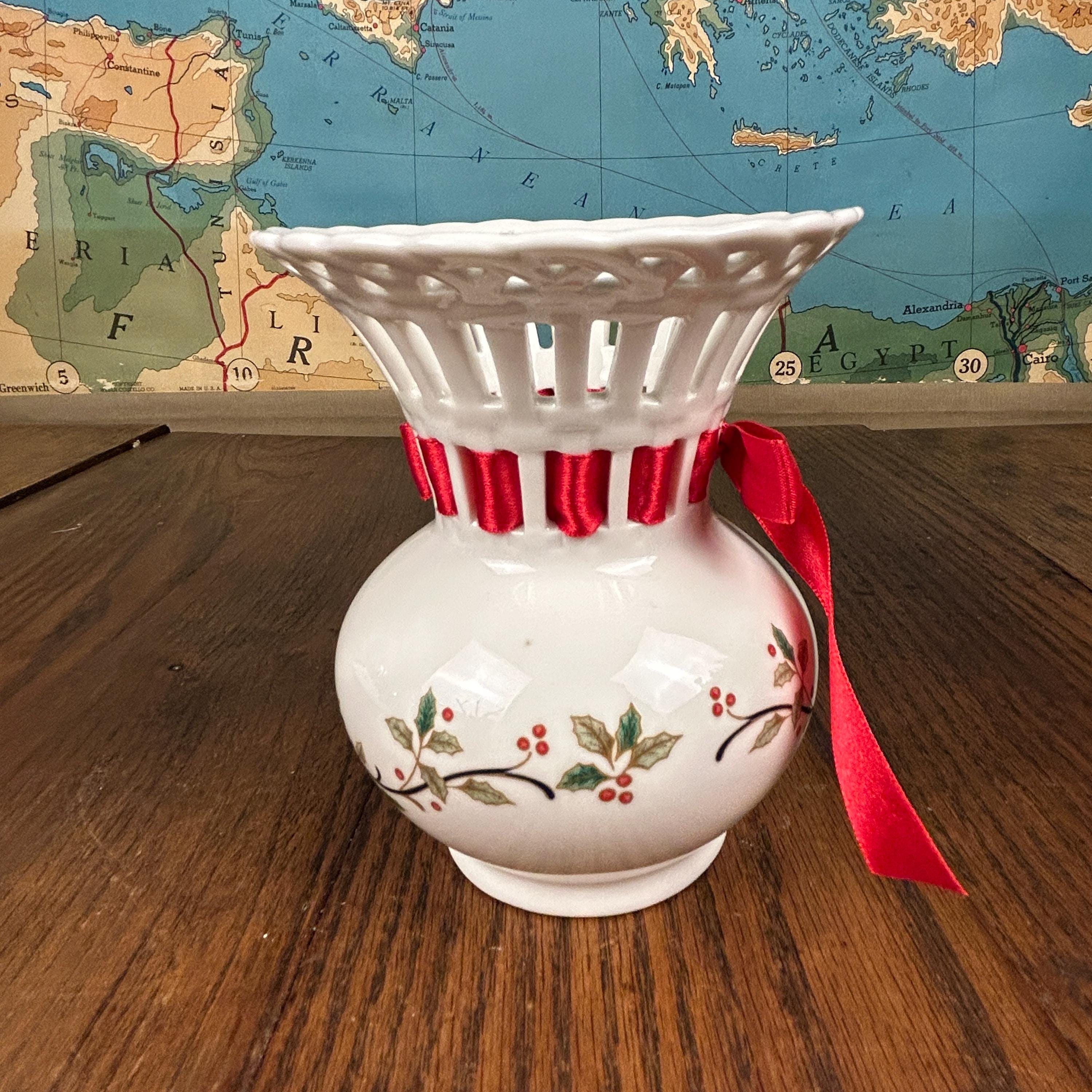 Vintage Mikasa Porcelain Christmas Holiday Lace Cut Out 6" Holly Theme Vase