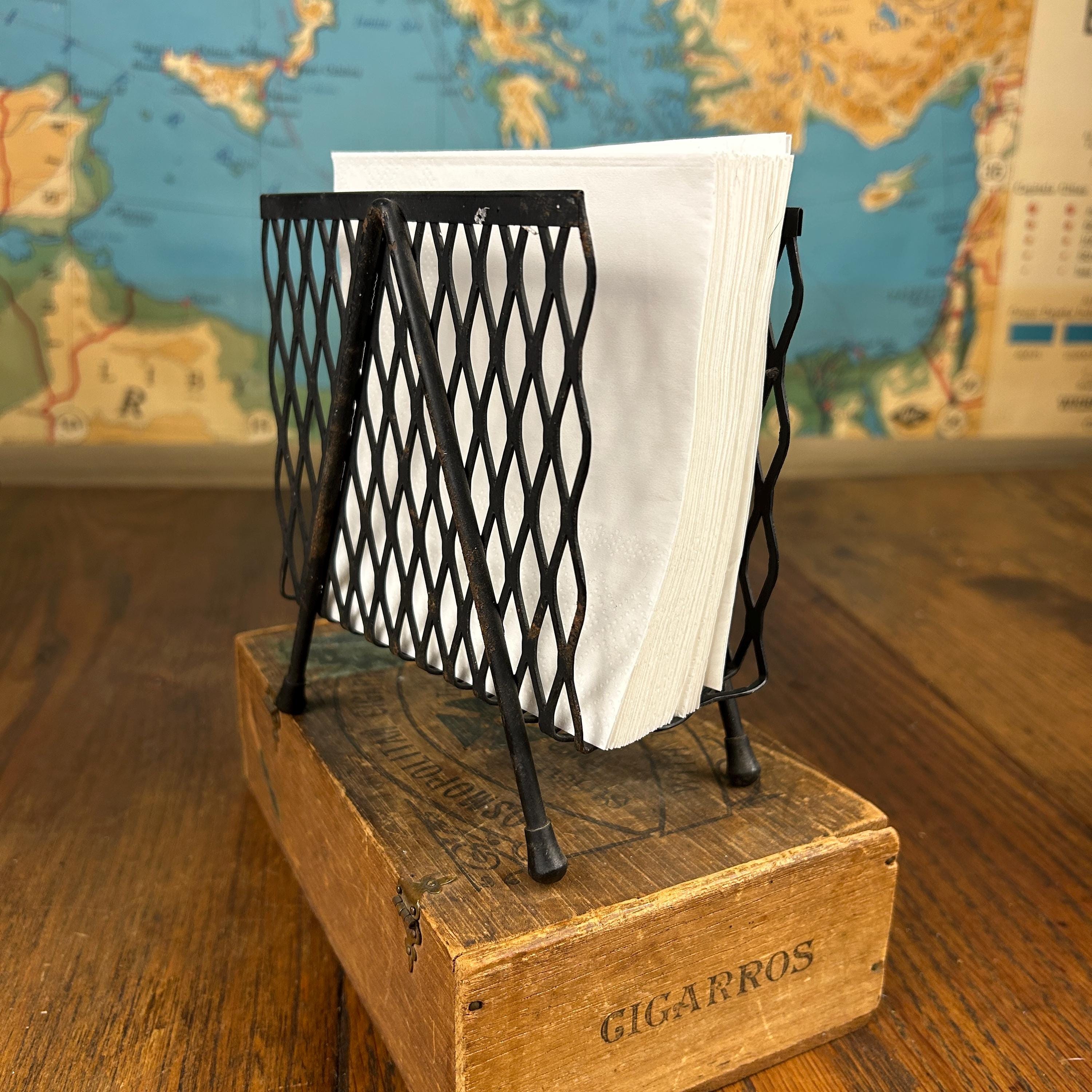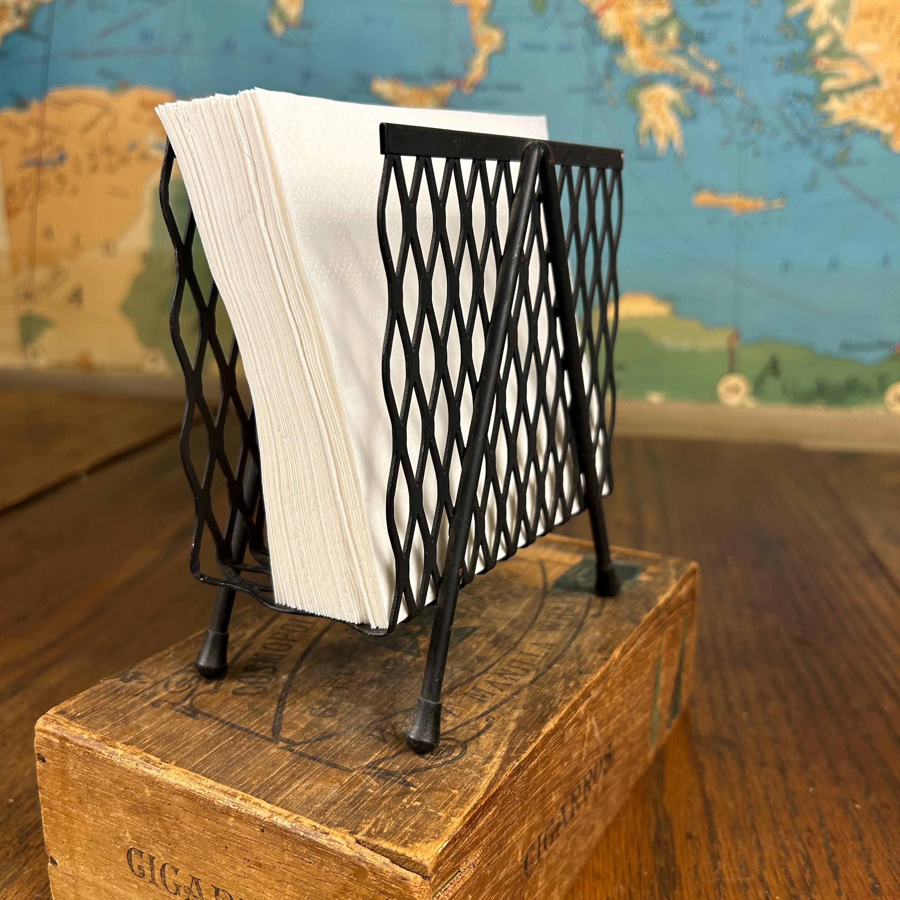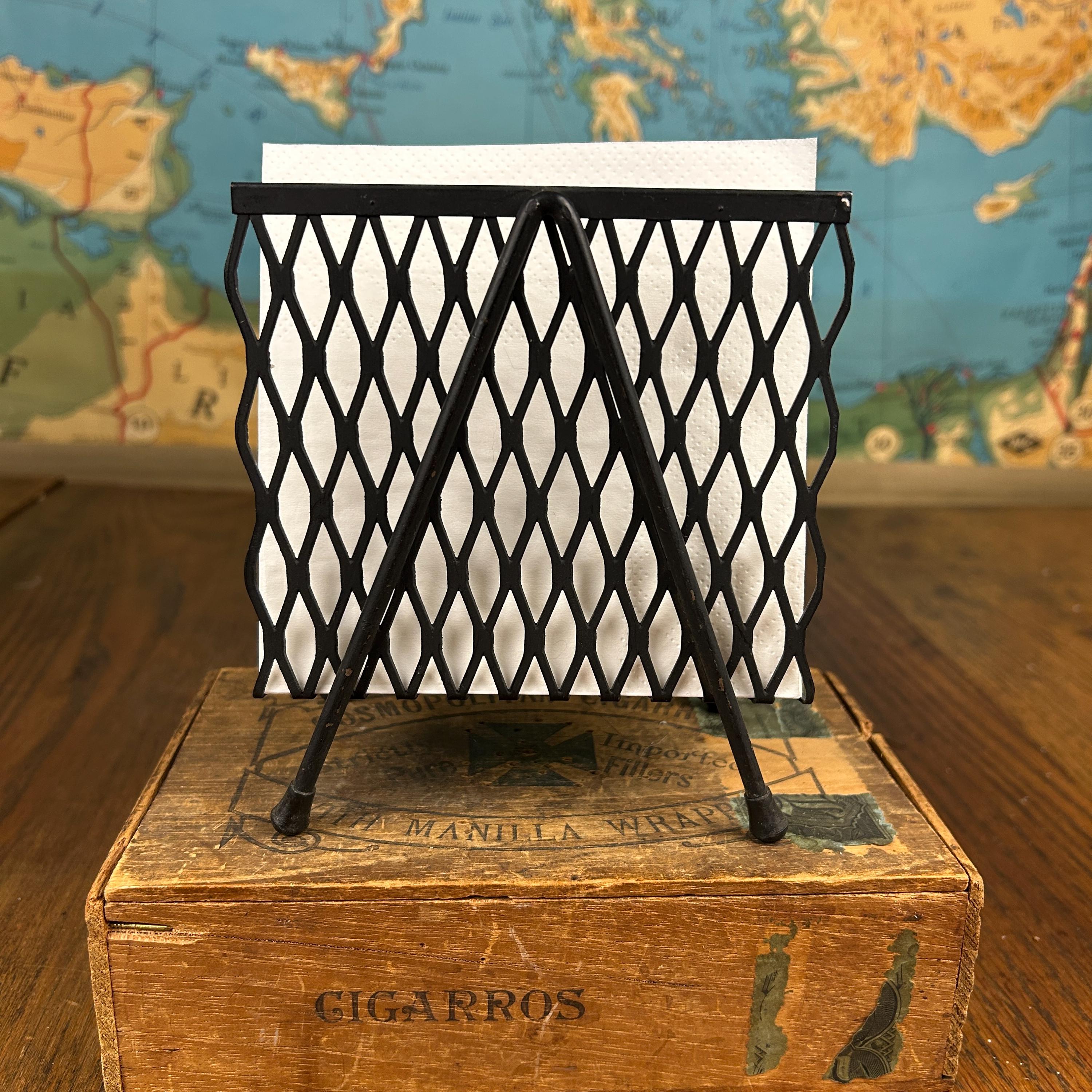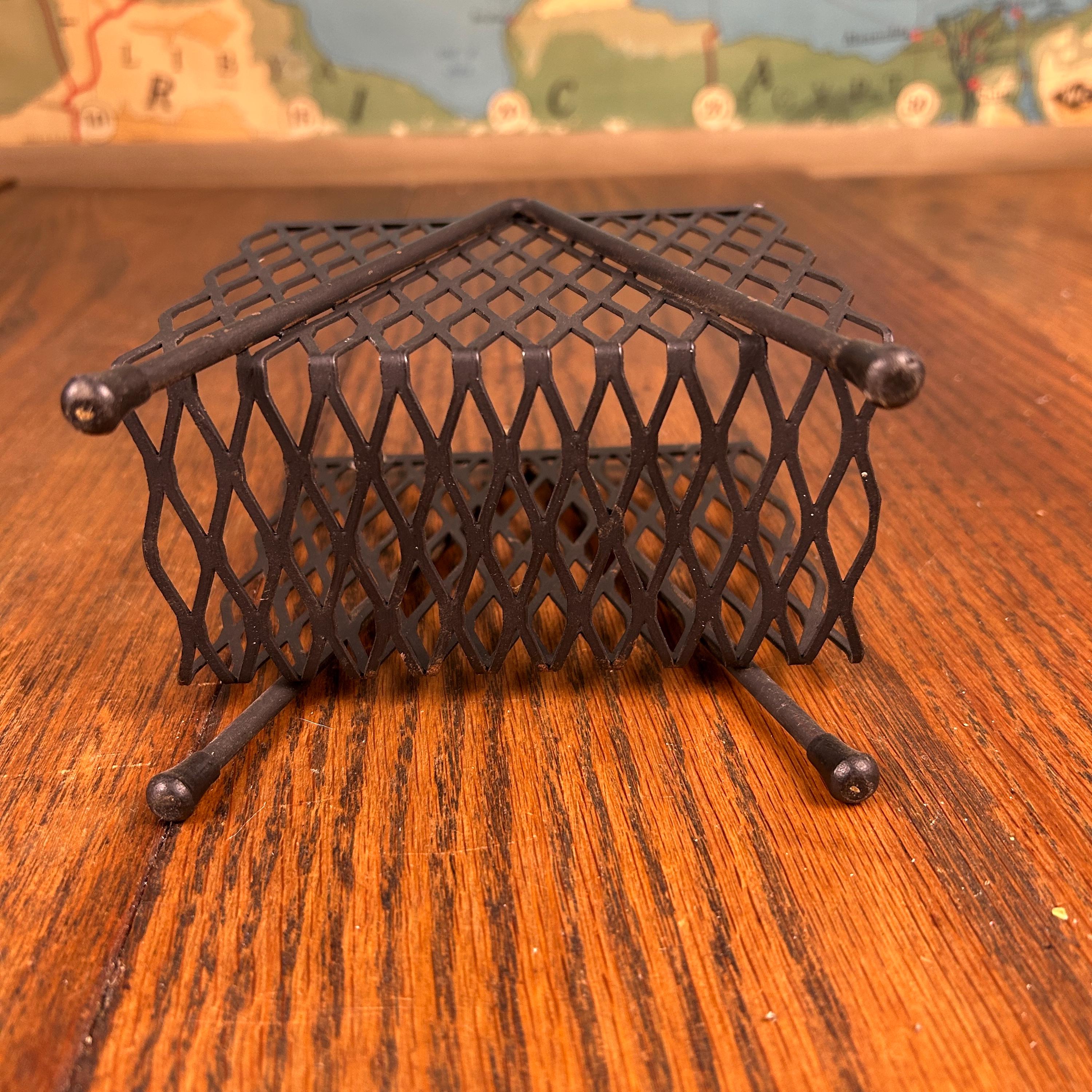 Elevate your dining experience with this Vintage Black Metal Napkin Holder. Crafted from black mesh metal and featuring a stylish footed A-frame design, it perfectly embodies mid-century modern charm. This unique piece is not only functional but also serves as a striking accent for your table setting. Please note, it's in good vintage condition with some minor rust, adding to its character and authenticity. Enhance your home decor with this timeless addition!