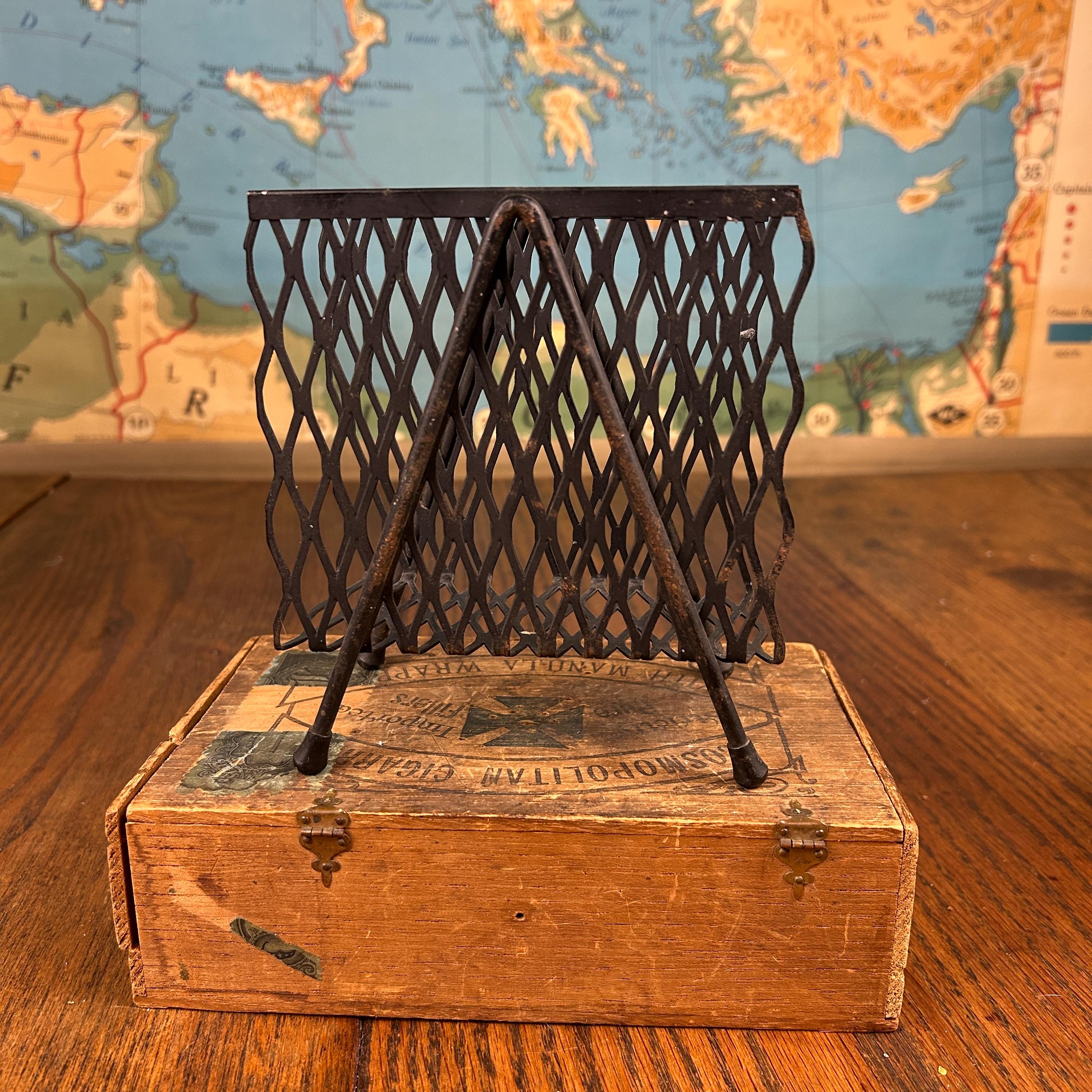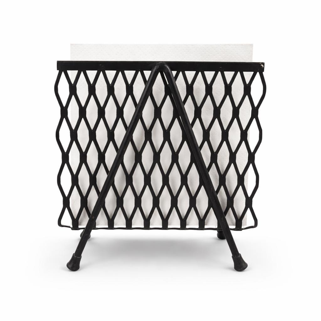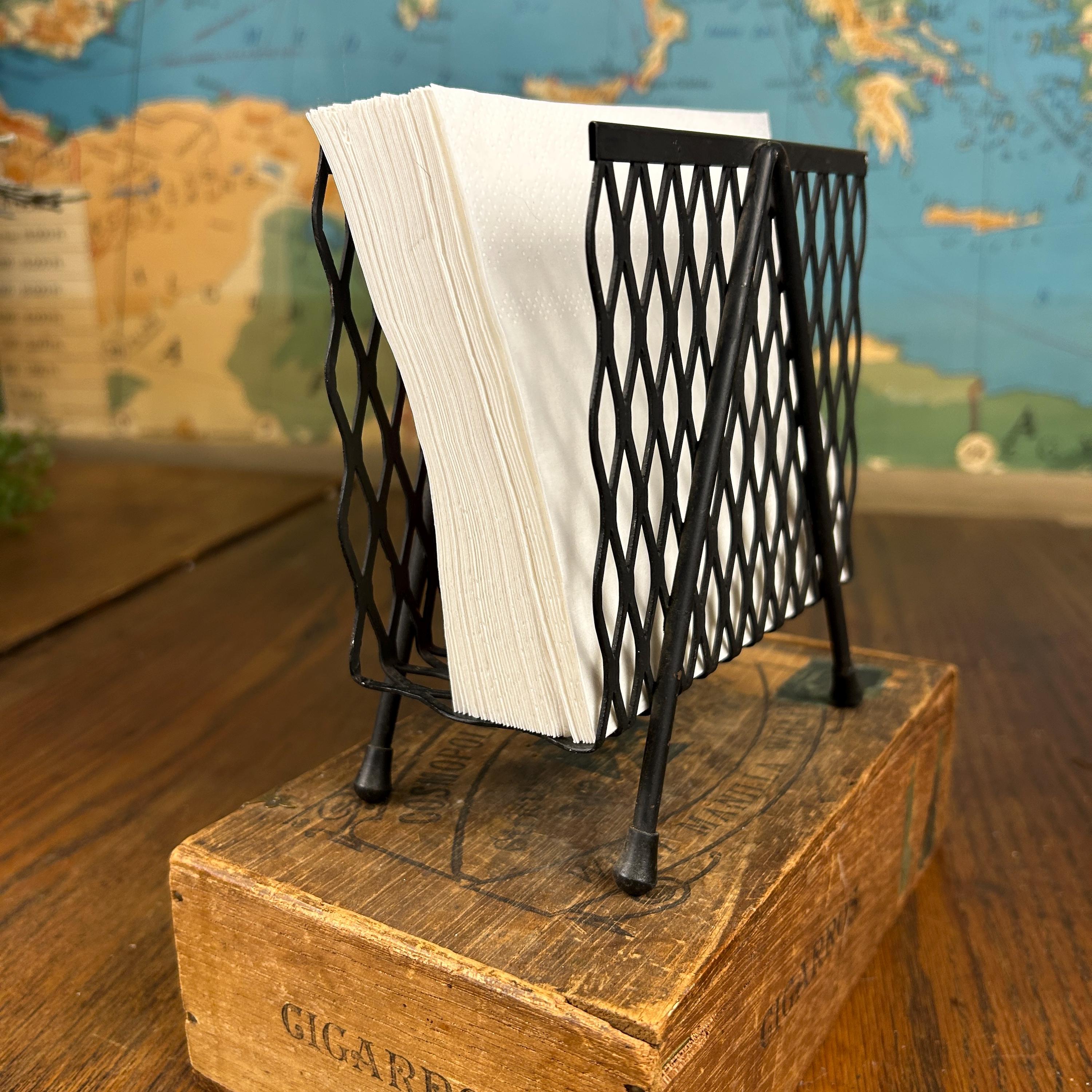 Elevate your dining experience with this Vintage Black Metal Napkin Holder. Crafted from black mesh metal and featuring a stylish footed A-frame design, it perfectly embodies mid-century modern charm. This unique piece is not only functional but also serves as a striking accent for your table setting. Please note, it's in good vintage condition with some minor rust, adding to its character and authenticity. Enhance your home decor with this timeless addition!
