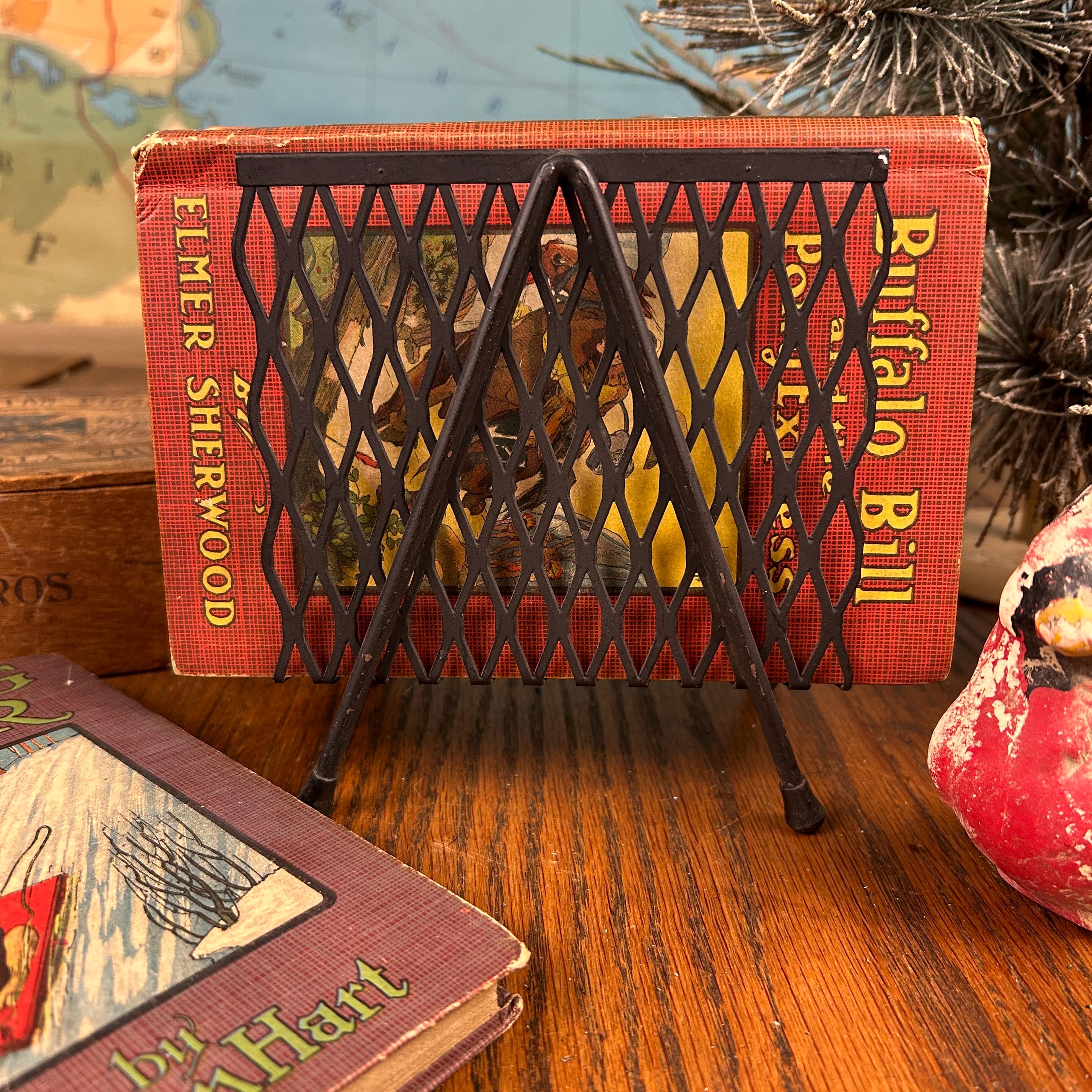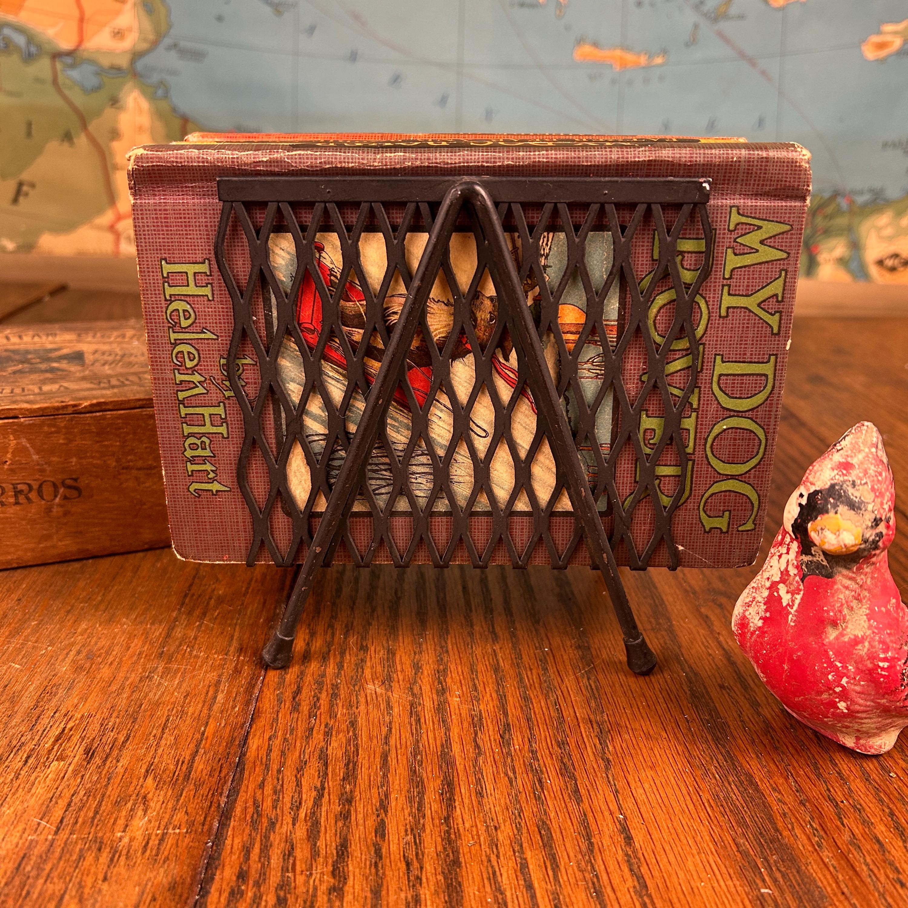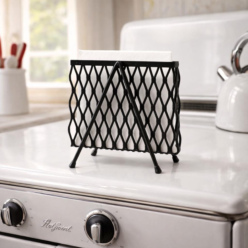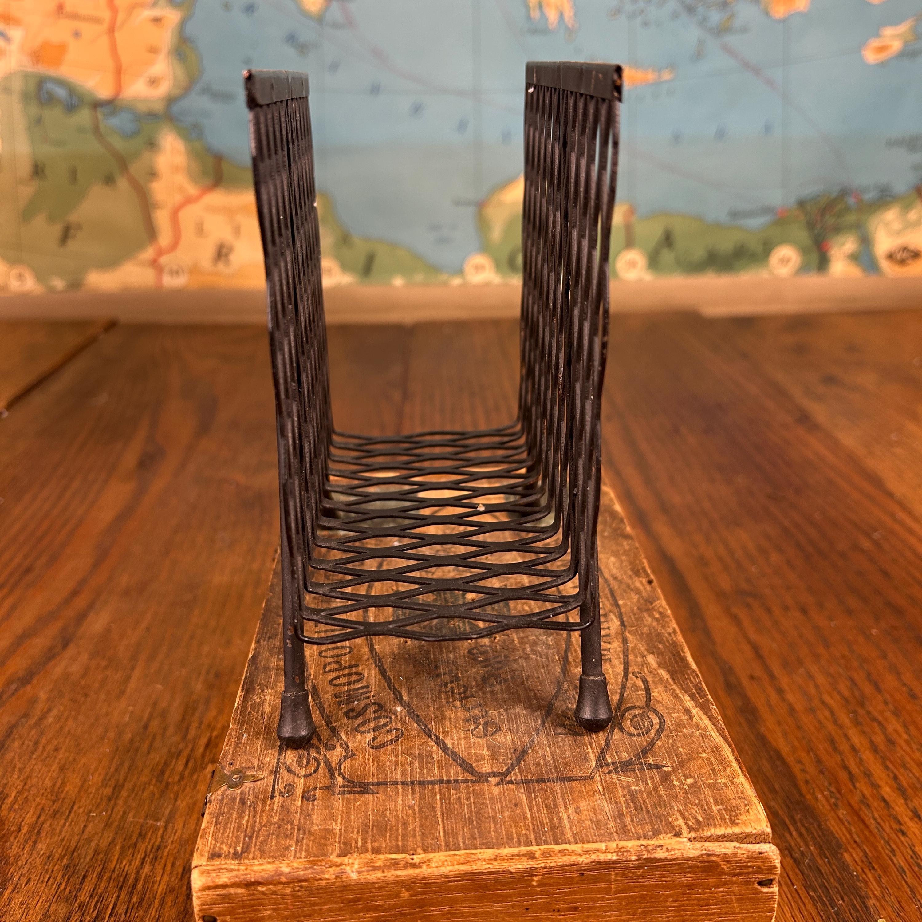Elevate your dining experience with this Vintage Black Metal Napkin Holder. Crafted from black mesh metal and featuring a stylish footed A-frame design, it perfectly embodies mid-century modern charm. This unique piece is not only functional but also serves as a striking accent for your table setting. Please note, it's in good vintage condition with some minor rust, adding to its character and authenticity. Enhance your home decor with this timeless addition!