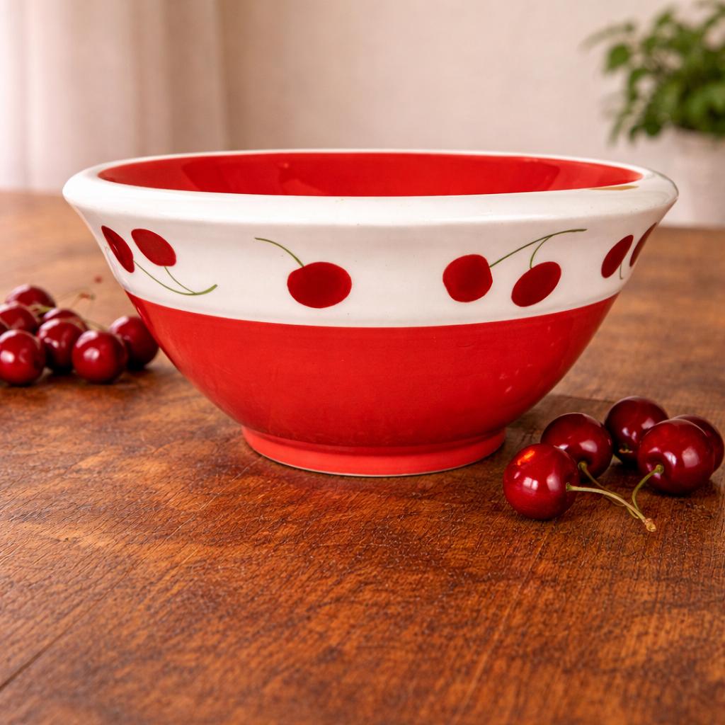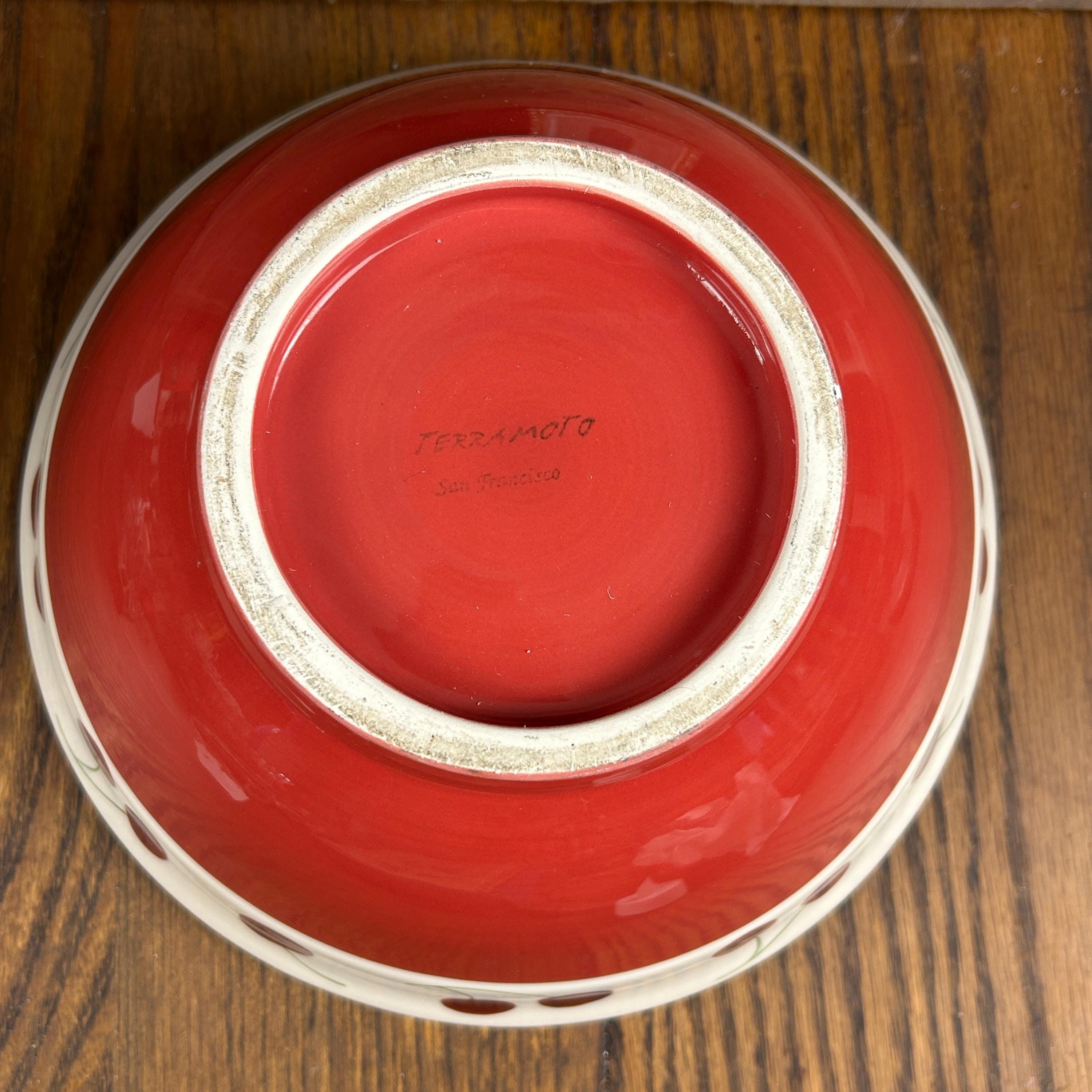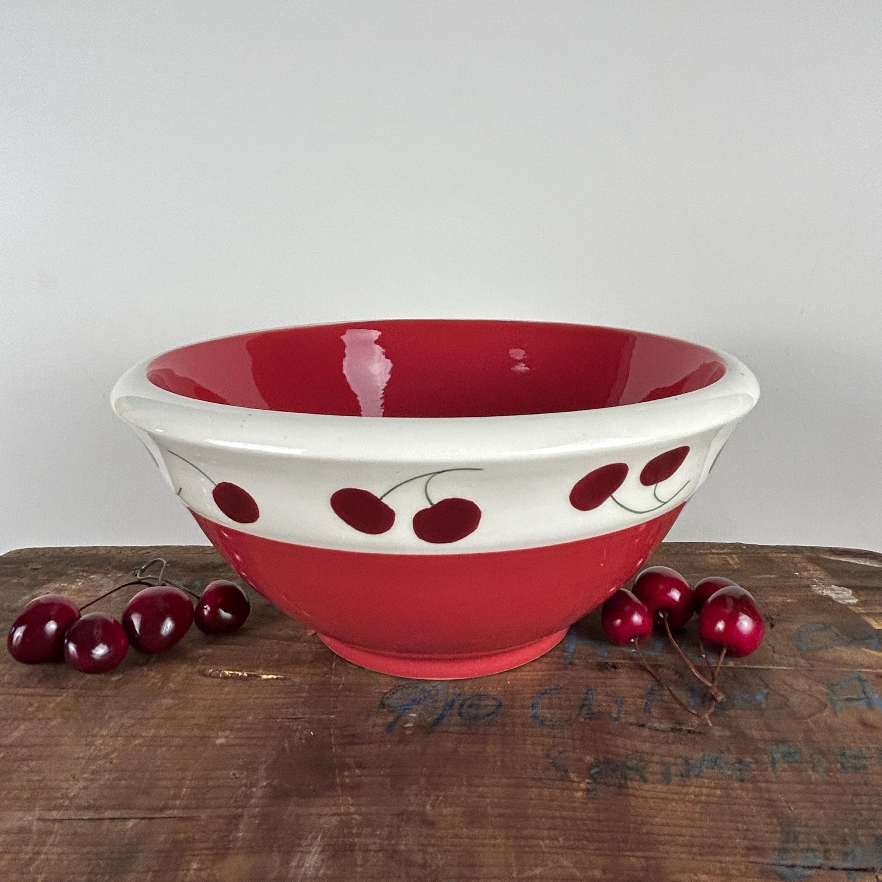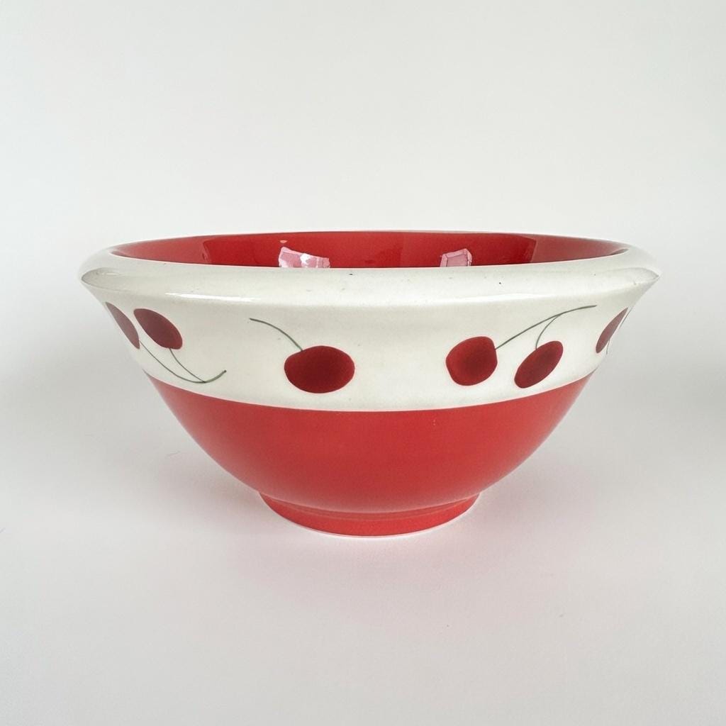 This is a stunning retro/vintage red and white serving bowl, artfully adorned with hand-painted cherries around the rim. Perfect for any occasion, this medium-sized bowl features a glossy finish that catches the eye. Crafted by Terramoto in San Francisco, it's not just a bowl; it's a statement piece that adds charm to your table. Ideal for salads, snacks, or as a decorative centerpiece. Embrace nostalgia and style with this unique addition to your kitchenware collection! A wonderful piece for cherry enthusiasts and red and white decor. It's such a happy piece.