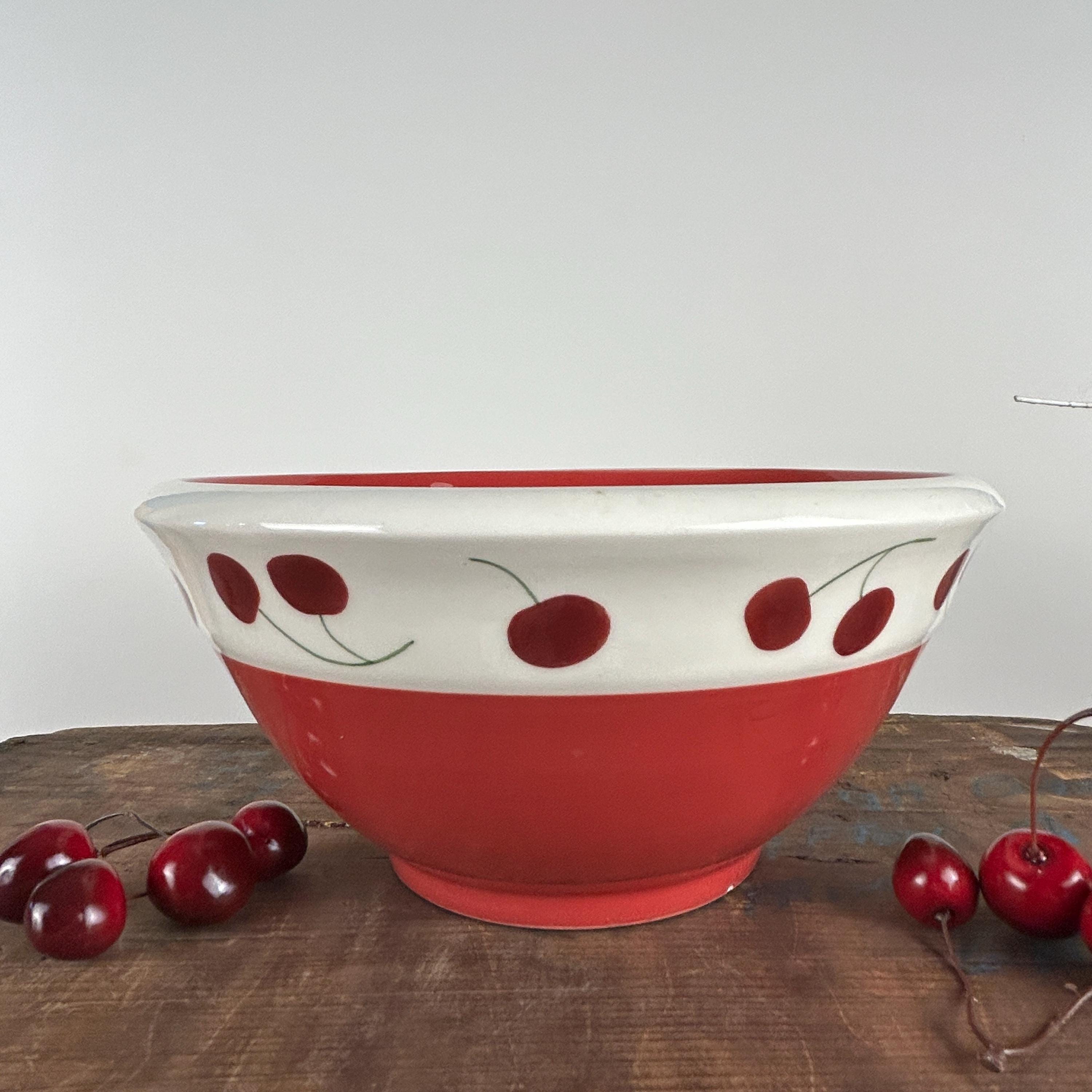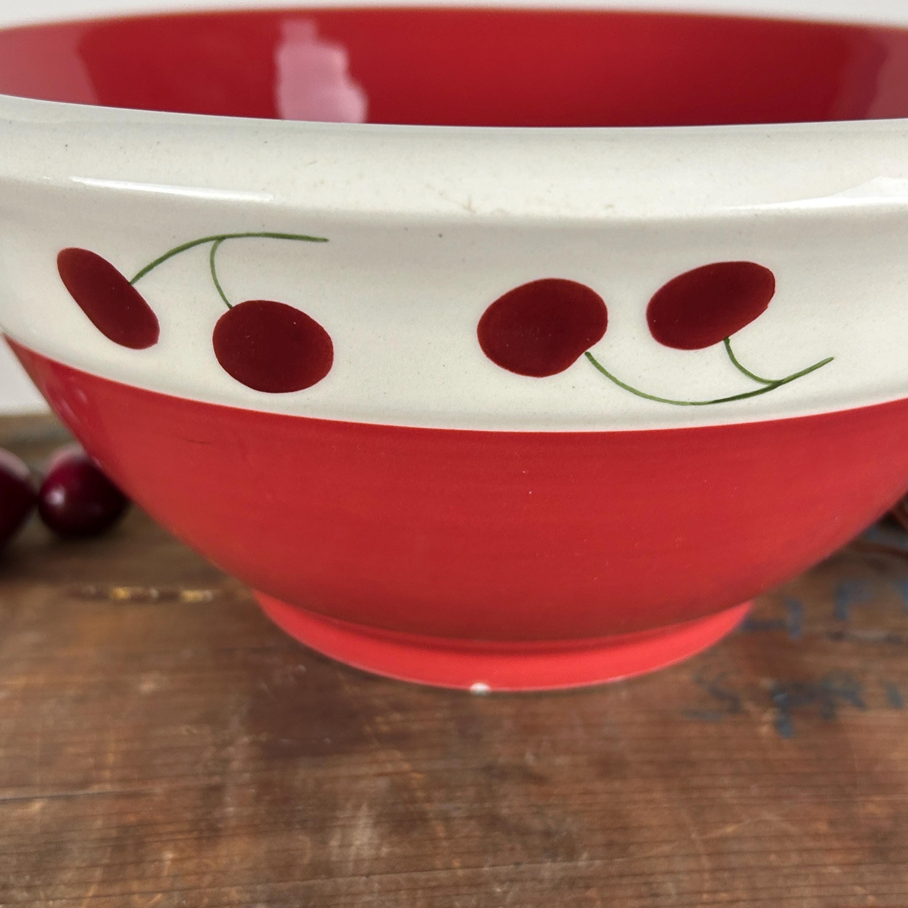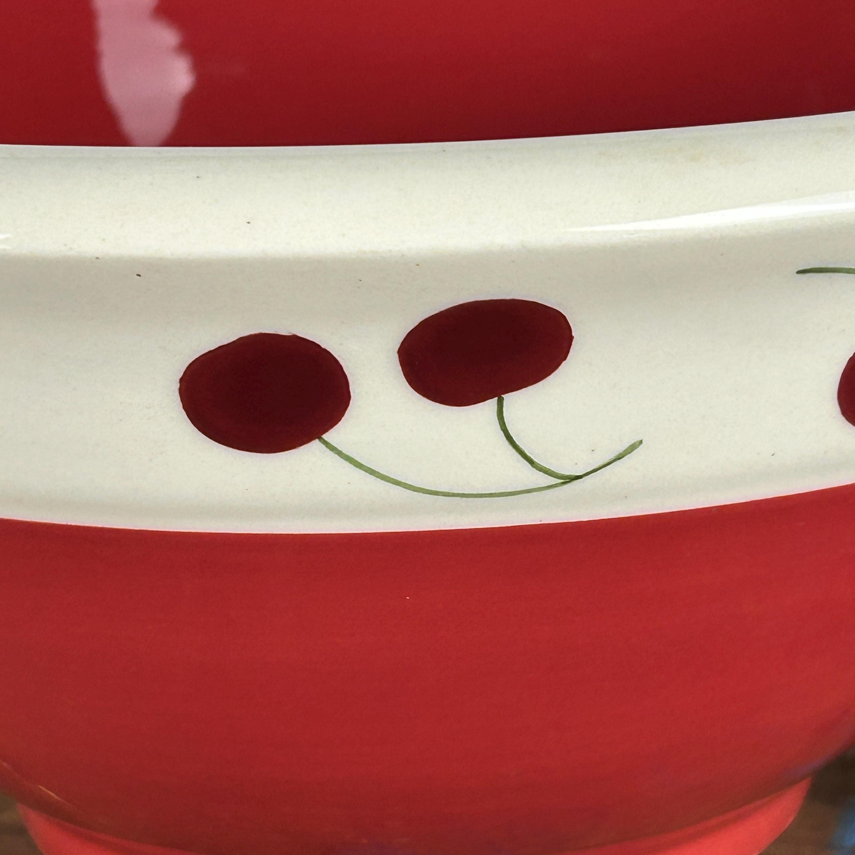Perfect cottagecore retro/vintage bowl in bright red and white gloss finish with hand-painted red cherries and little green stems. A great retro/vintage piece from 1992. In excellent condition. NO crazing, chips or cracks. There is a tiny flea bite at the bottom edge of the bowl. Please see all photos as they are part of the description.