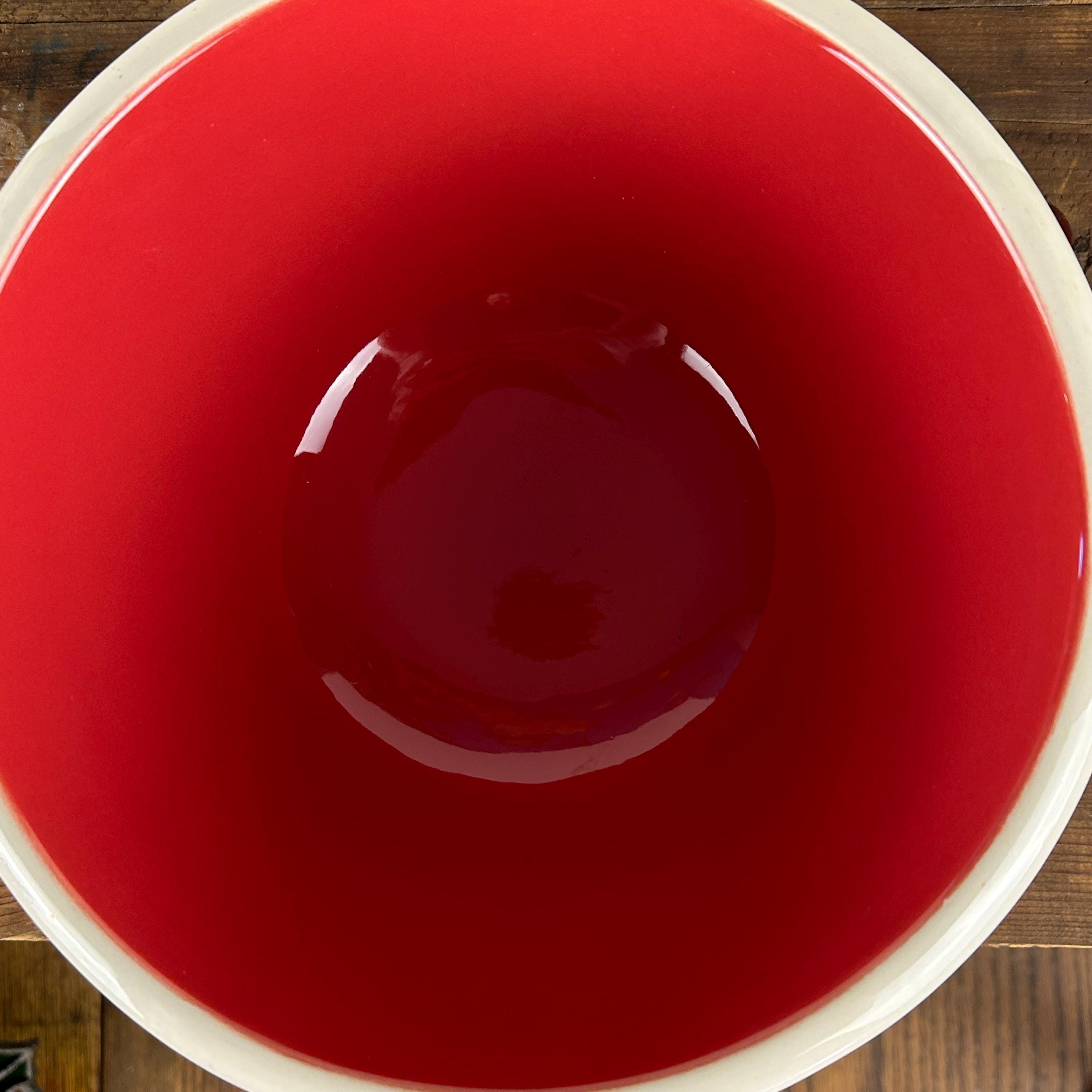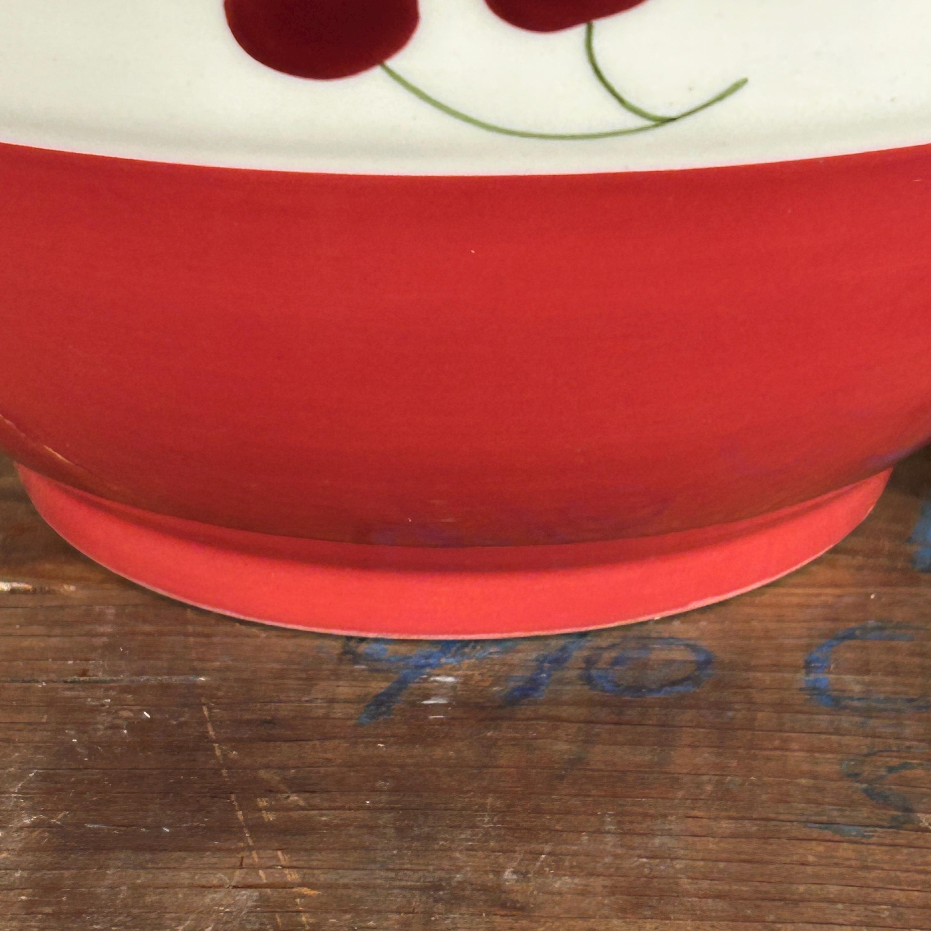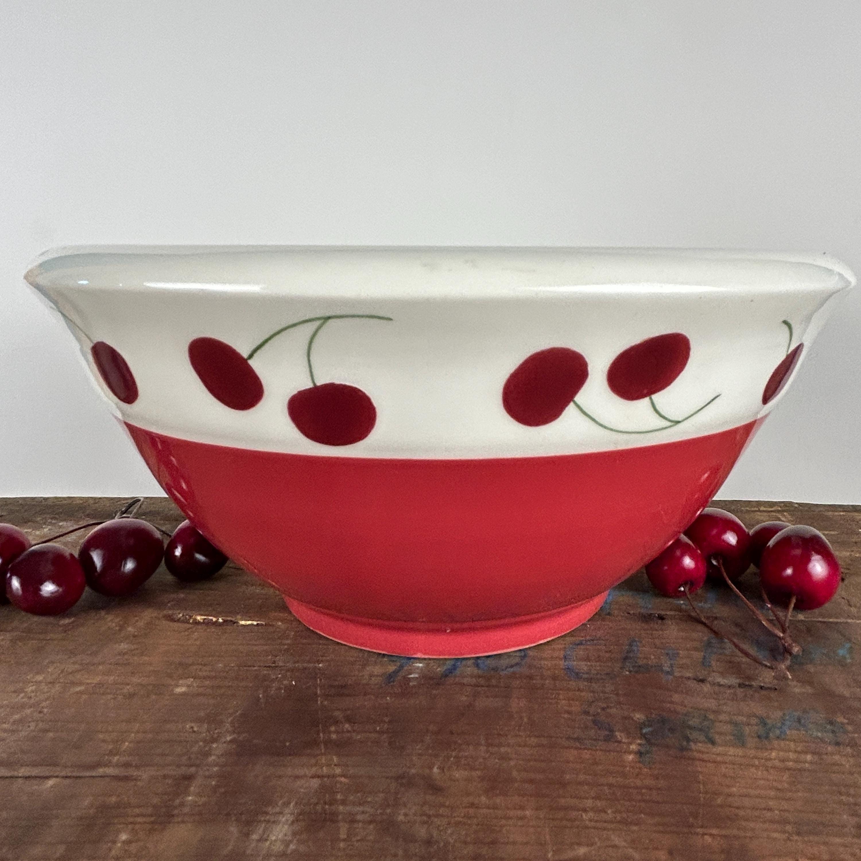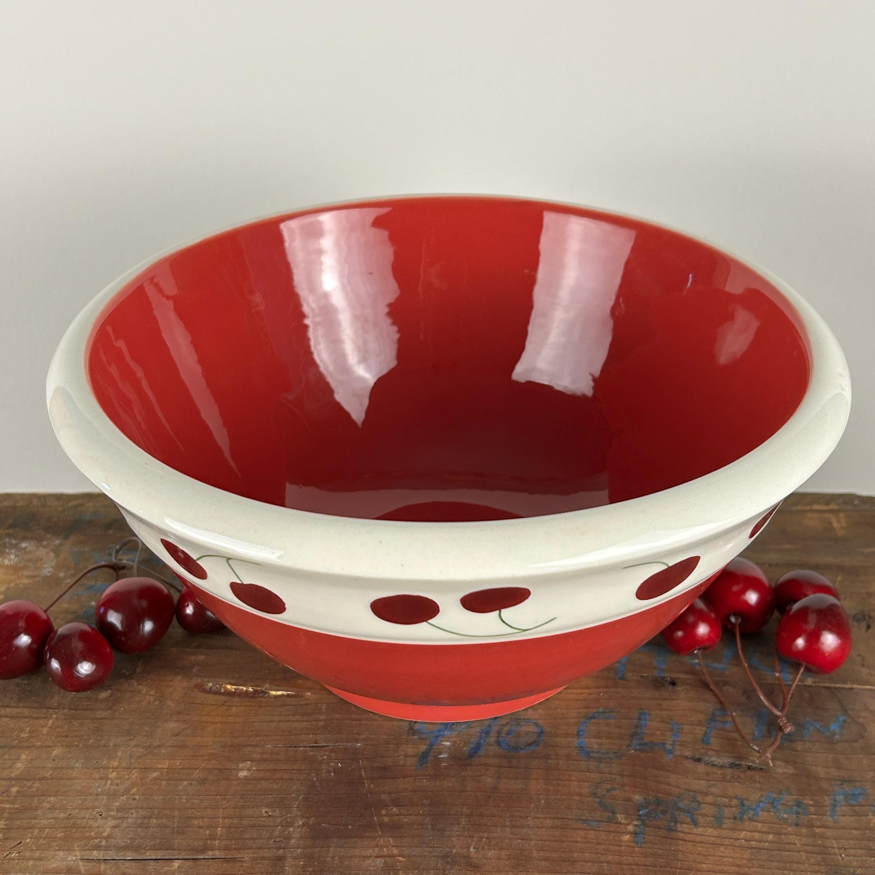 Perfect cottagecore retro/vintage bowl in bright red and white gloss finish with hand-painted red cherries and little green stems. A great retro/vintage piece from 1992. In excellent condition. NO crazing, chips or cracks. There is a tiny flea bite at the bottom edge of the bowl. Please see all photos as they are part of the description.