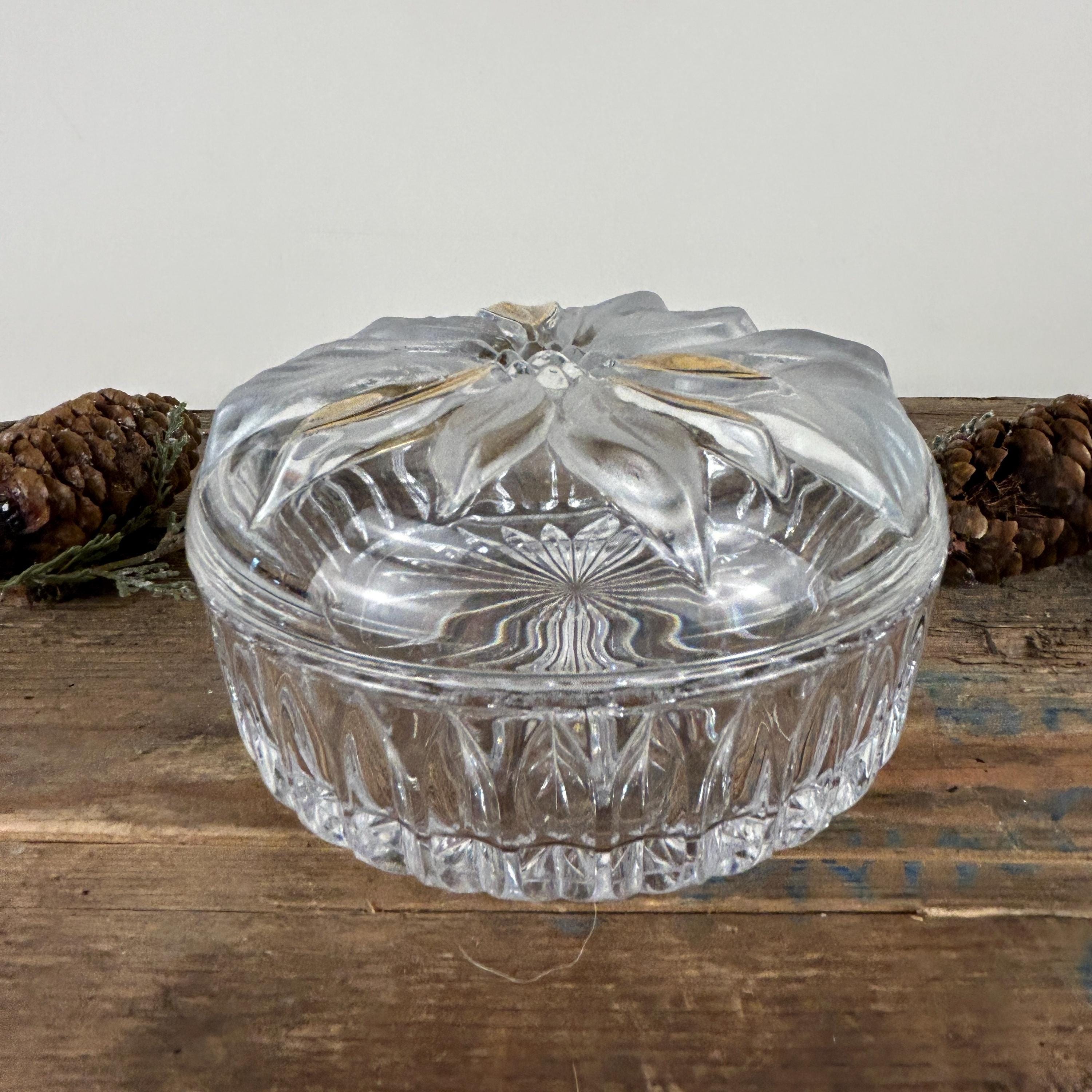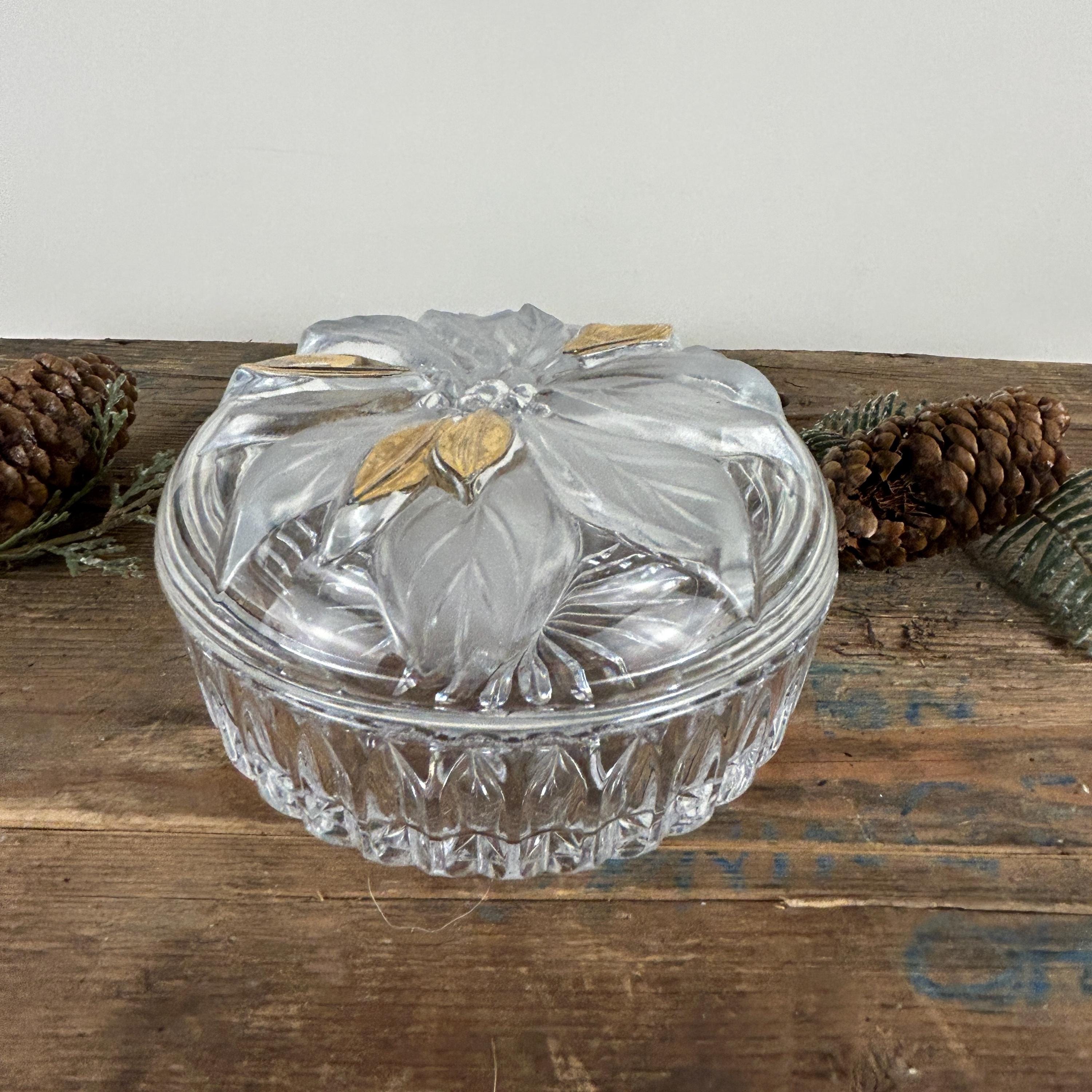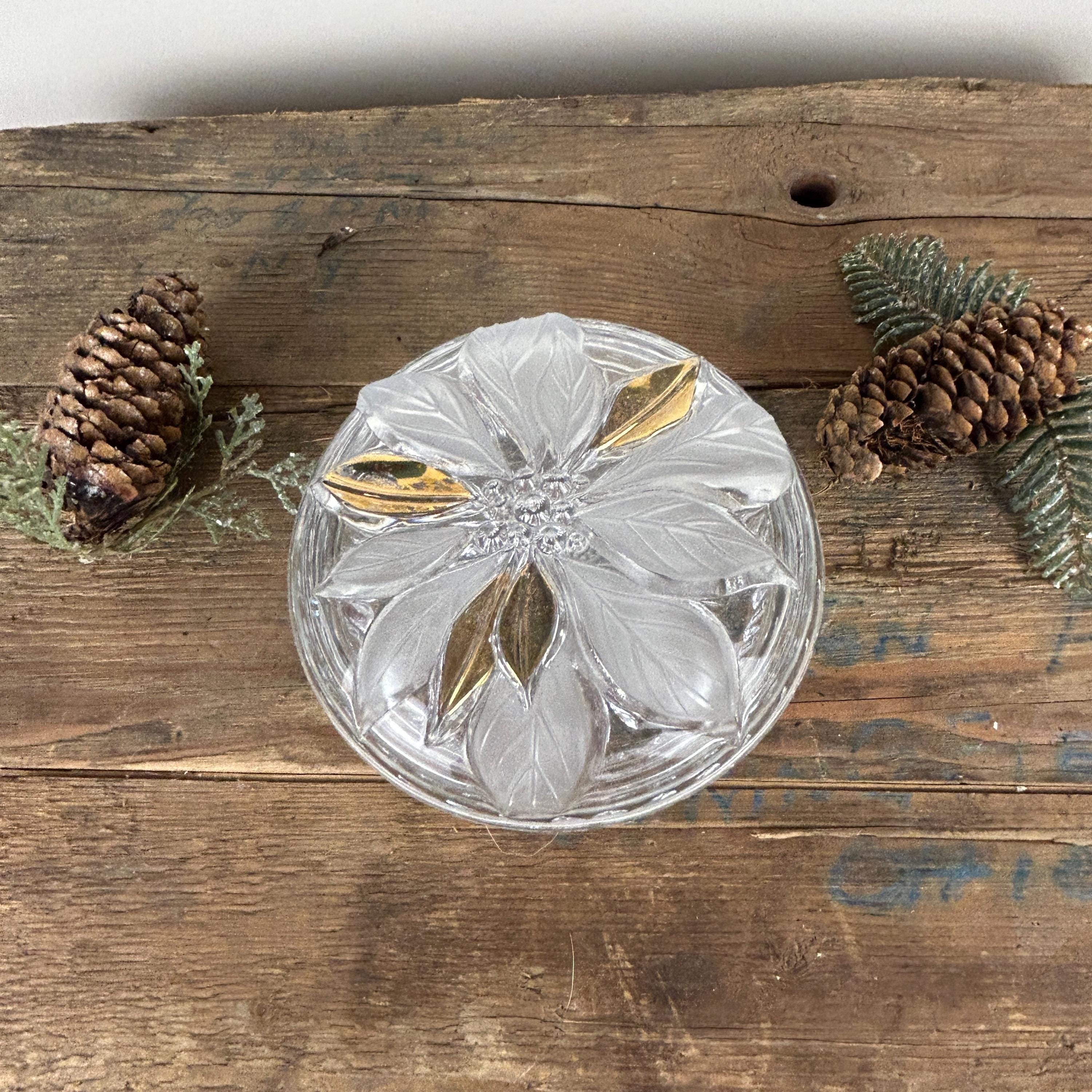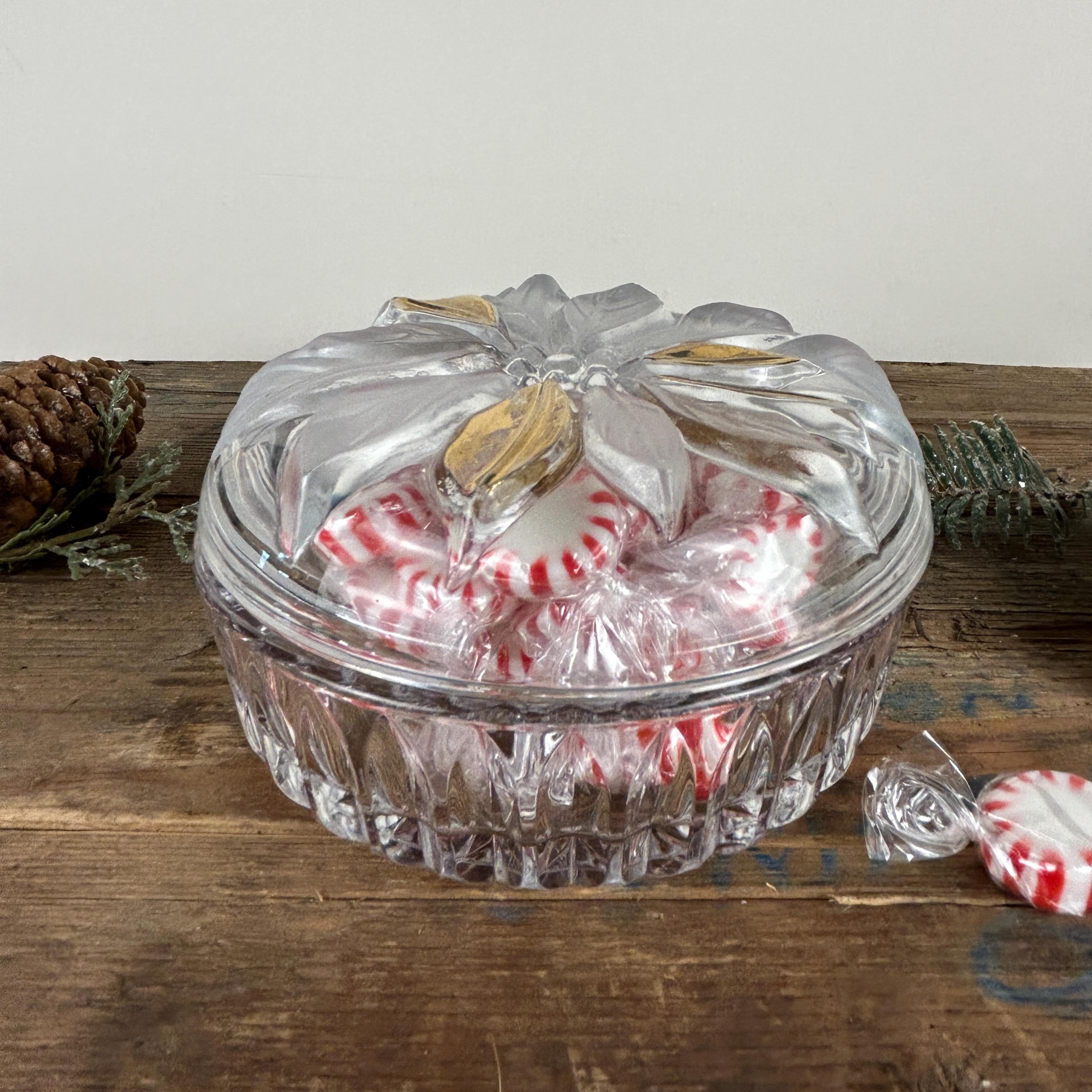 Beautiful lidded trinket box featuring a poinsettia. Flower has some frosted petals and some gold. It is in excellent condition with no chips or cracks. Some of the gold shows a little wear. Beautiful cut starburst pattern on the bottom. Please review all the pictures closely as part of the description. Beautiful dish to display Christmas candy!